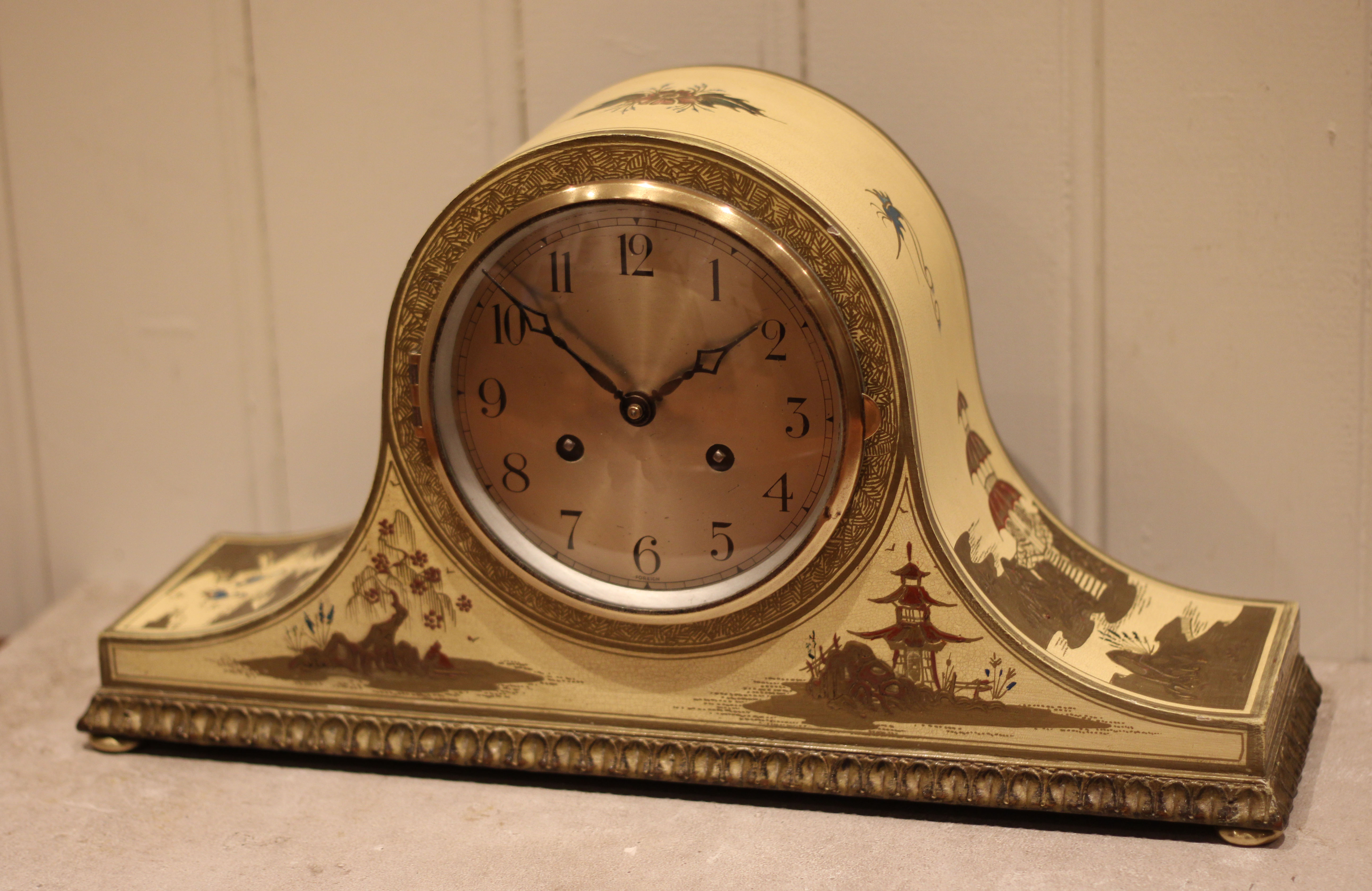 Cream chinoiserie mantel clock having a dome top case , cream ground with raised oriental style decoration . The polished steel dial has a brass bezel , with an eight day movement that strikes the hours and halves on a gong .