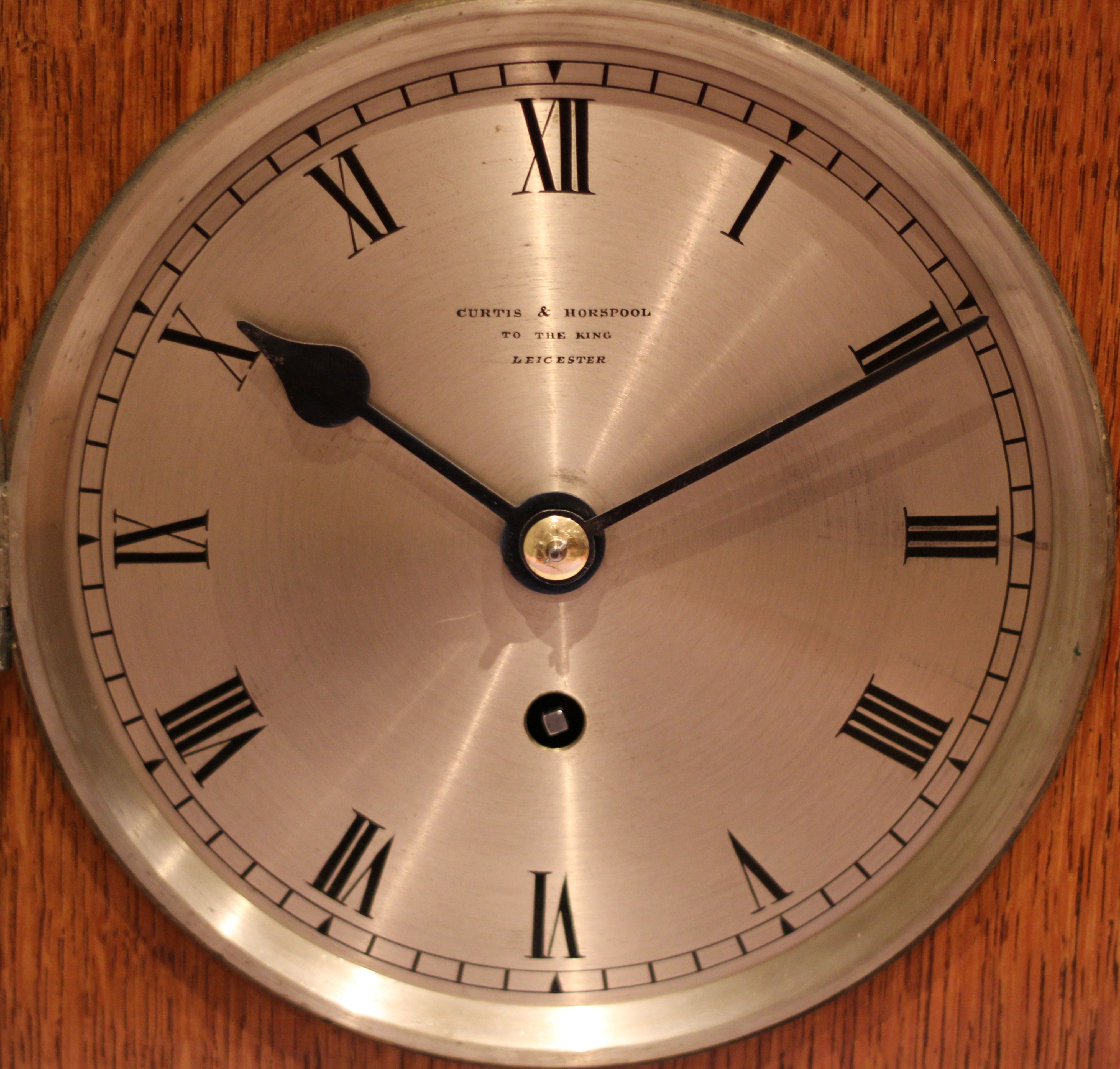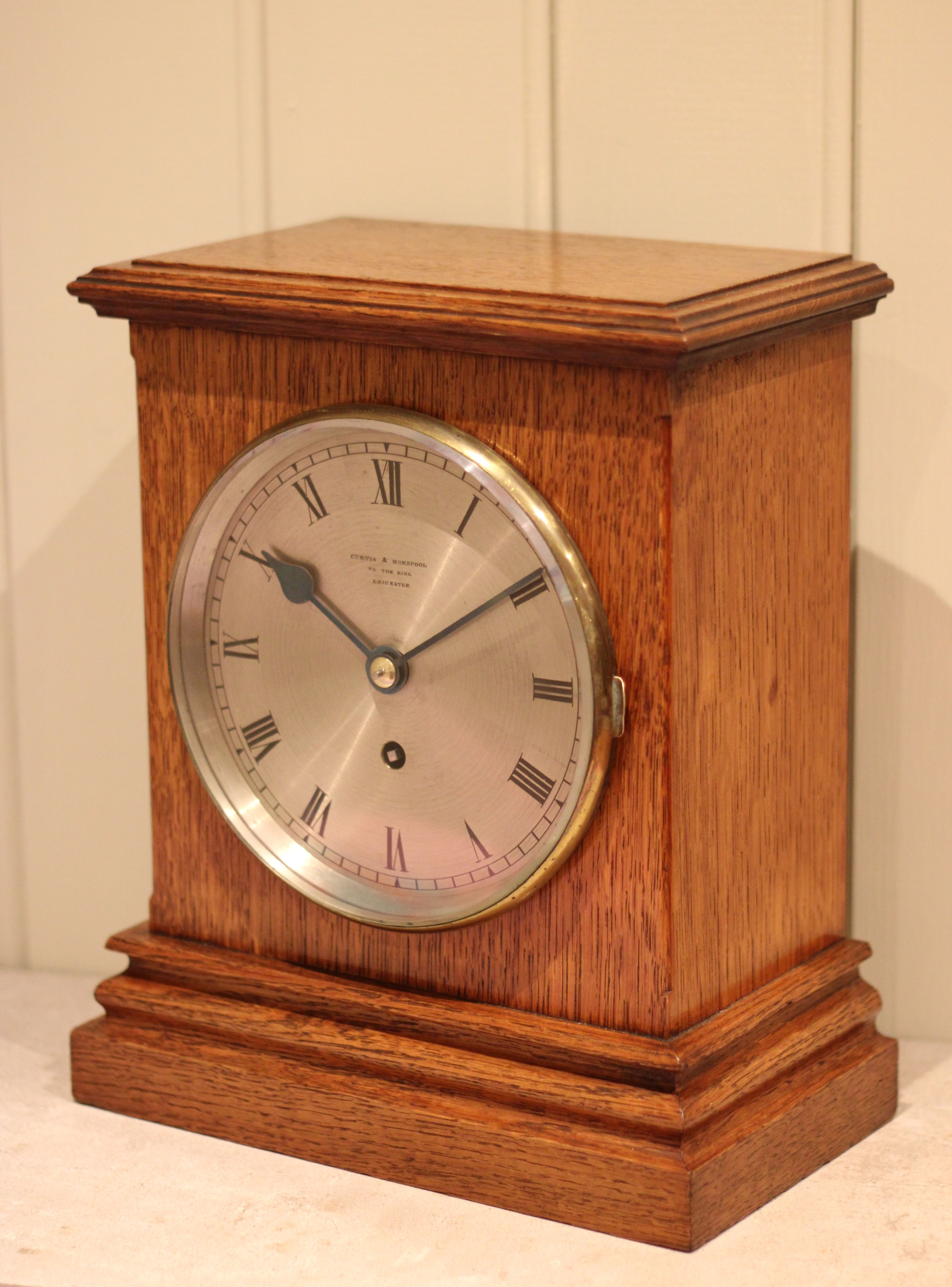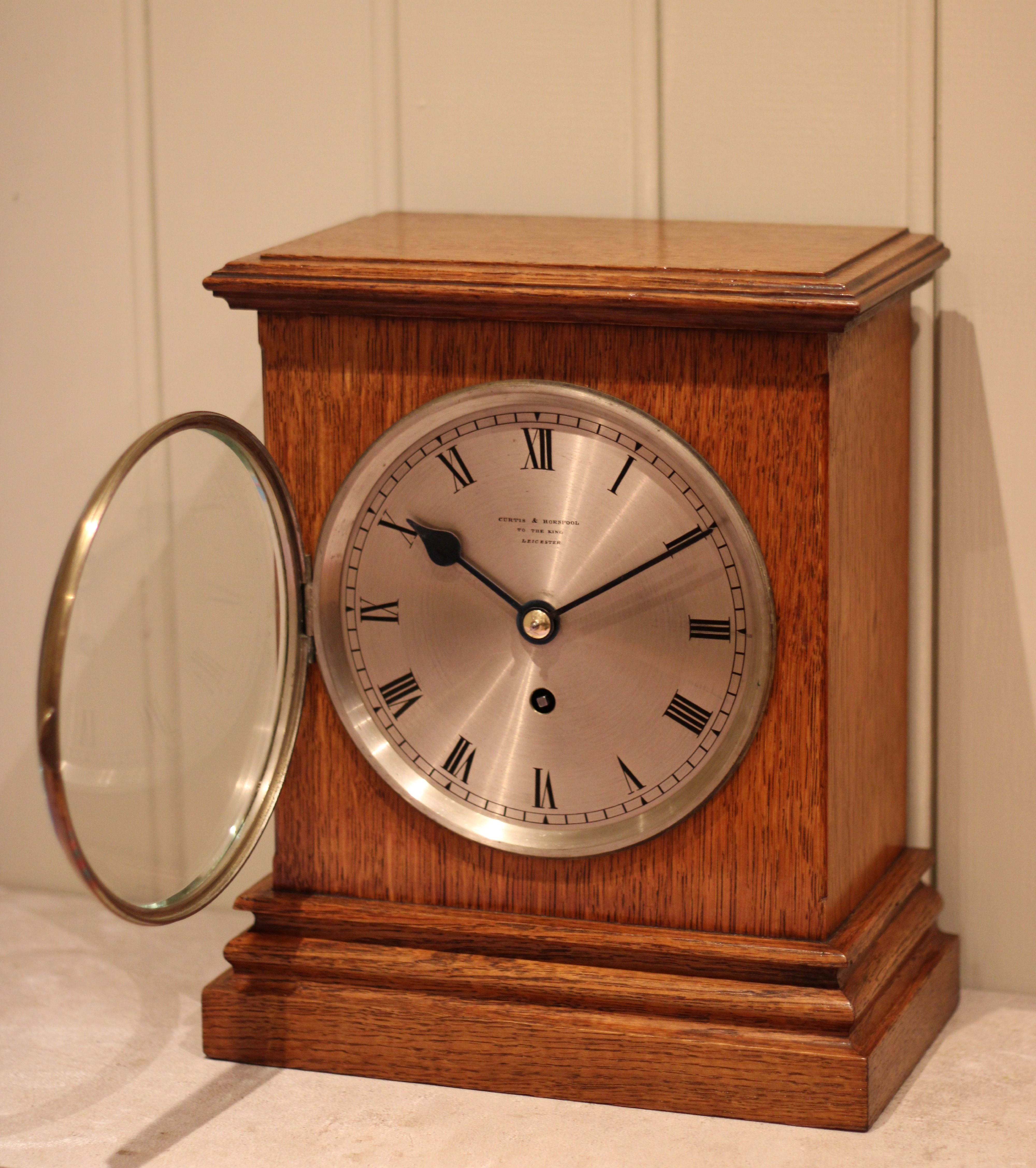 A substantial English solid oak cased timepiece mantel clock. The rectangular case has a flat top, and brass bun feet. It has a silvered dial, signed by the original retailer Curtis & Horspool Liecester suppliers to King Edward VII with a cast brass bezel and thick bevel edge glass. The substantial 8 day timepiece (does not strike or chime) has a chain driven fusee movement.