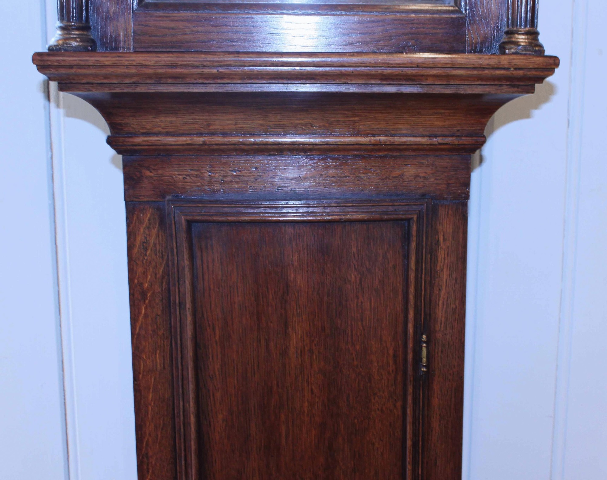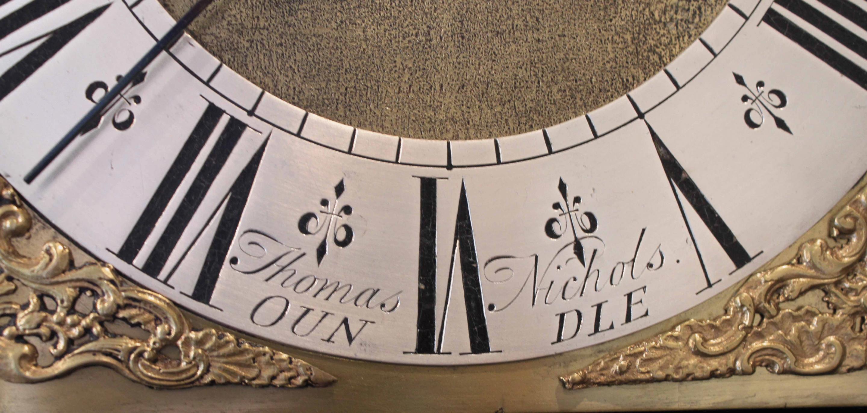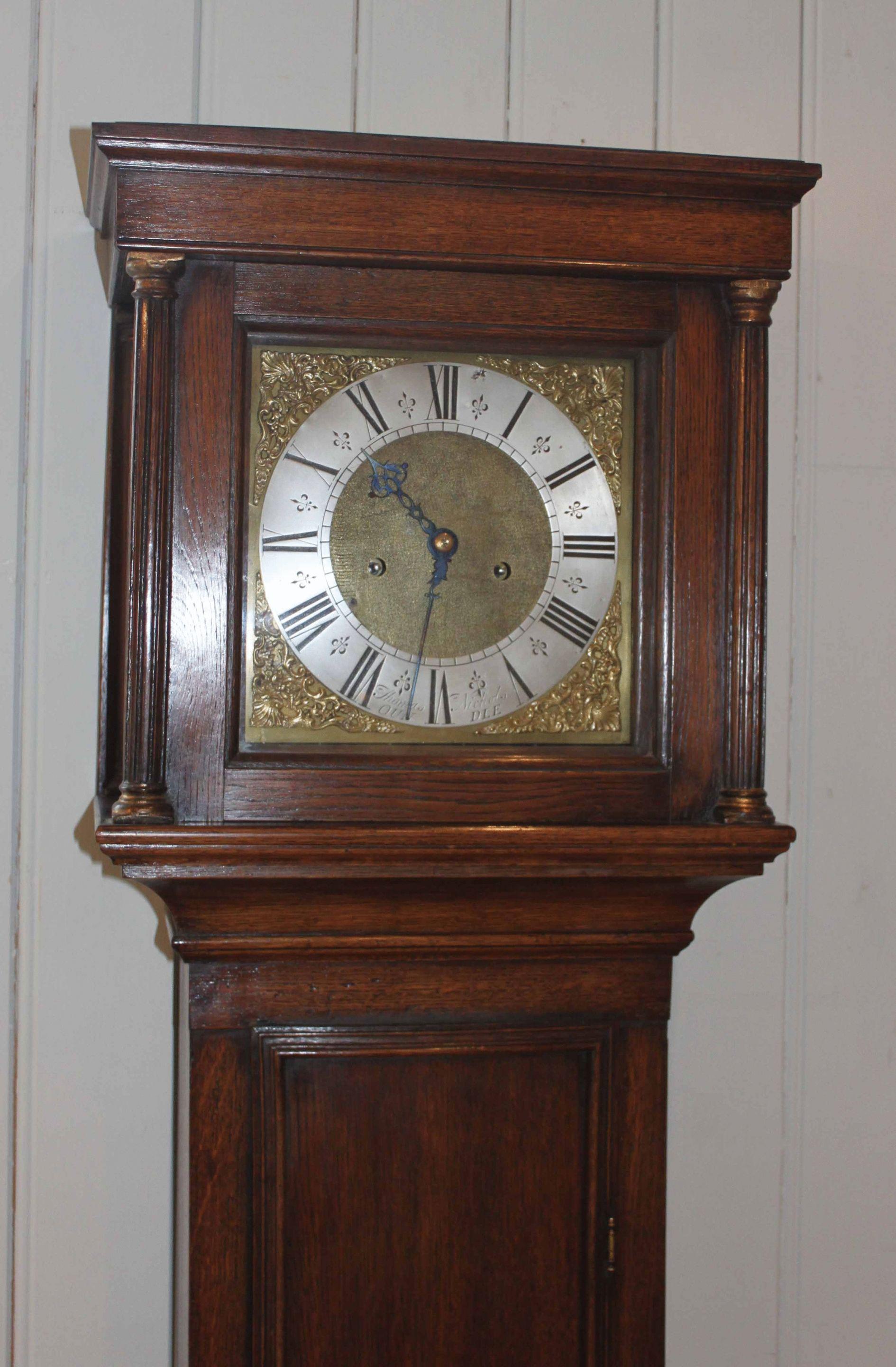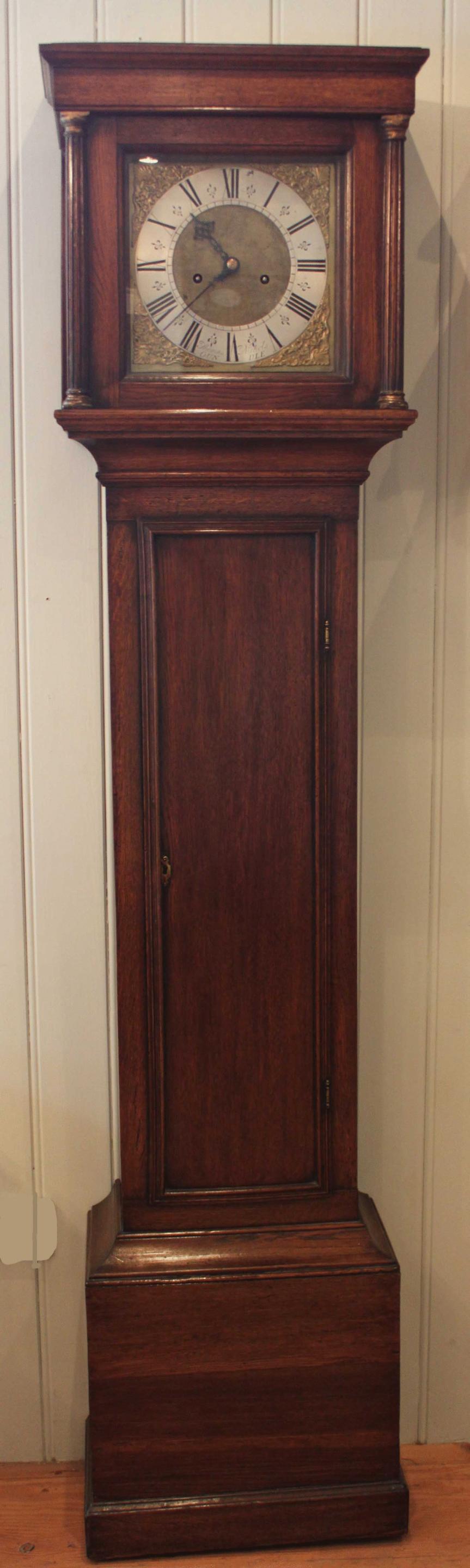 A small, well proportioned solid oak long case clock, having a flat top hood, square dial and a long trunk door with a moulded edge. The brass dial has corner spandrels and a silvered chapter ring and is signed homas Nichols, Oundle. The clock has a 19th Century 8 day bell striking movement having beeen converted from the original 30 hour movement.