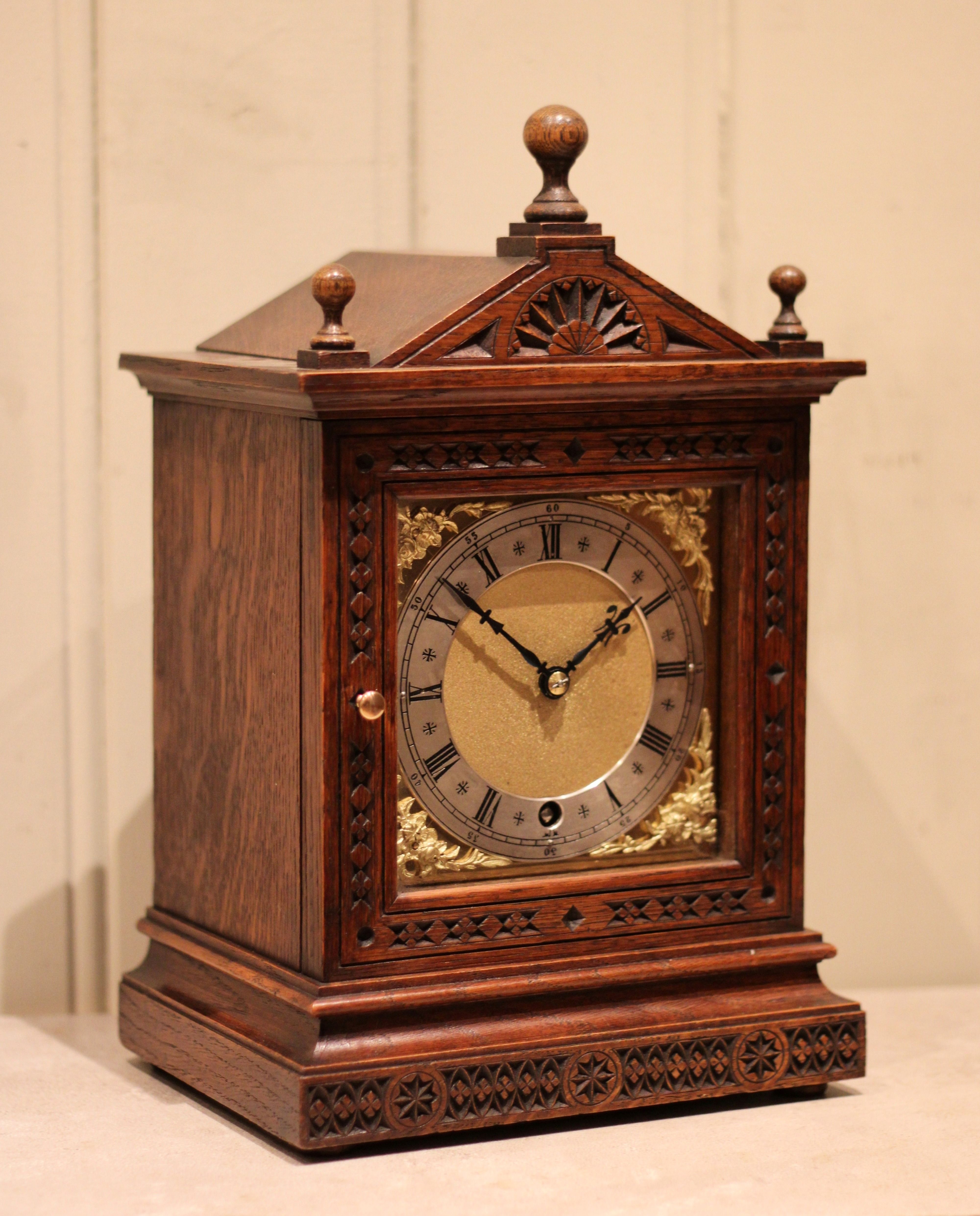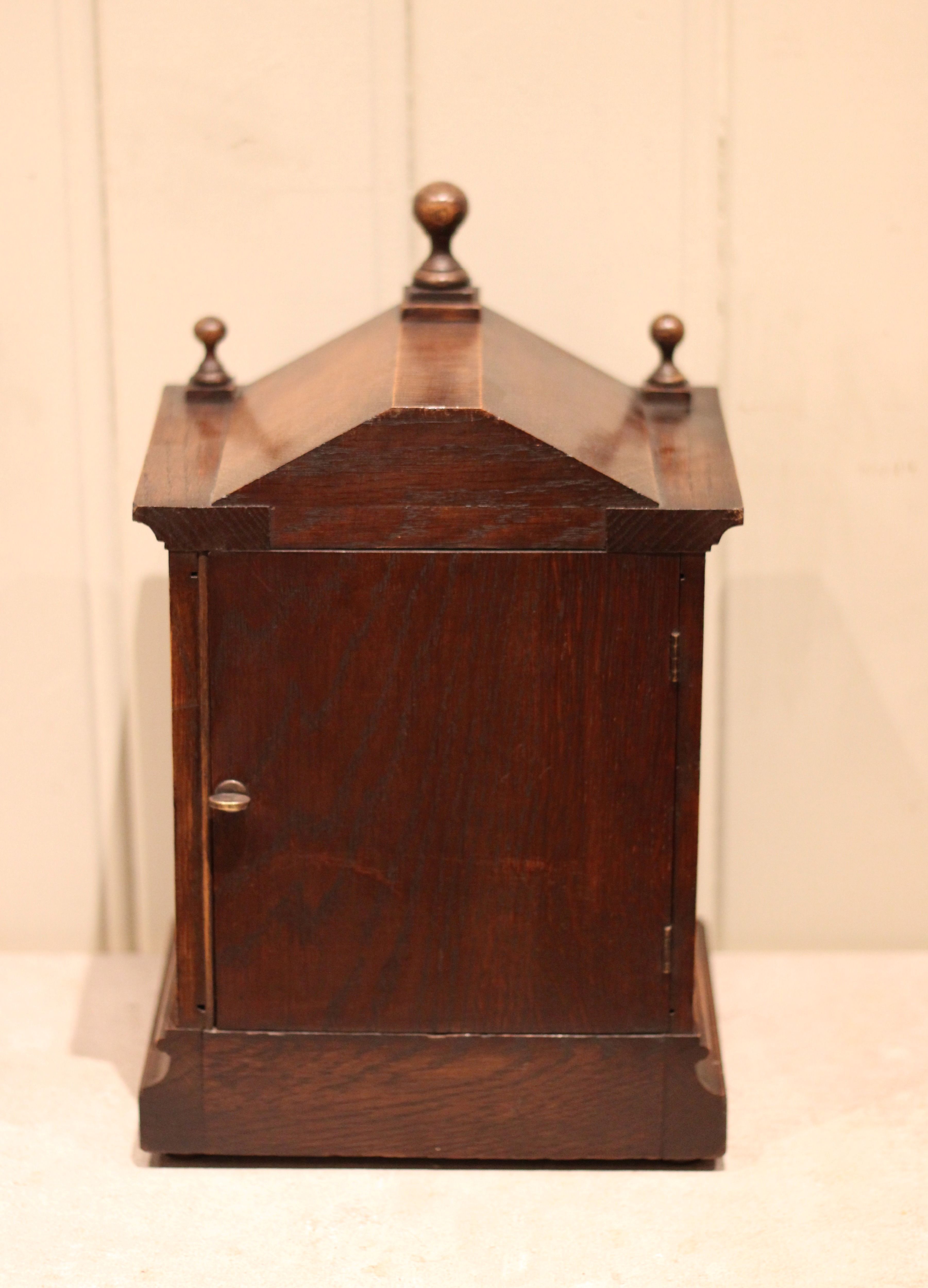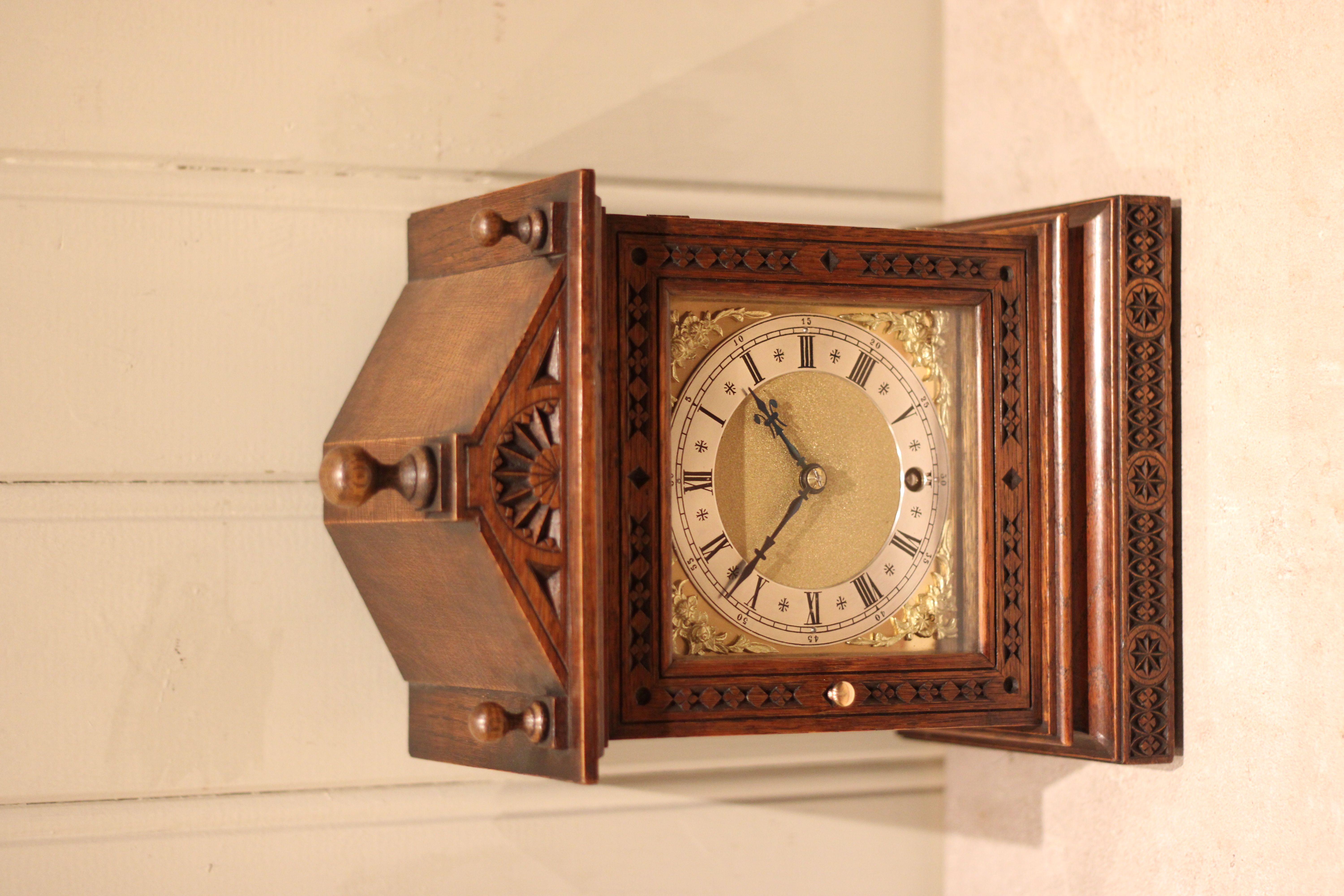 A small, solid oak cased mantel clock dating to the late 19th Century. It has an architectural top with a central finial, the front sections having carved detailing. It has a square brass dial with corner spandrels and a silvered chapter ring. The 8 day pendulum movement was made by W & H ( Winterhalder and Hofmier.