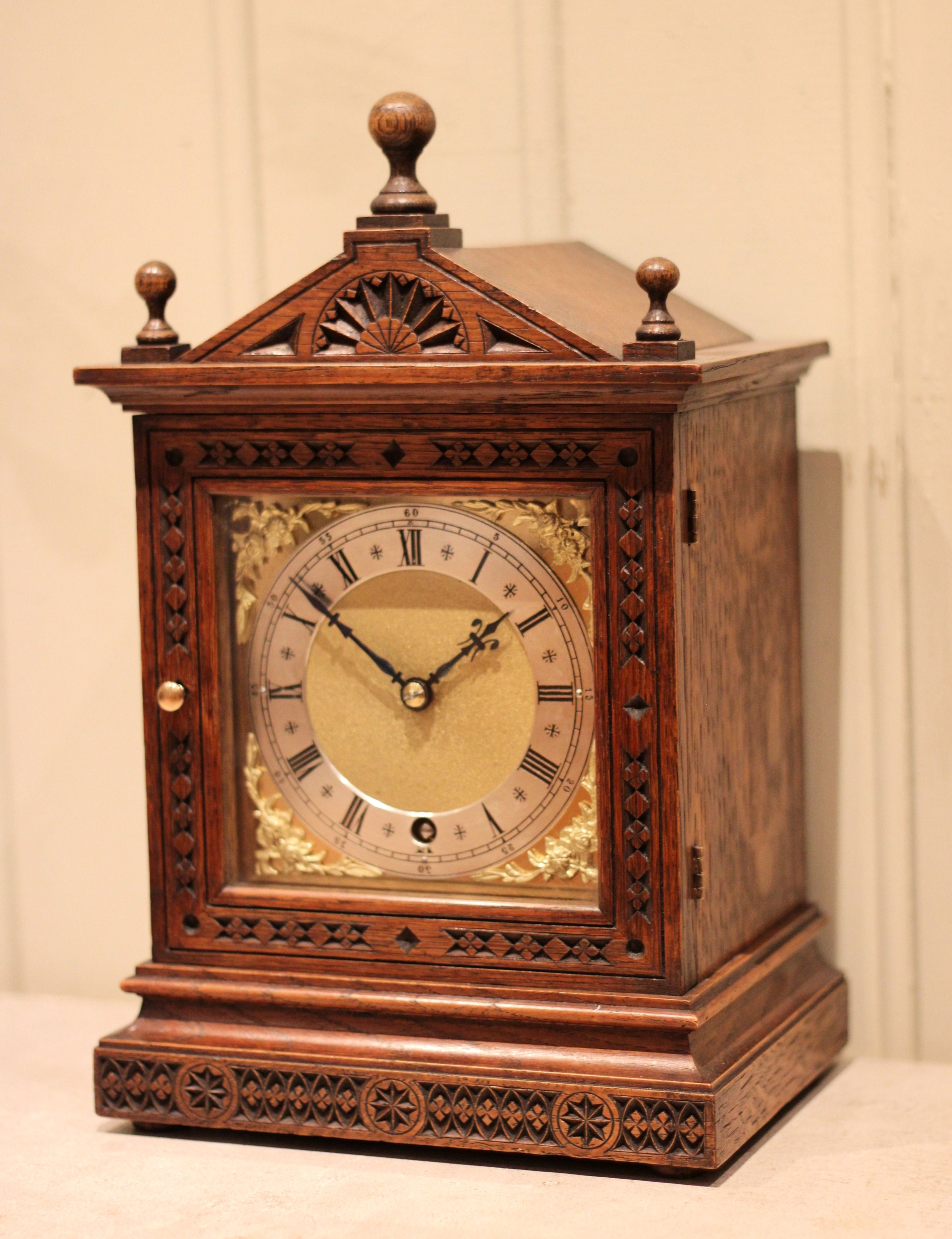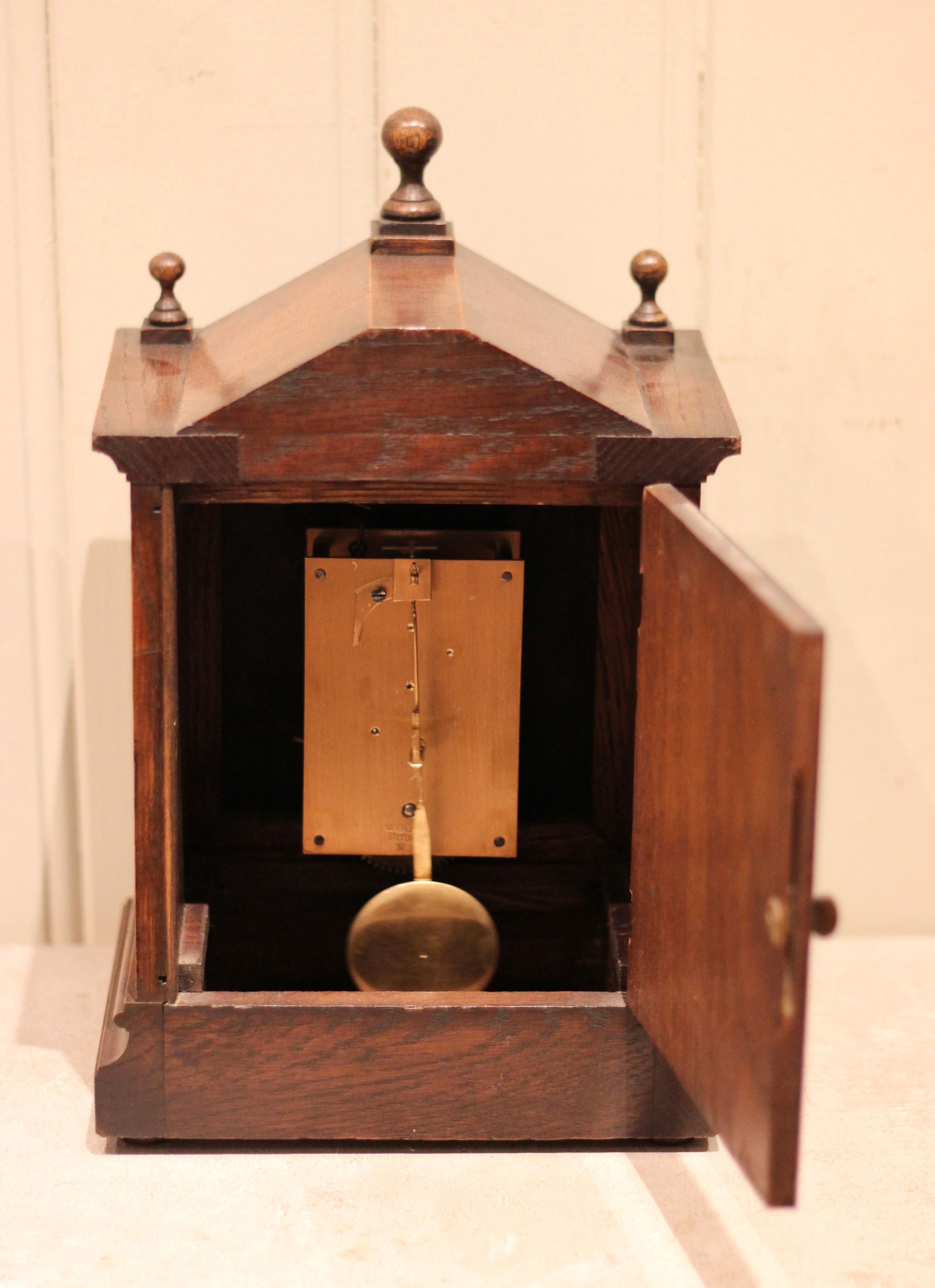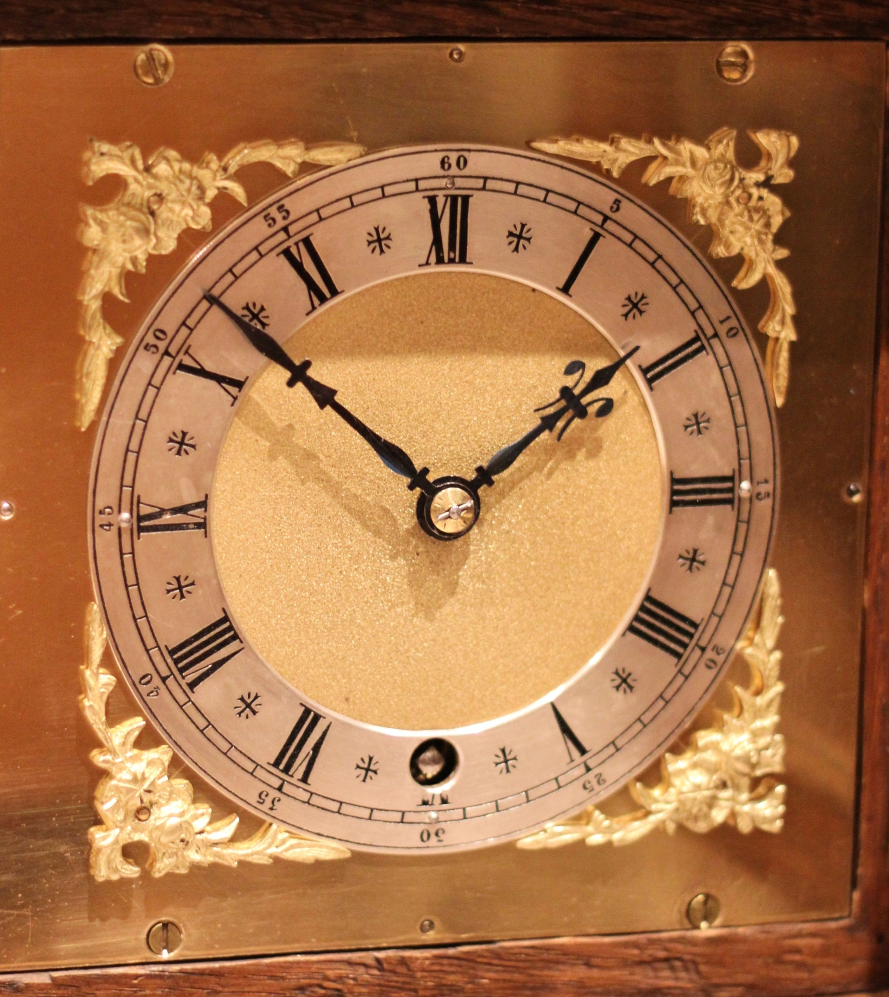 A small, solid oak cased mantel clock dating to the late 19th Century. It has an architectural top with a central finial, the front sections having carved detailing. It has a square brass dial with corner spandrels and a silvered chapter ring. The 8 day pendulum movement was made by W & H ( Winterhalder and Hofmier.