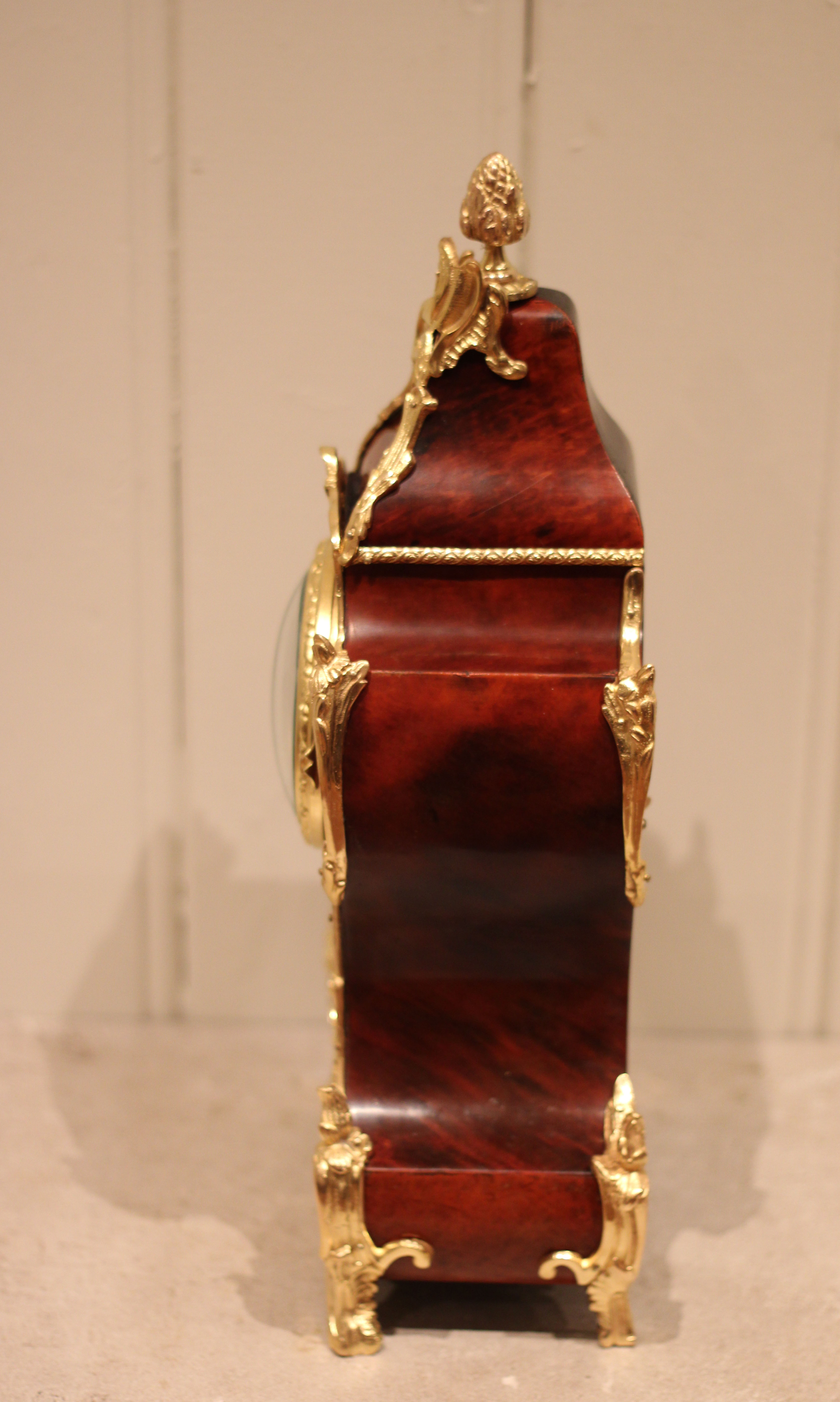 A French bell striking mantel clock, that was originally made for the British market. It has a waisted shape case, with tortoiseshell inlaid with engraved brass.The embossed brass dial is behind a convex glass and has enamel numeral plaques. It has an 8 day, hour and half hour bell striking movement made by Japy Frere.