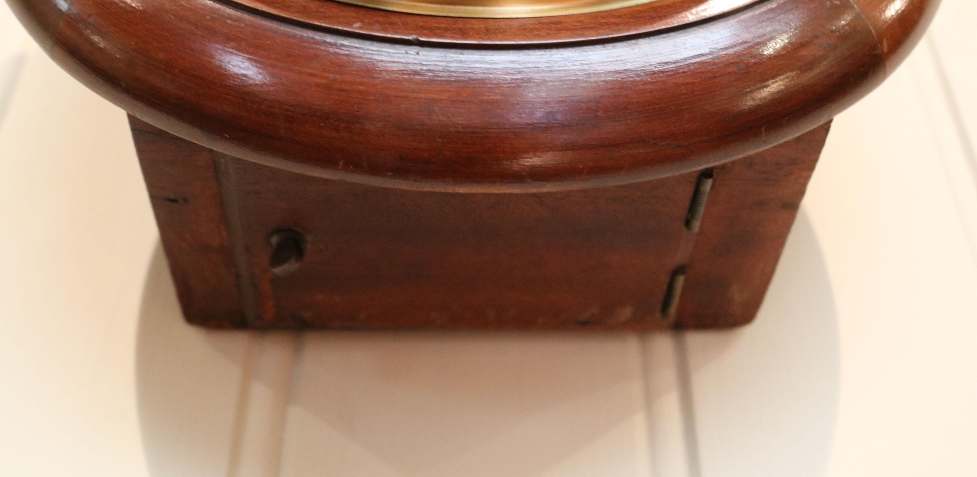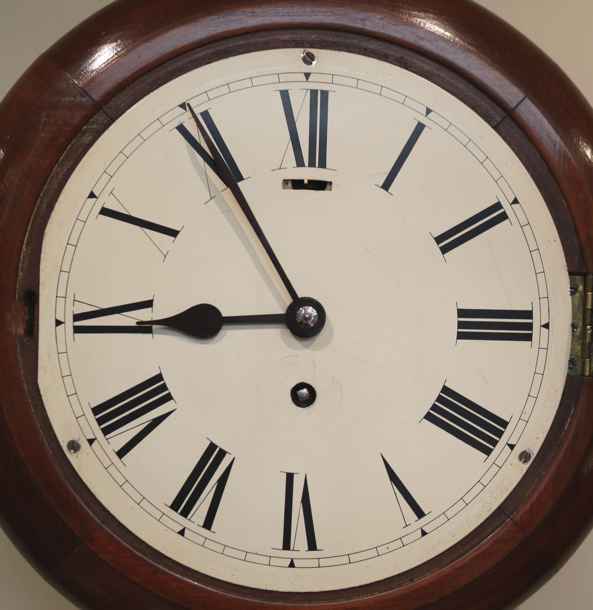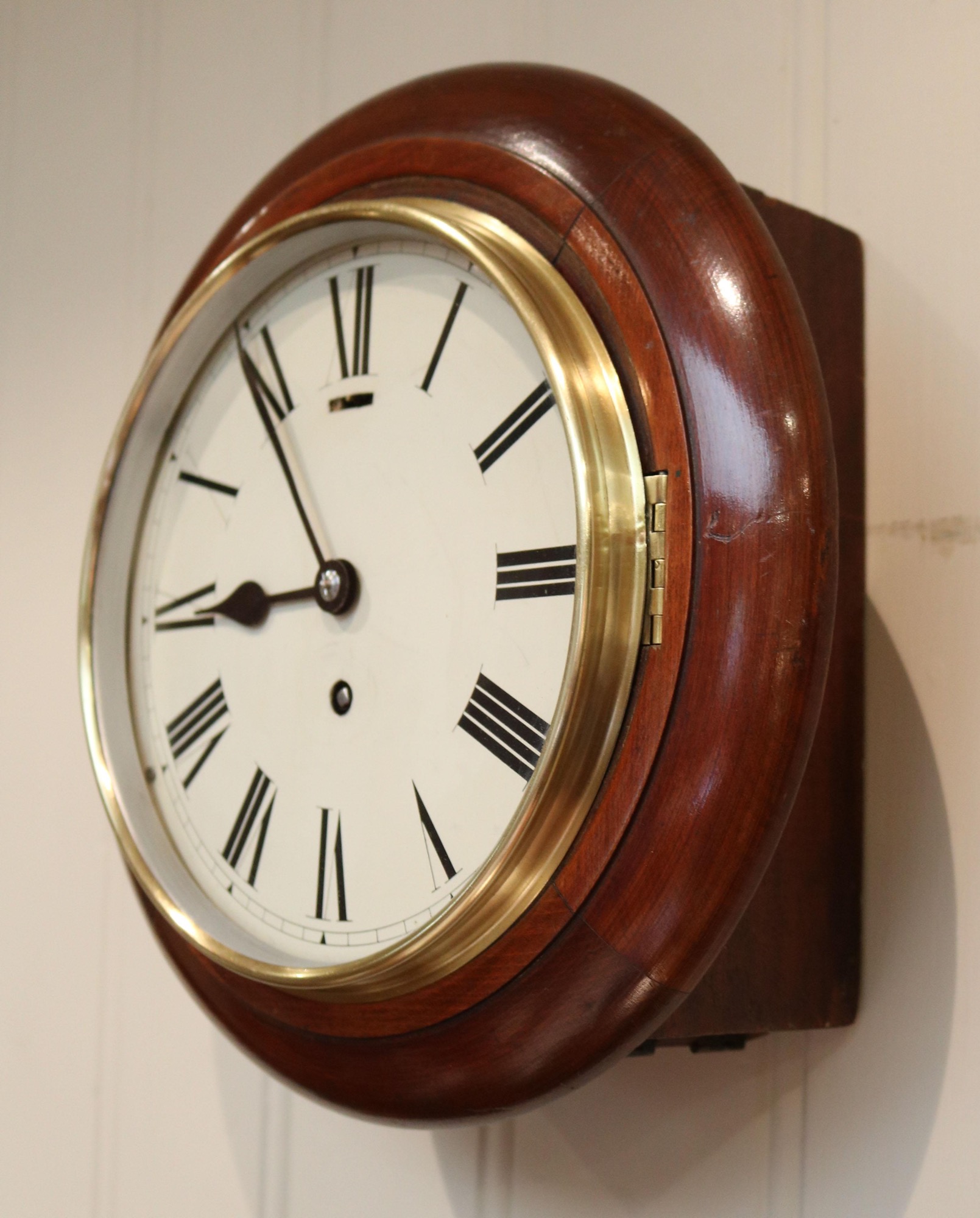 A small round dial wall Clock, dating to The George V period, c.1920 having a beechwood mahogany finish surround with a brass bezel and an 8 day lever platform balance movement. The lever below the XII is a regulation index.