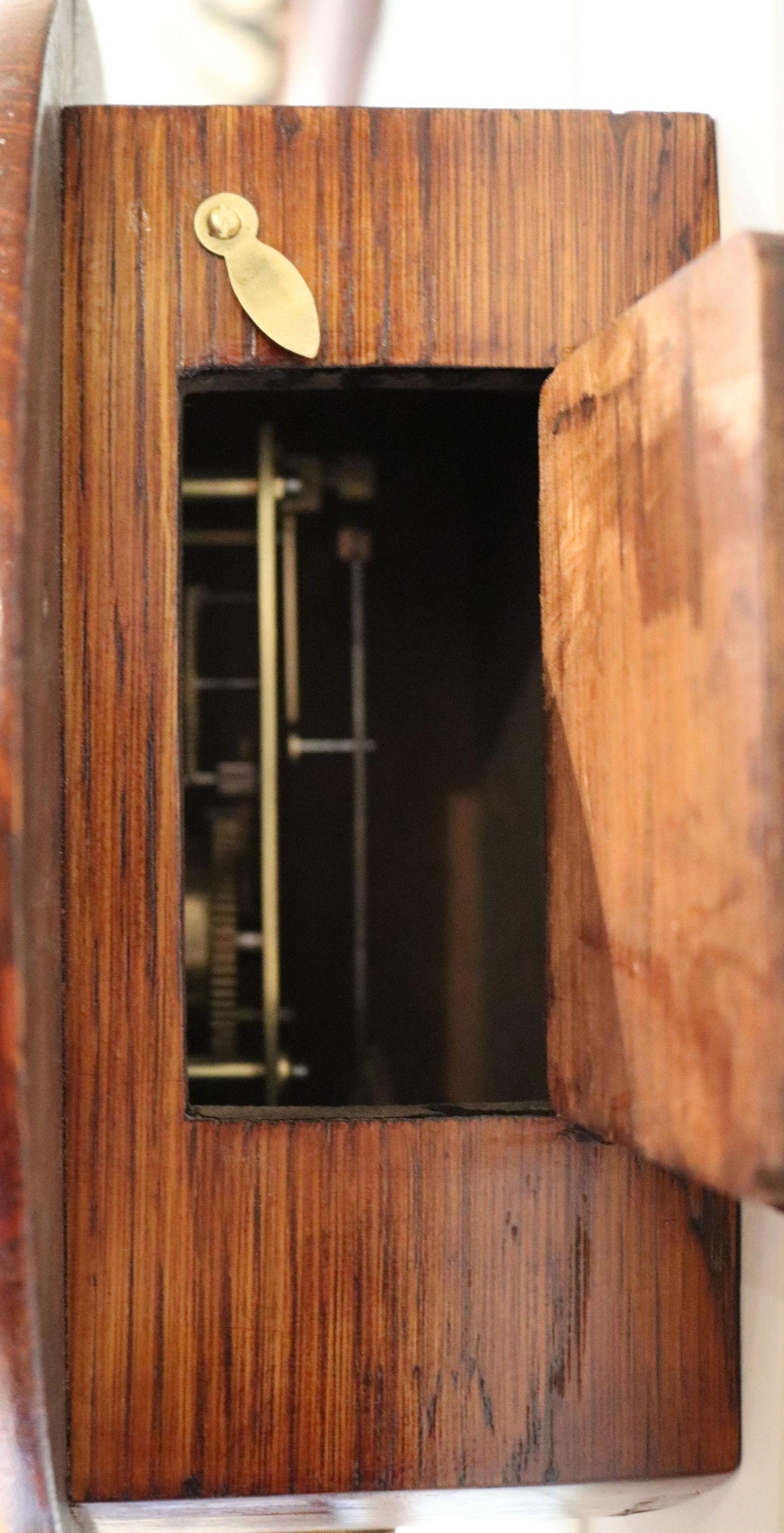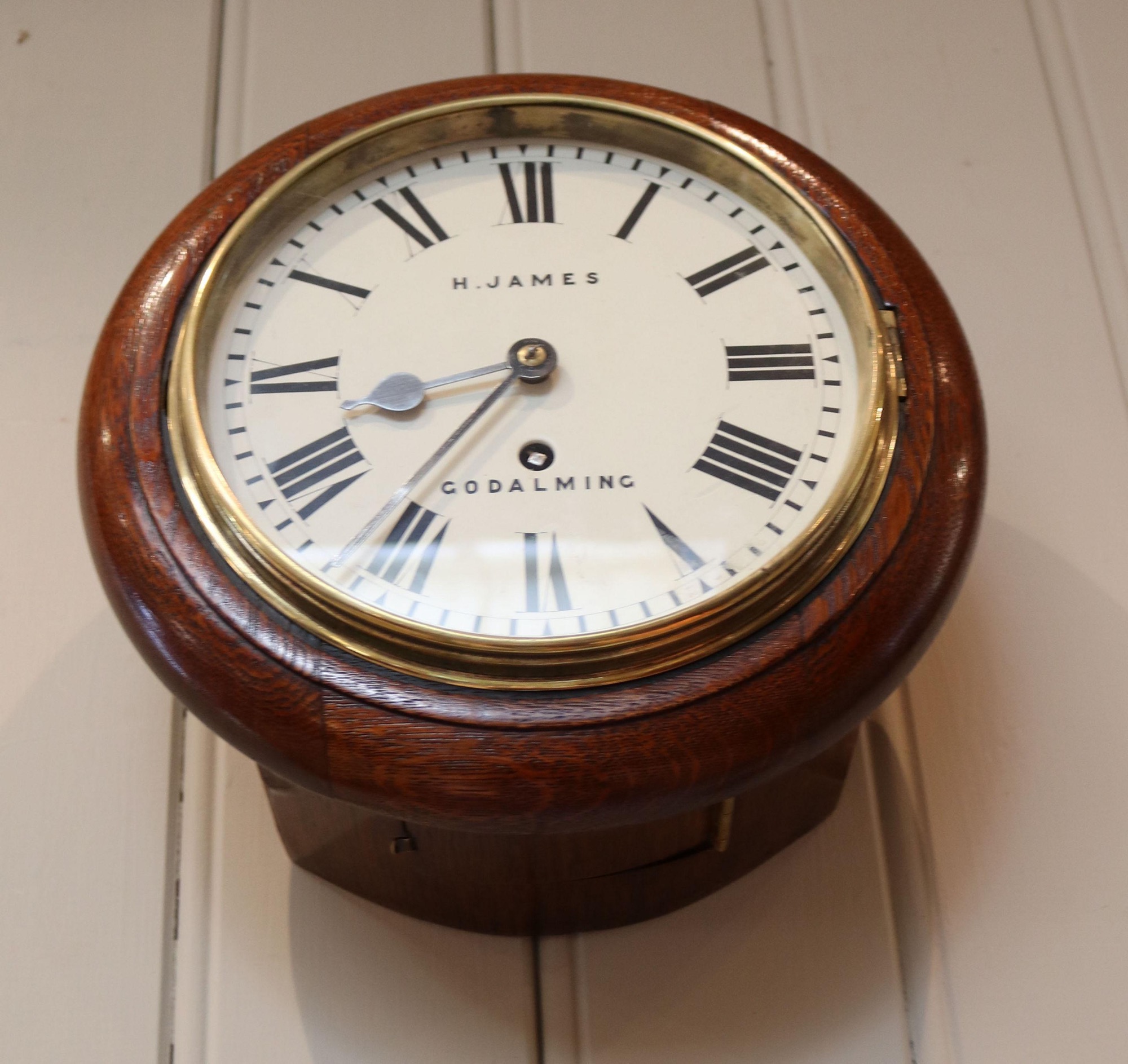 A solid oak cased dial clock, dating to the late 19TH Century. It has a turned outer rim, with a brass dial and a inch diameter dial, signed by the original retailer/maker, H. James of Godalming. It has an 8 day pendulum movement. An H James of Godalming is listed as working 1862-78, (this will be from the 2nd generation).