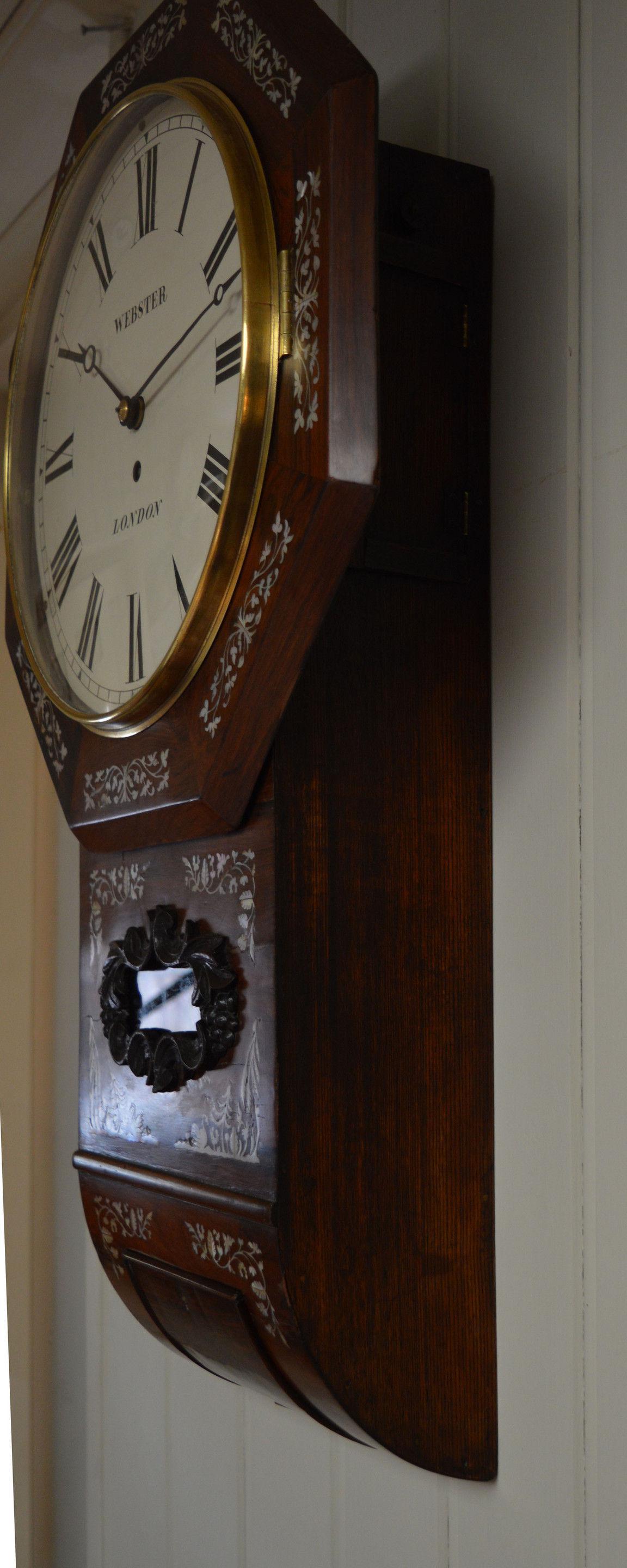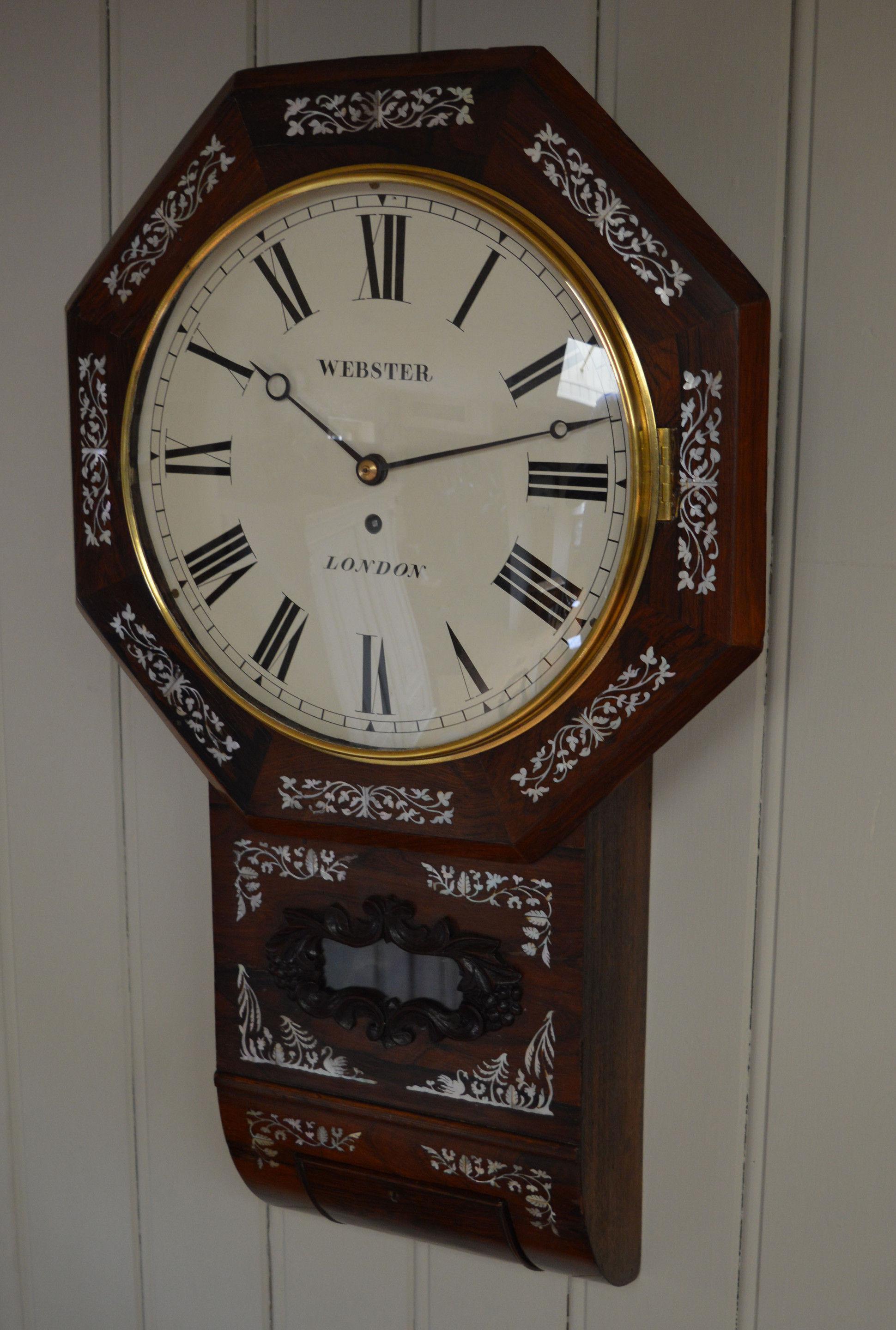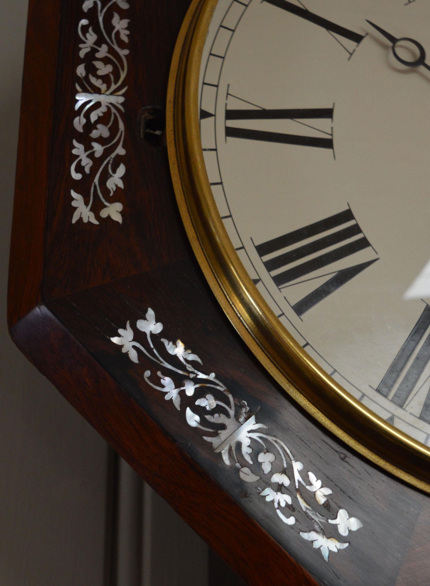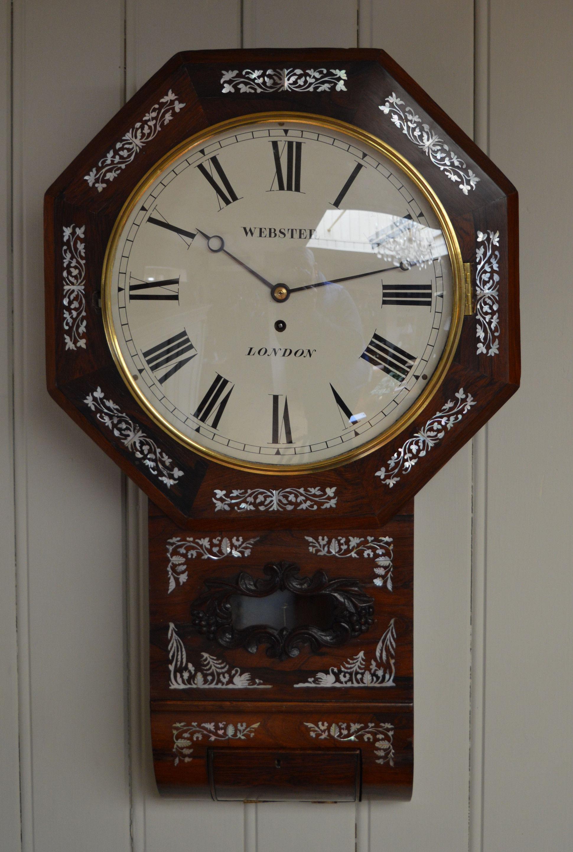 A mid Victorian rosewood drop dial wall clock. It has an octagonal surround and a convex drop base with a window to view the swinging pendulum and is inlaid with mother of pearl decoration. The enamel dial has a convex glass and is signed by the maker Webster of London. It has an 8 day long pendulum fusee movement.