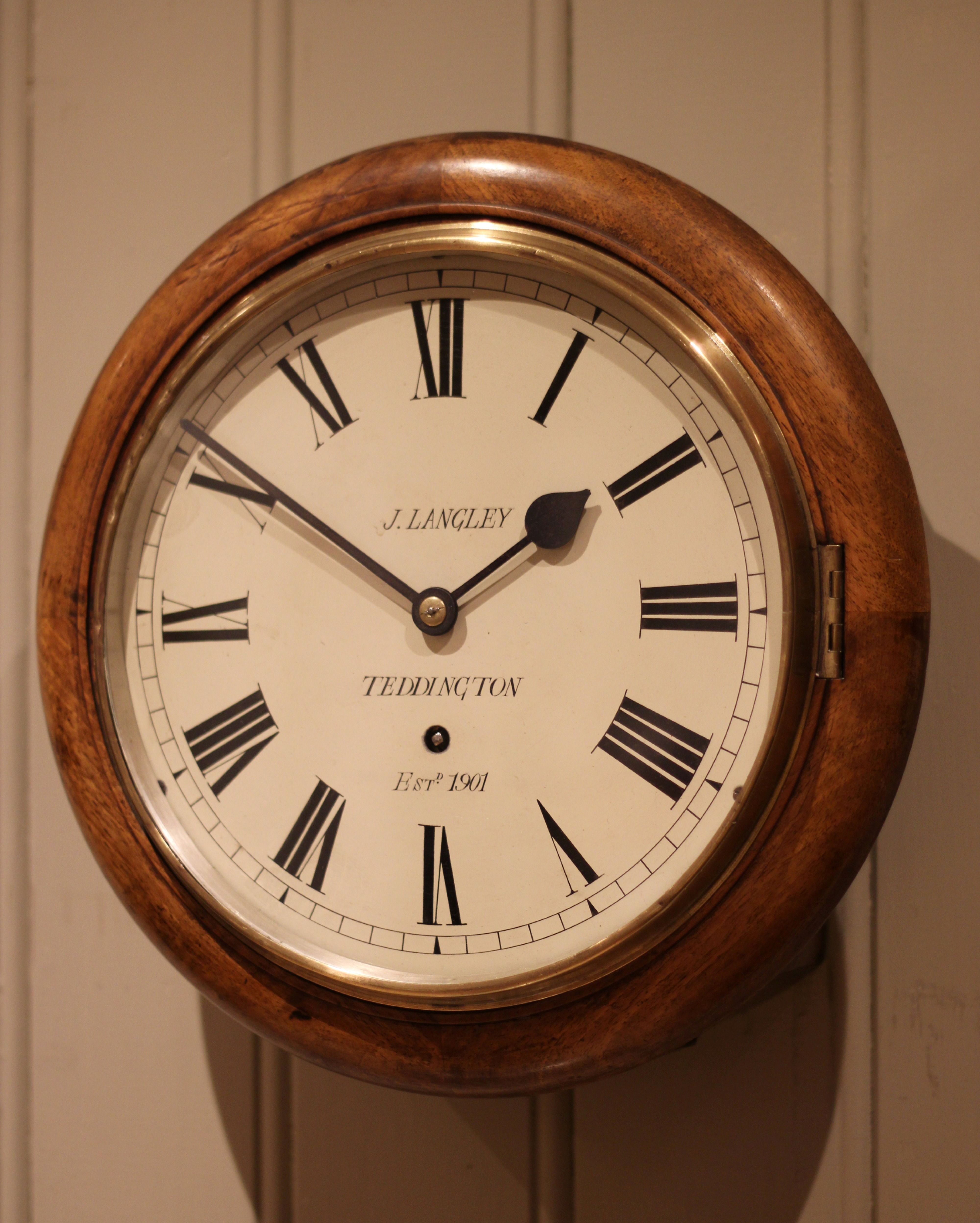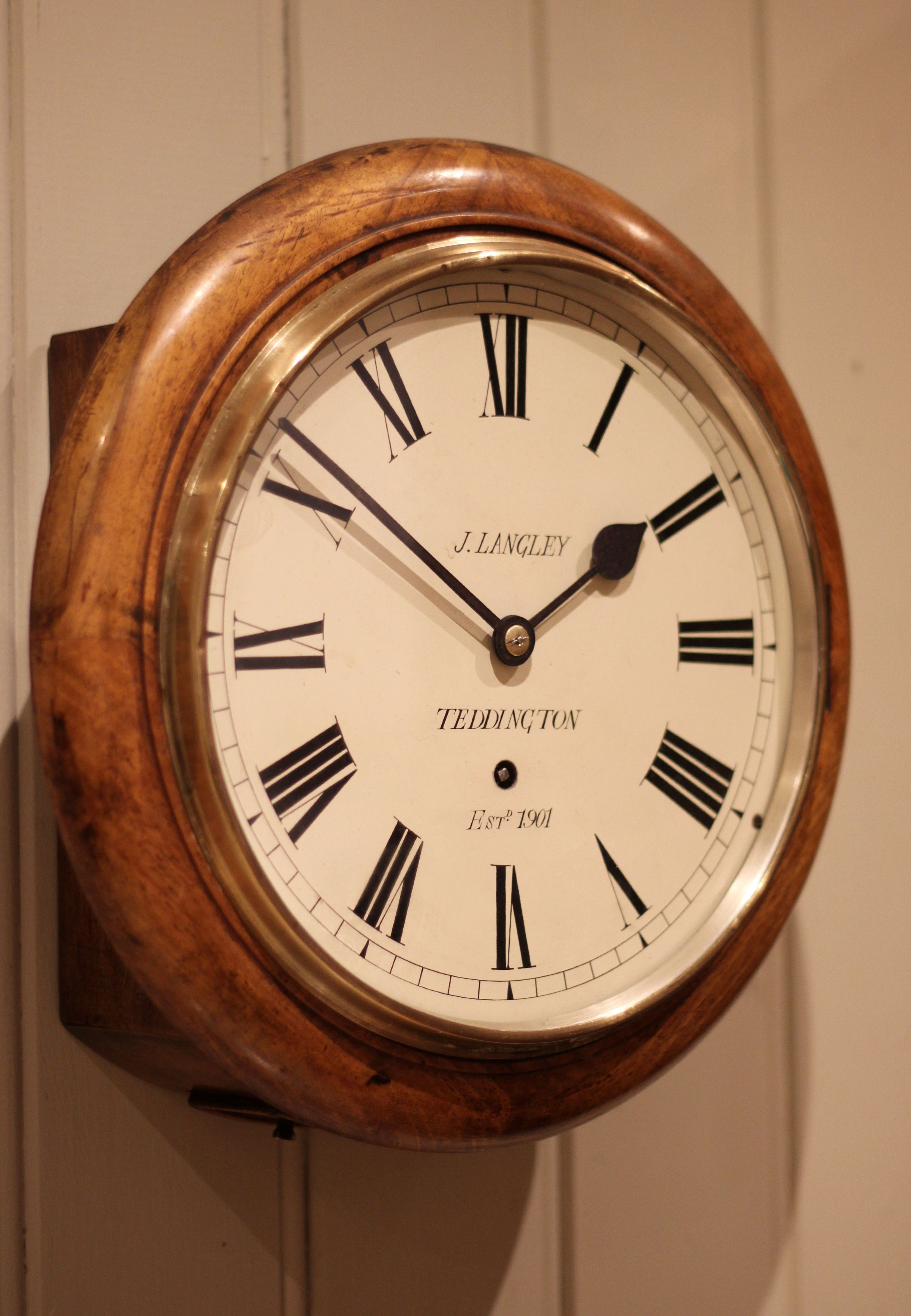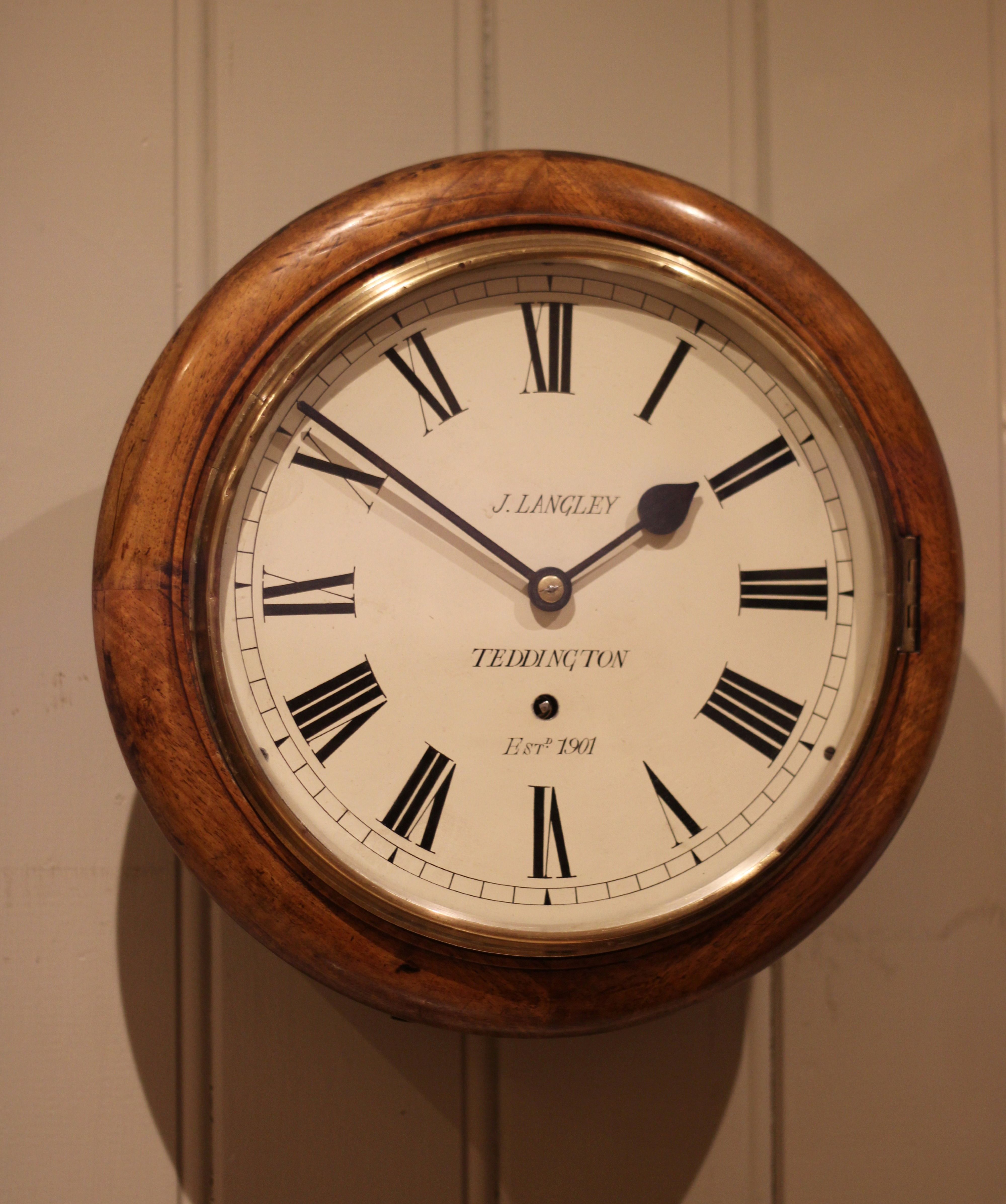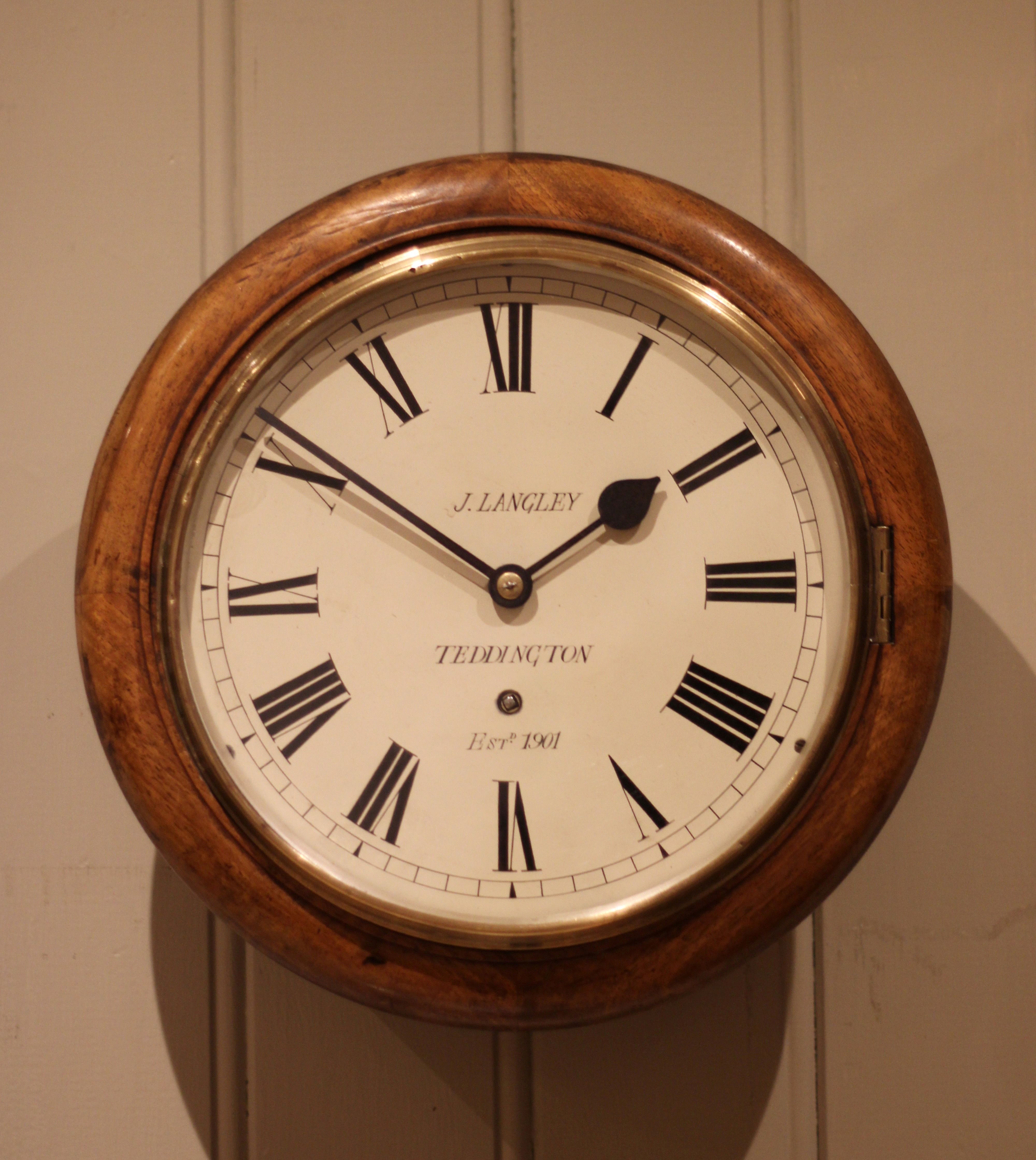 An early 20th Century walnut dial clock . It has a solid walnut turned outer rim, and a polished brass bezel The white painted enamel dial is signed by the original retailer J Langley who were in Teddington . It has an 8 day pendulum movement made by W & H , with access to the pendulum through the base door.