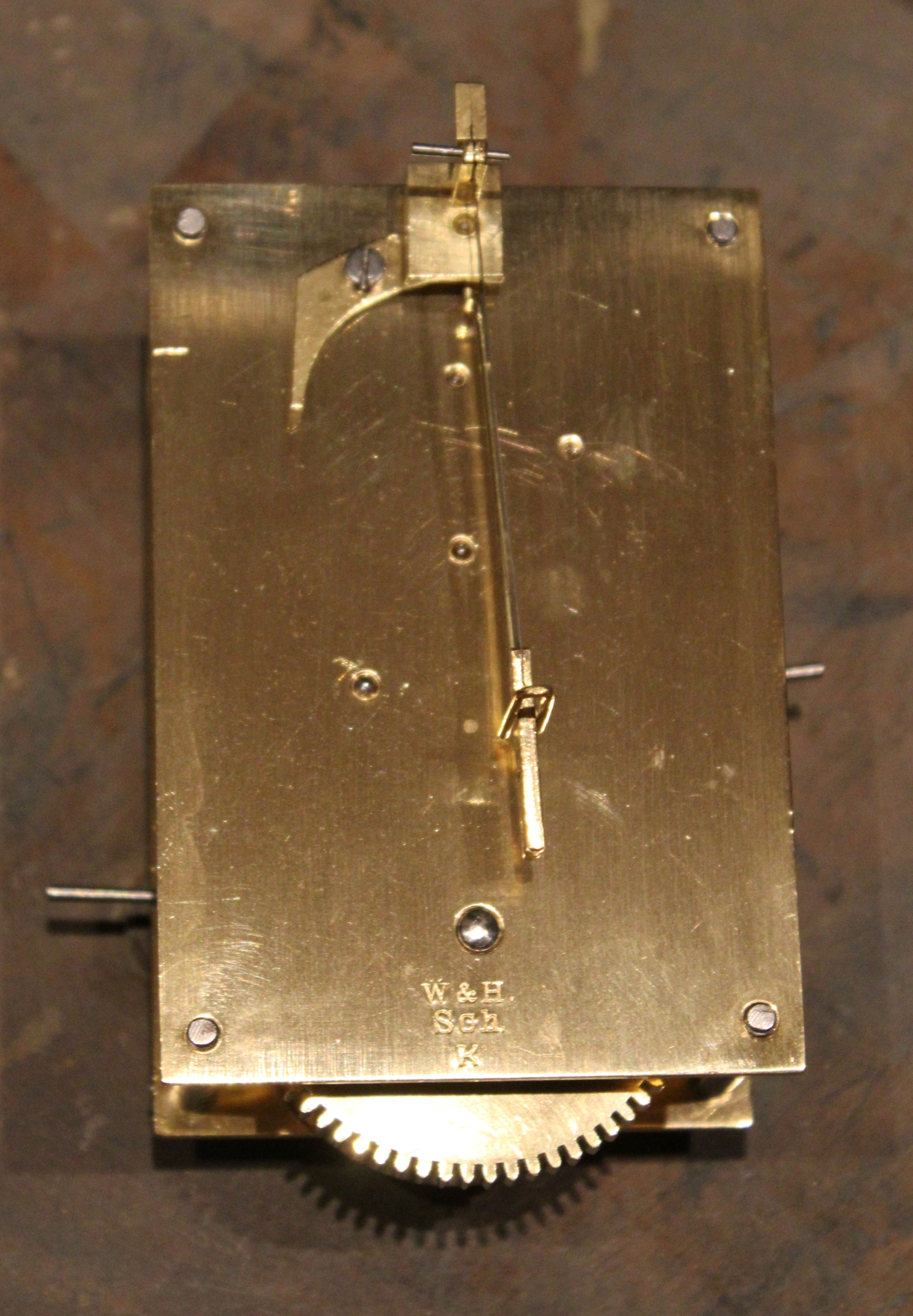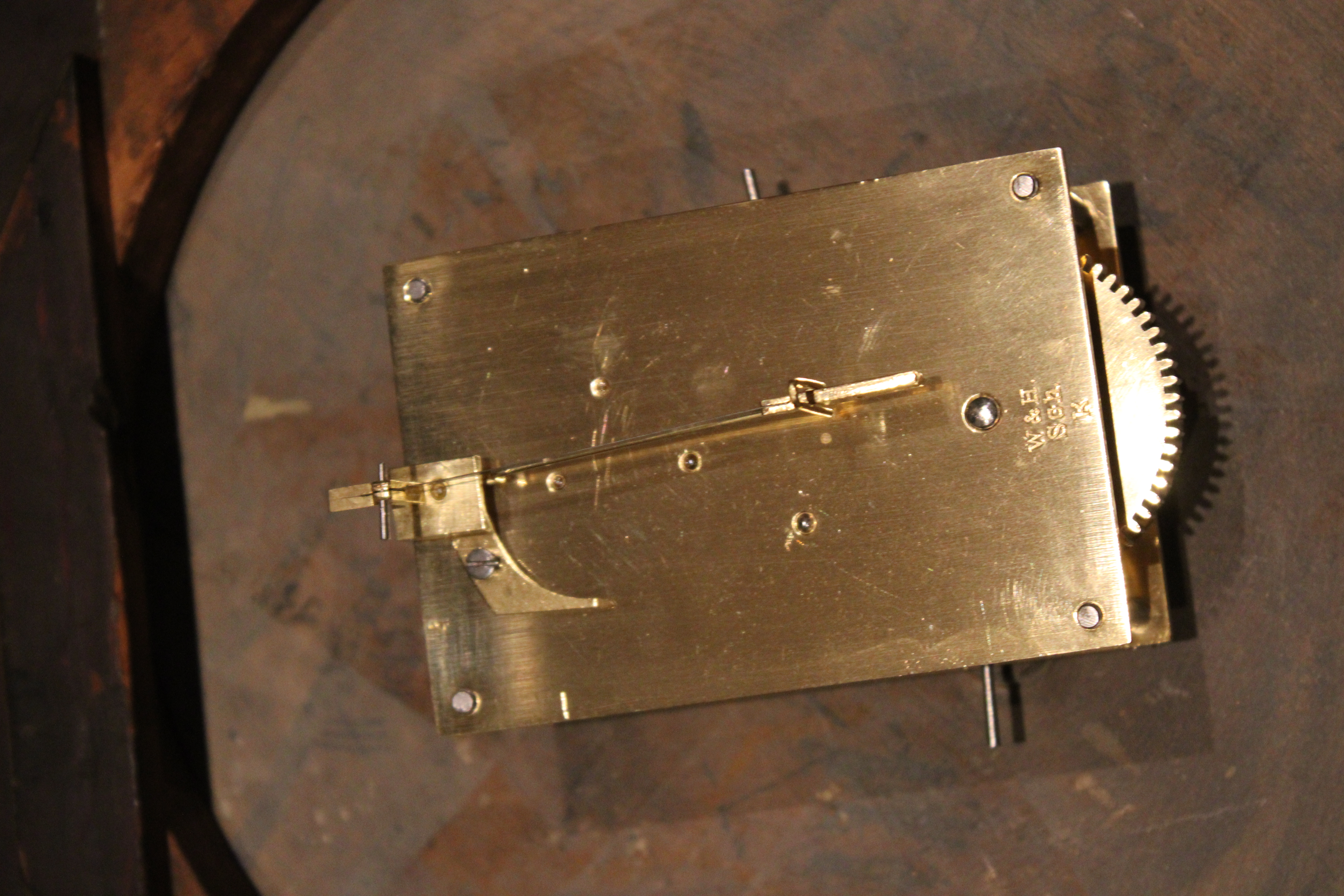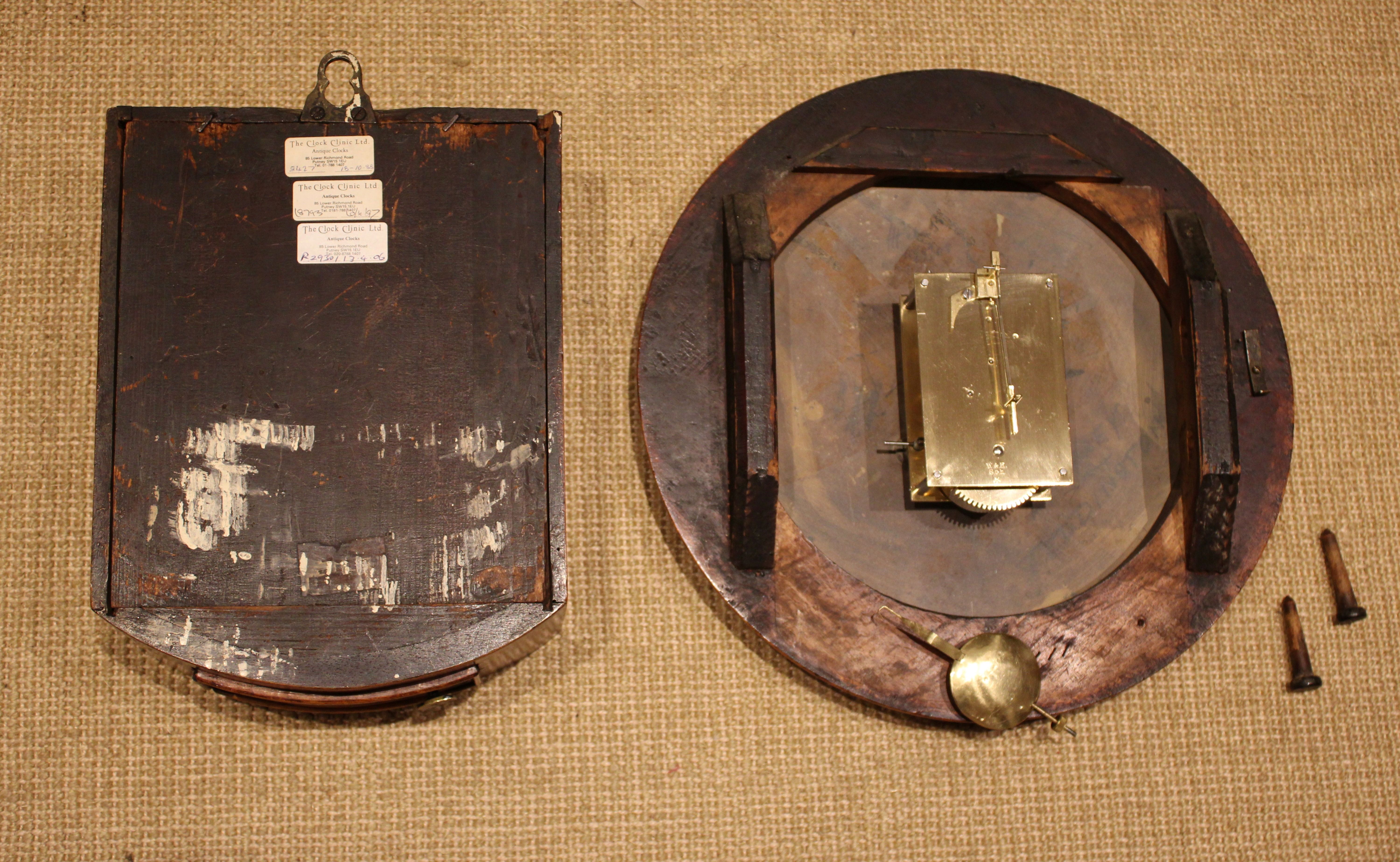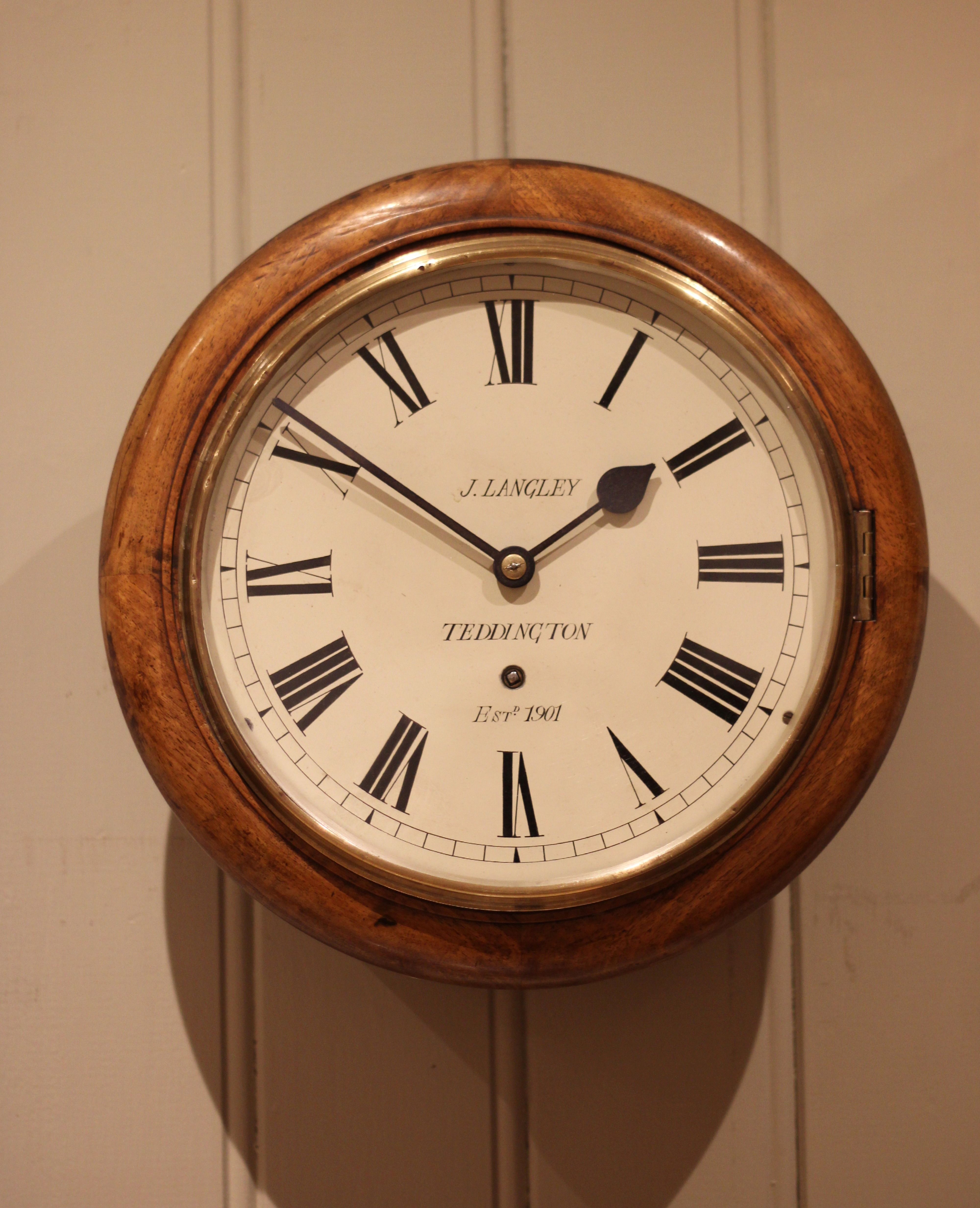 An early 20th Century walnut dial clock . It has a solid walnut turned outer rim, and a polished brass bezel The white painted enamel dial is signed by the original retailer J Langley who were in Teddington . It has an 8 day pendulum movement made by W & H , with access to the pendulum through the base door.