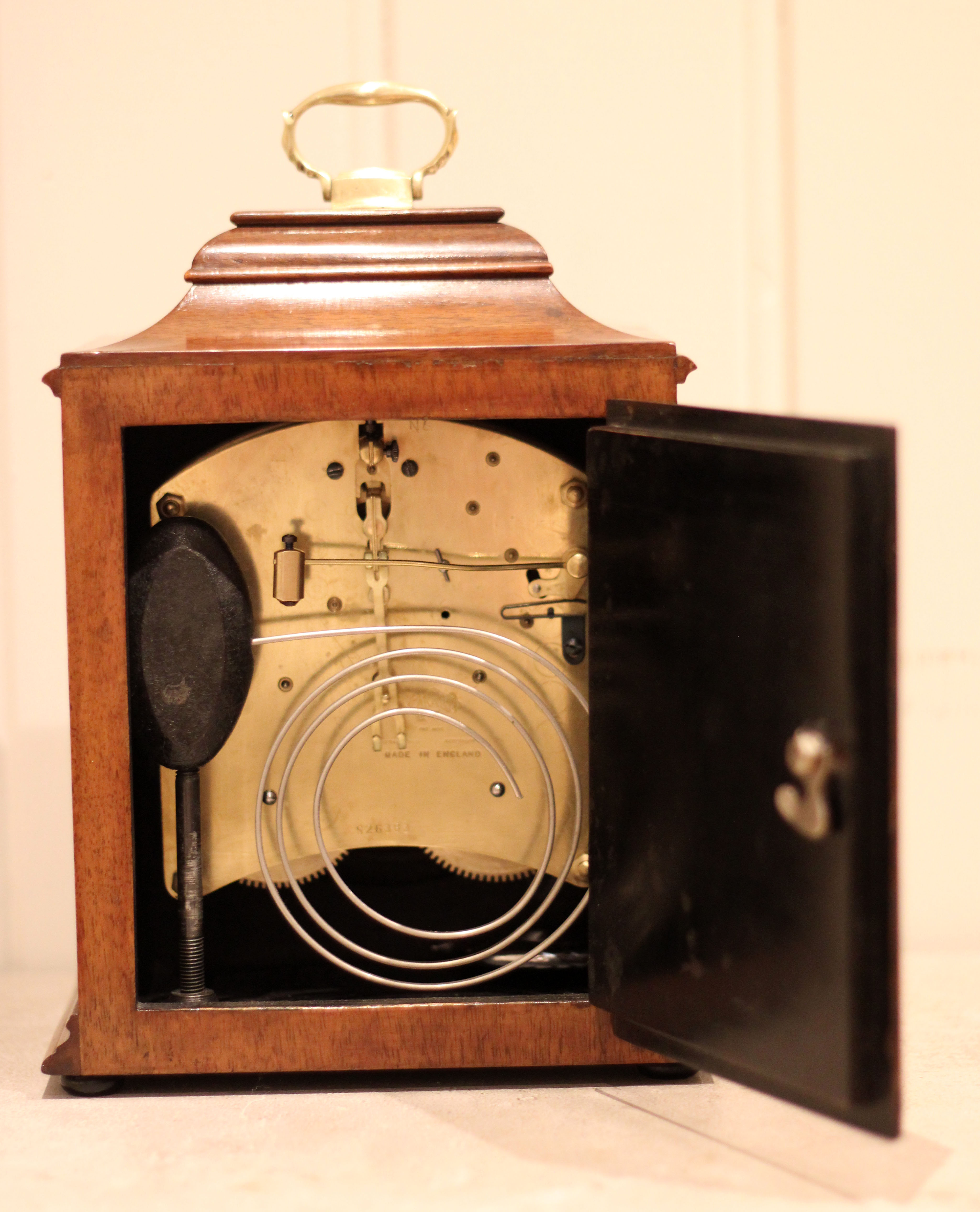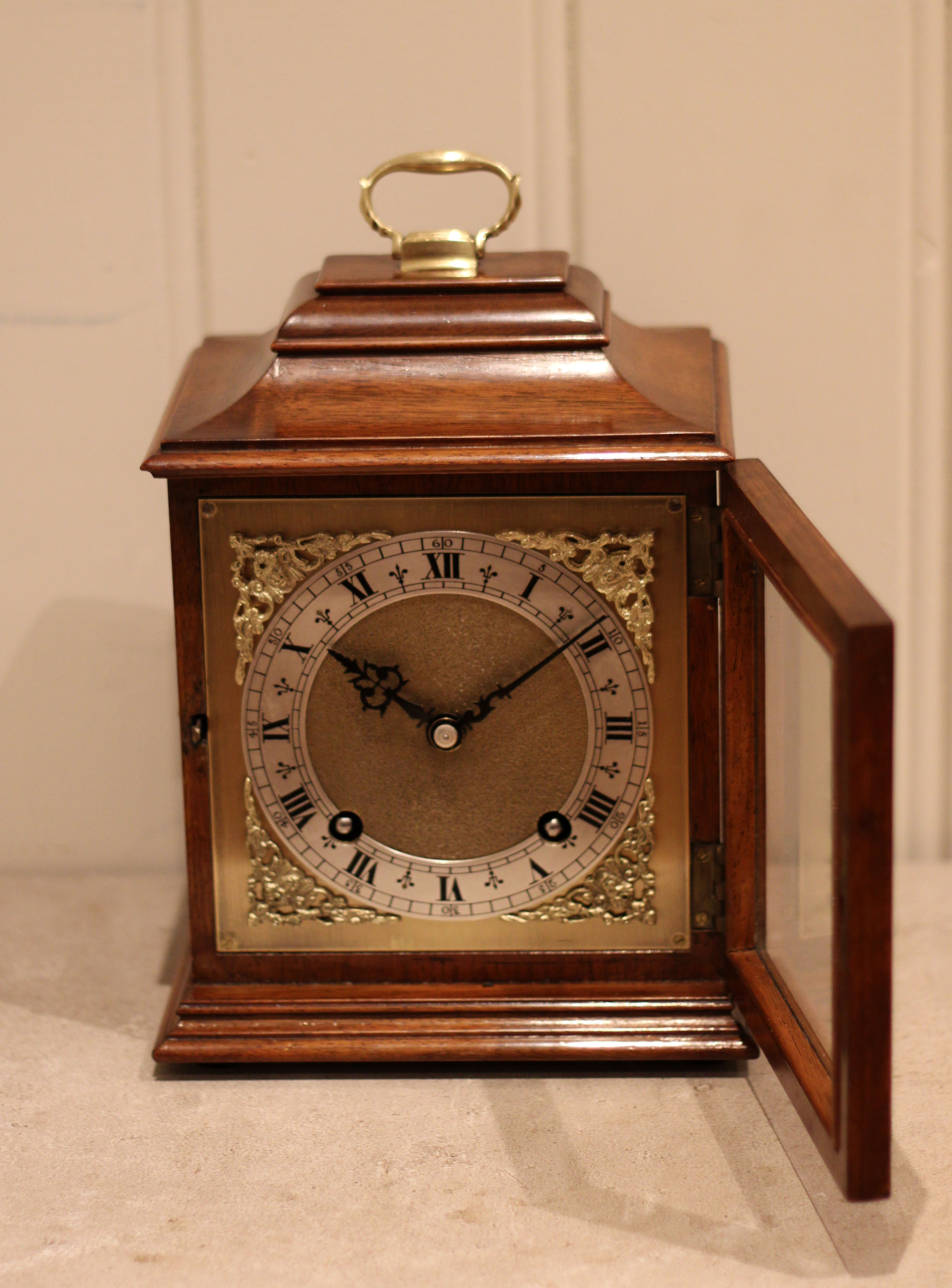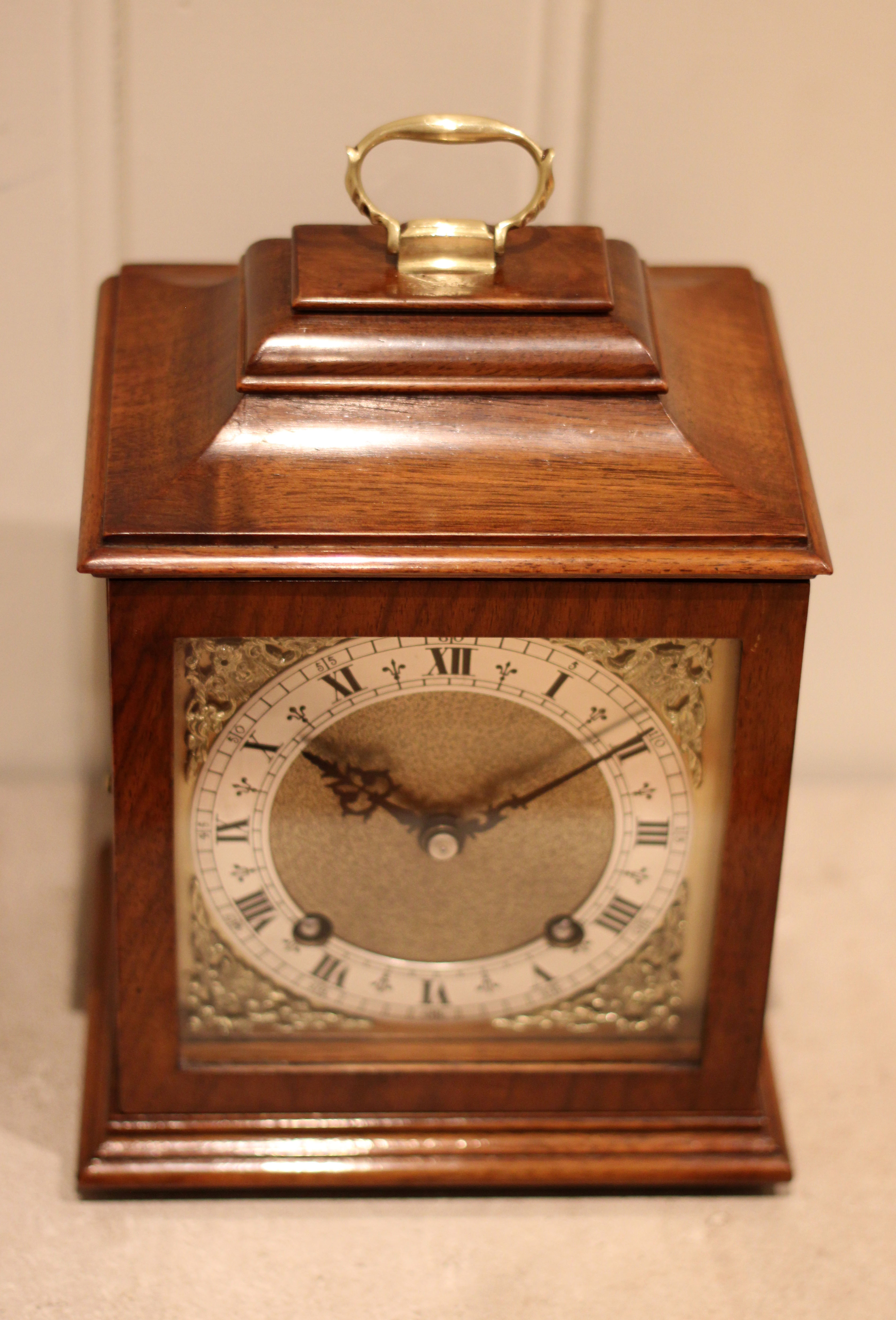 A walnut mantel clock dating to the early 20th Century. The case is of simple form, having a flat top and an ogee moulded base , with a brass carrying handle . It has a brass dial with a silvered chapter ring and a matted centre. The 8 day movement strikes the hours and halves on a gong and was made by Garrard , retaining the original key & pendulum .