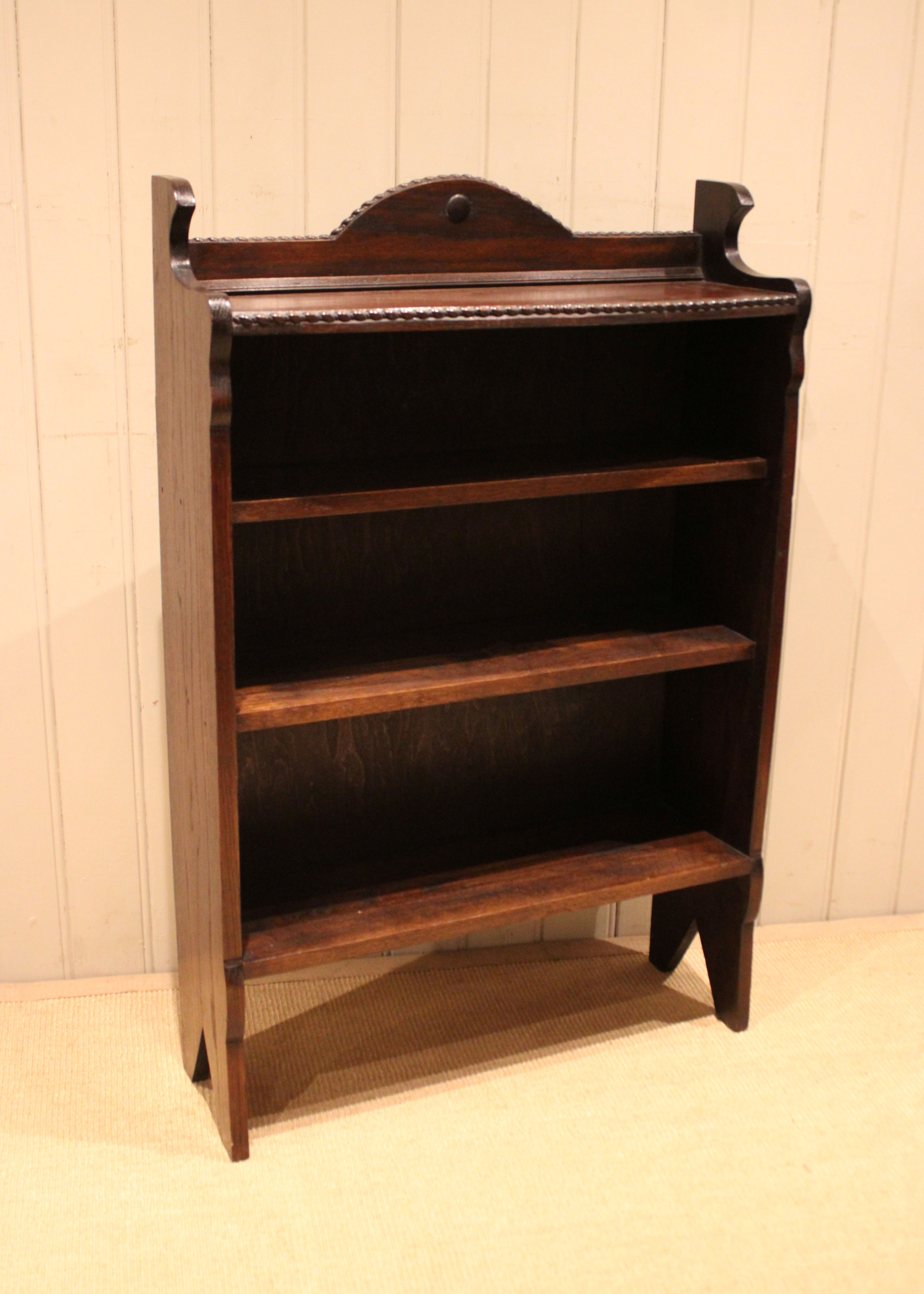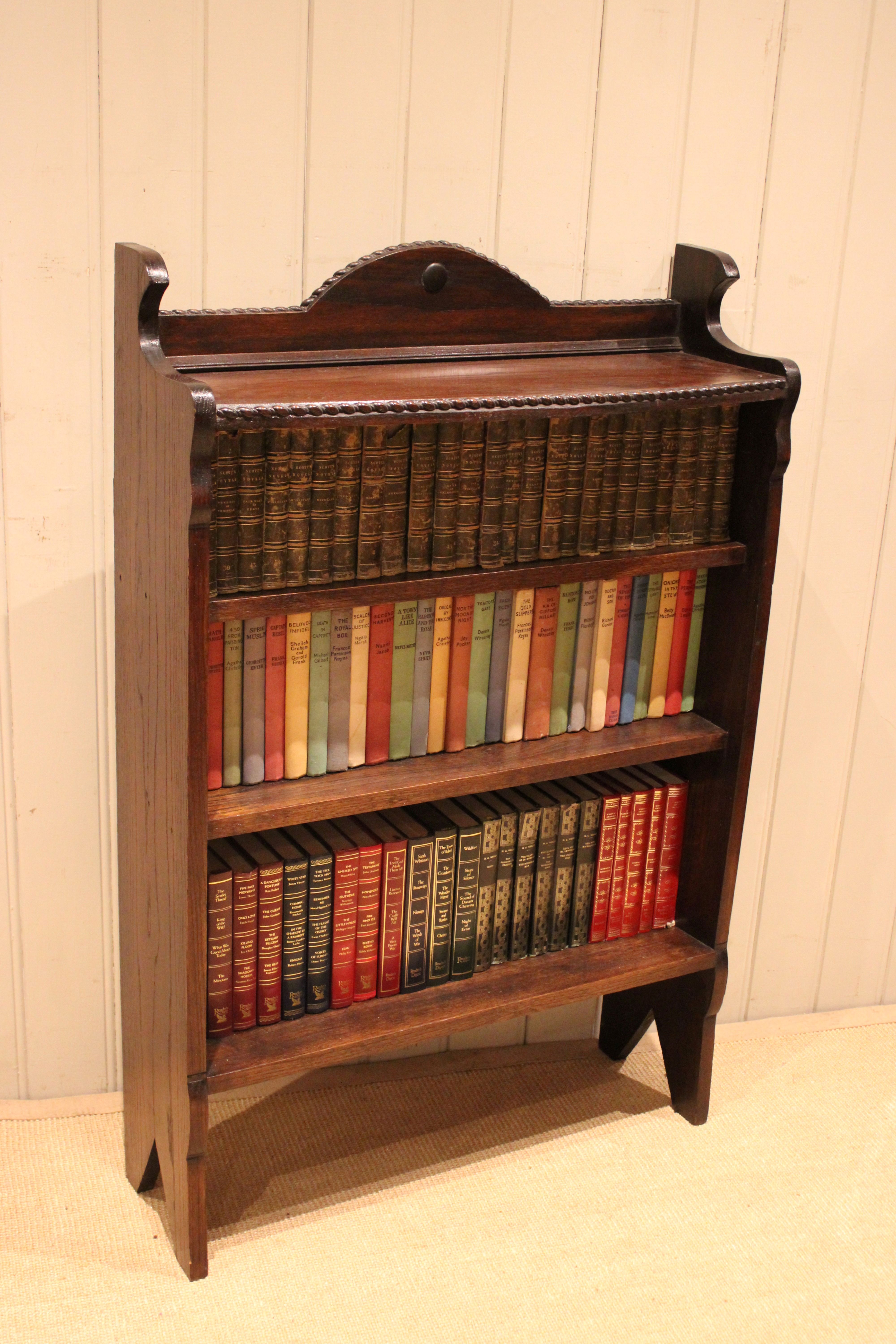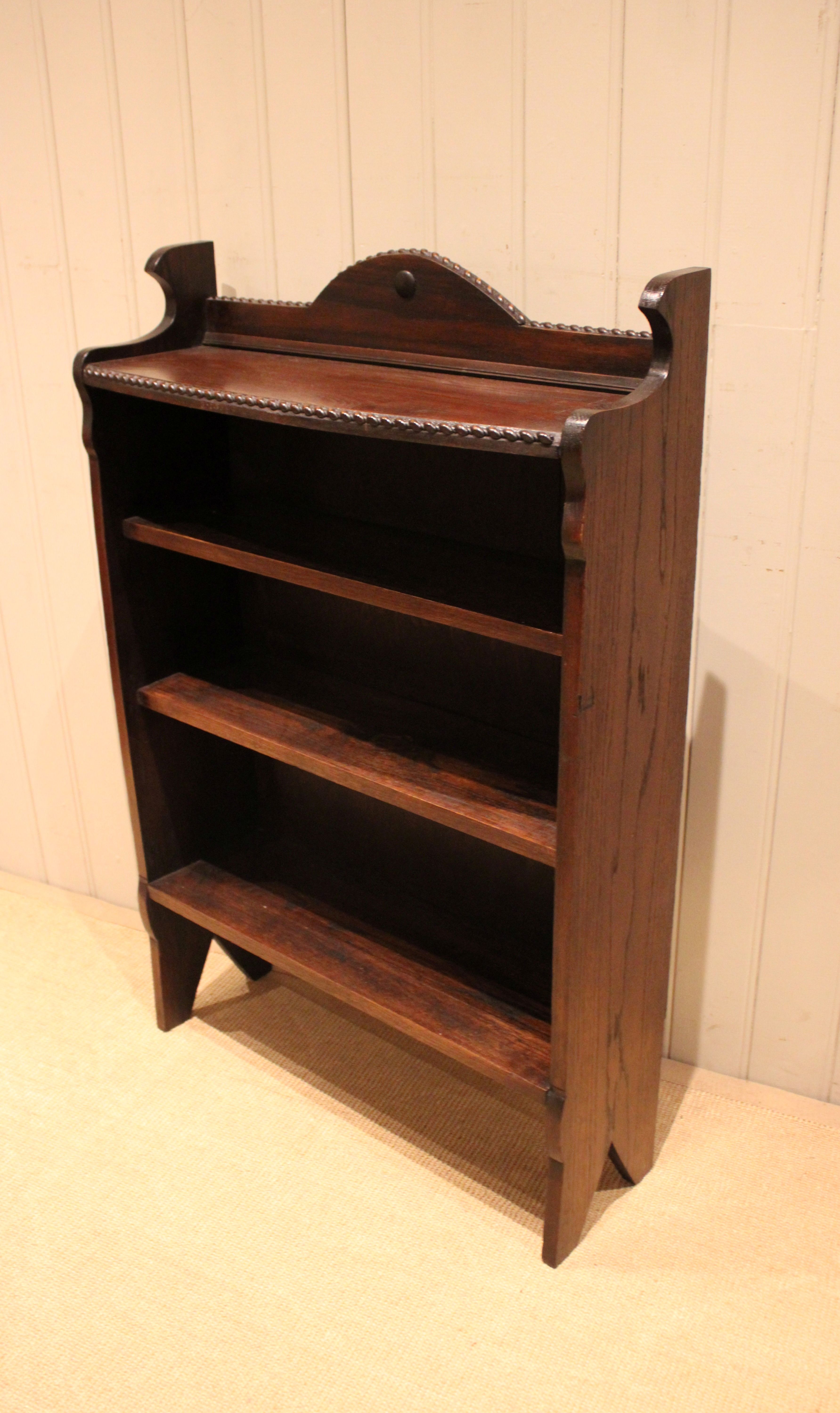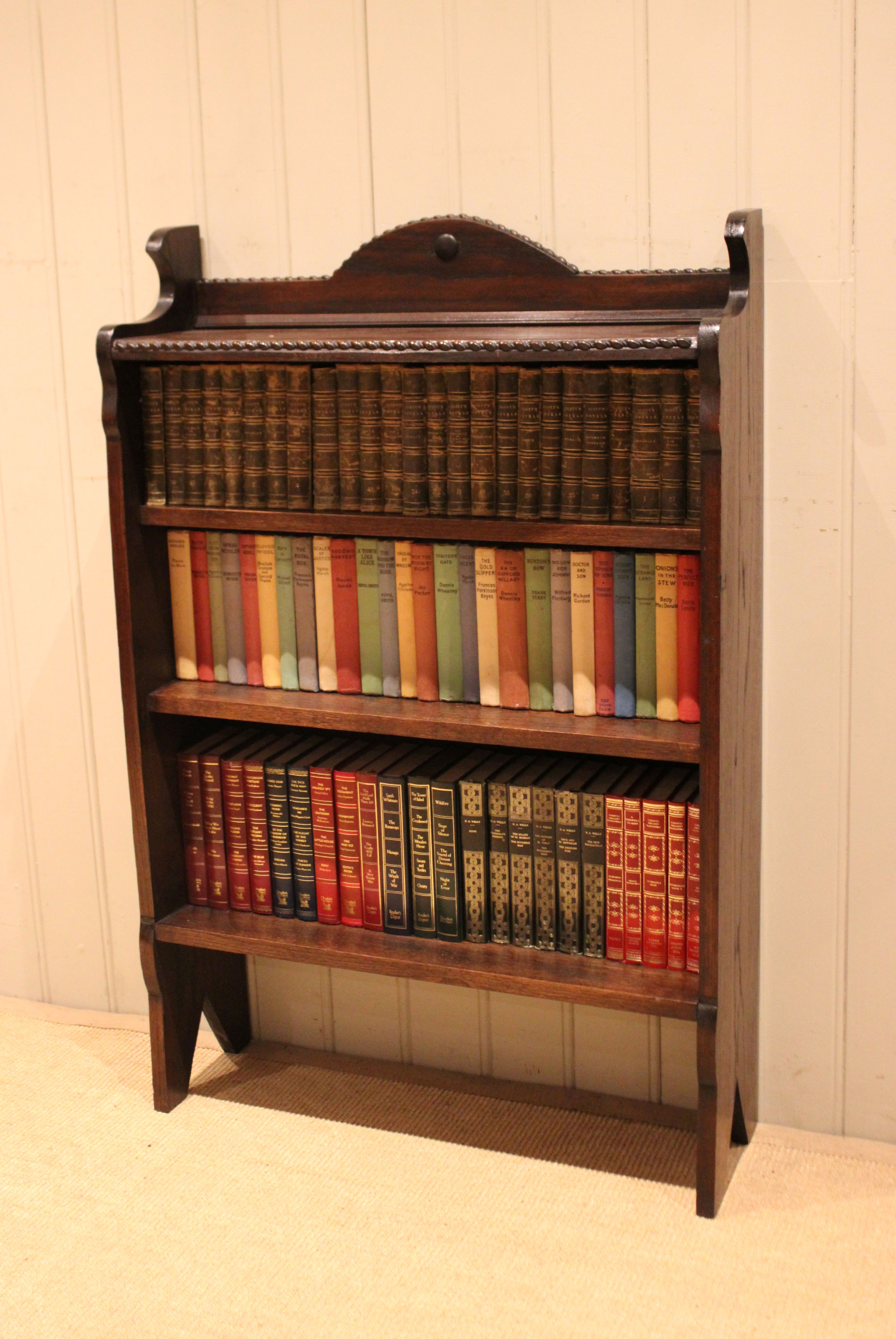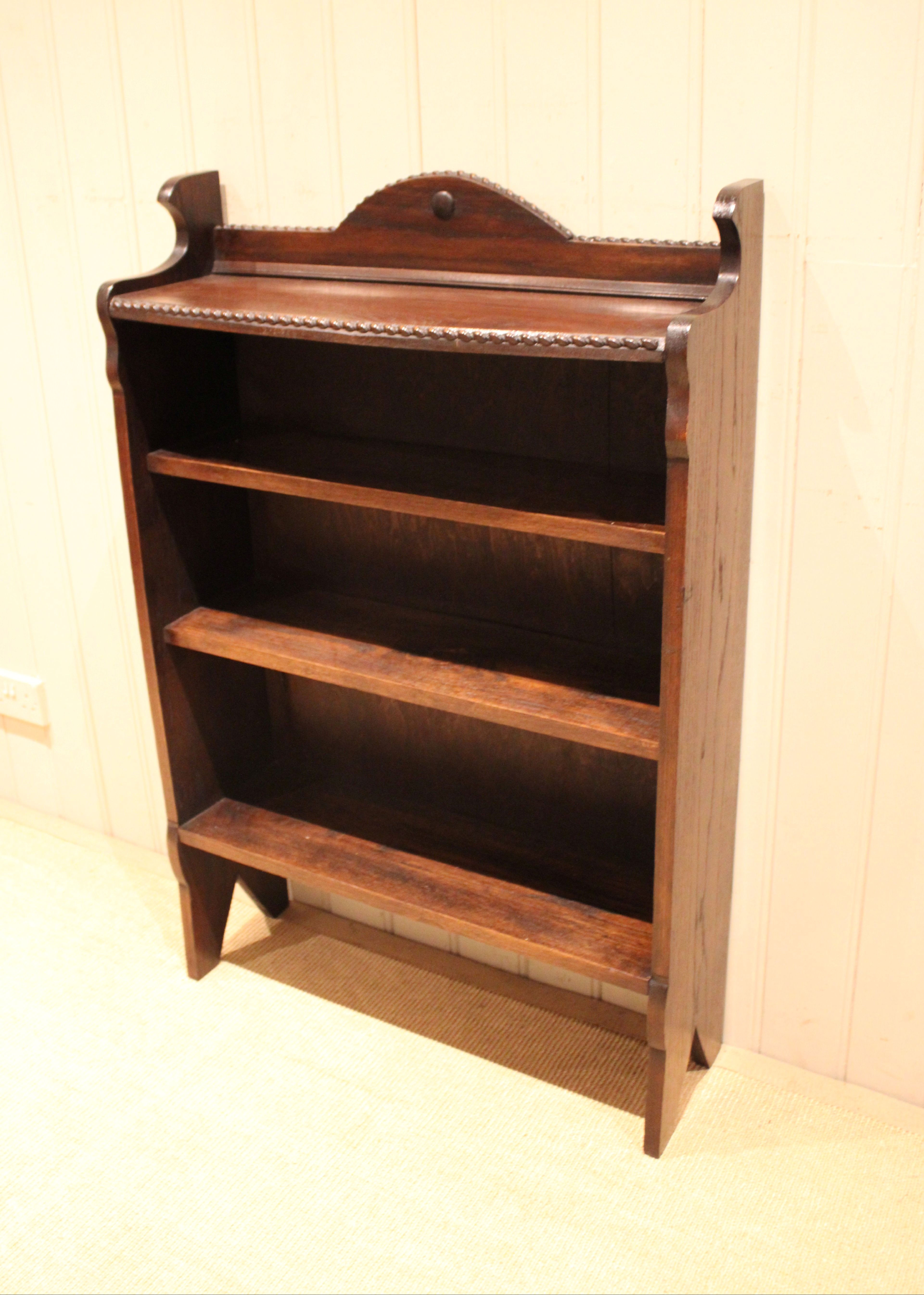 Solid oak arch top open bookcase having an arch top with a decorative beaded edge , three fixed shelves , raised on side brackets. Te shelf dimensions are 68 cm wide and from the bottom up 26.5 cm high x 22 cm deep , 20.5 cm high x 19 cm deep and at the top 17 cm high x 19 cm deep .