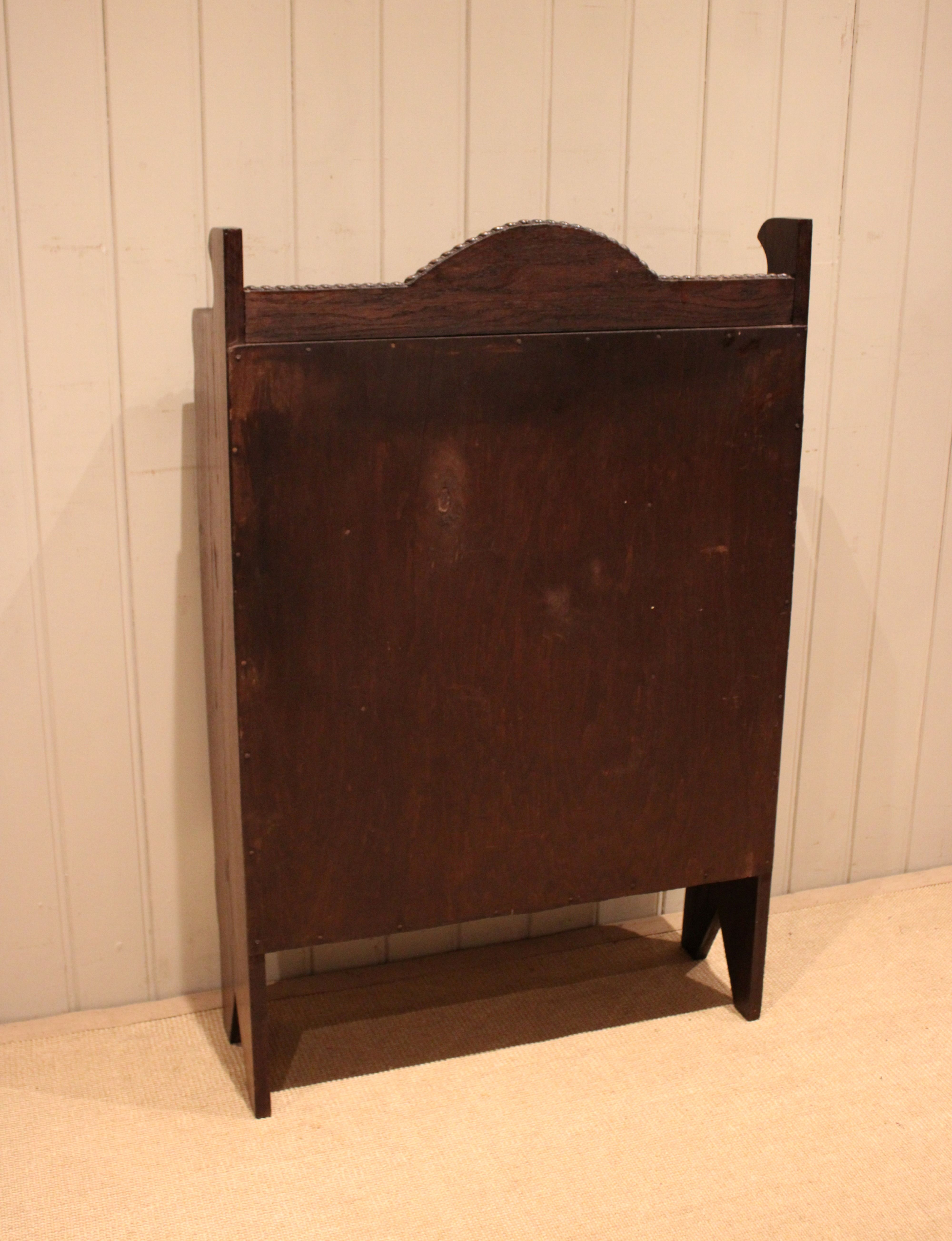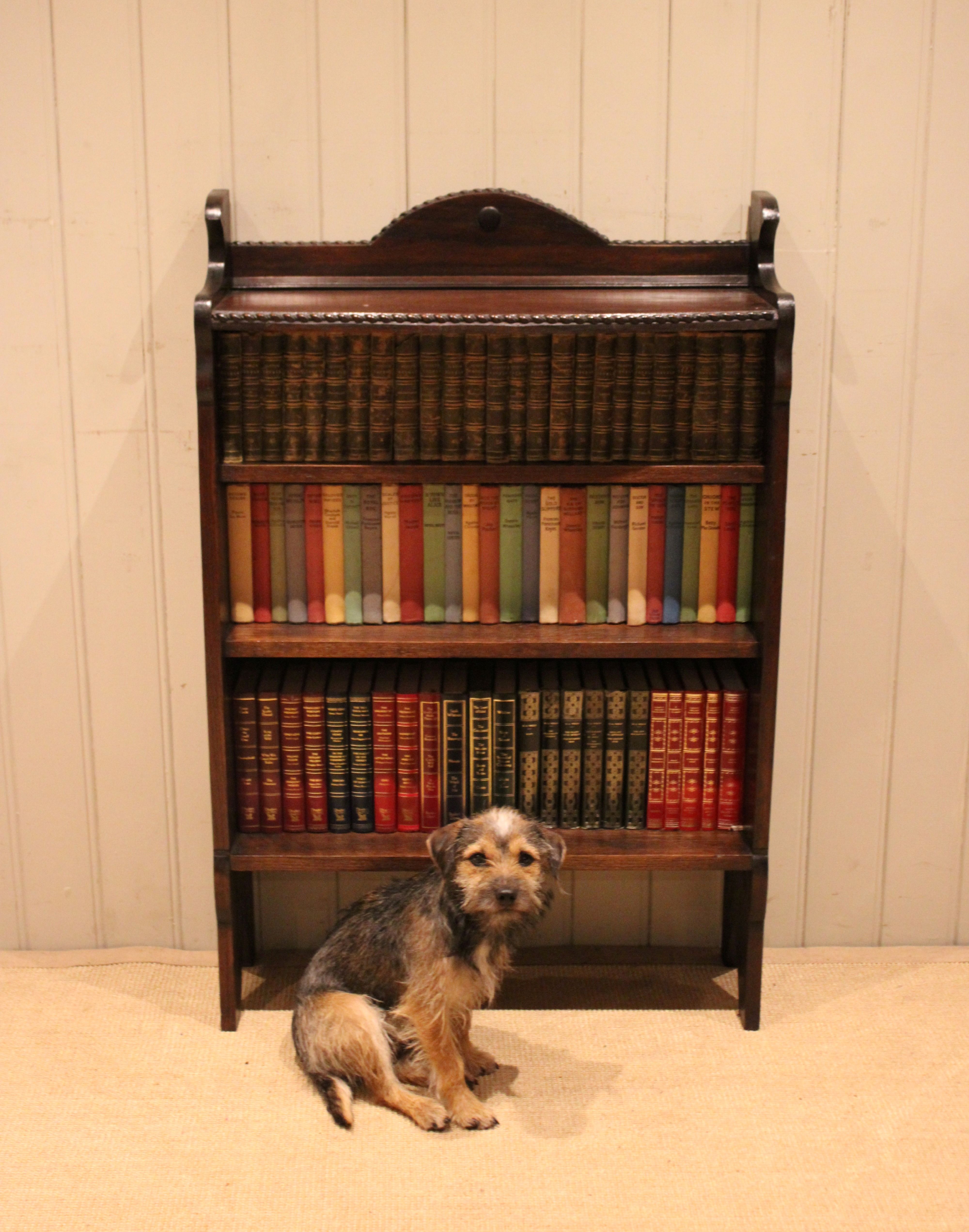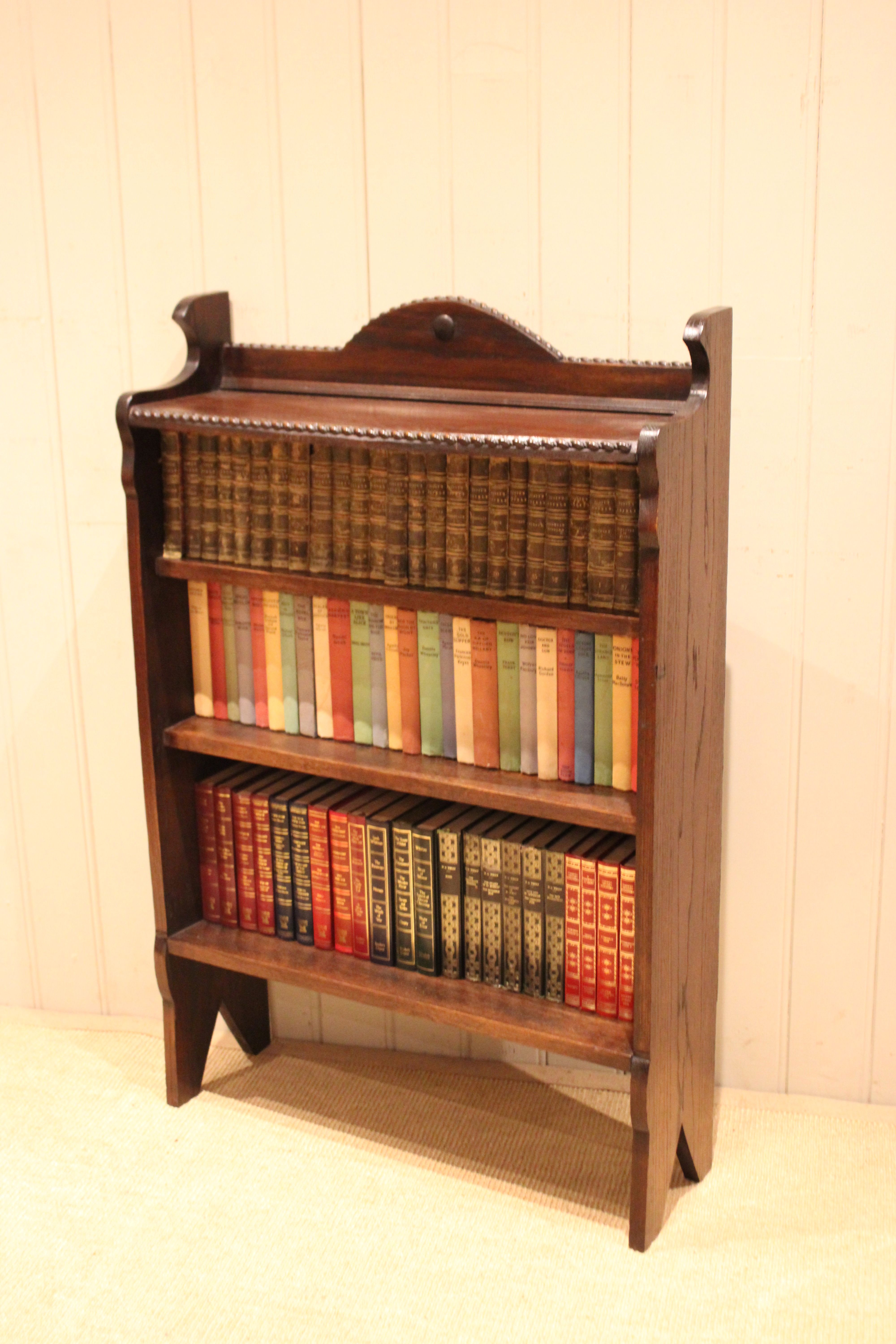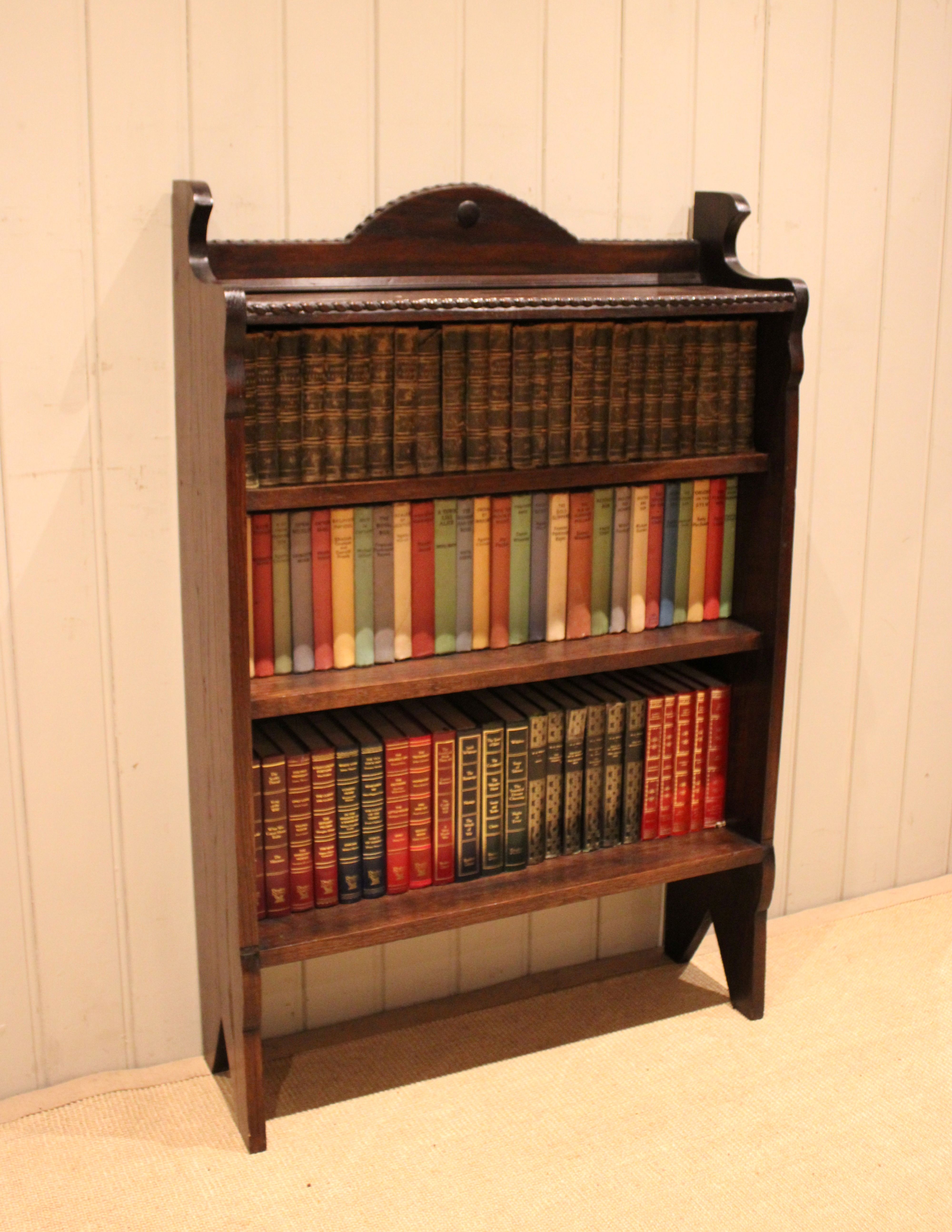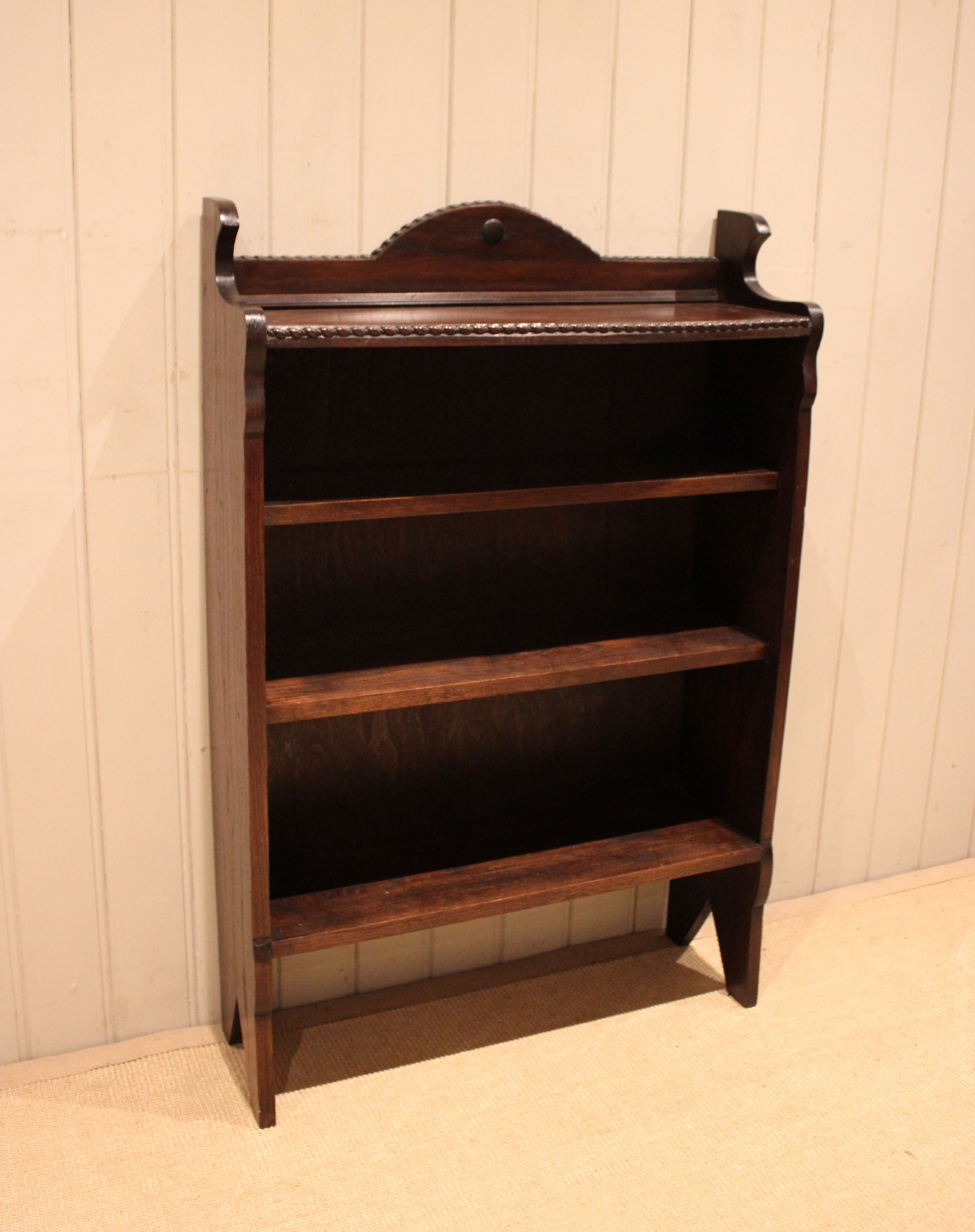 Solid oak arch top open bookcase having an arch top with a decorative beaded edge , three fixed shelves , raised on side brackets. Te shelf dimensions are 68 cm wide and from the bottom up 26.5 cm high x 22 cm deep , 20.5 cm high x 19 cm deep and at the top 17 cm high x 19 cm deep .