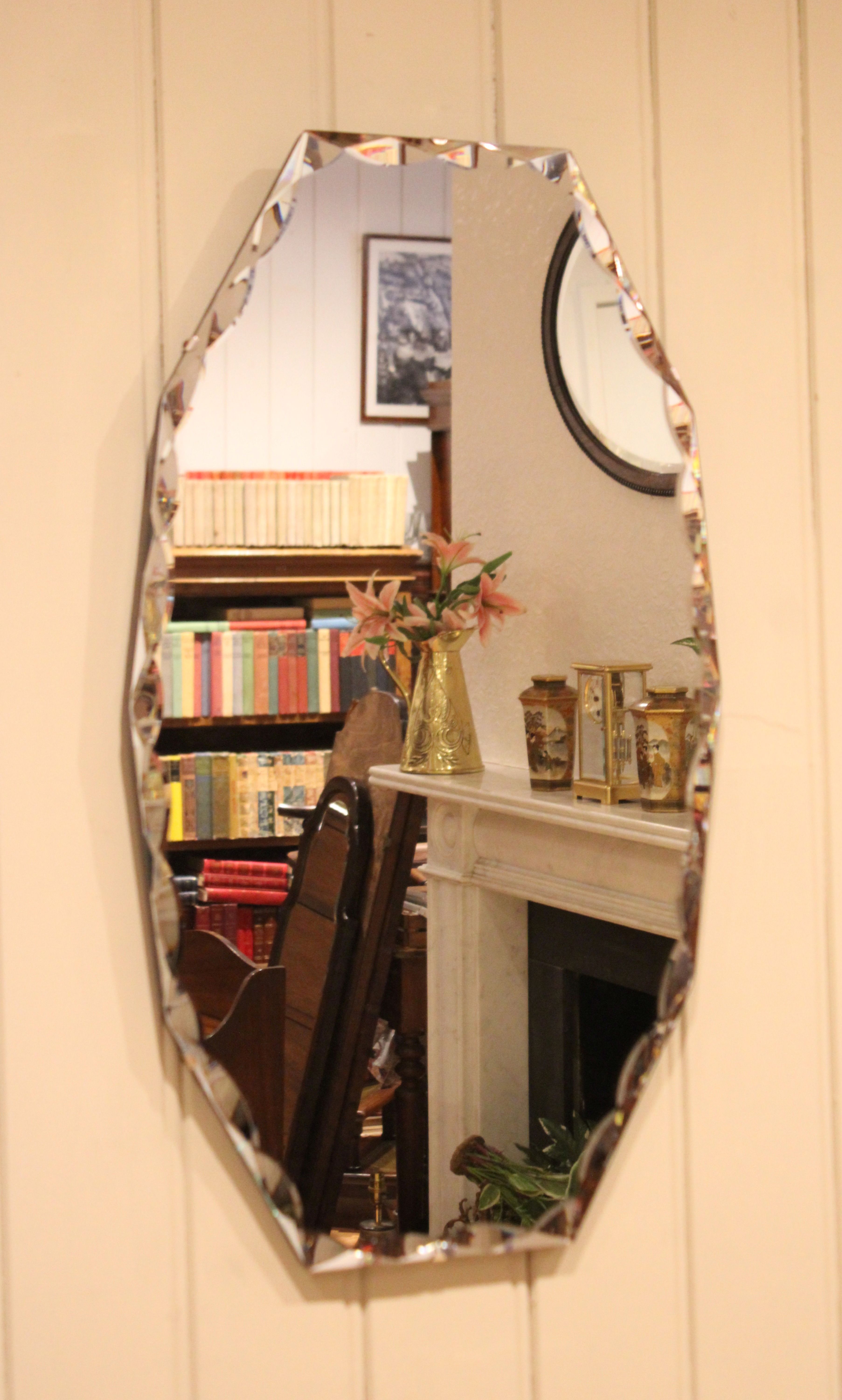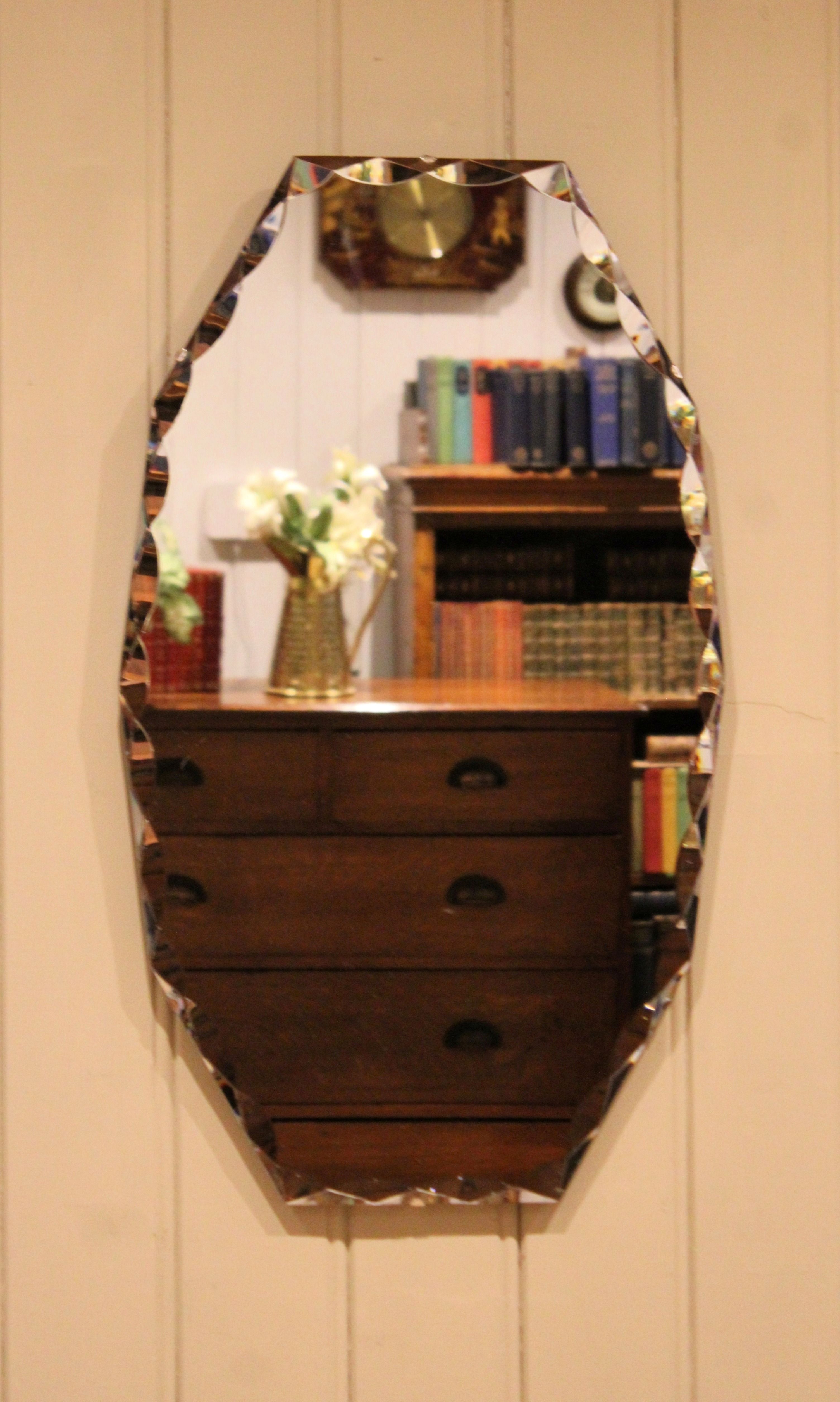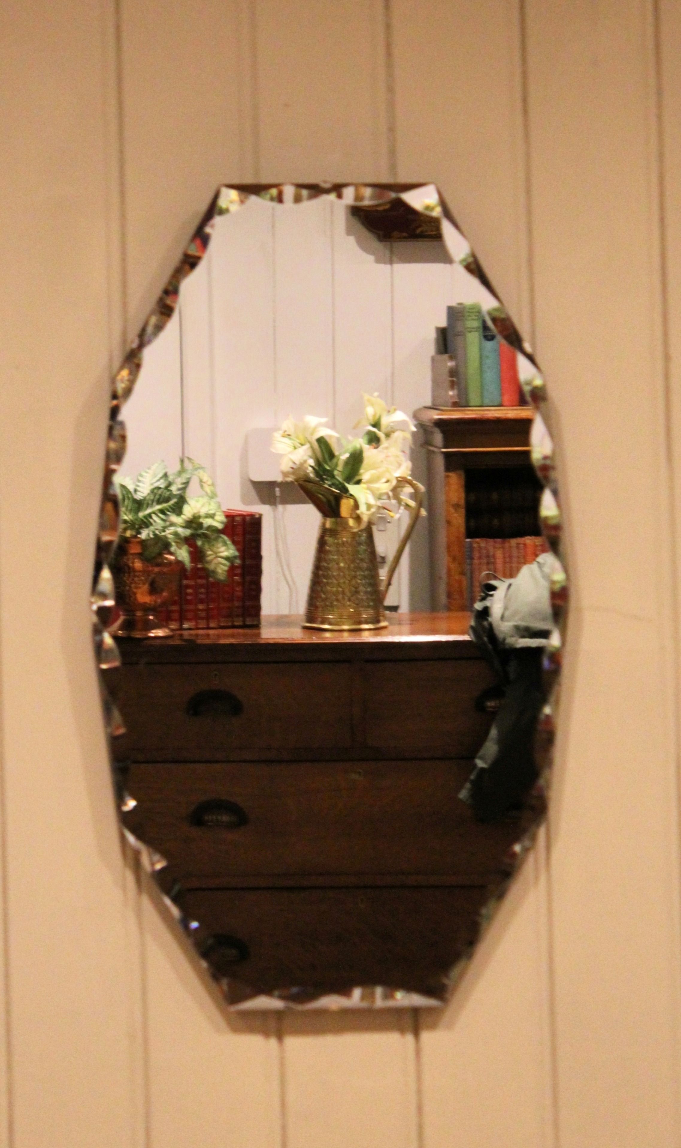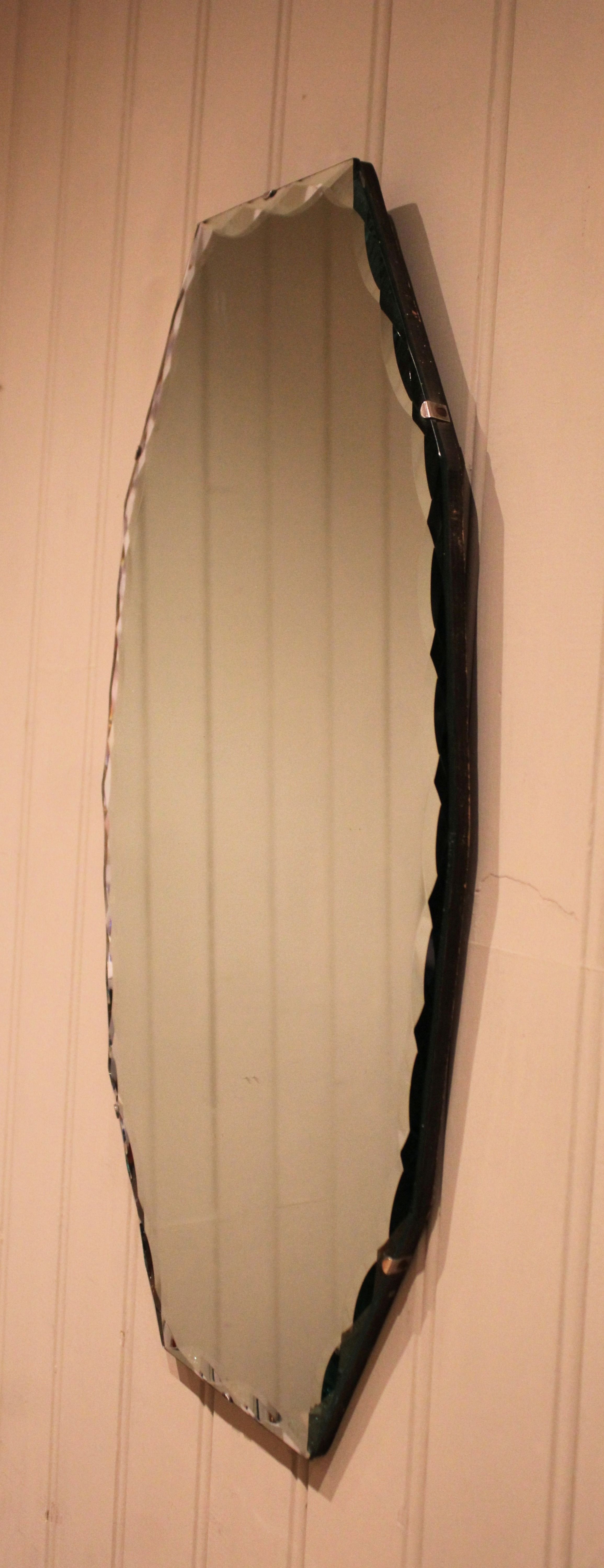 Early 20th century frameless glass mirror , etched and bevelled at the edges .