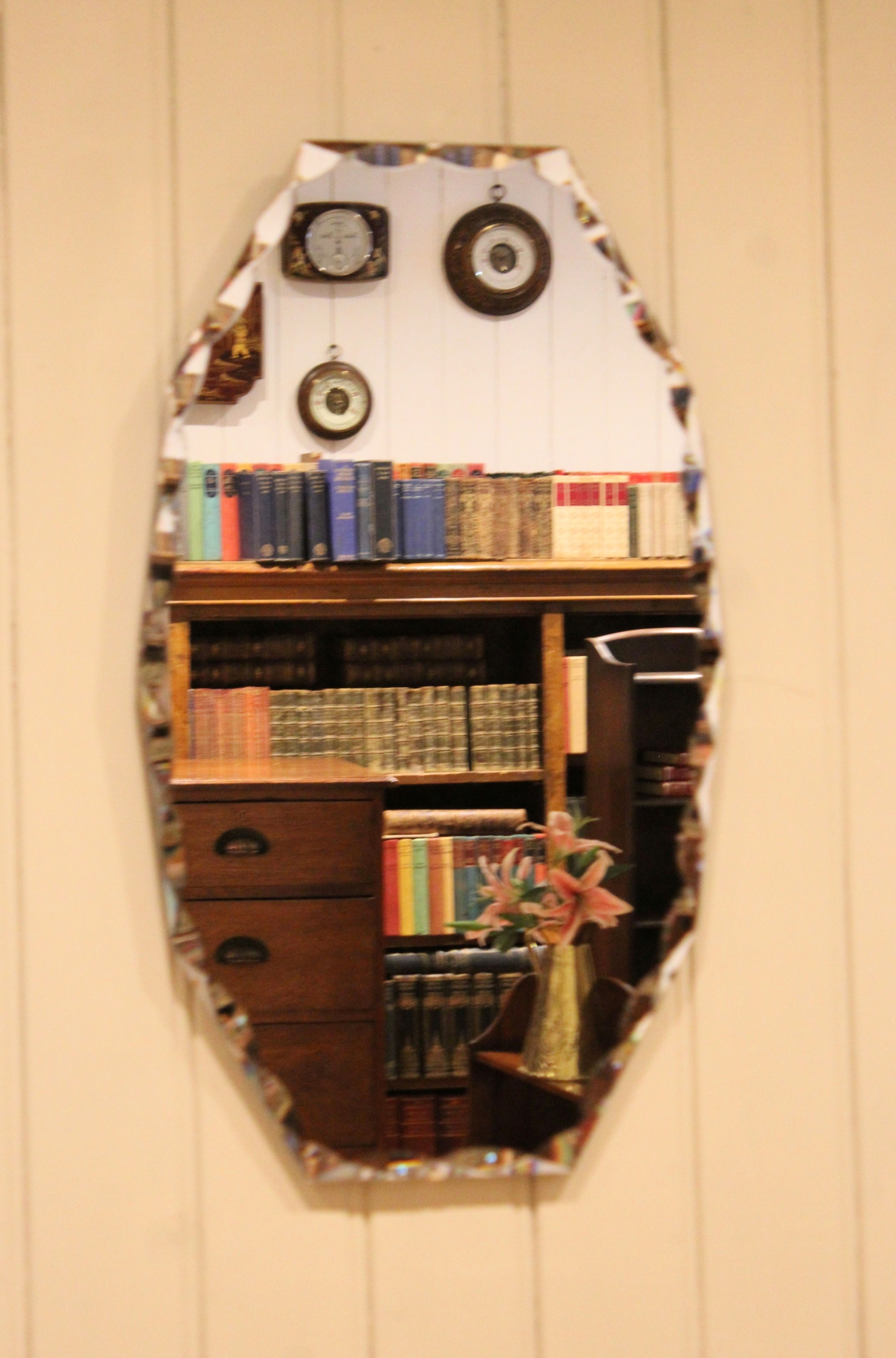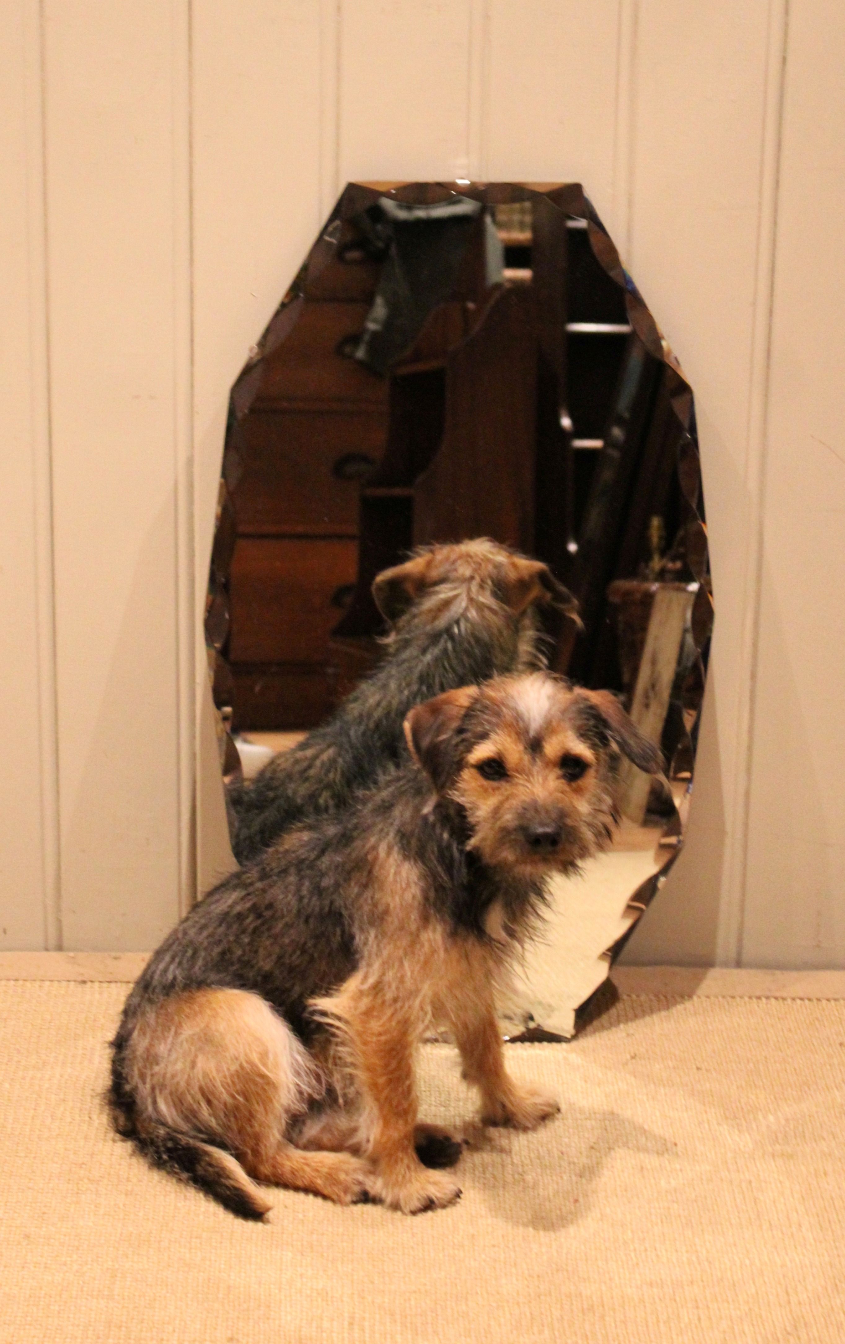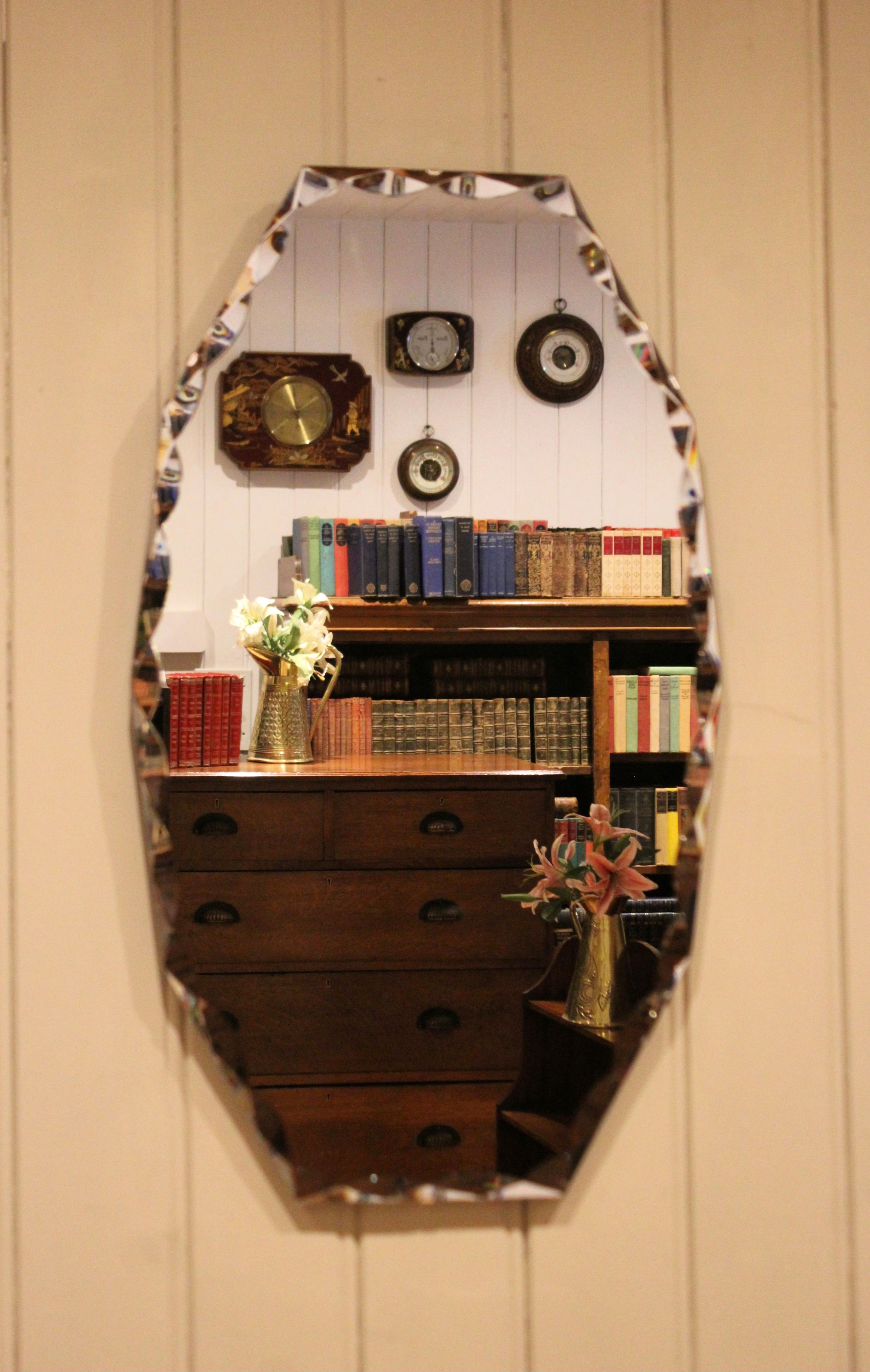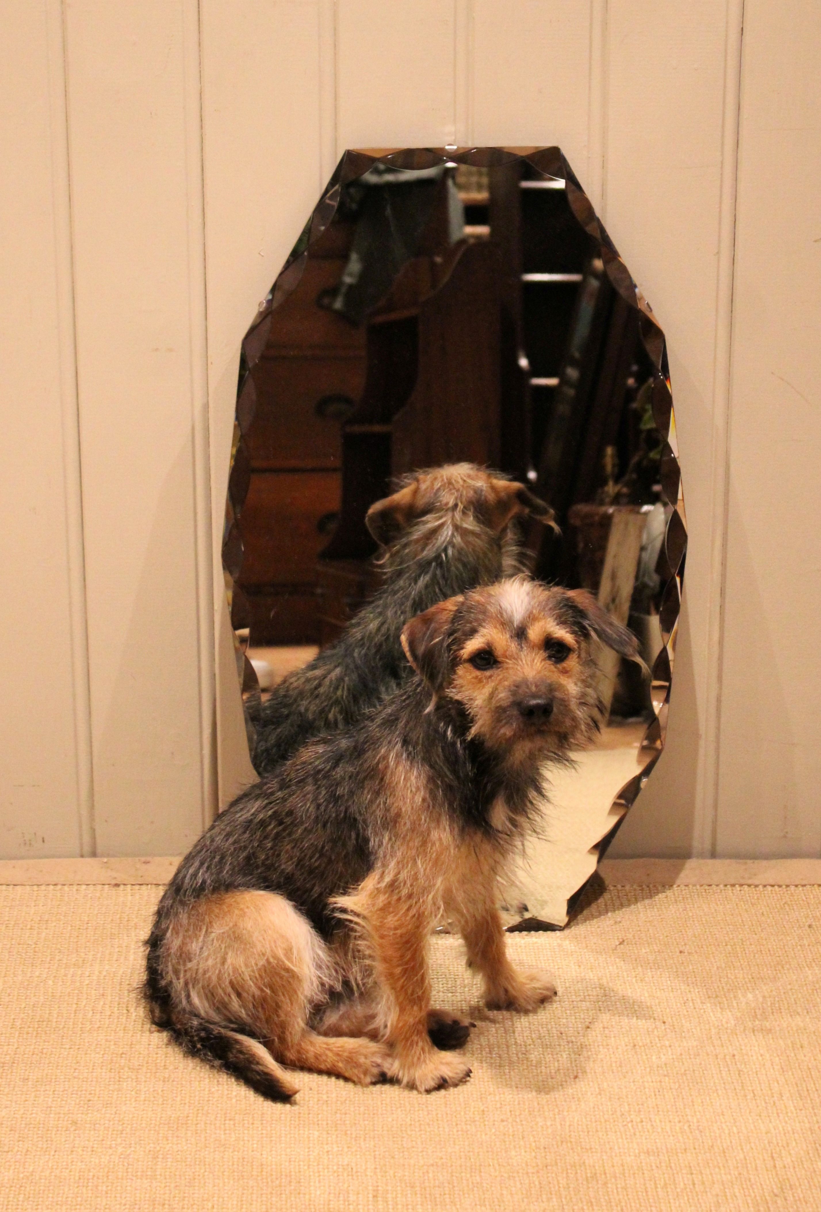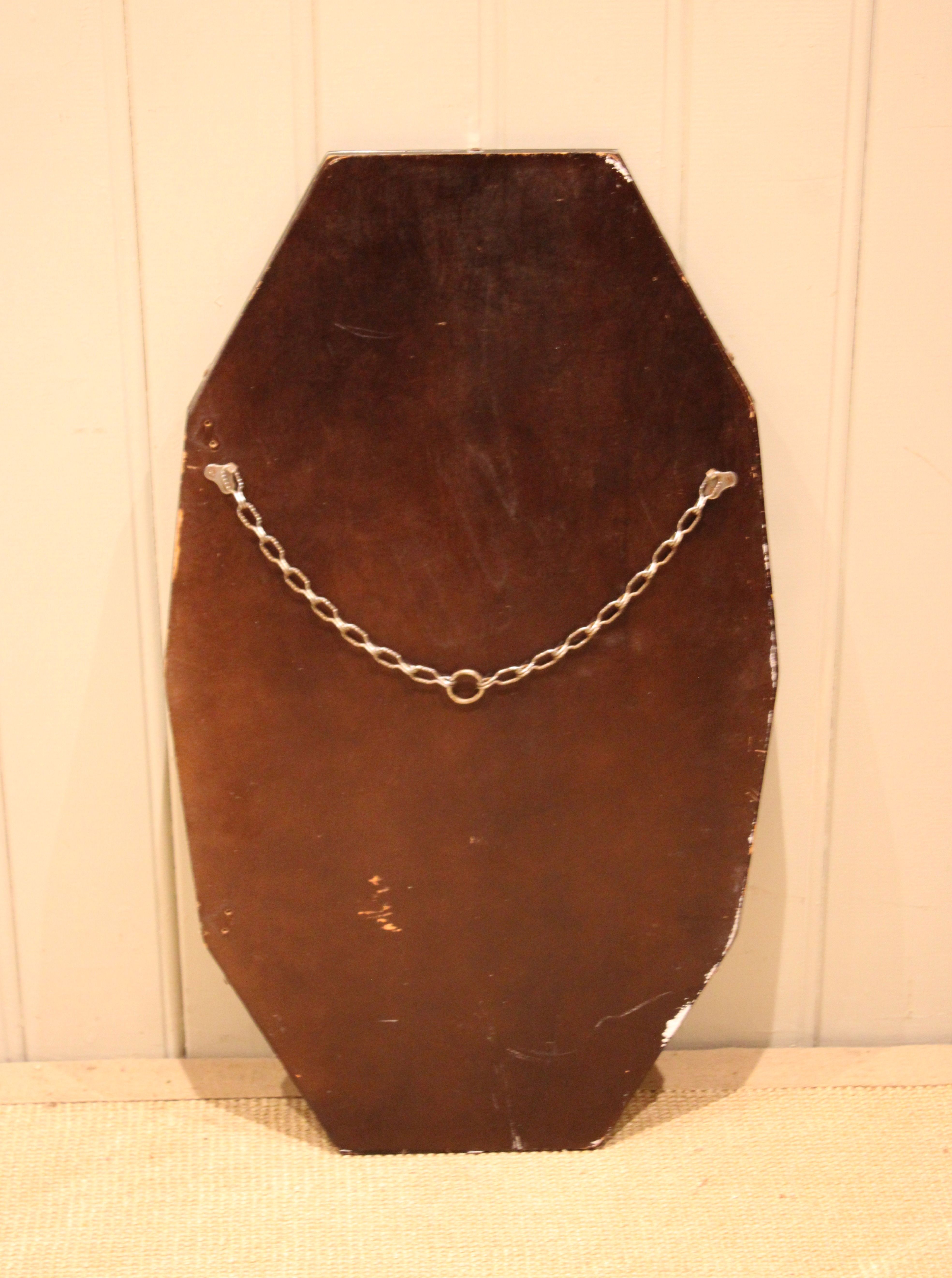 Early 20th century frameless glass mirror , etched and bevelled at the edges .