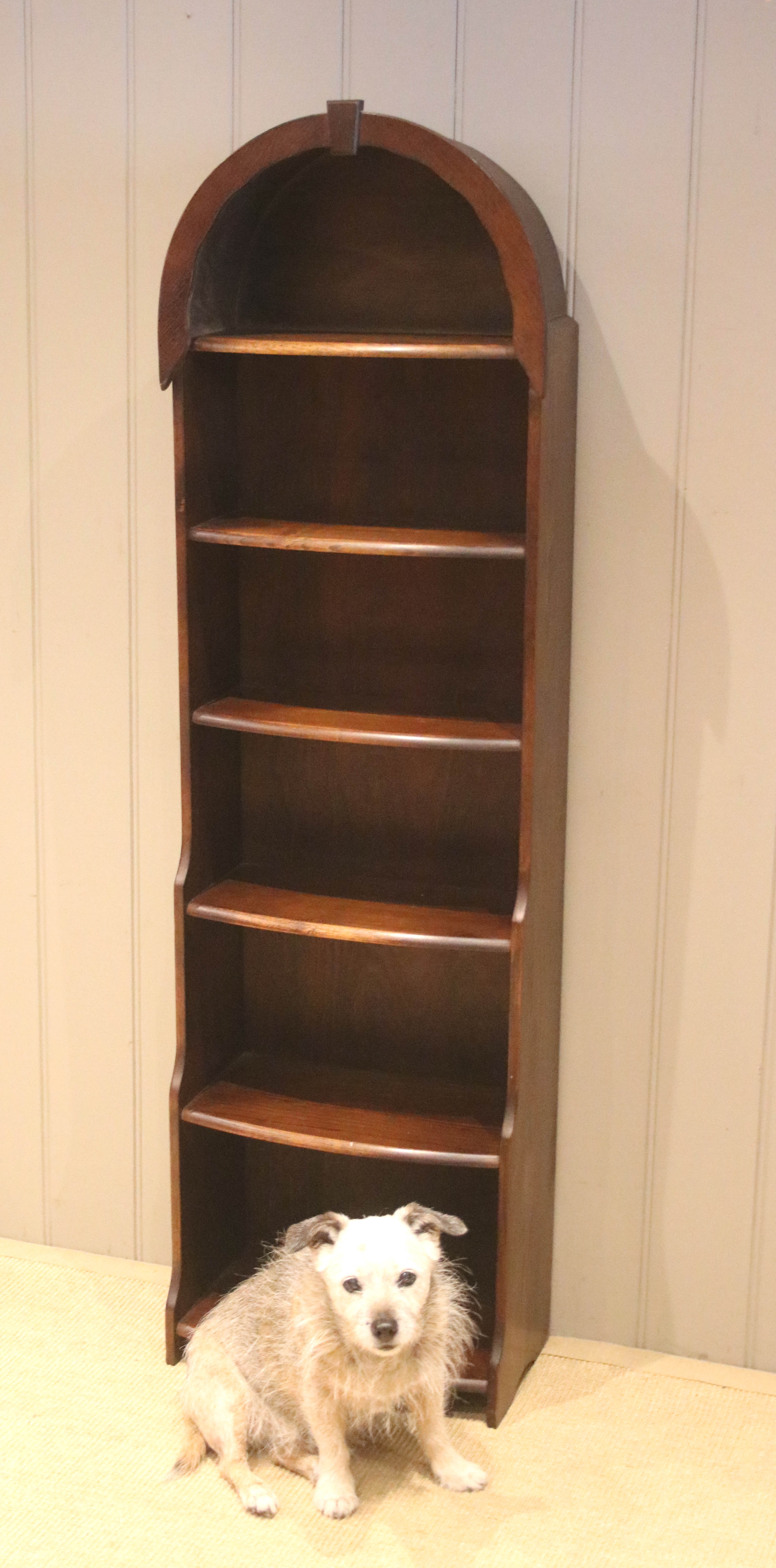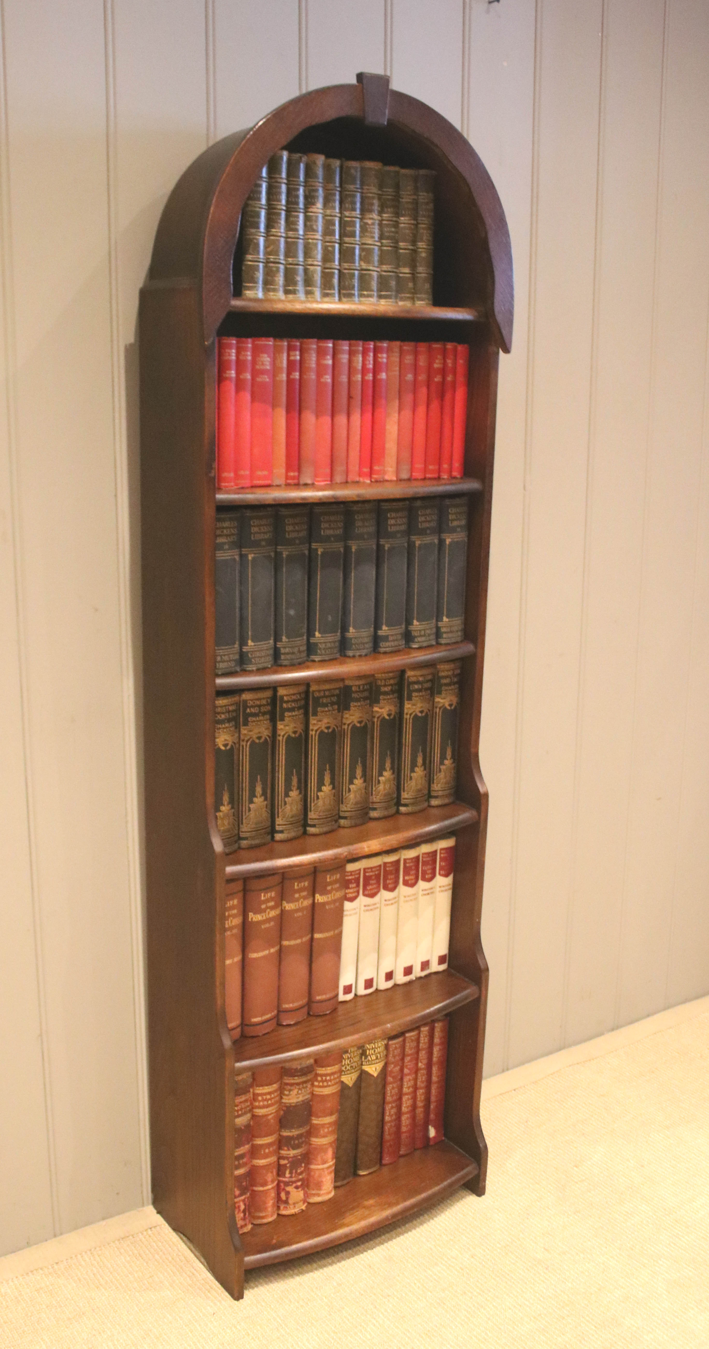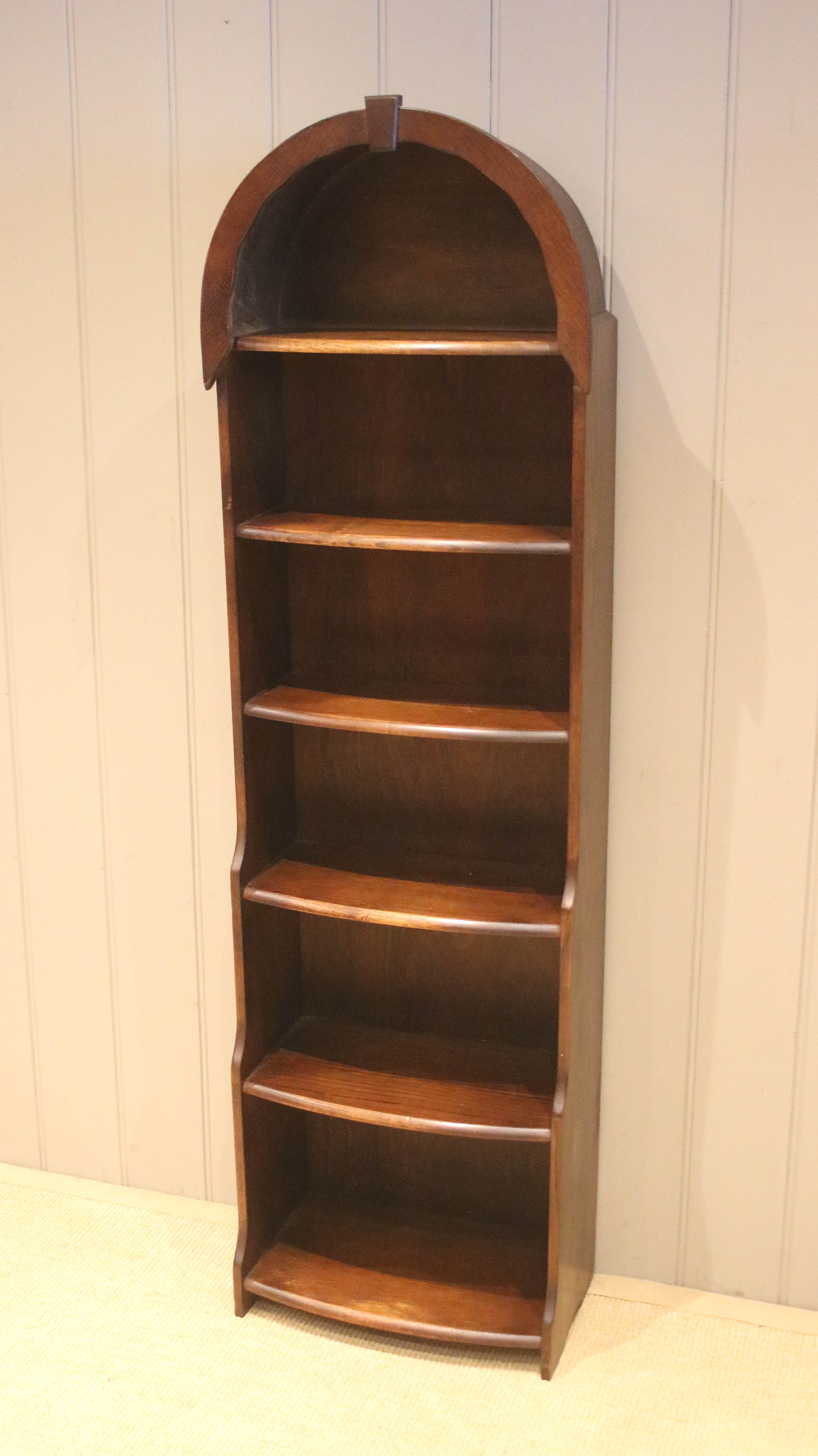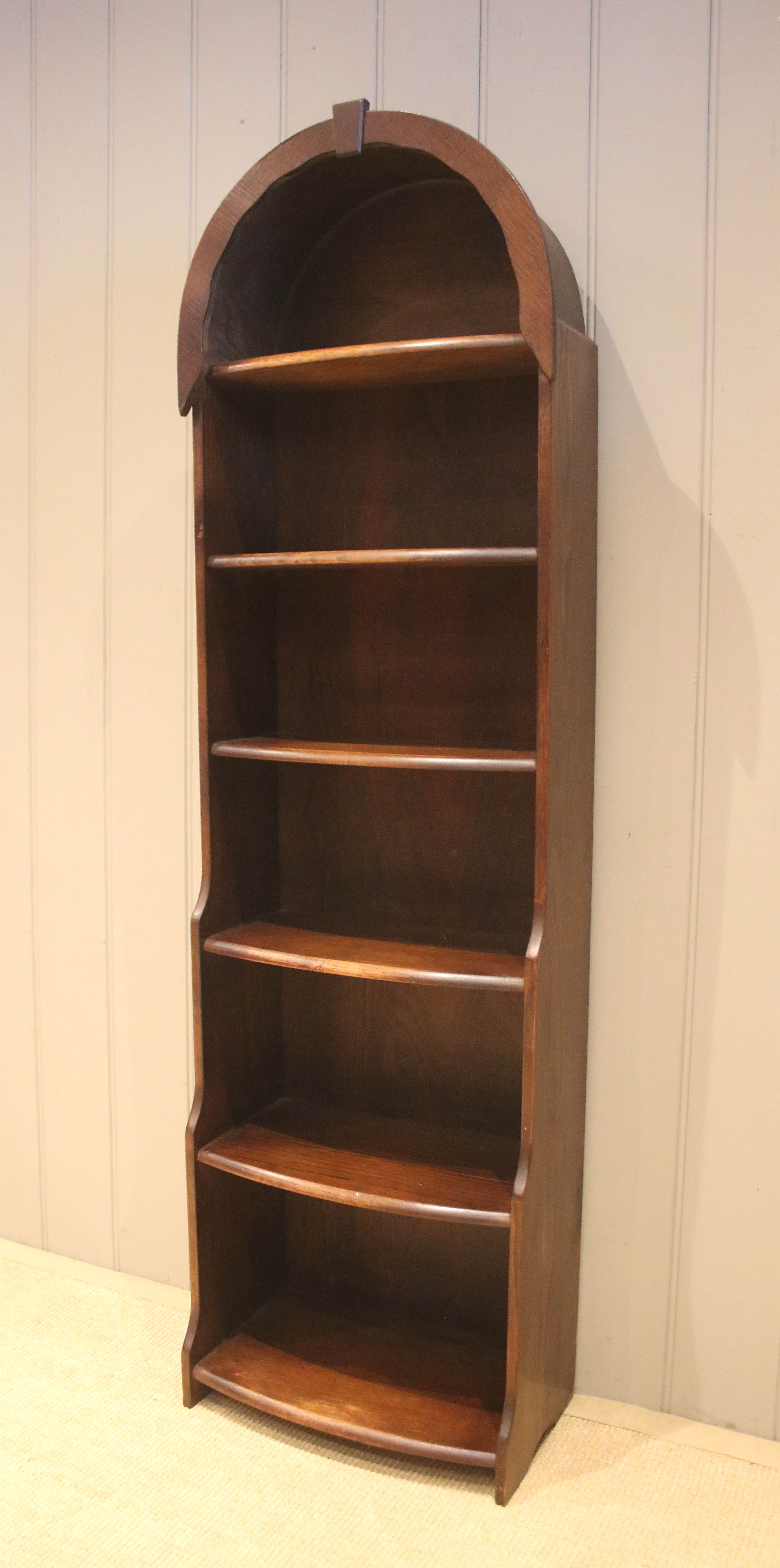 Dutch style arch top oak waterfall bookcase having a waterfall front with six fixed shelves , each shelf is 40 cm wide and from the bottom upwards , 24.5 cm deep by 26 cm , 22cm deep by 23.5 cm high , 19.5 cm deep by 21 cm high , 17 cm deep by 20 cm high , 17 cm deep by 19 cm high and at the top 16 cm deep by 14 cm high.