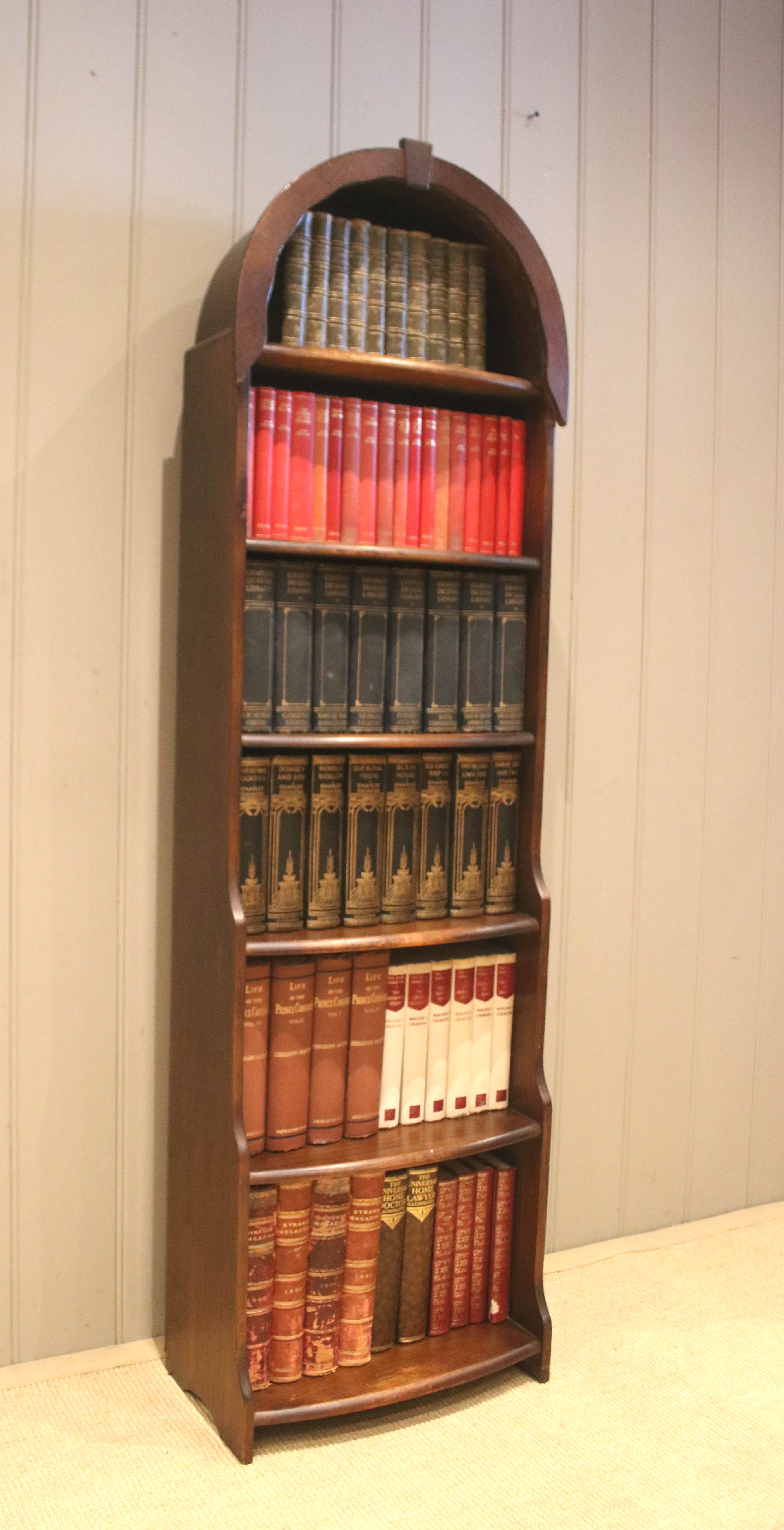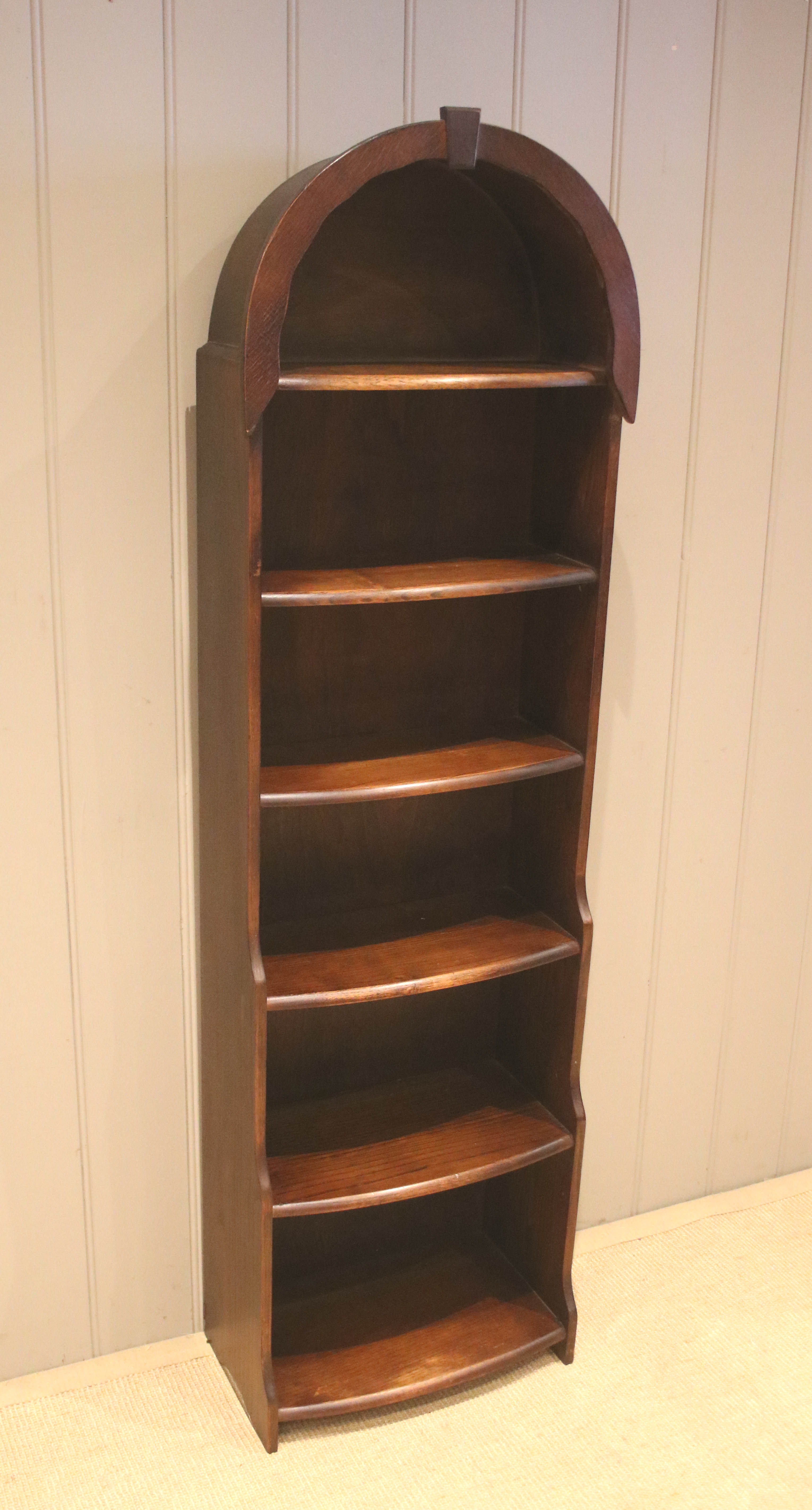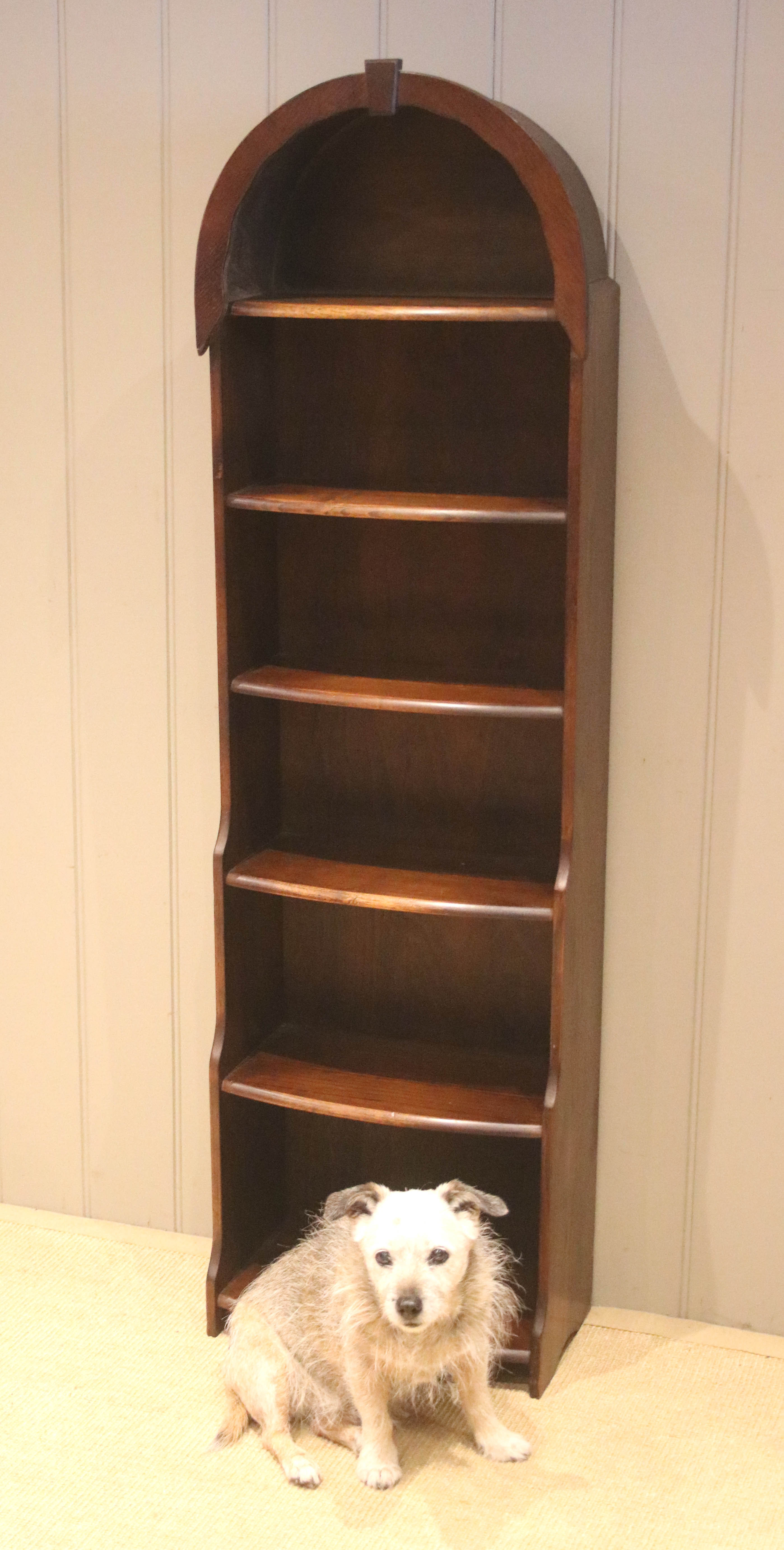 Dutch style arch top oak waterfall bookcase having a waterfall front with six fixed shelves , each shelf is 40 cm wide and from the bottom upwards , 24.5 cm deep by 26 cm , 22cm deep by 23.5 cm high , 19.5 cm deep by 21 cm high , 17 cm deep by 20 cm high , 17 cm deep by 19 cm high and at the top 16 cm deep by 14 cm high.