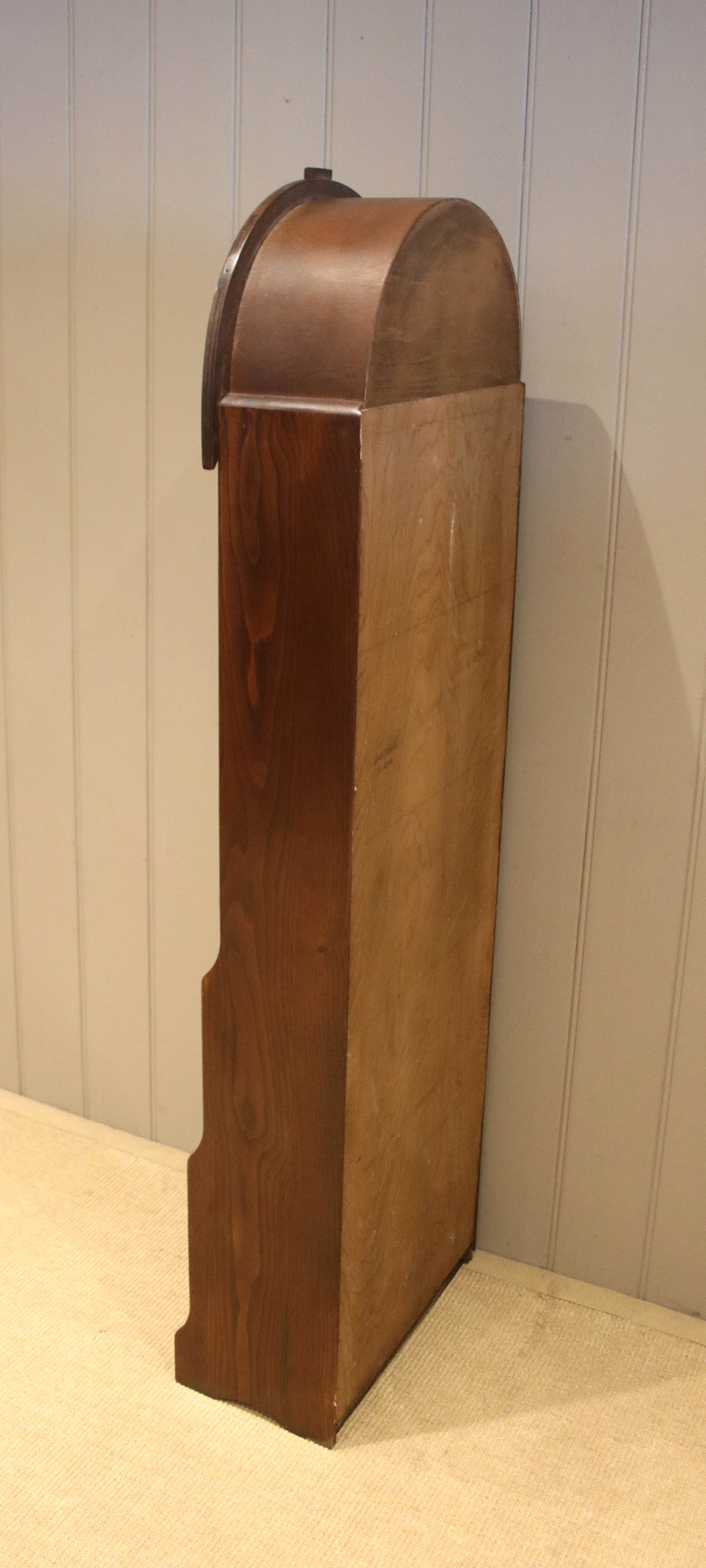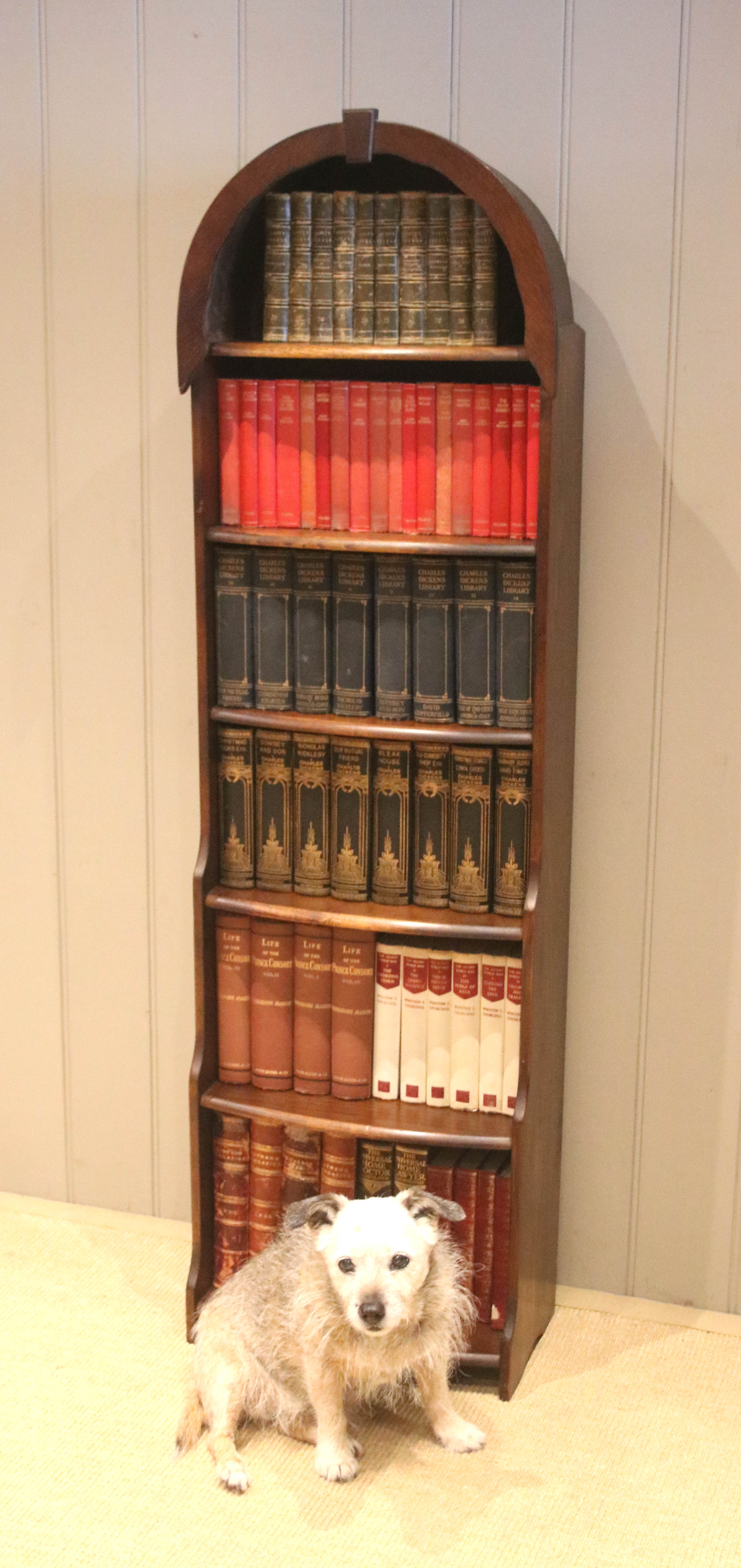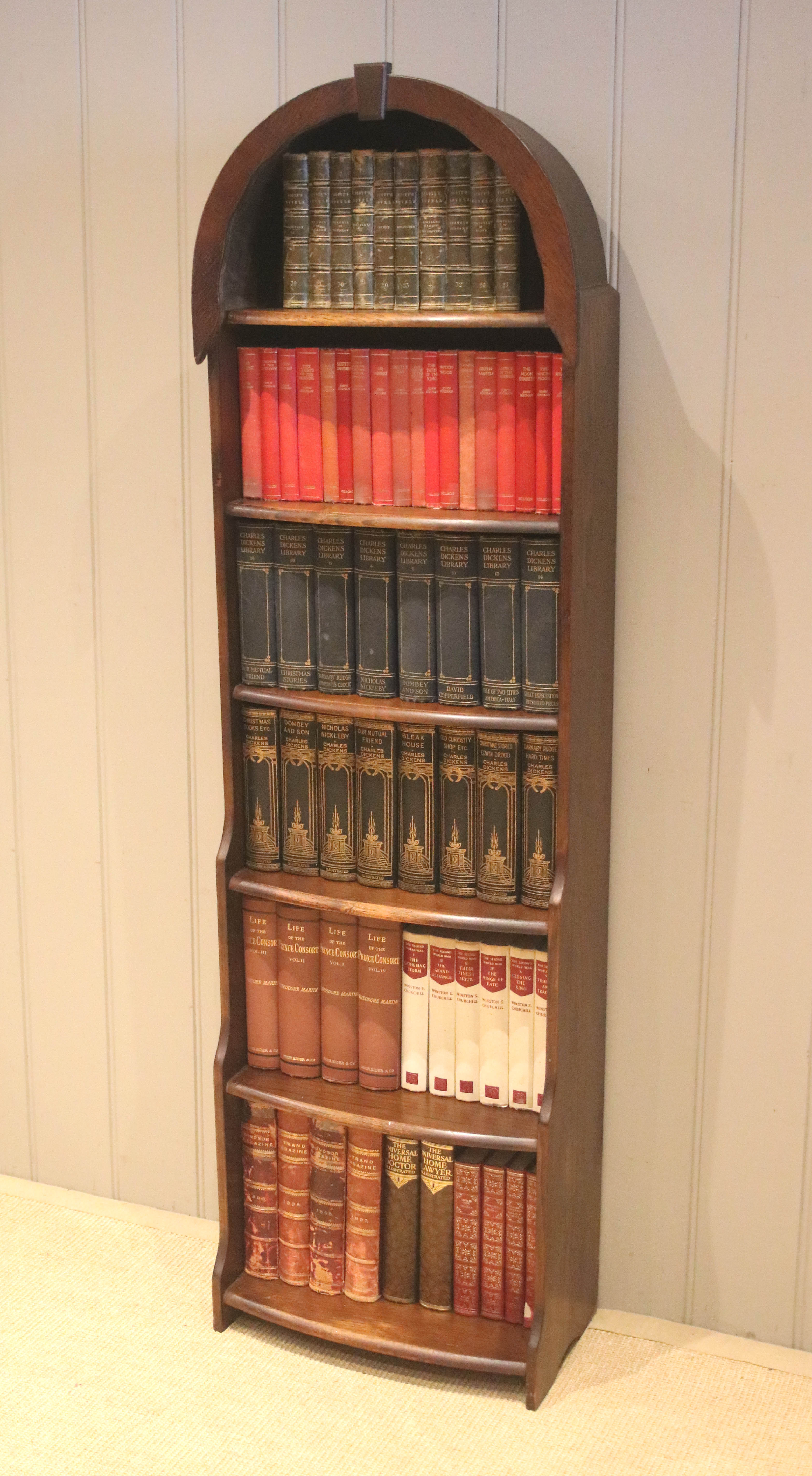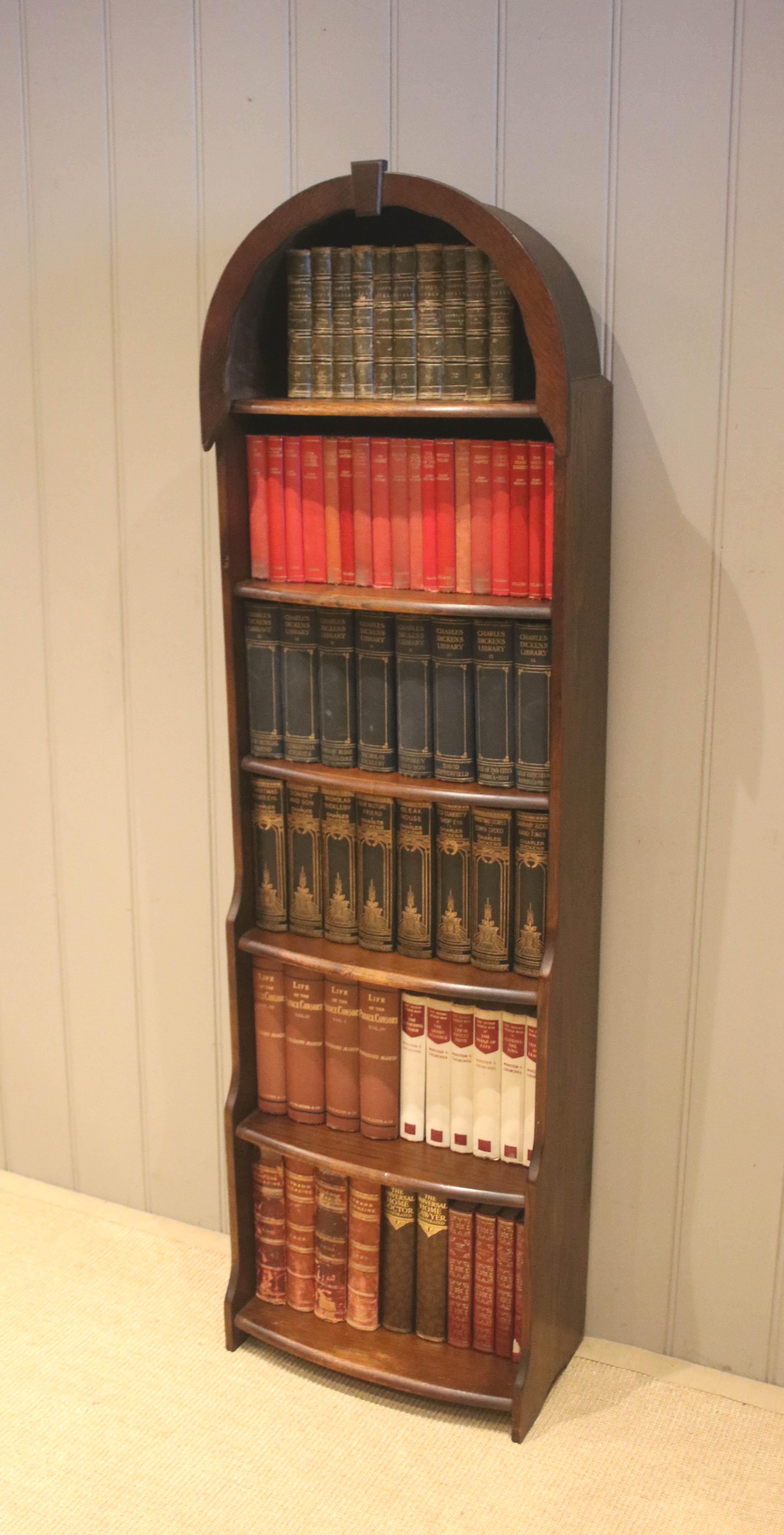 Dutch style arch top oak waterfall bookcase having a waterfall front with six fixed shelves , each shelf is 40 cm wide and from the bottom upwards , 24.5 cm deep by 26 cm , 22cm deep by 23.5 cm high , 19.5 cm deep by 21 cm high , 17 cm deep by 20 cm high , 17 cm deep by 19 cm high and at the top 16 cm deep by 14 cm high.