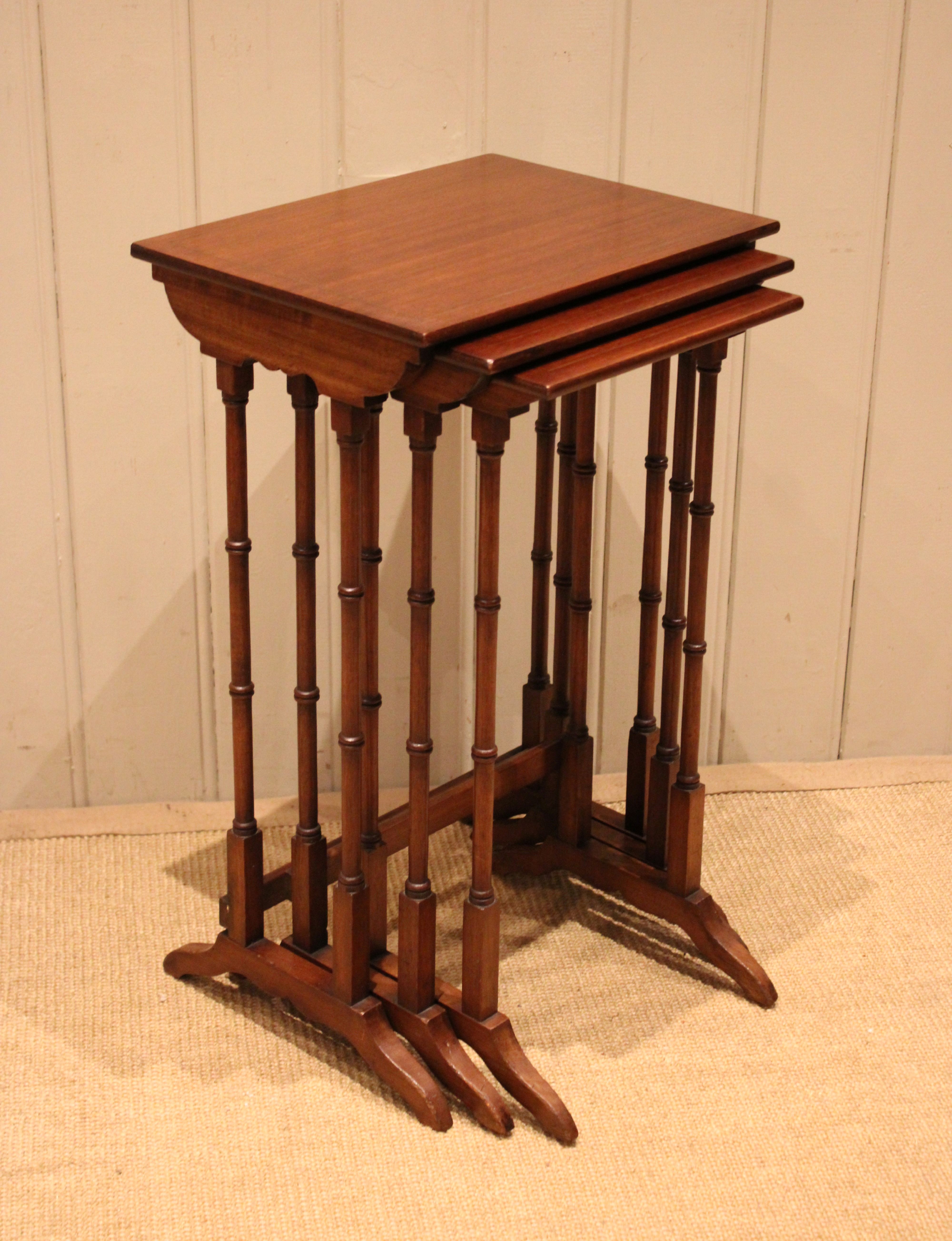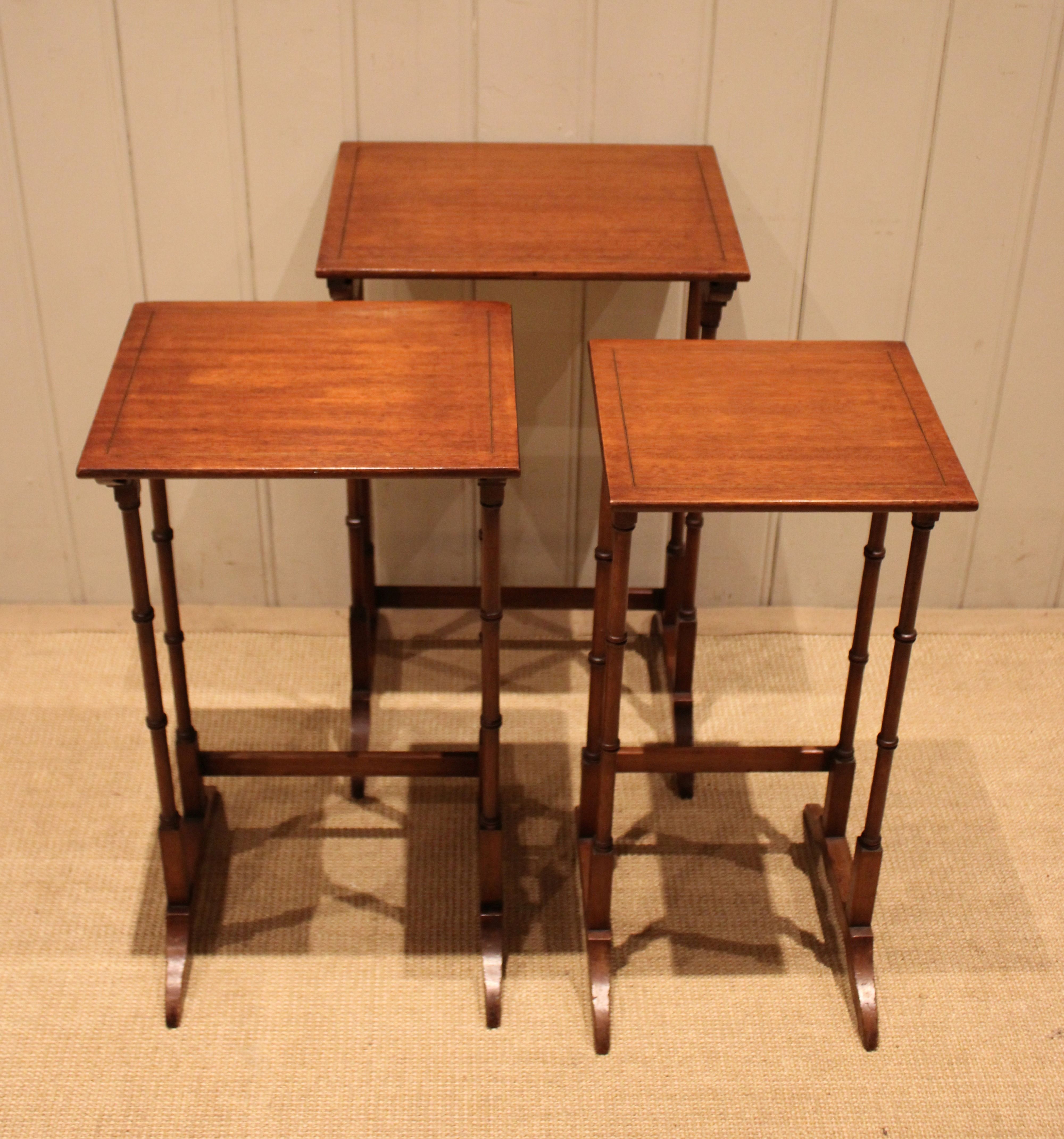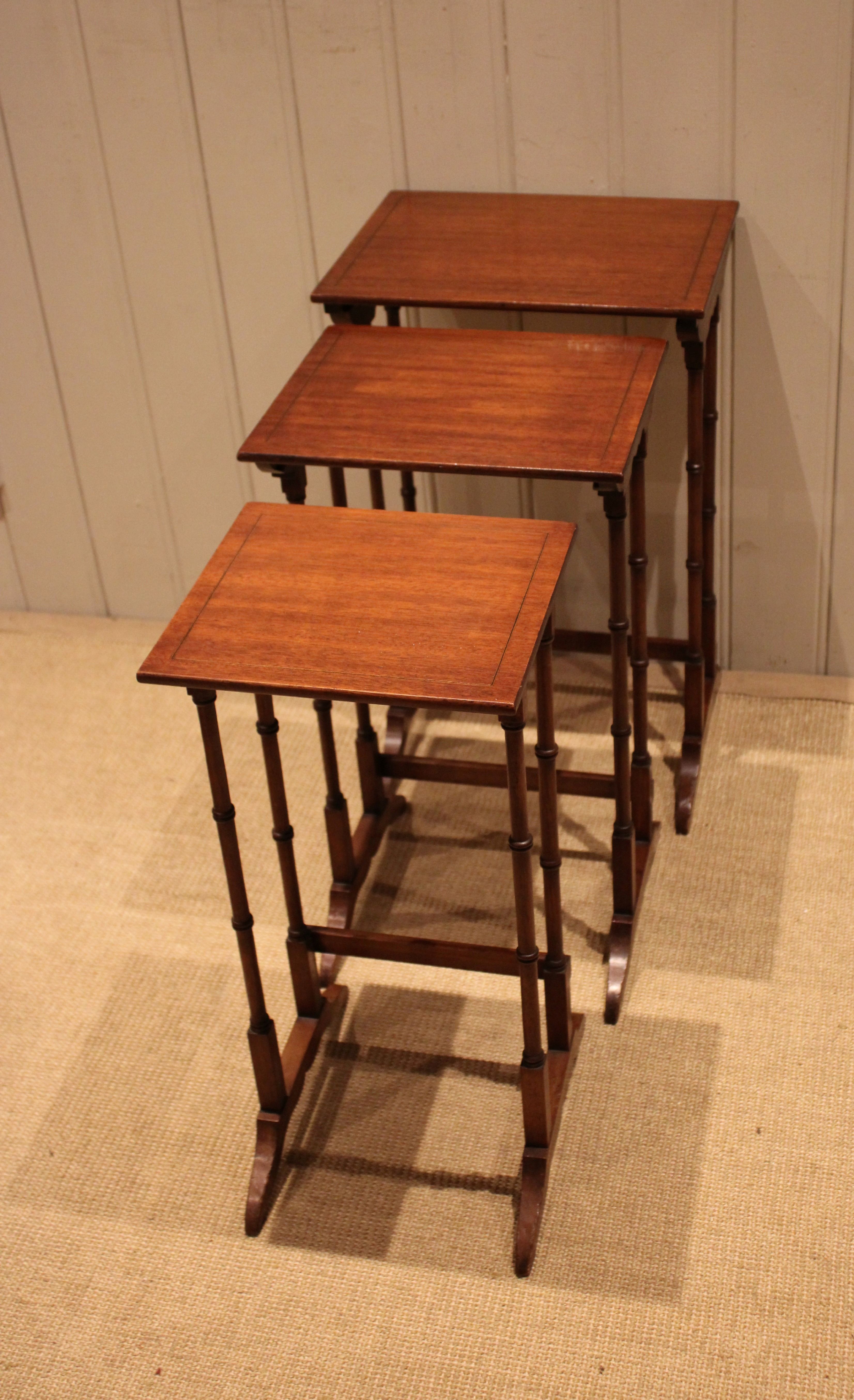 Edwardian mahogany nest of three tables having rectangular tops , raised on turned supports with shaped feet joined by a rear stretcher . The middle table measures 58 cm high , 31.5 cm wide and 26 cm deep and the small table 56 cm high , 26.5 cm wide and 24 cm deep .