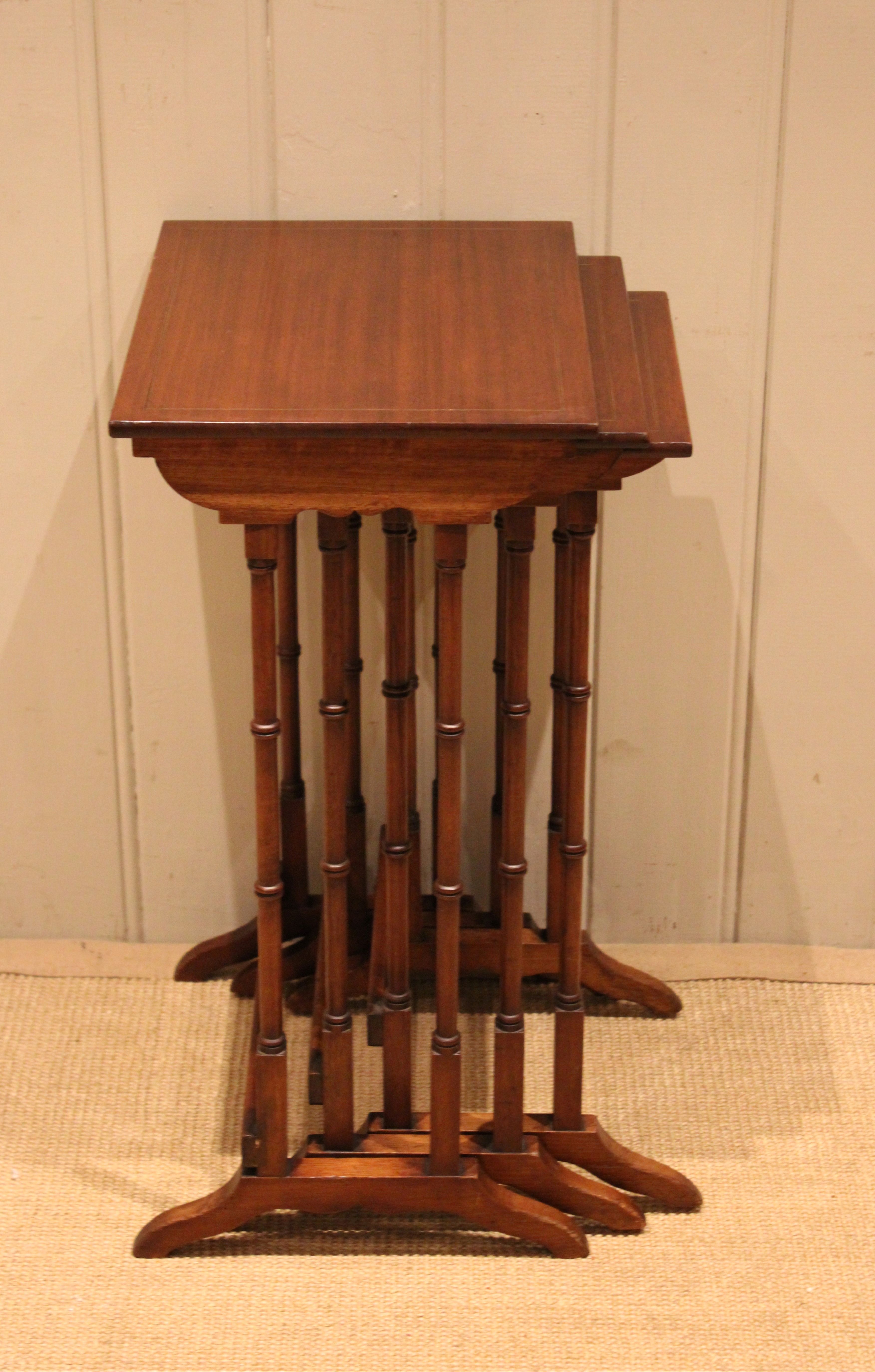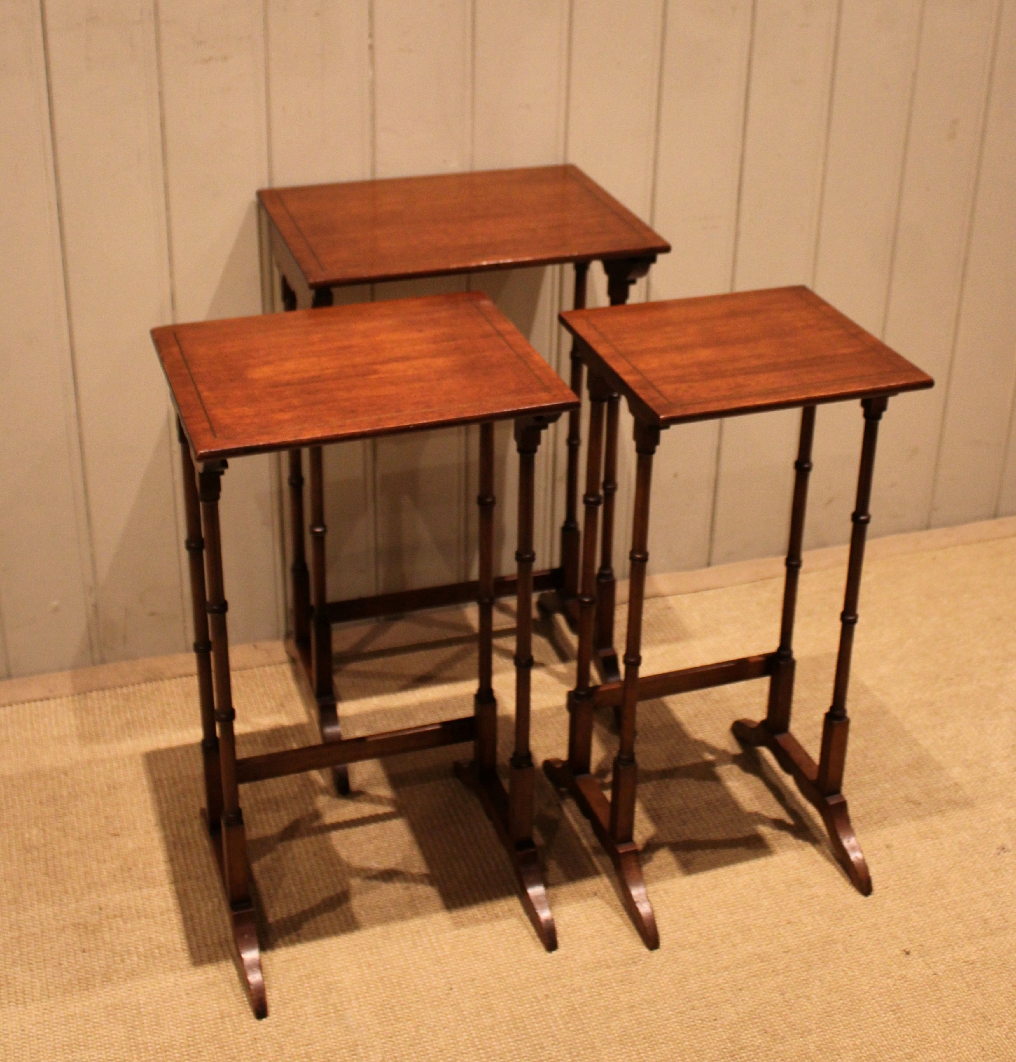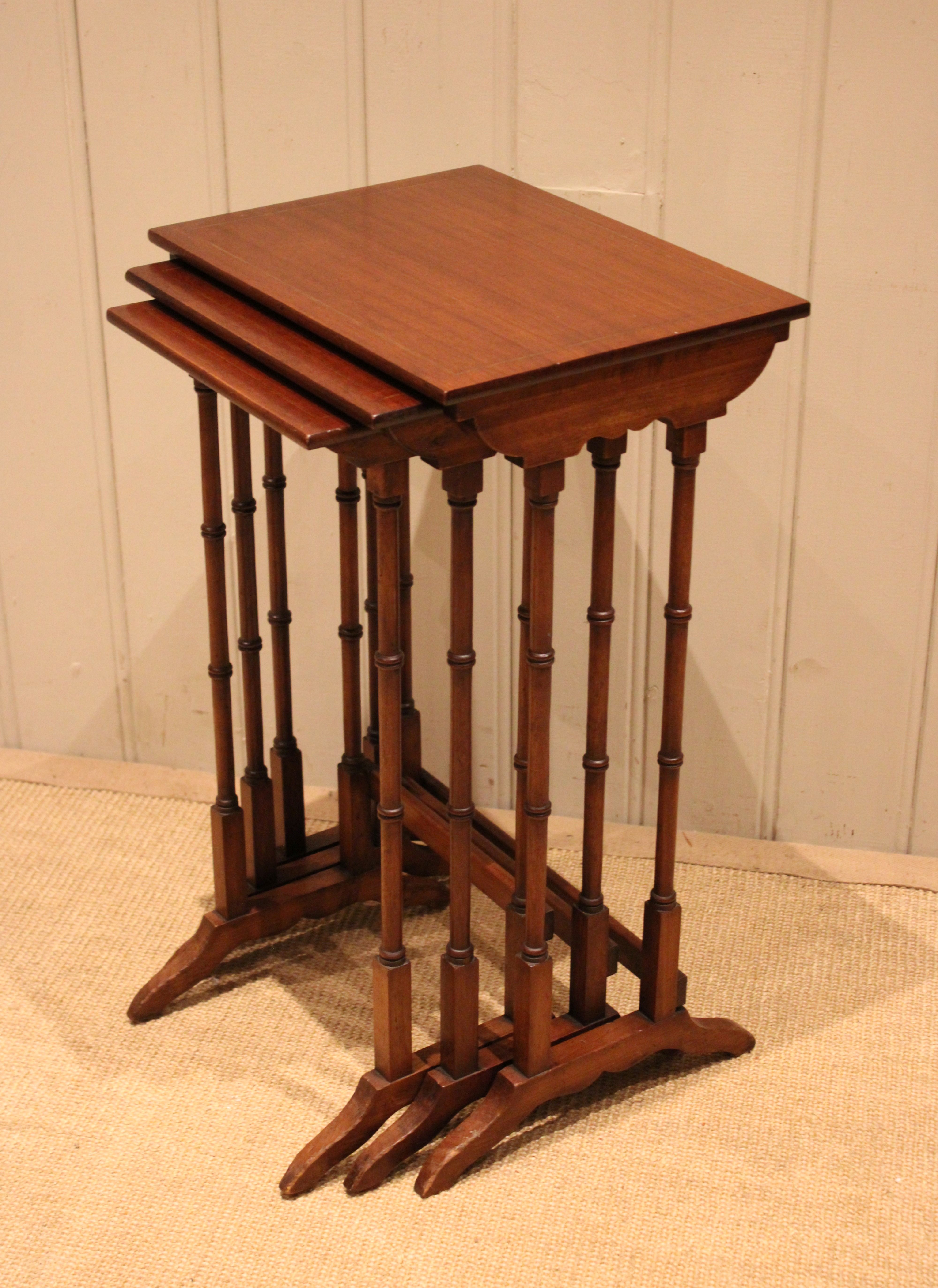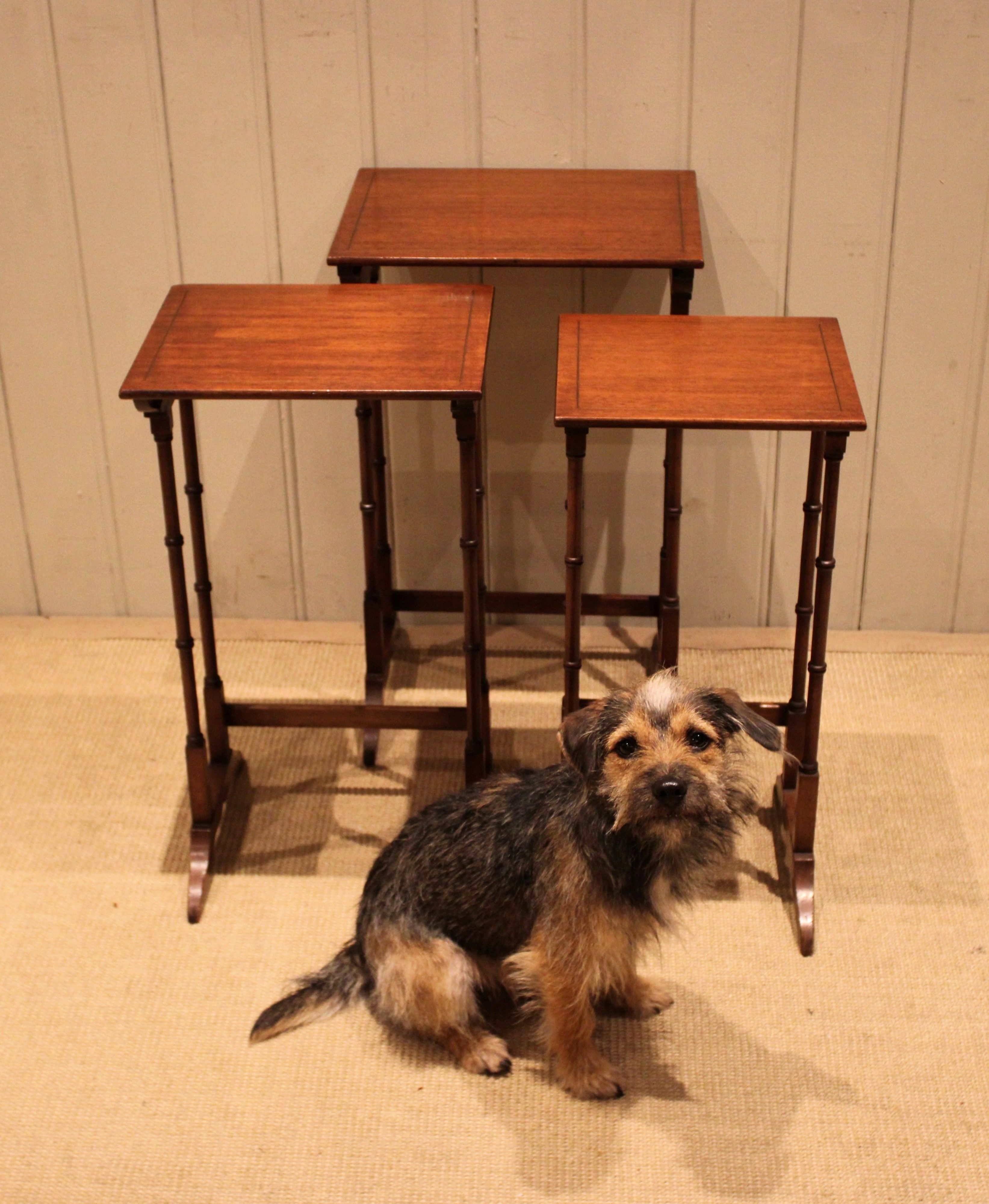 Edwardian mahogany nest of three tables having rectangular tops , raised on turned supports with shaped feet joined by a rear stretcher . The middle table measures 58 cm high , 31.5 cm wide and 26 cm deep and the small table 56 cm high , 26.5 cm wide and 24 cm deep .