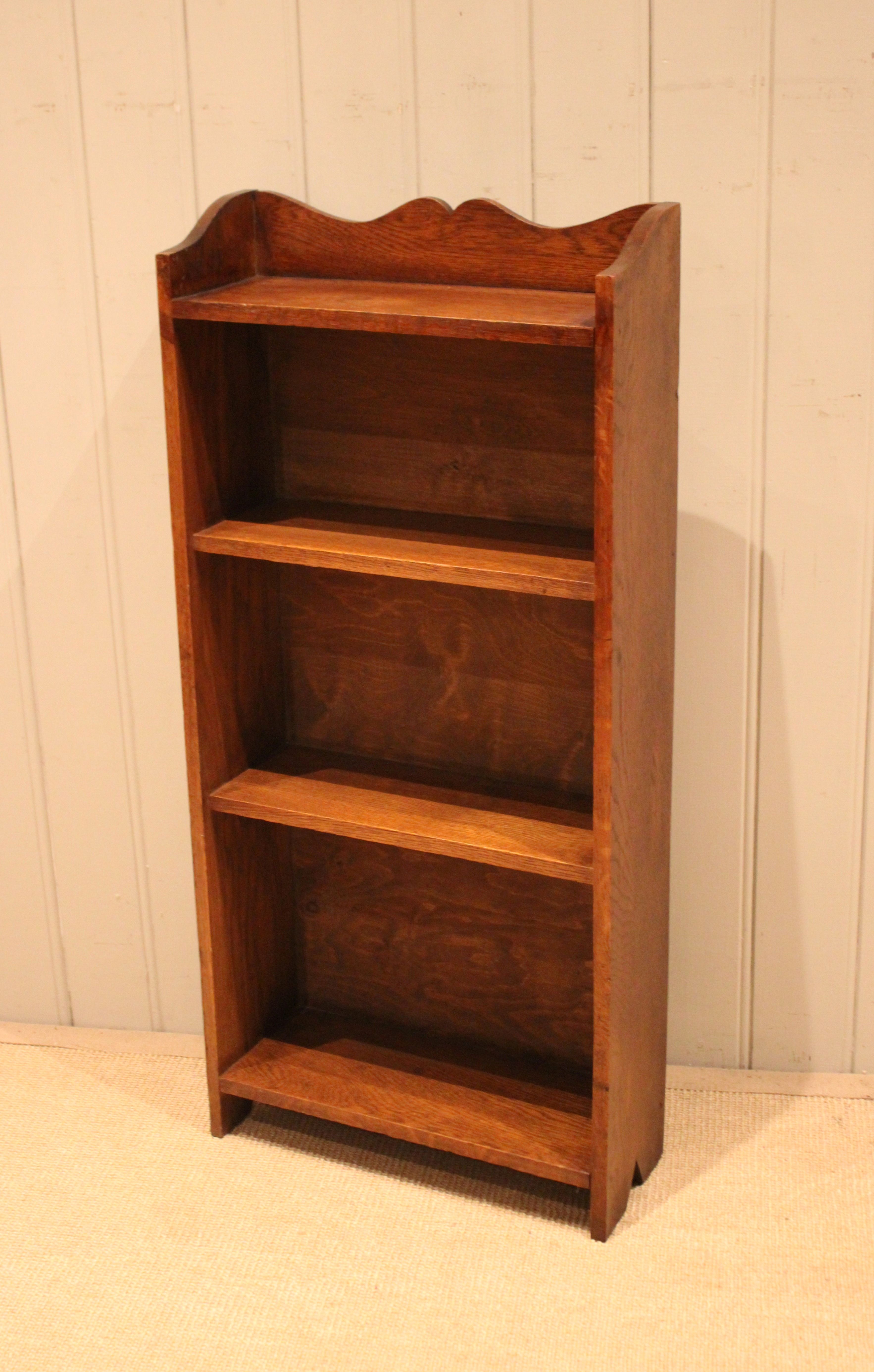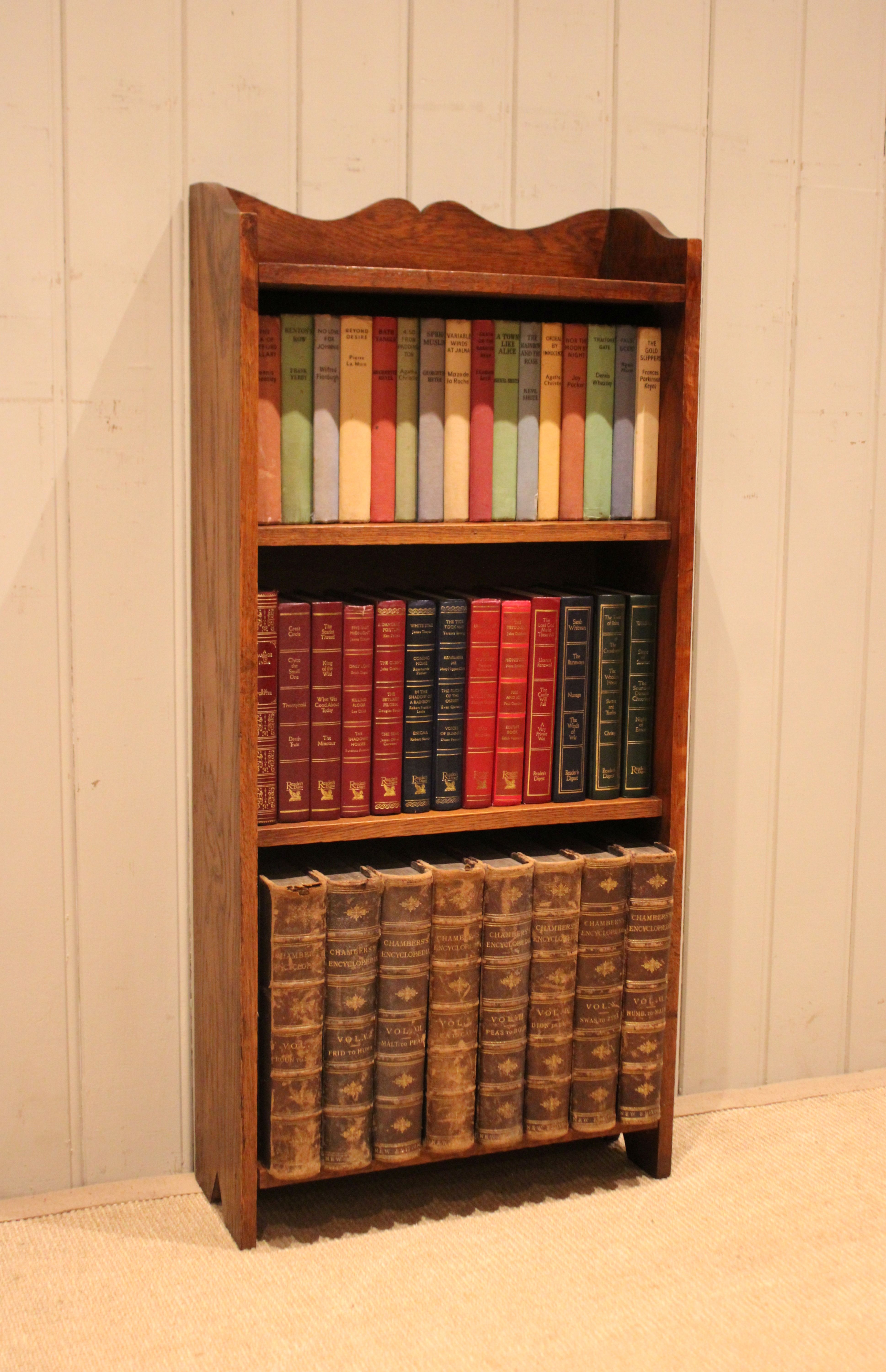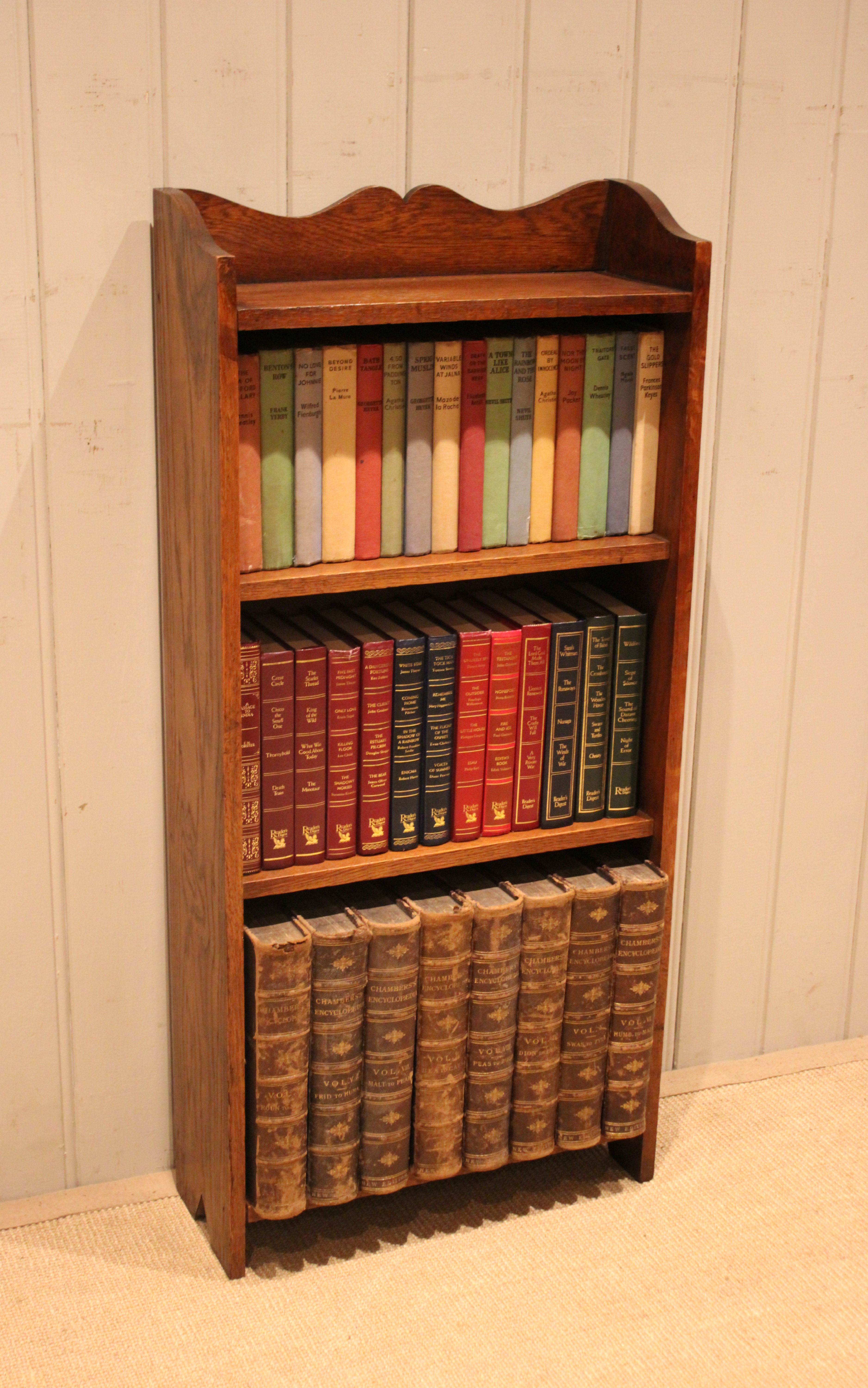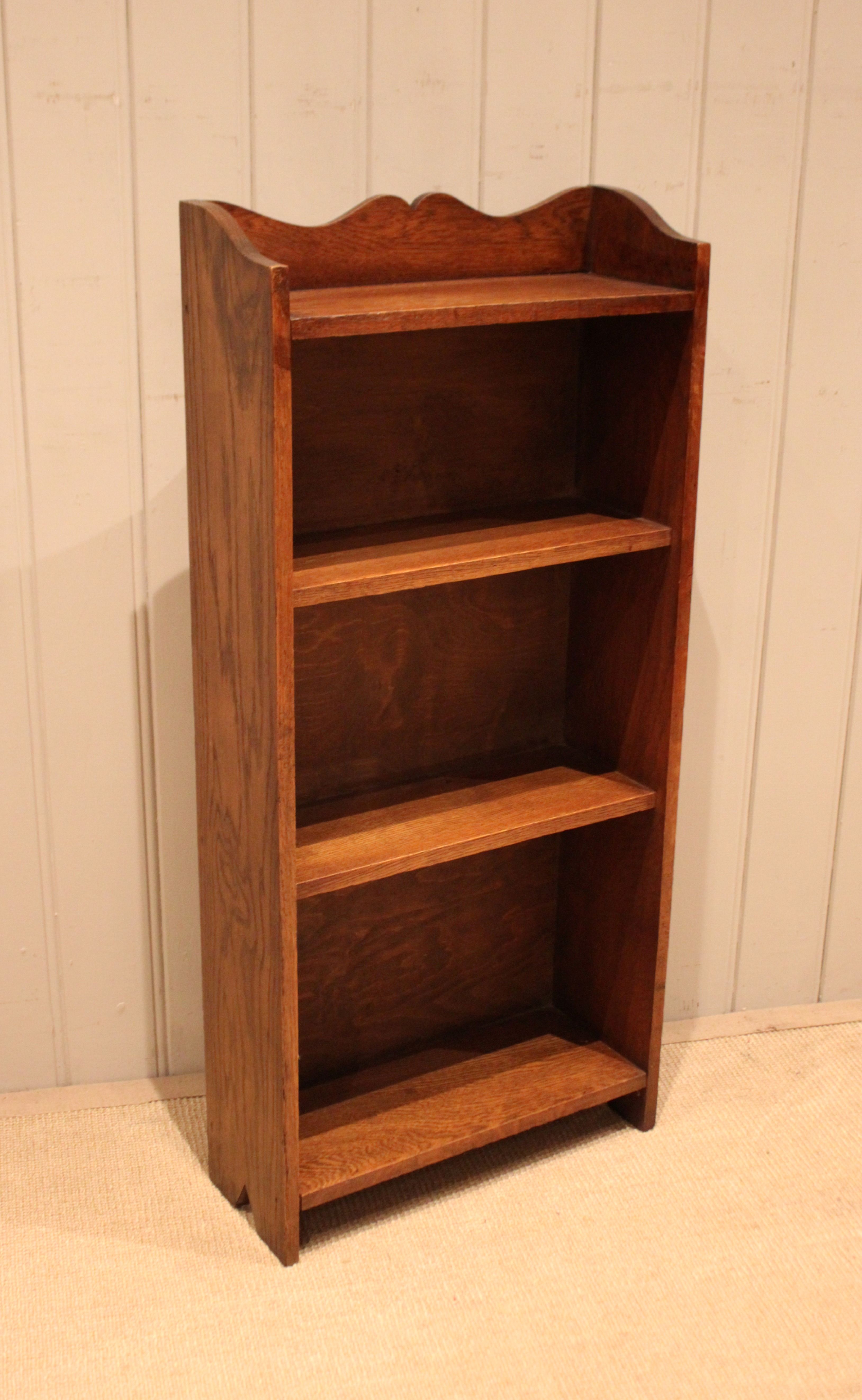 Small proportioned solid oak open bookcase having three fixed shelves with a shaped top raised on side brackets . The shelf measurements are 42 cm wide , 15.5 cm deep and from the bottom up 30 cm high , 25.5 cm high and at the top 21 cm high .
