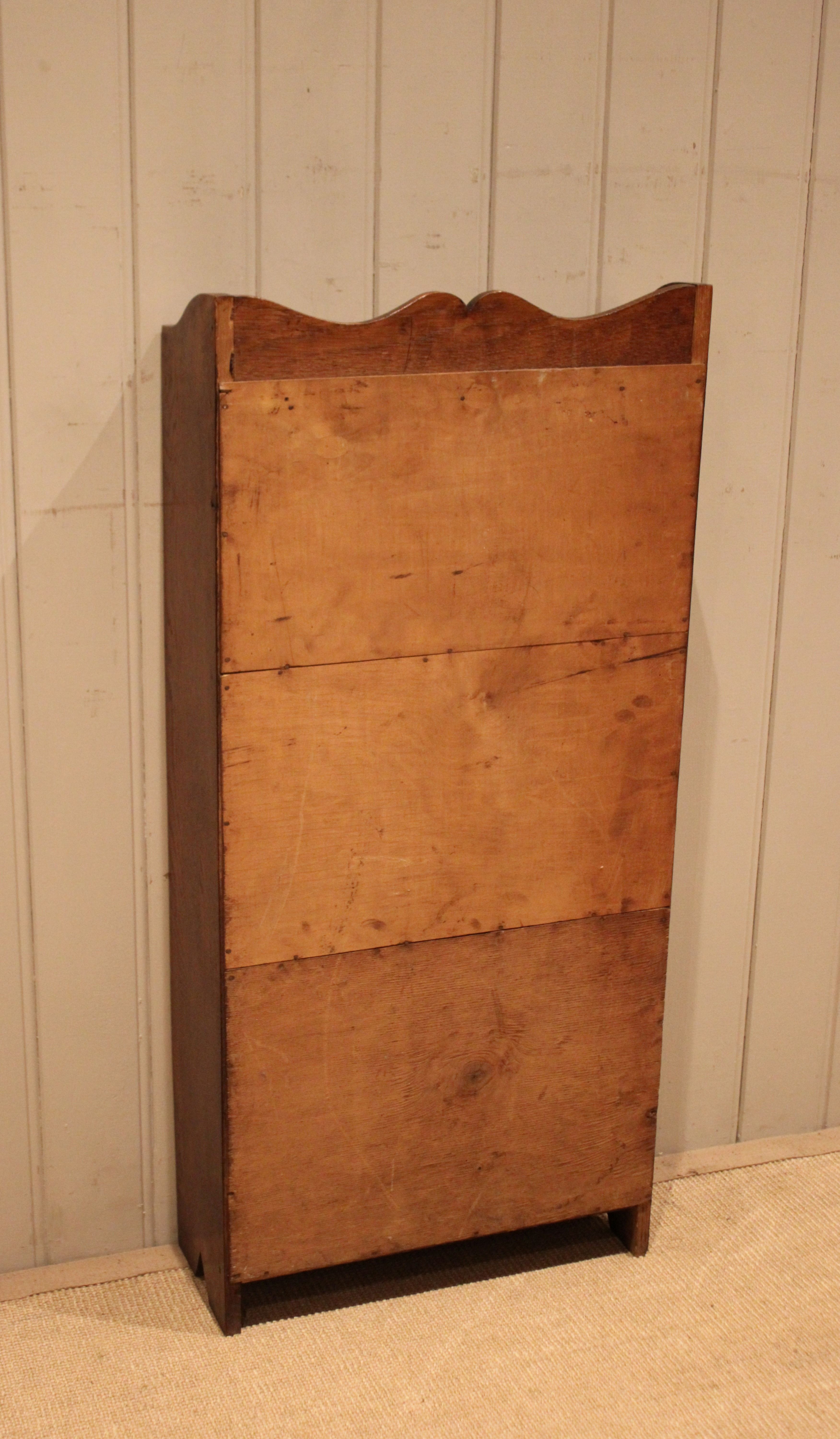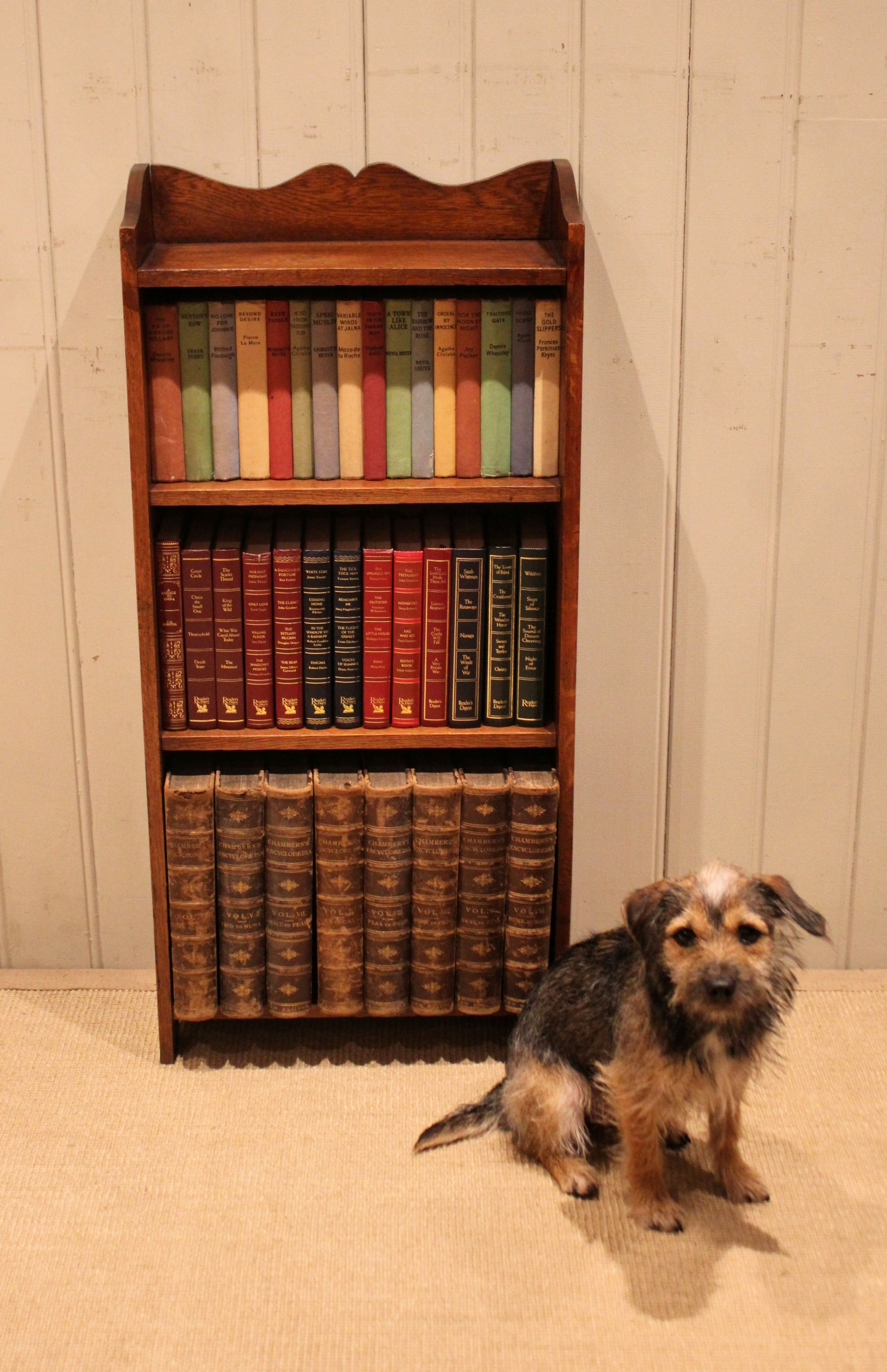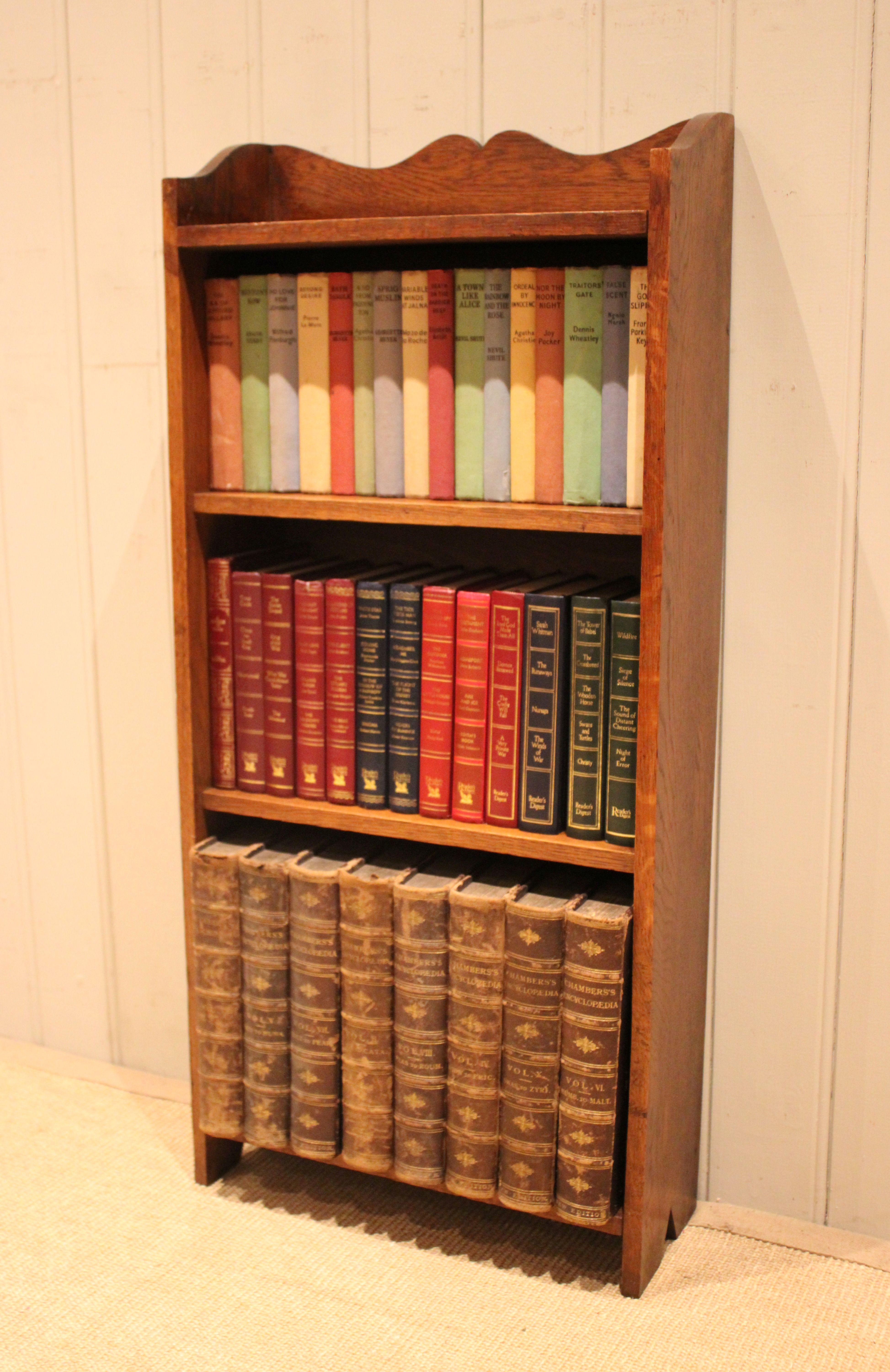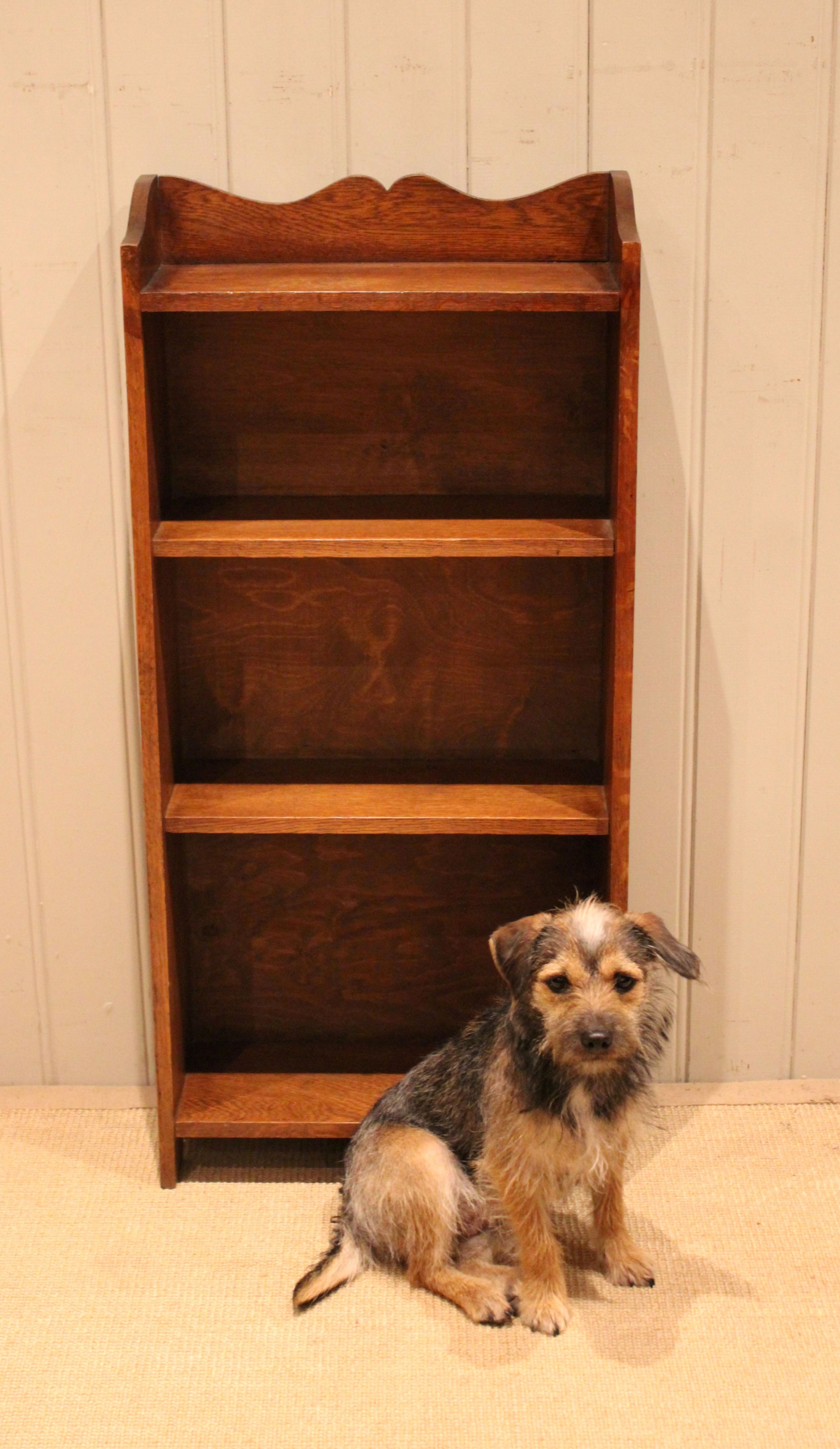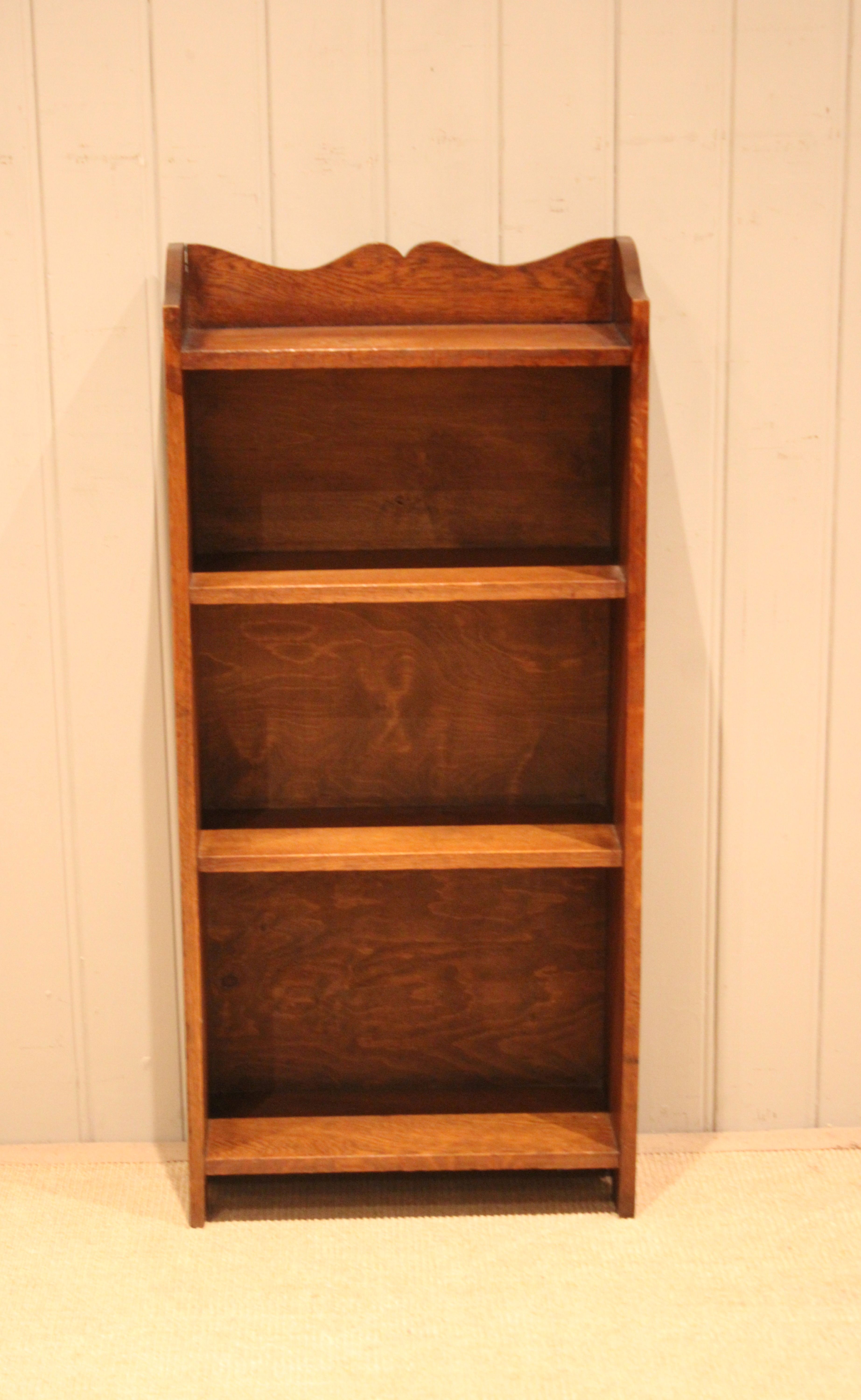 Small proportioned solid oak open bookcase having three fixed shelves with a shaped top raised on side brackets . The shelf measurements are 42 cm wide , 15.5 cm deep and from the bottom up 30 cm high , 25.5 cm high and at the top 21 cm high .