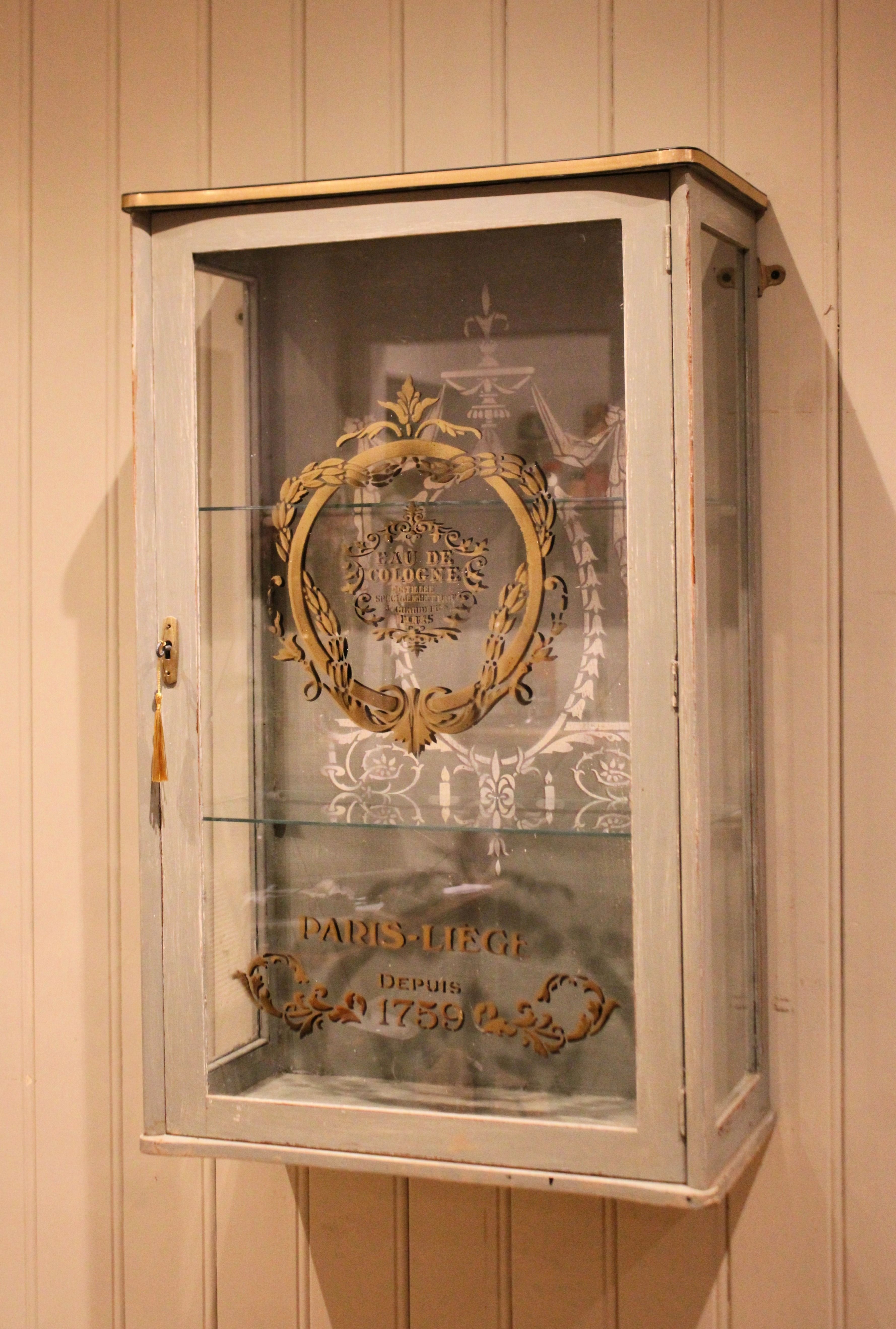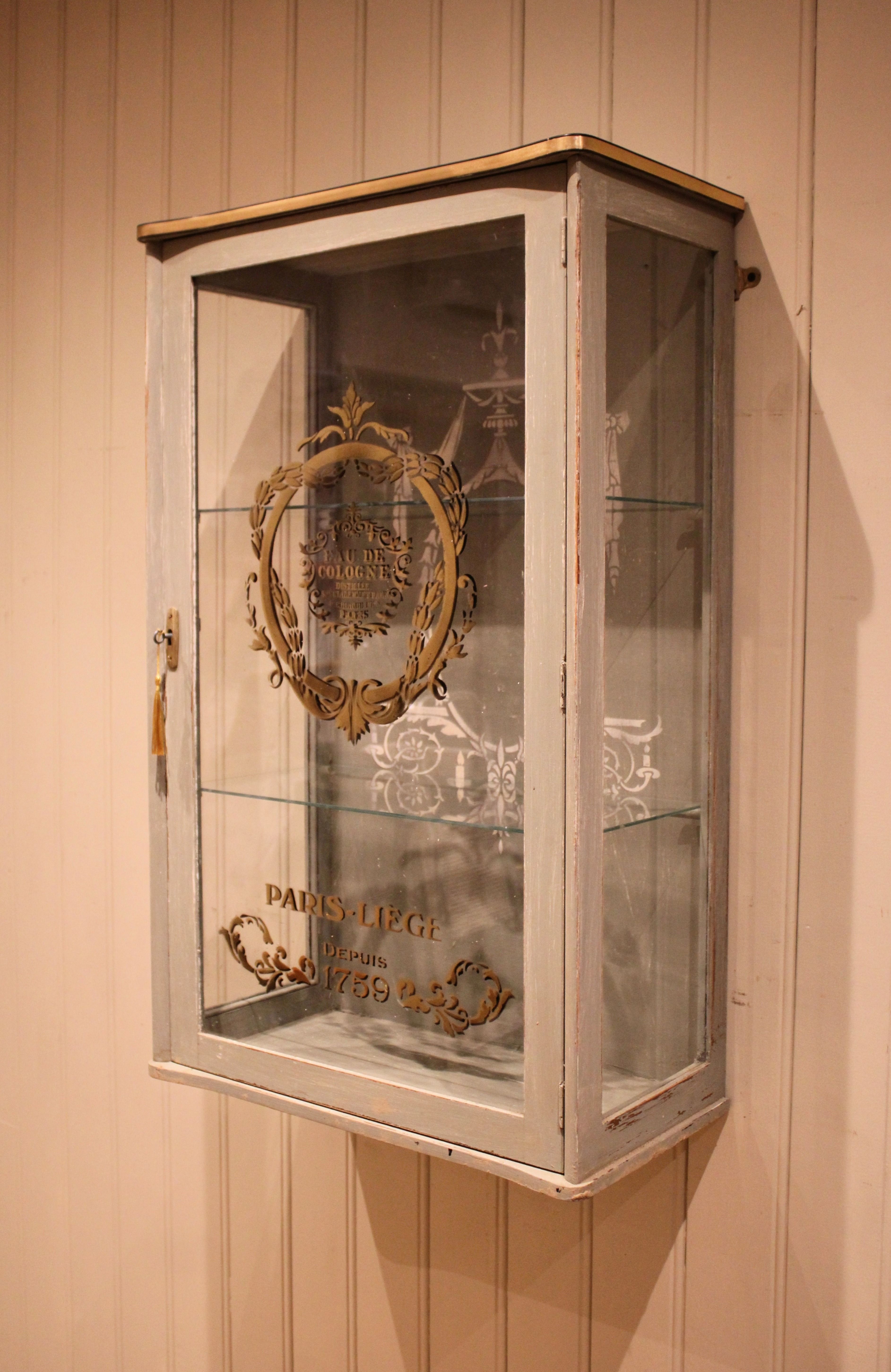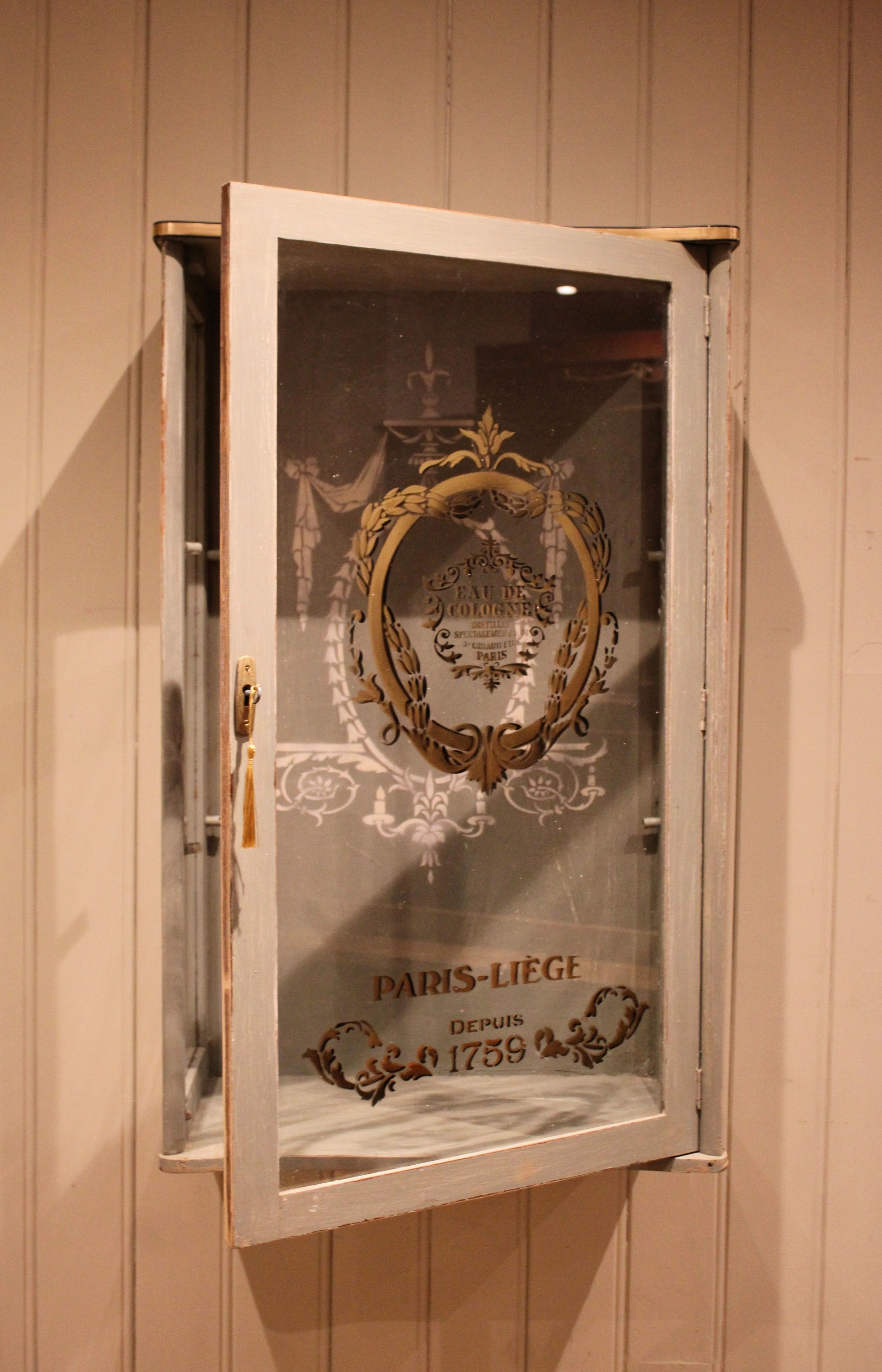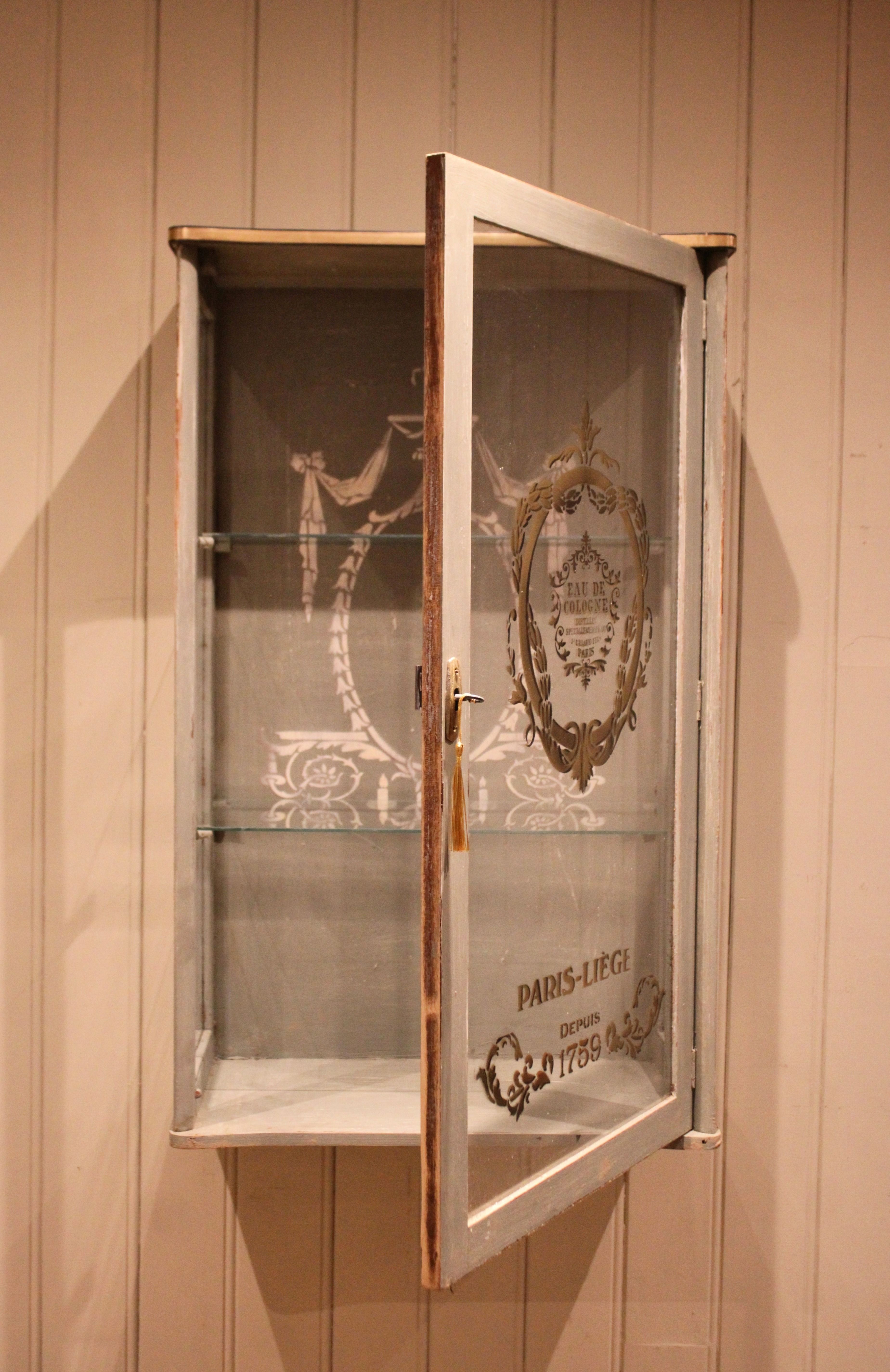 French wall cabinet having a painted finish with gilded sign written glass , a pair of fixed glass shelves , complete with working lock & key. The internal depth is 24 cm and the width is 50.5 cm .