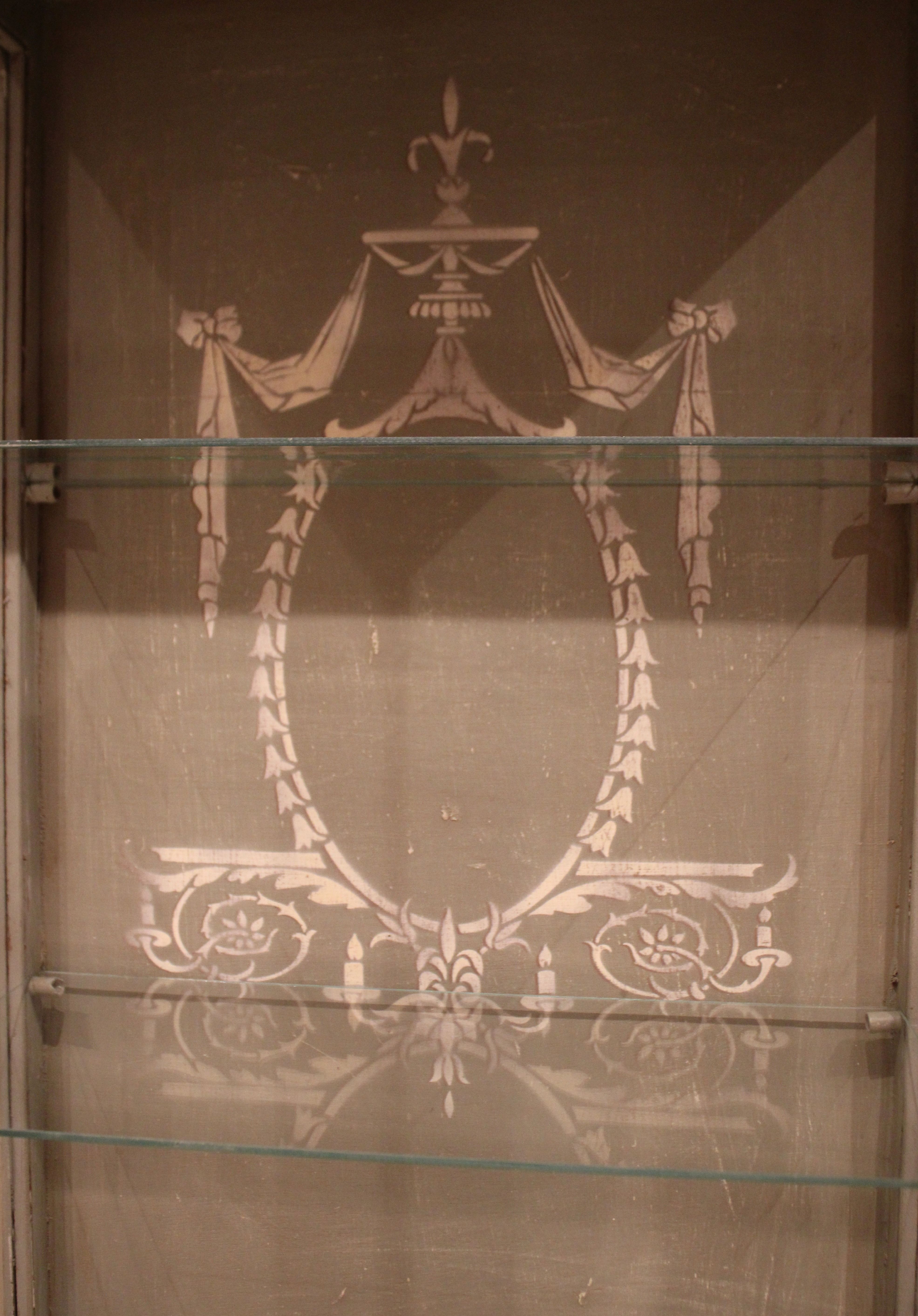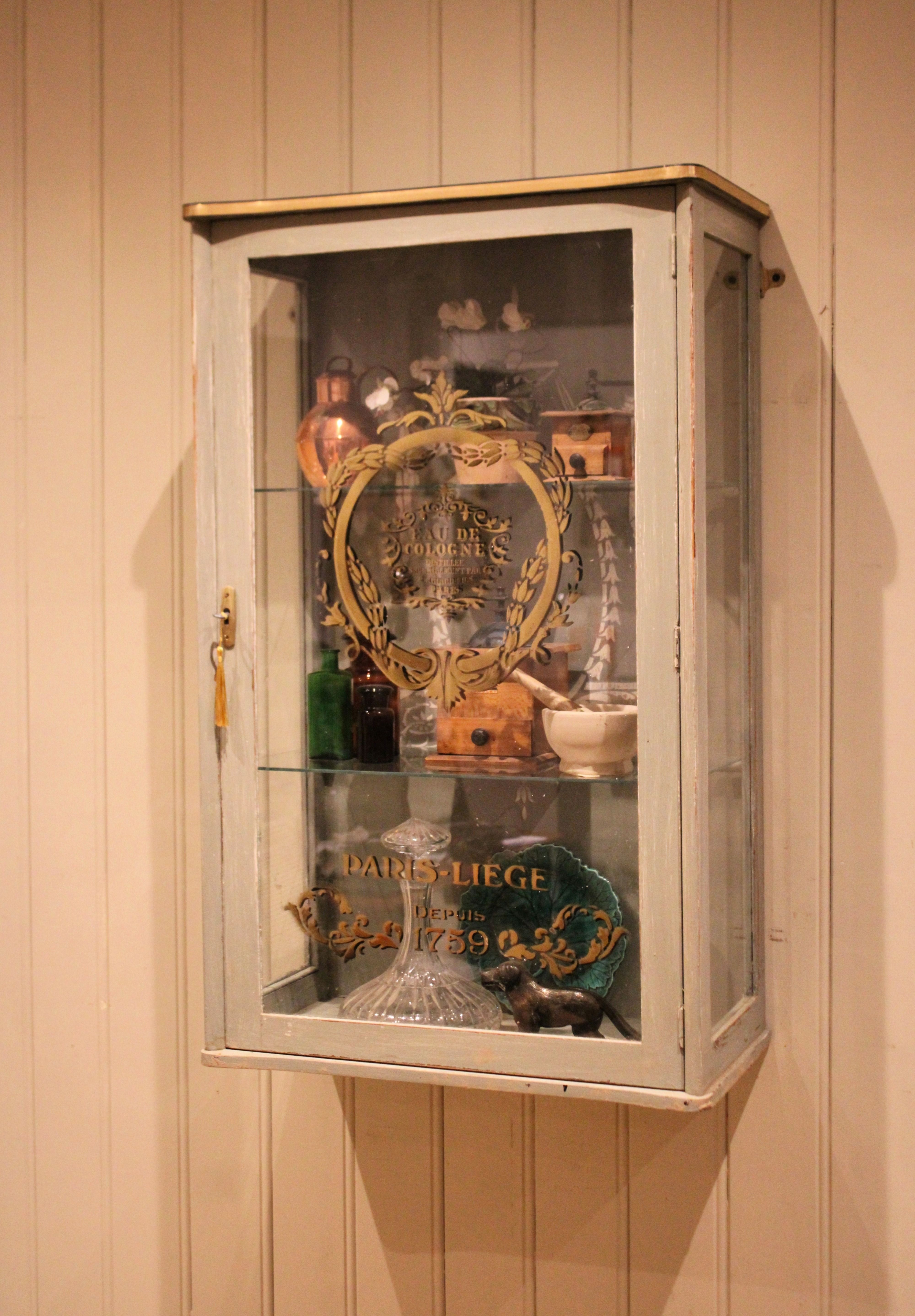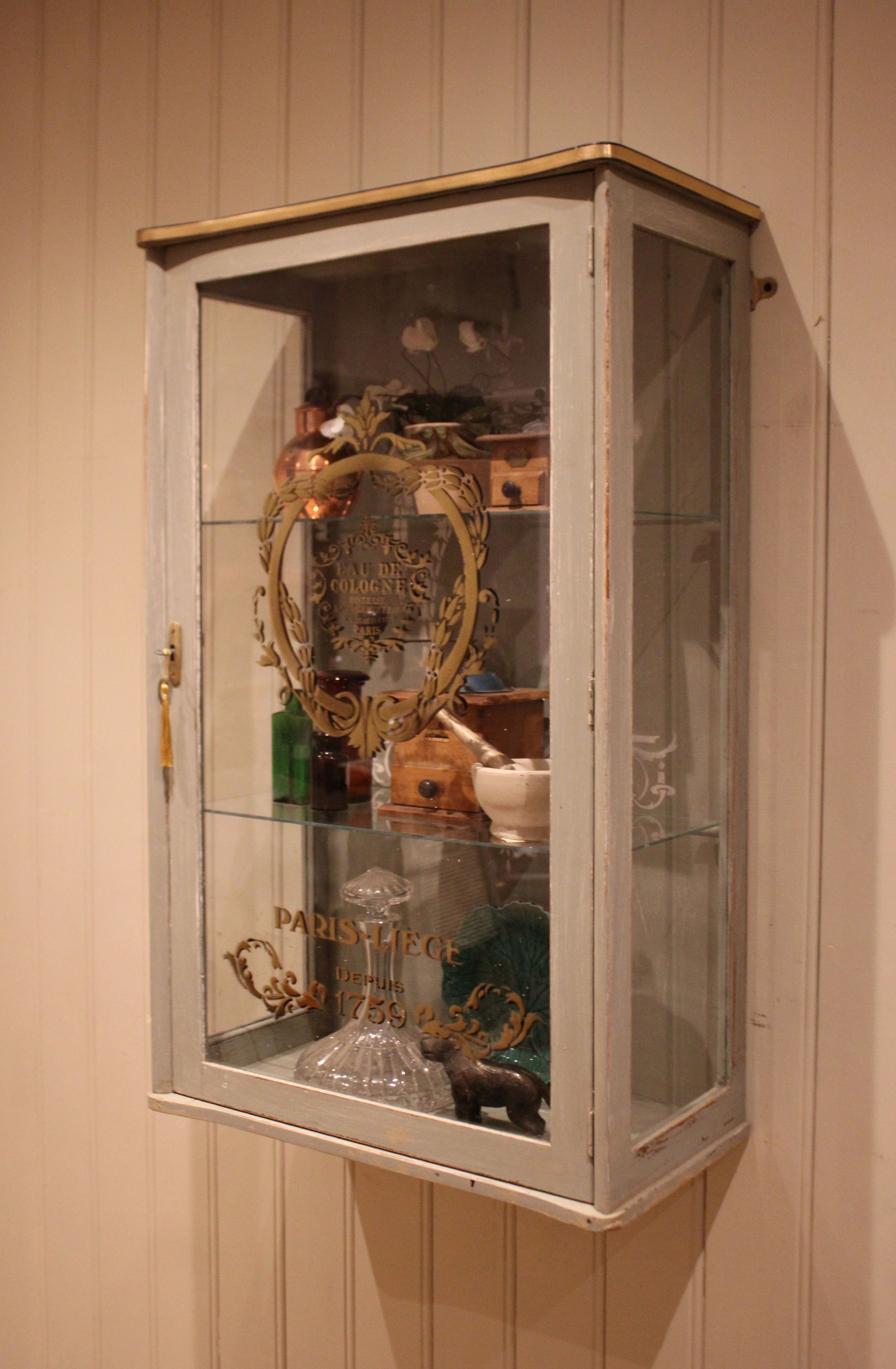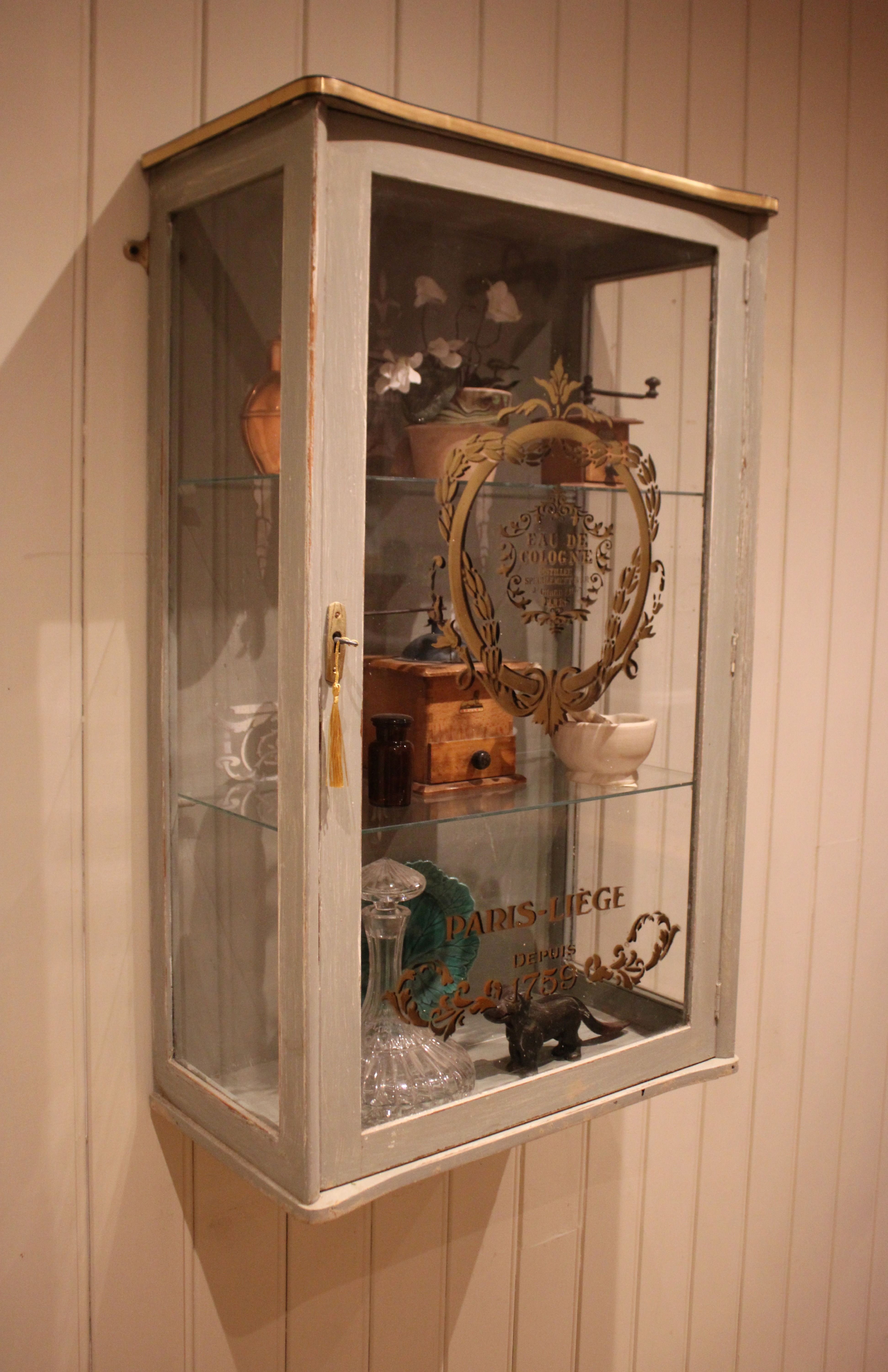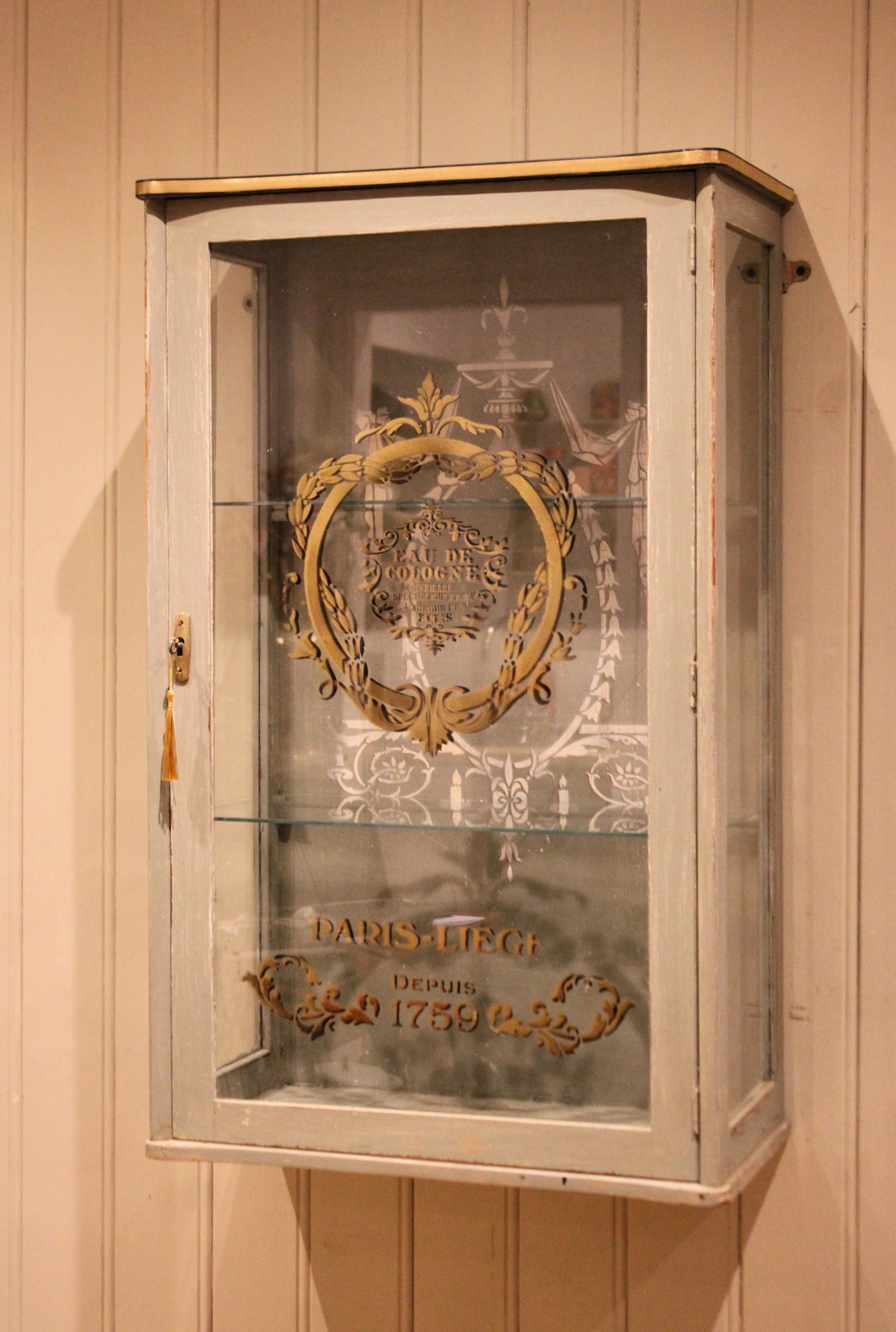 French wall cabinet having a painted finish with gilded sign written glass , a pair of fixed glass shelves , complete with working lock & key. The internal depth is 24 cm and the width is 50.5 cm .