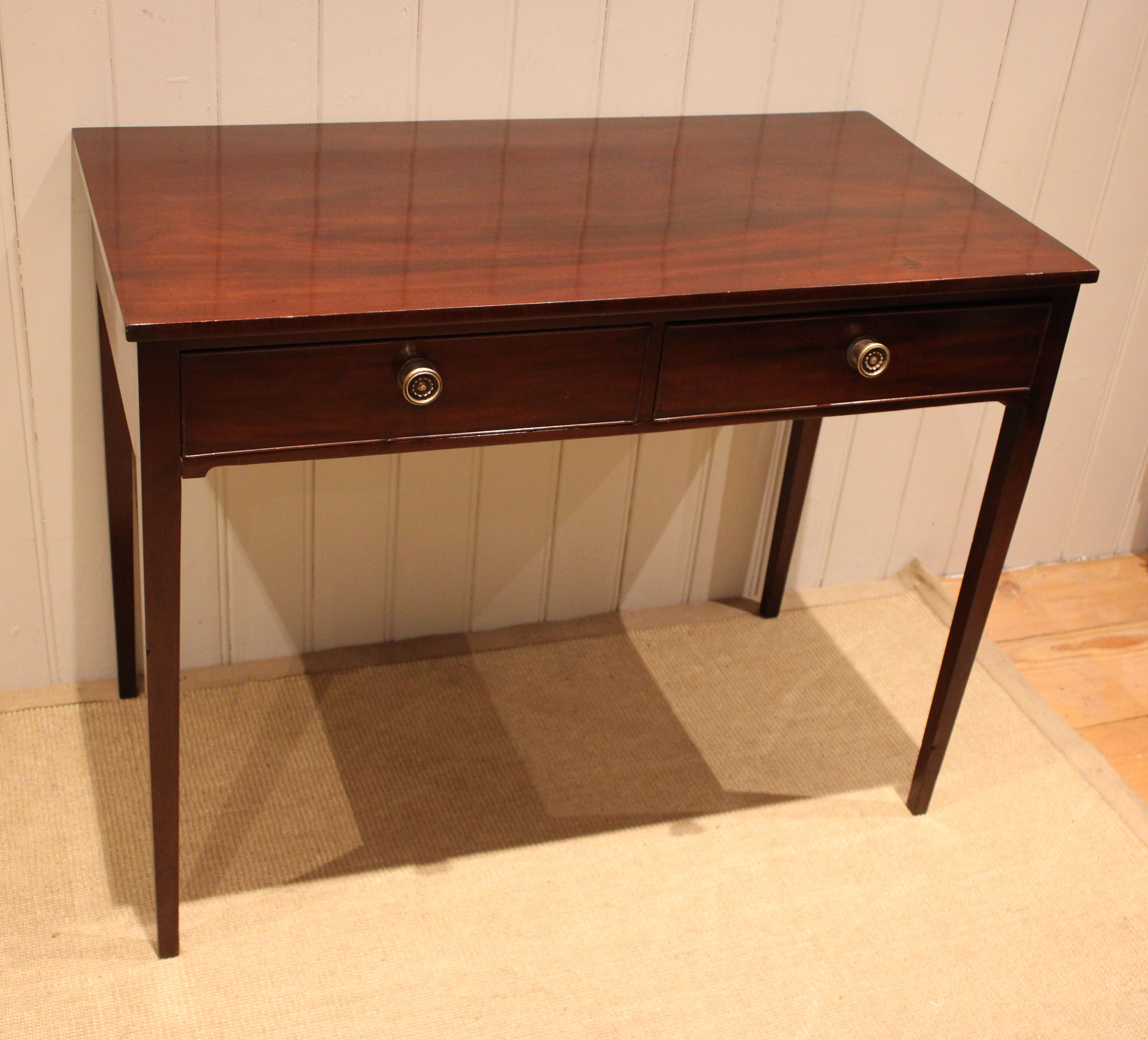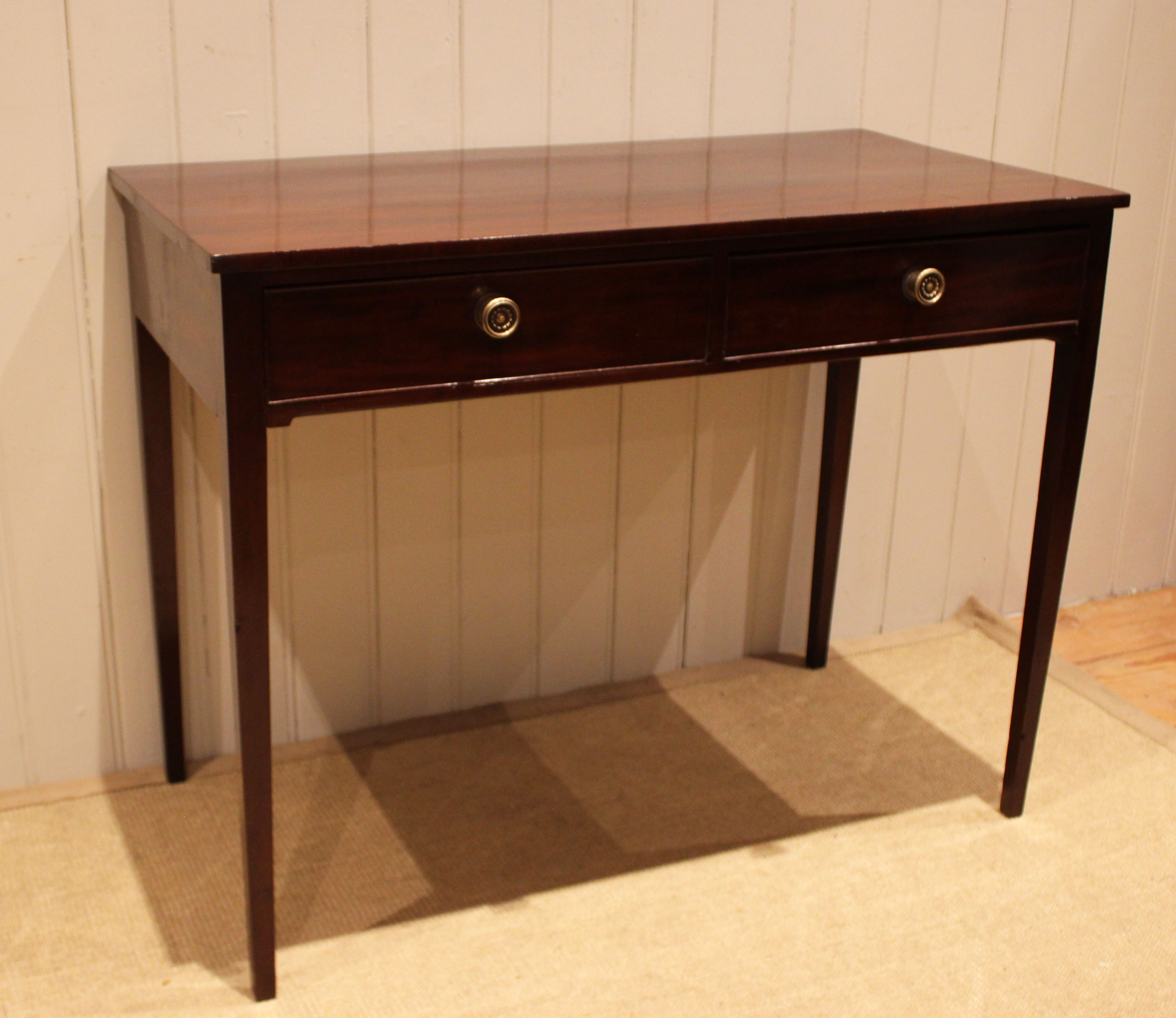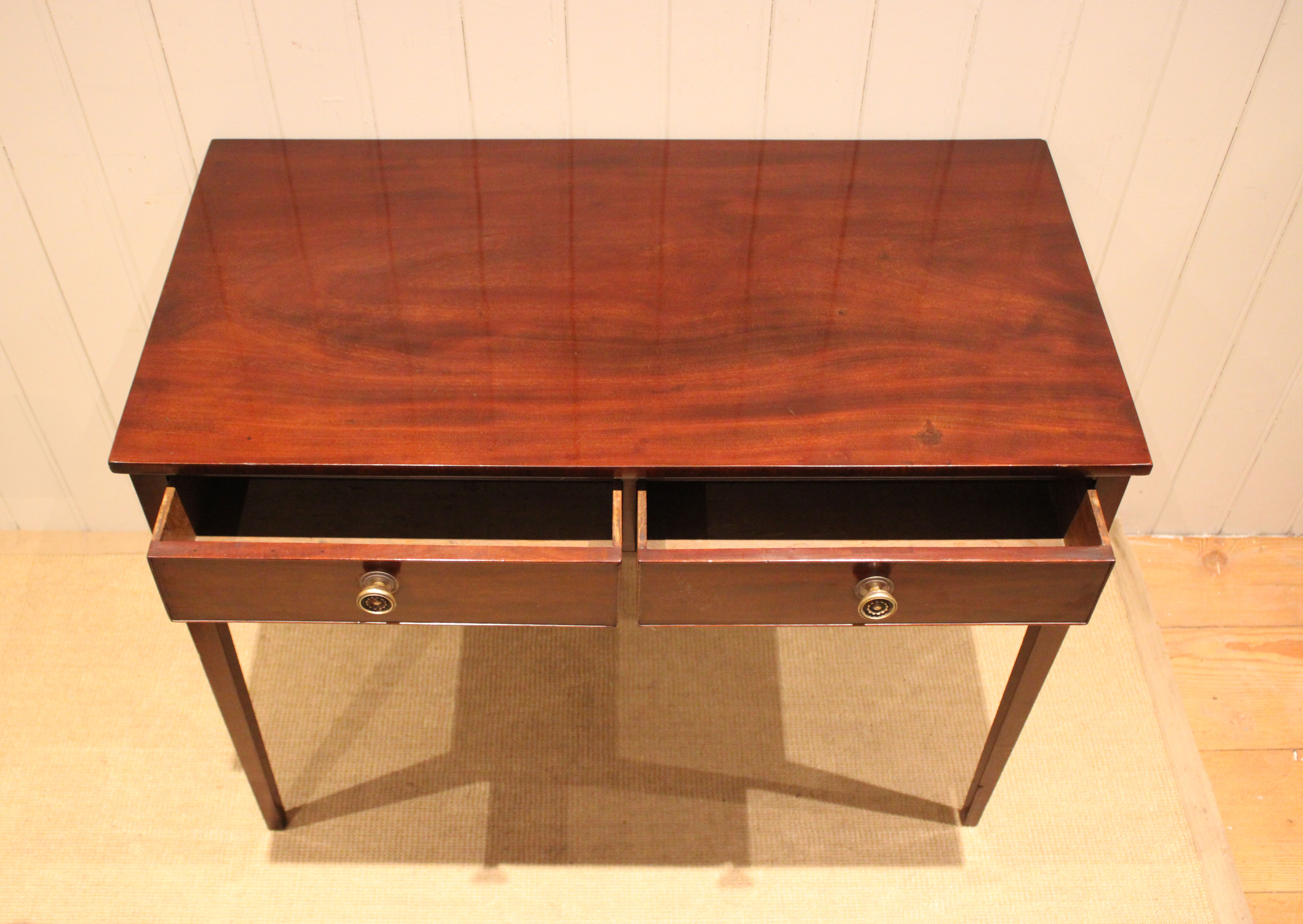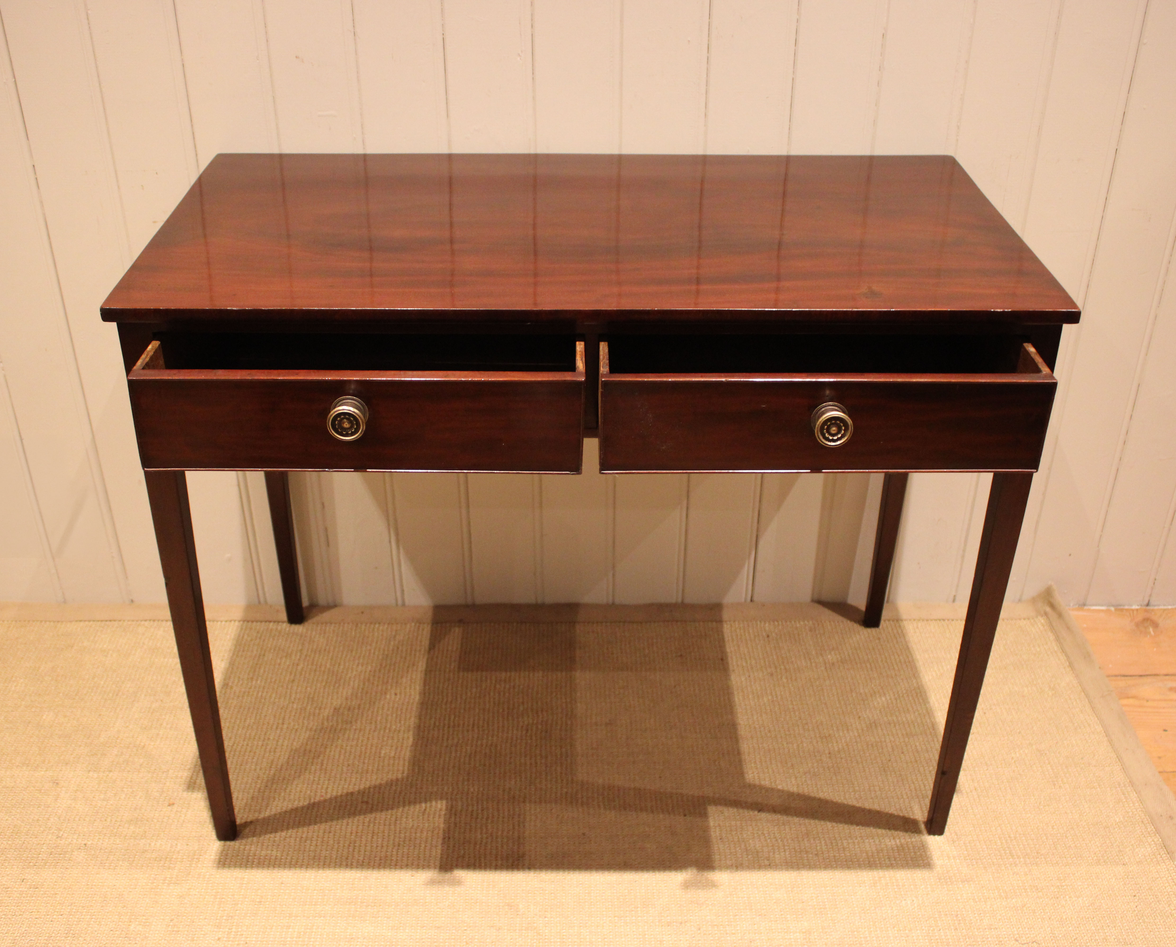 Solid mahogany late Georgian side table having two oak lined drawers , raised on straight tapering legs . The height to the under tier is 61 cm .