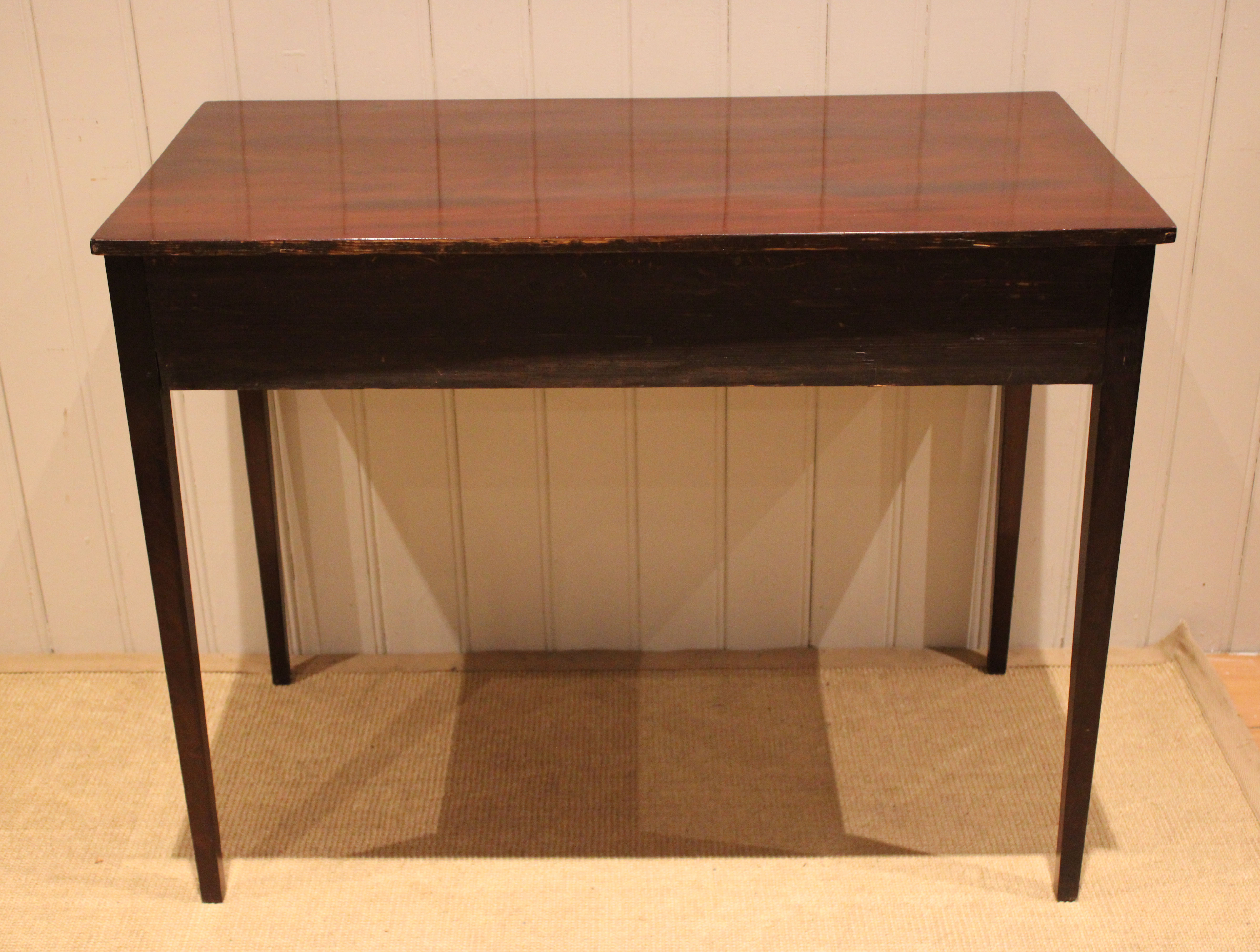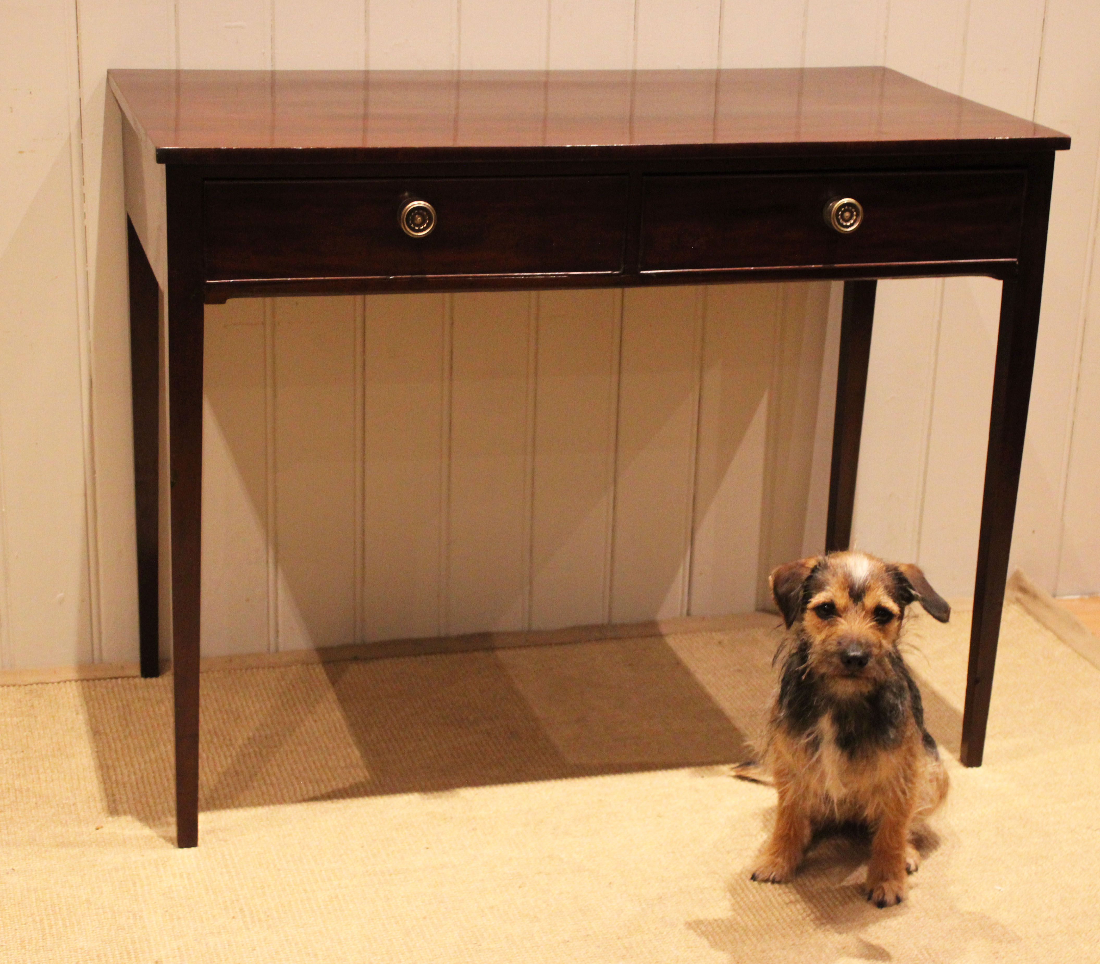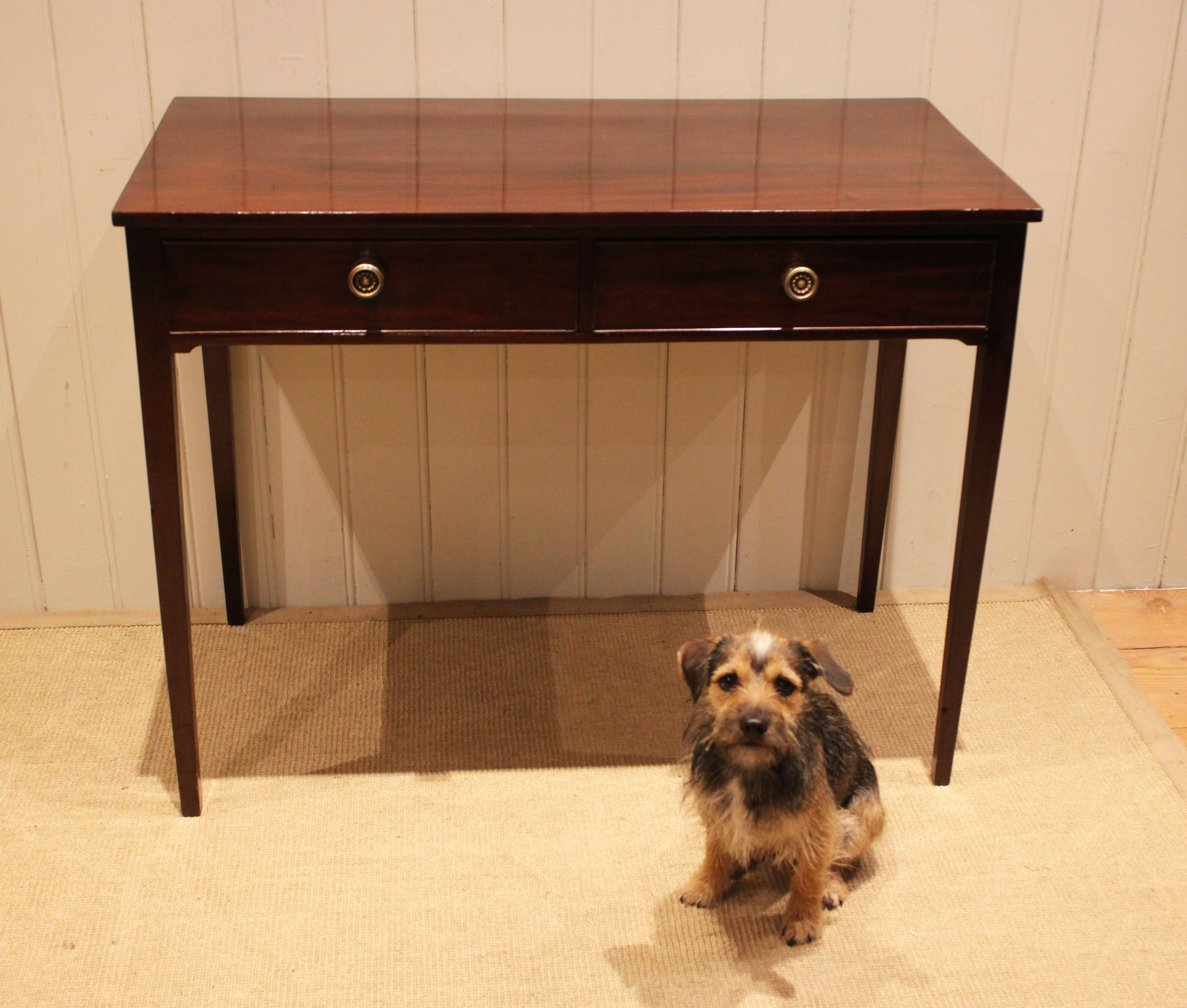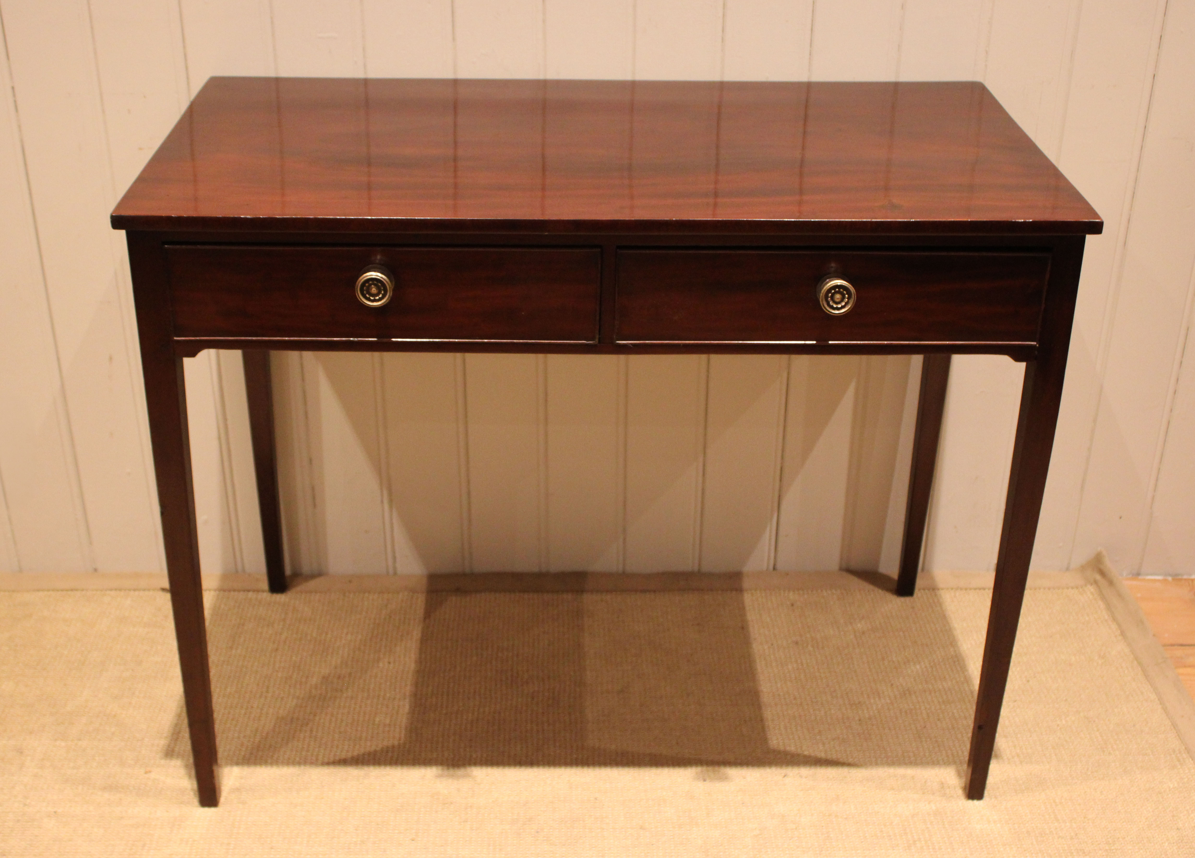 Solid mahogany late Georgian side table having two oak lined drawers , raised on straight tapering legs . The height to the under tier is 61 cm .