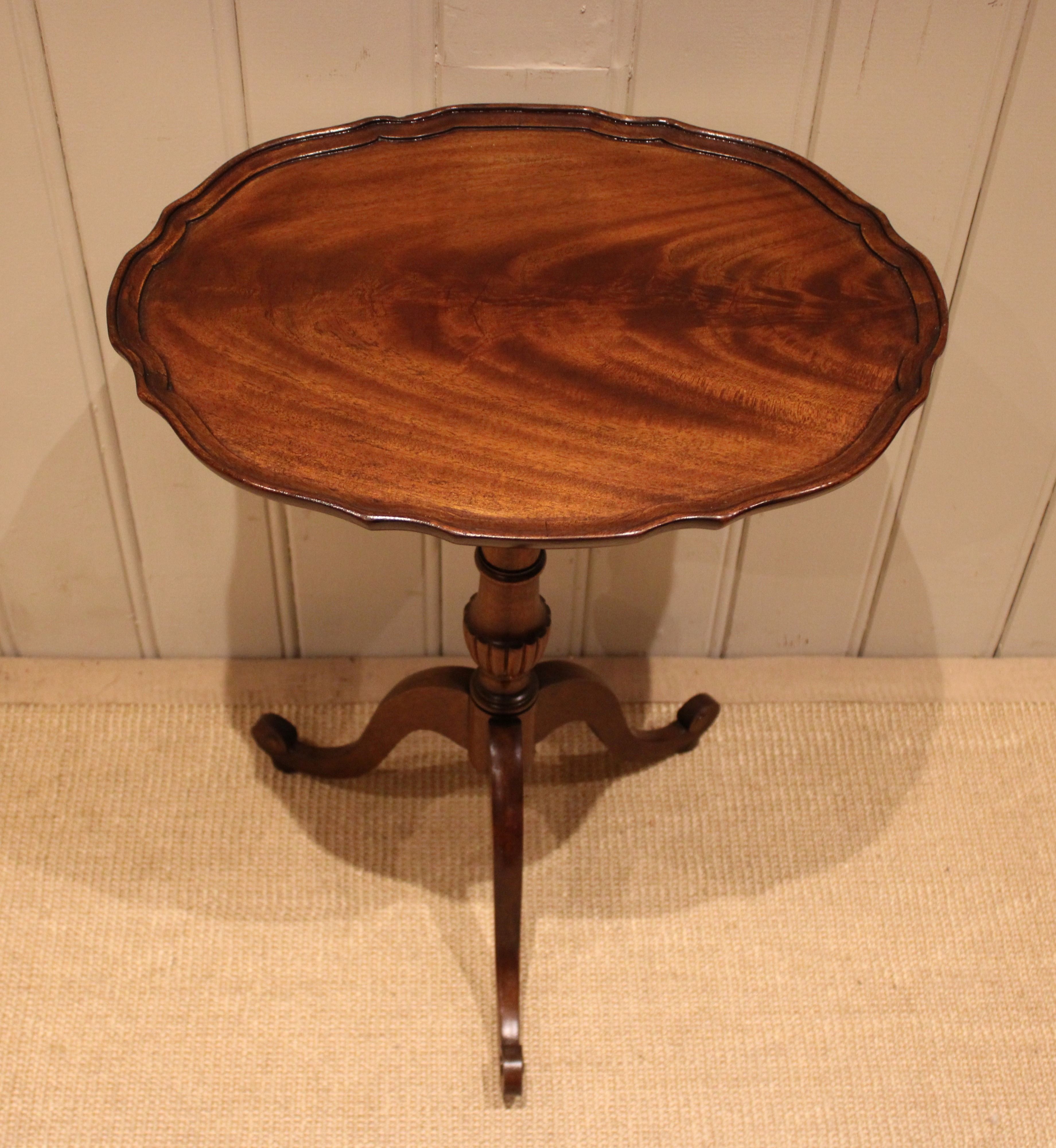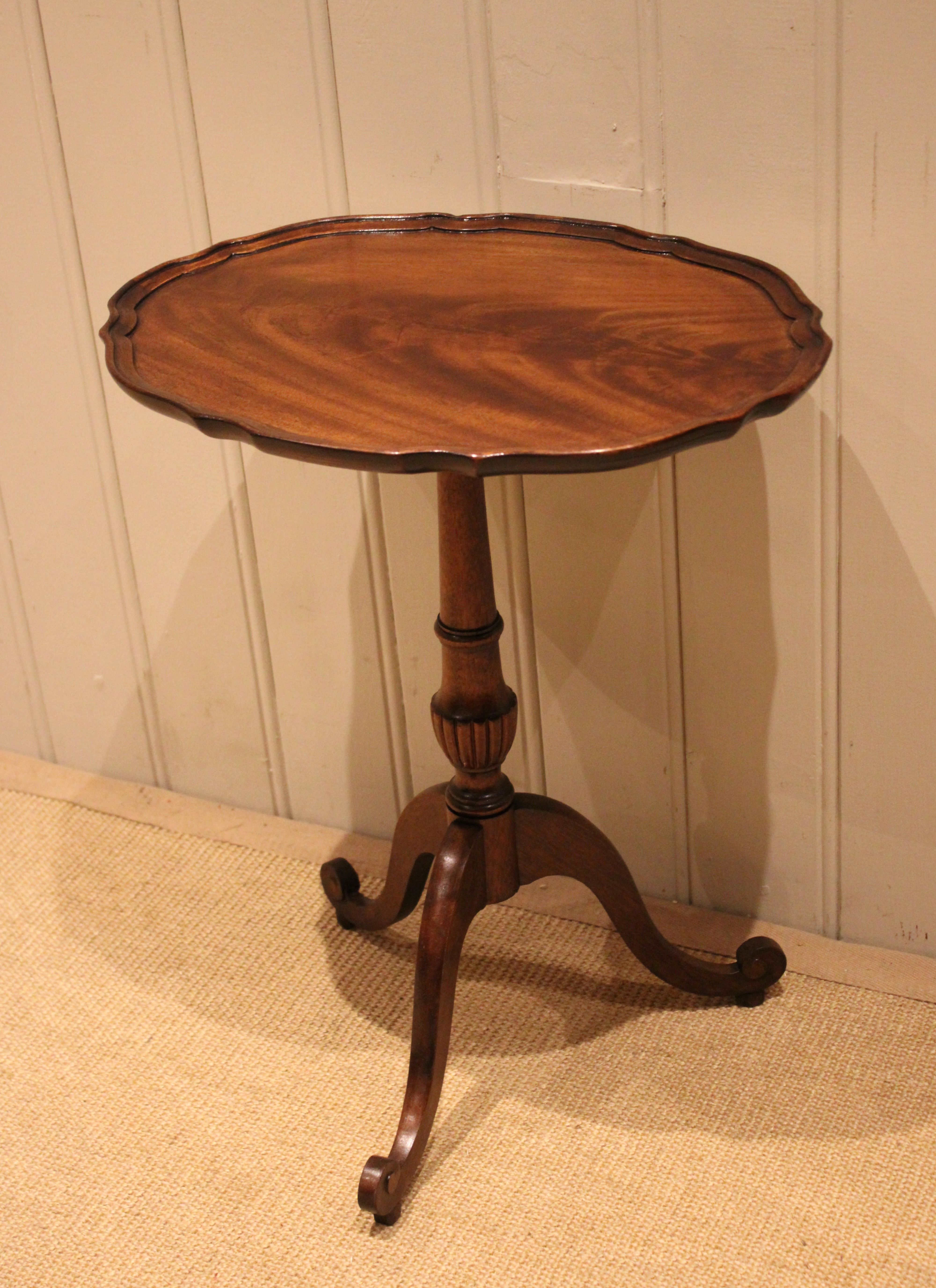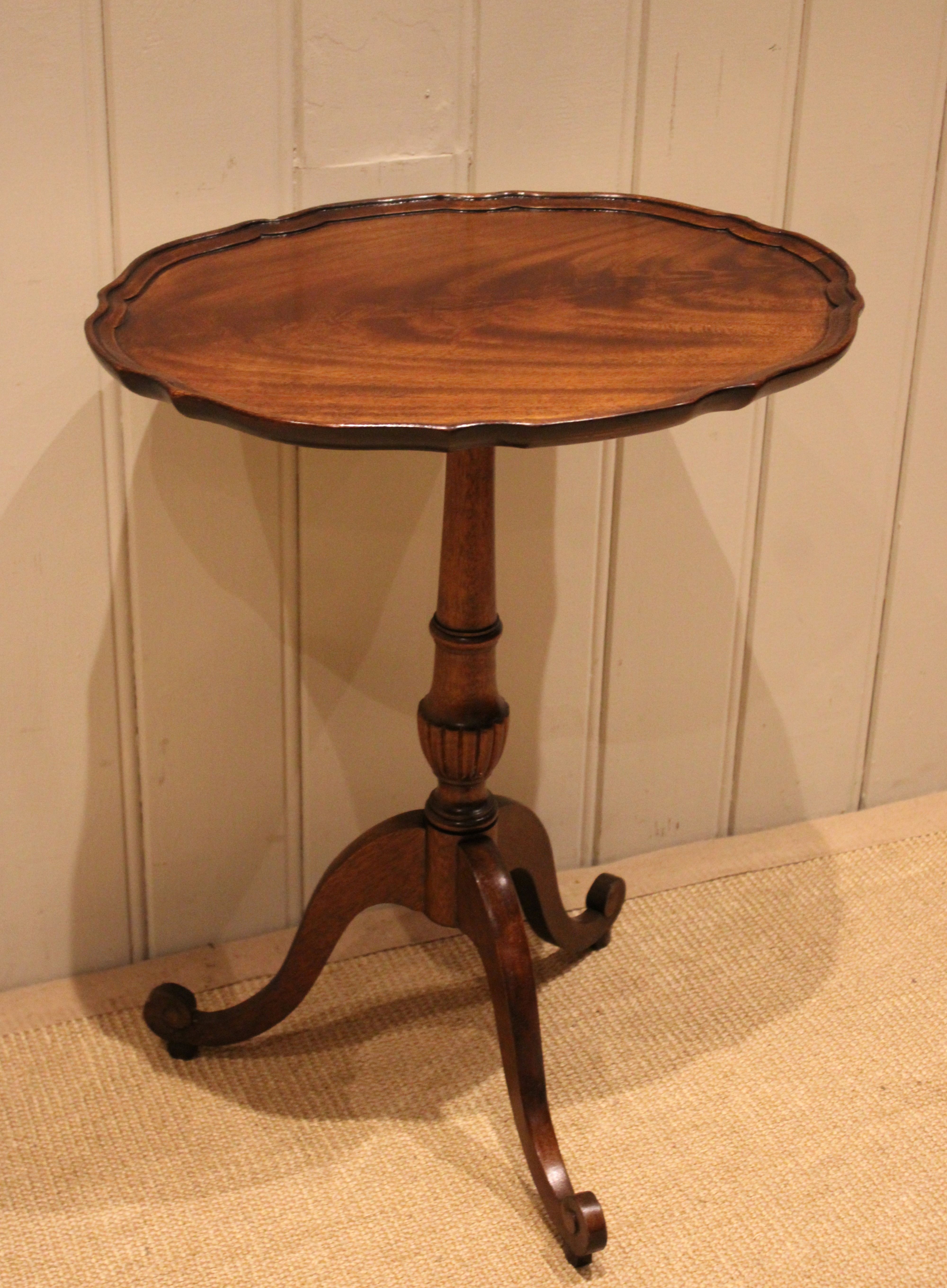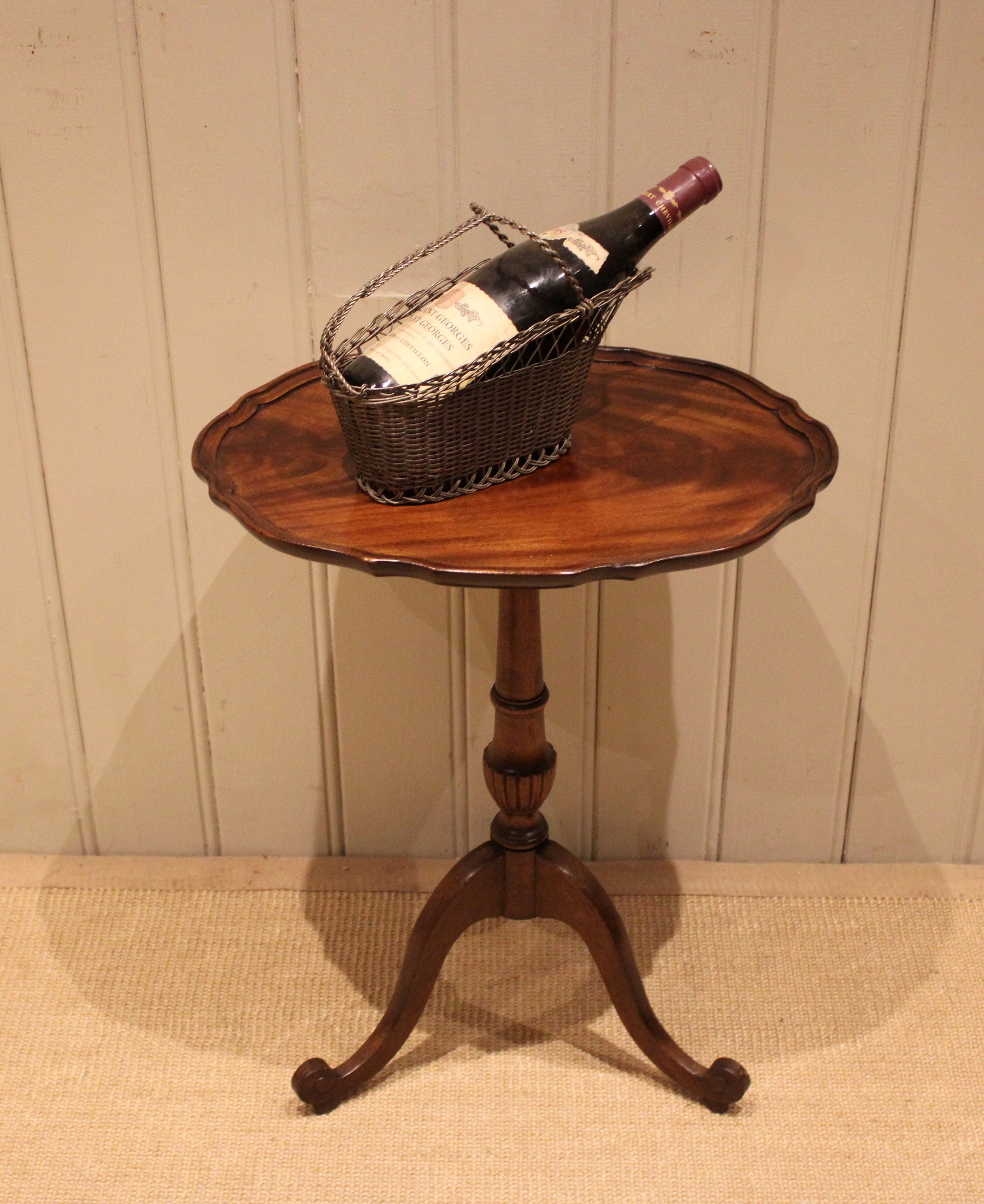 Mahogany oval top wine table having a pie crust edge raised on a turned tripod base .