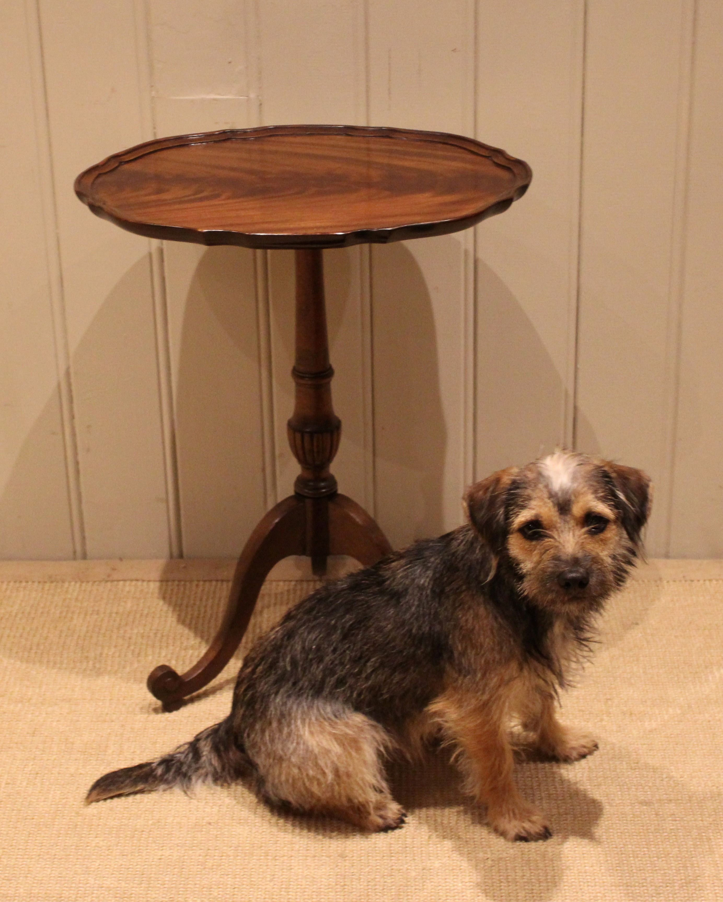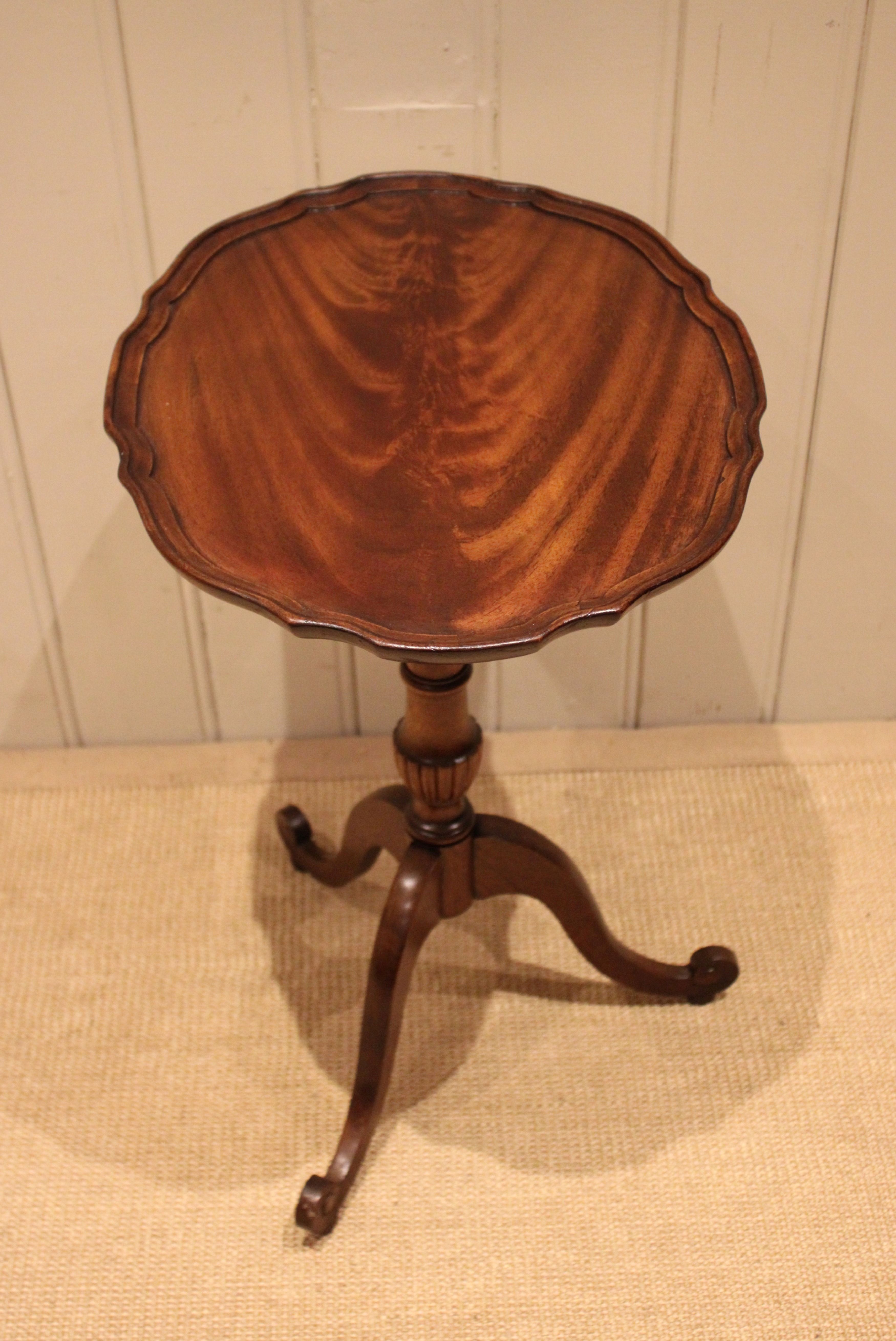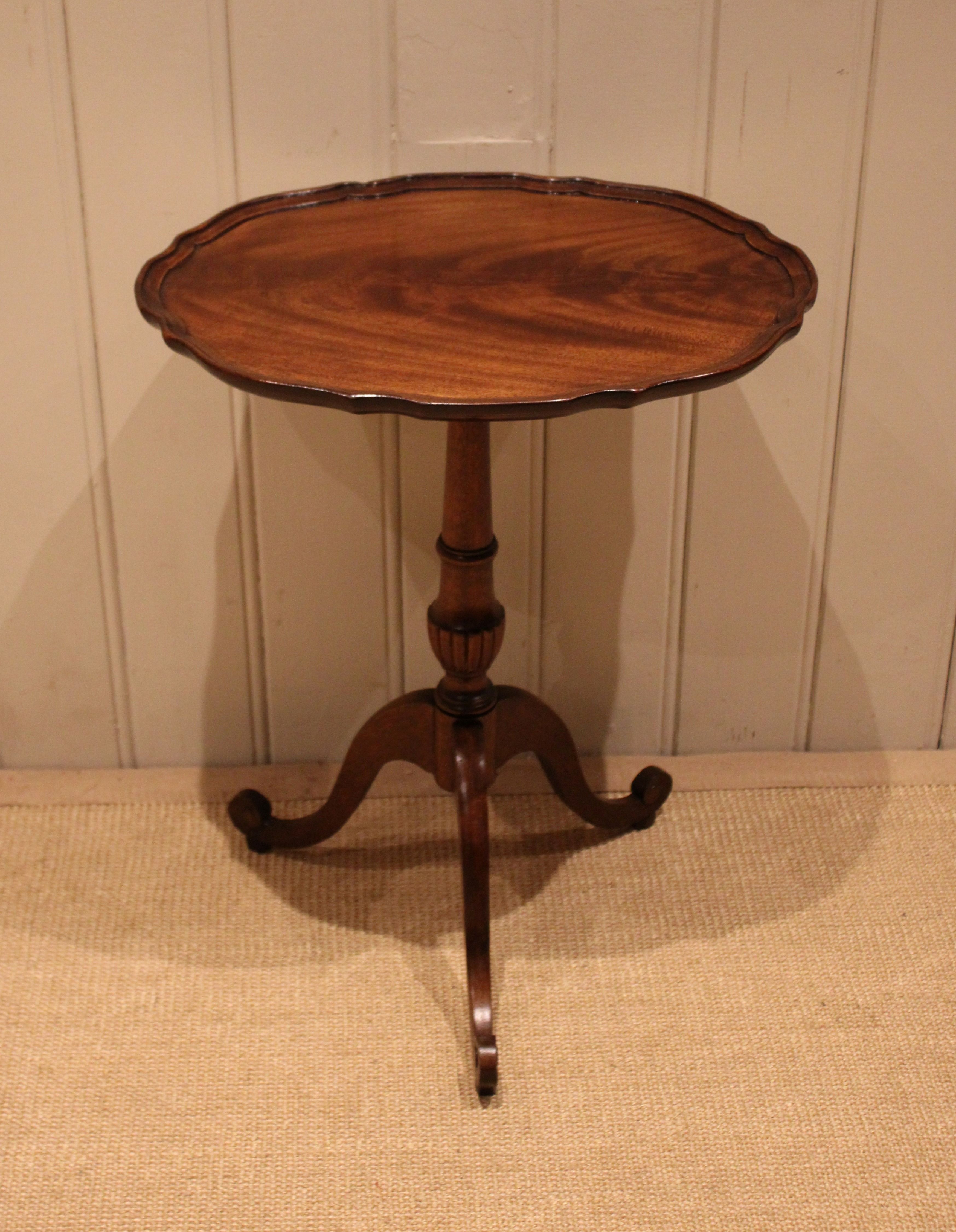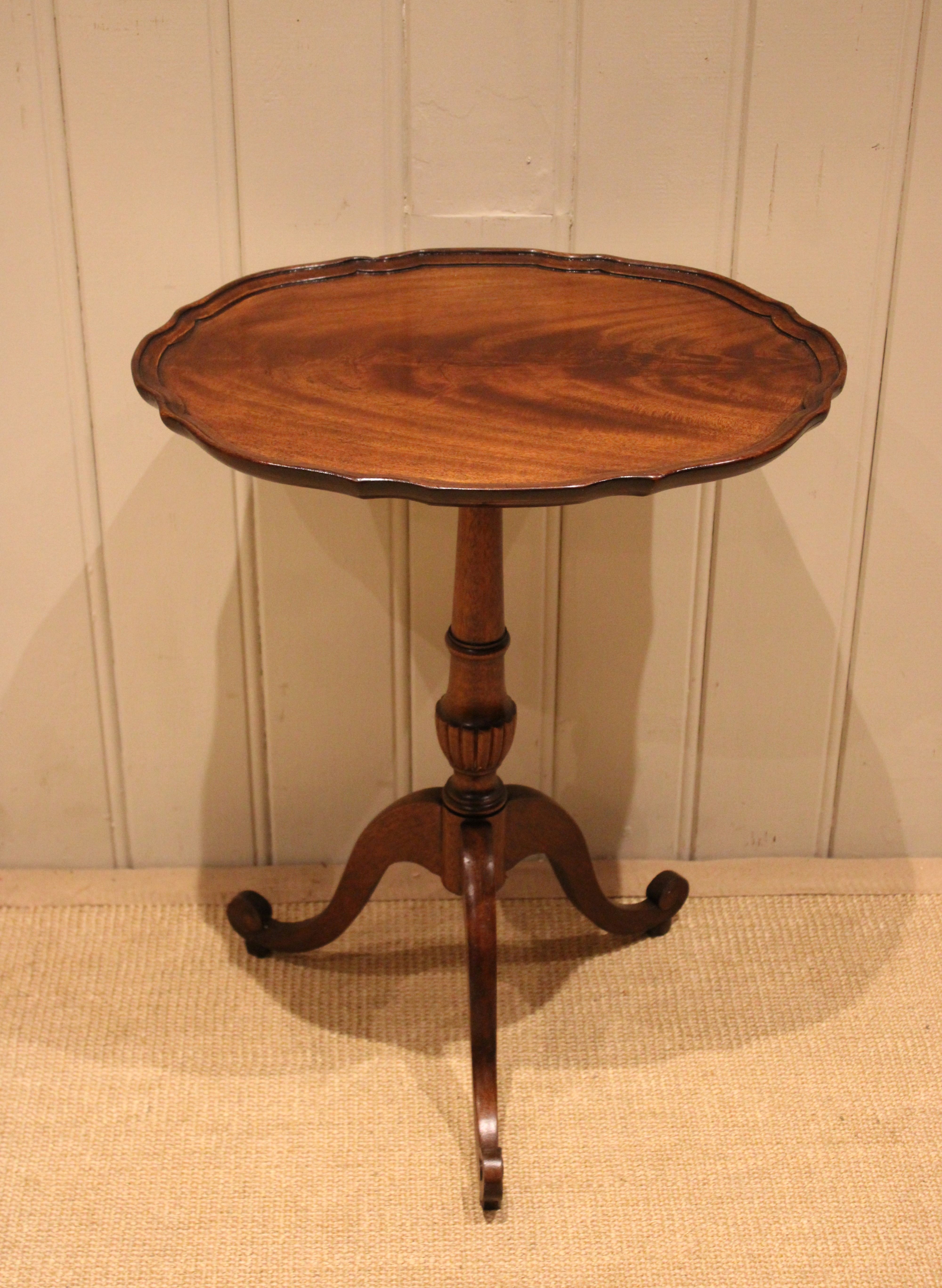 Mahogany oval top wine table having a pie crust edge raised on a turned tripod base .