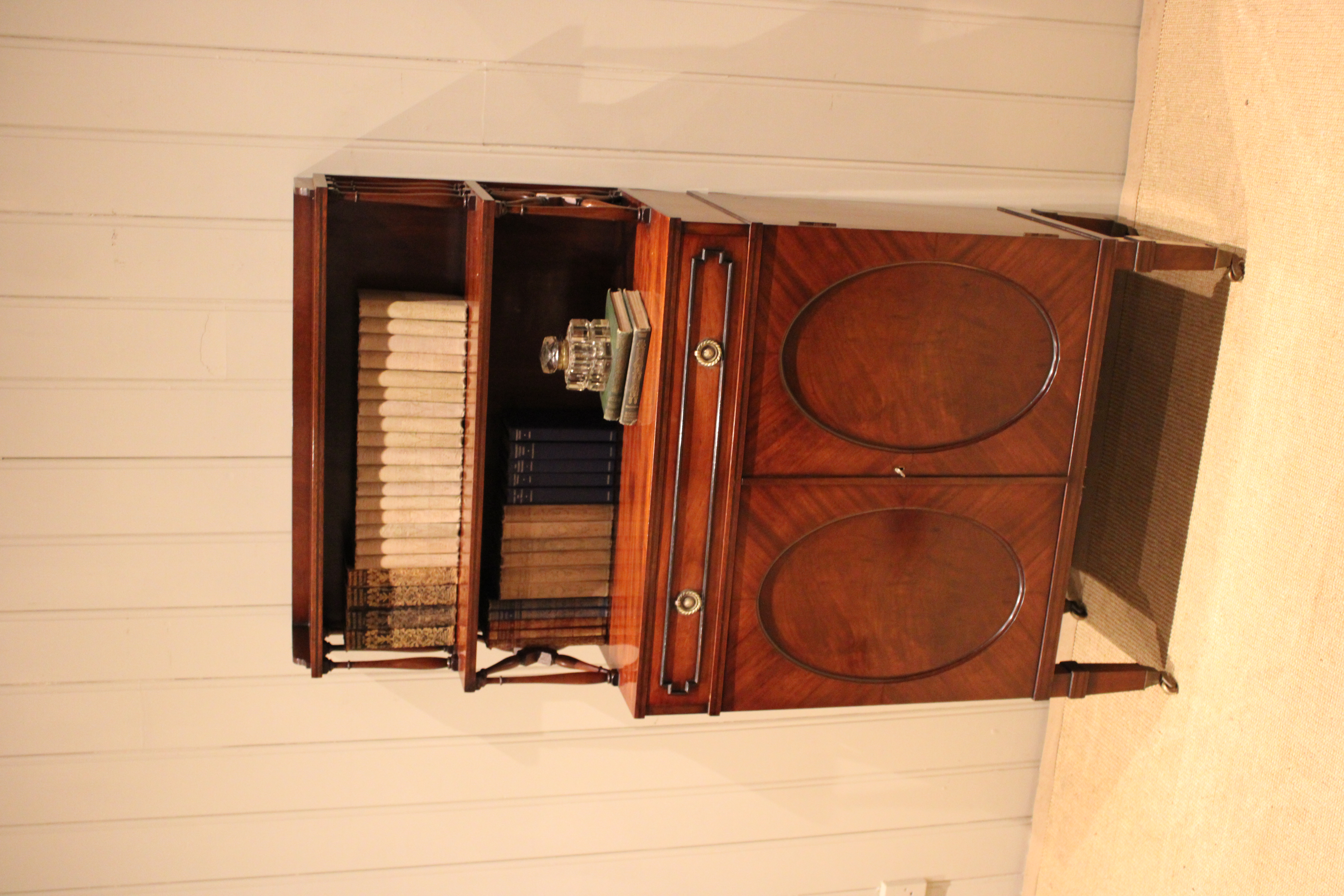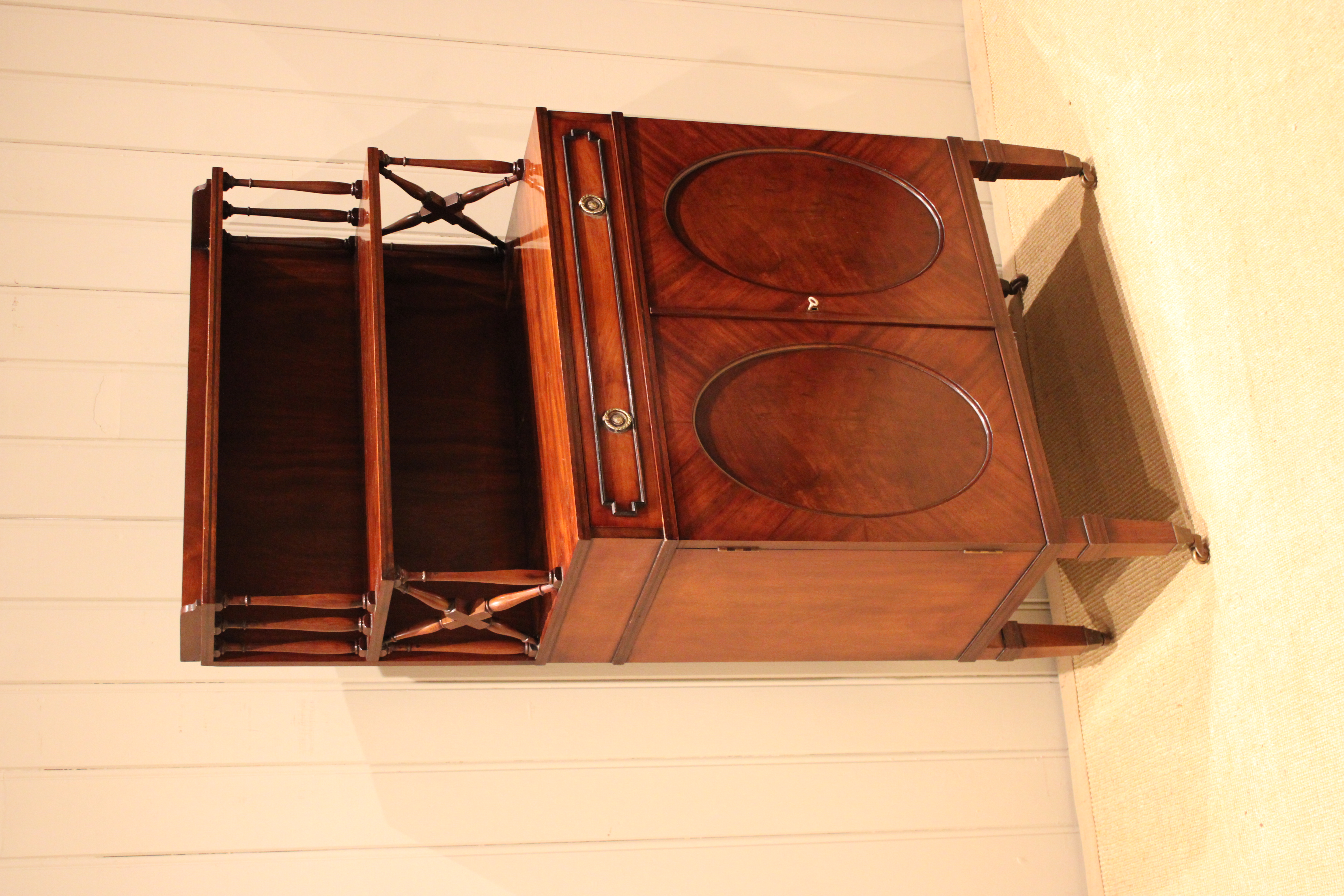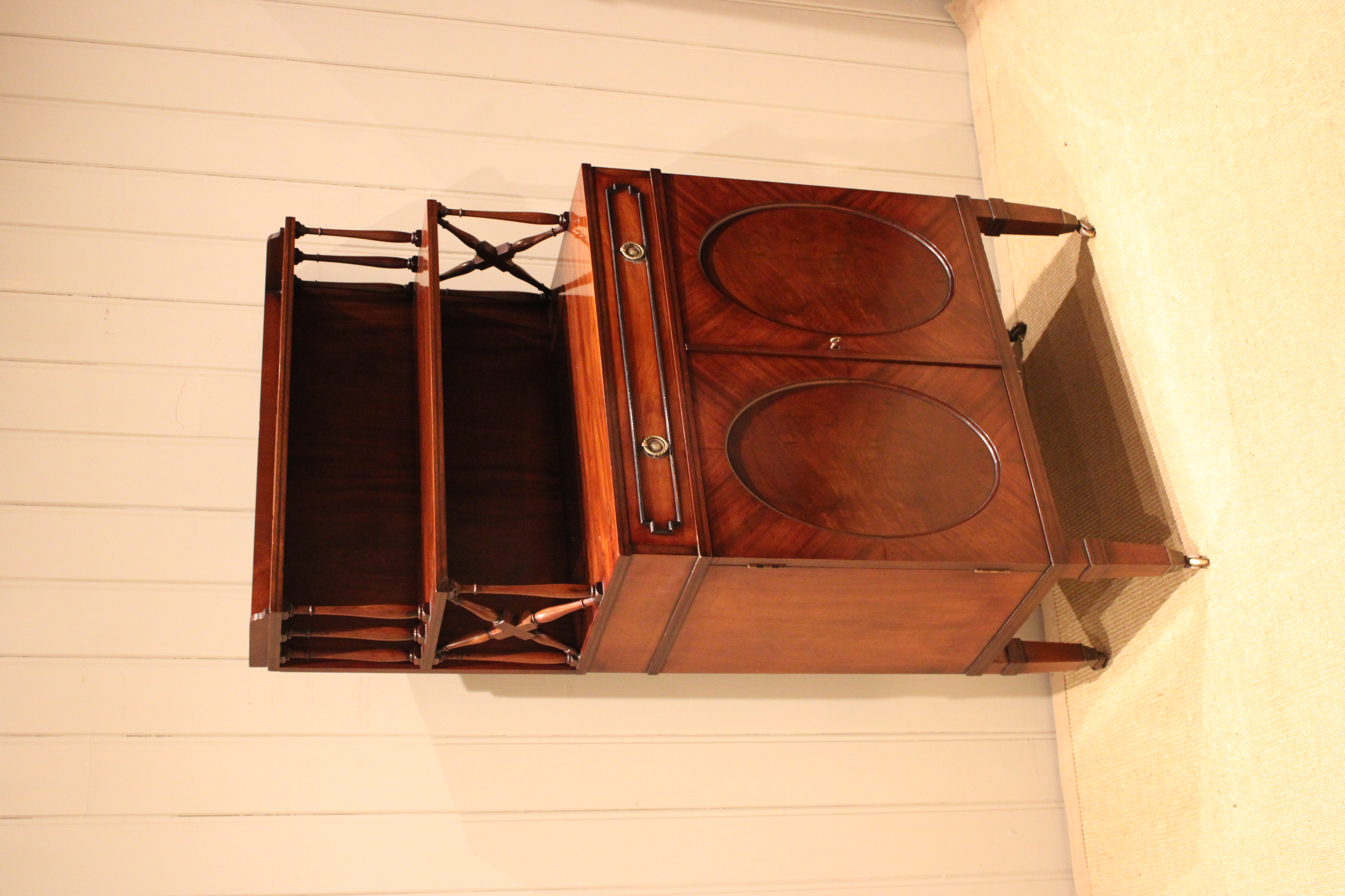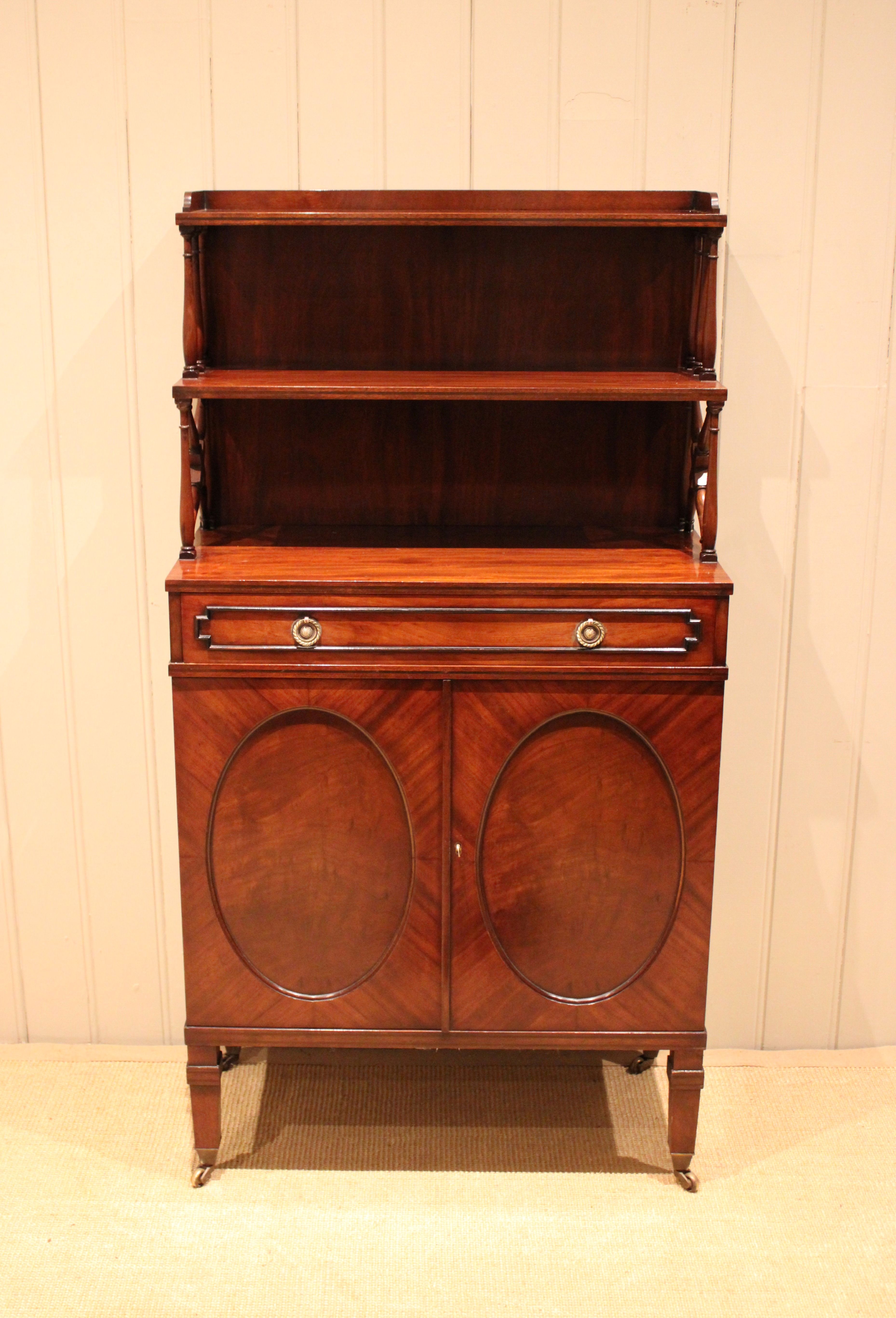 Good quality Regency style mahogany cabinet having a shelved top with turned wooden supports , above a single drawer and cupboard base with a pair of oval panelled doors , raised on tapering legs terminating in brass cap castors .