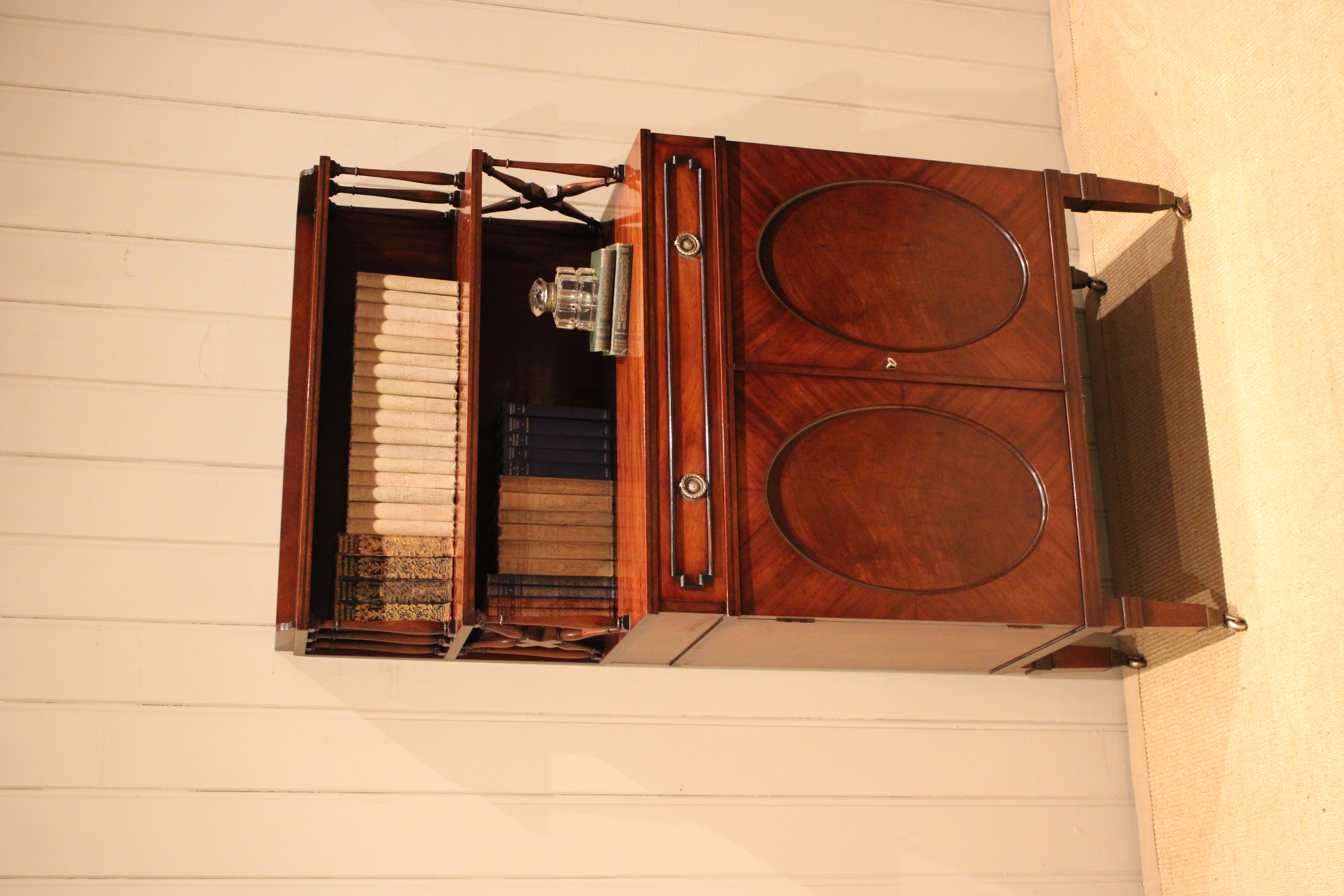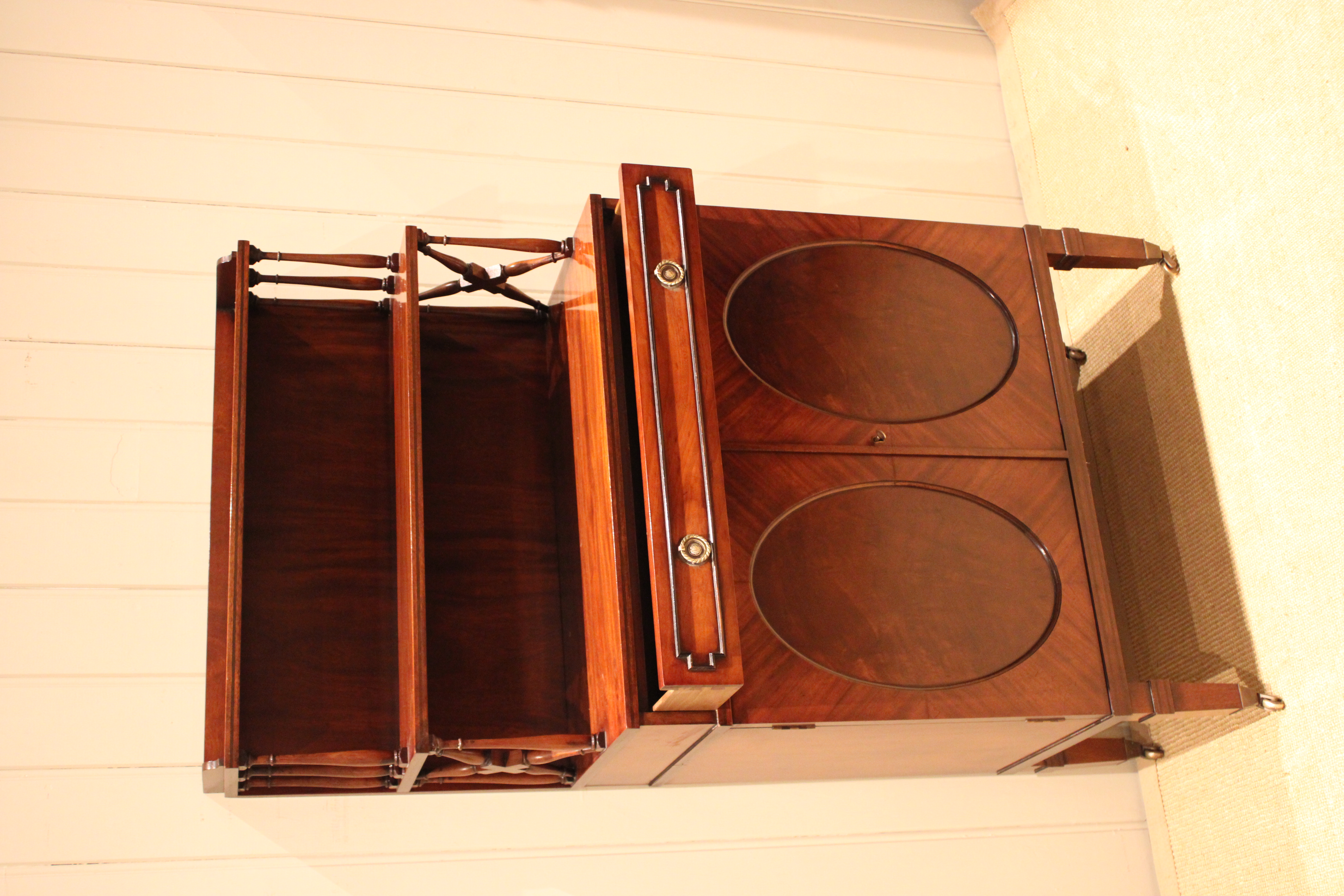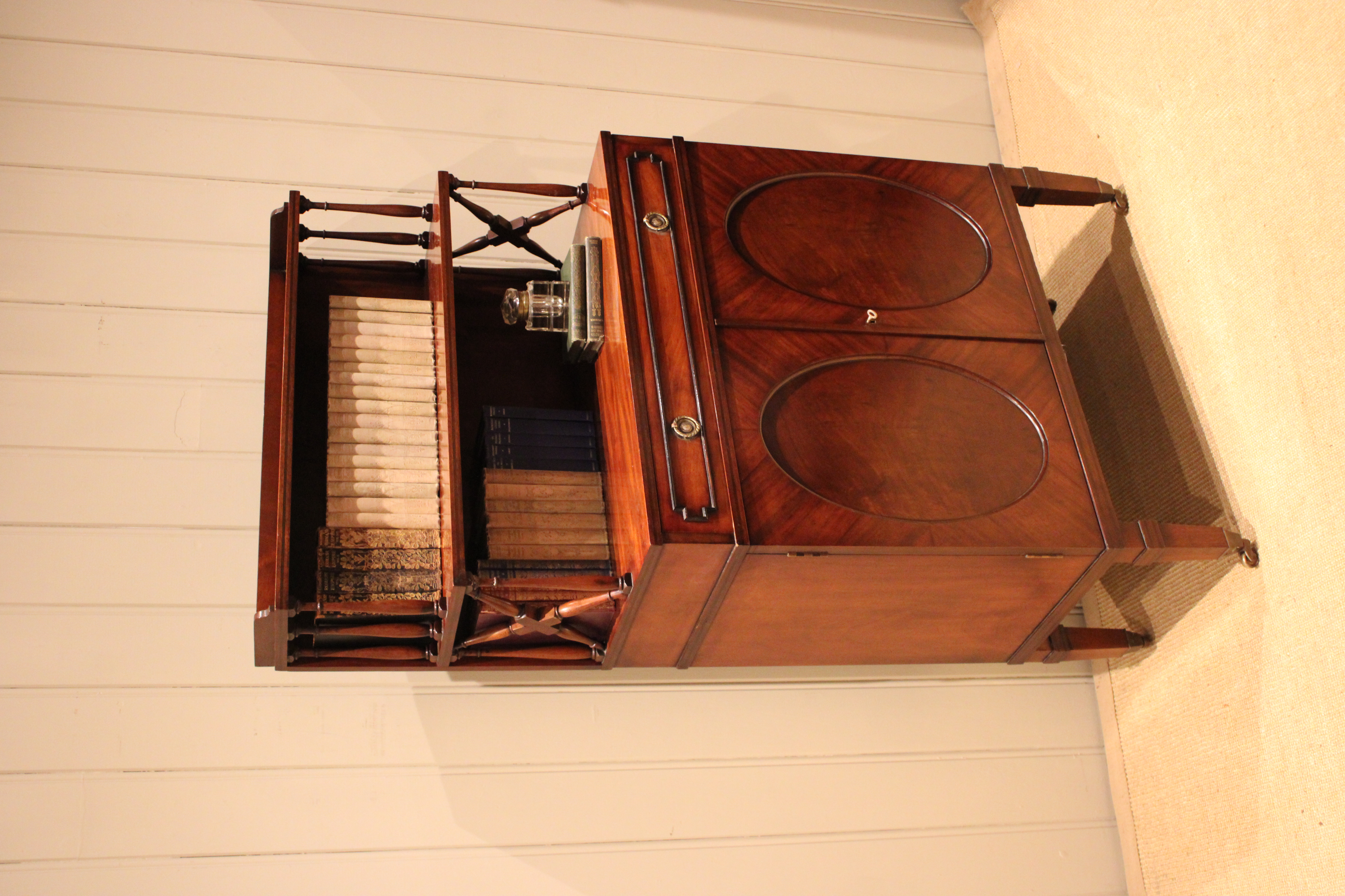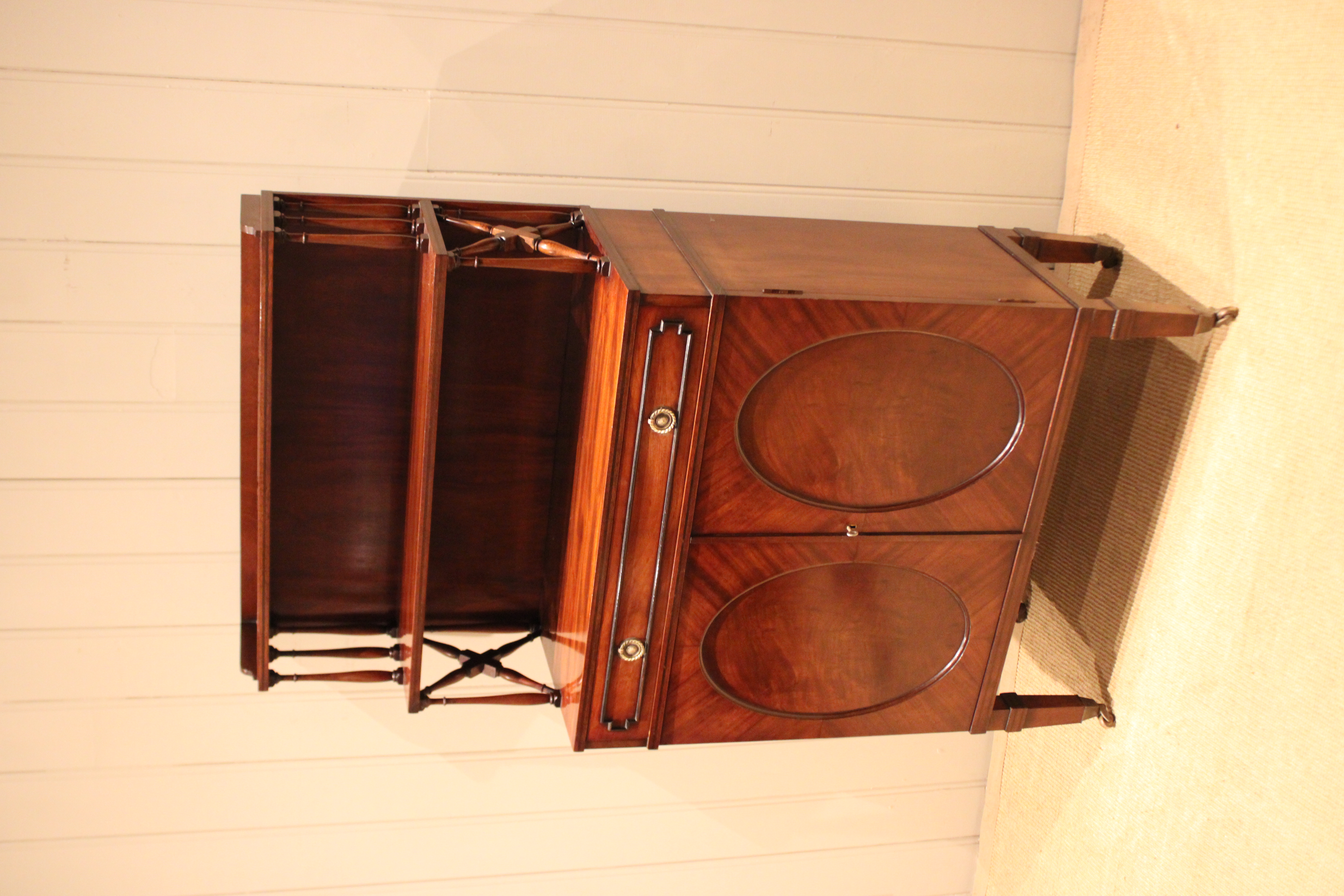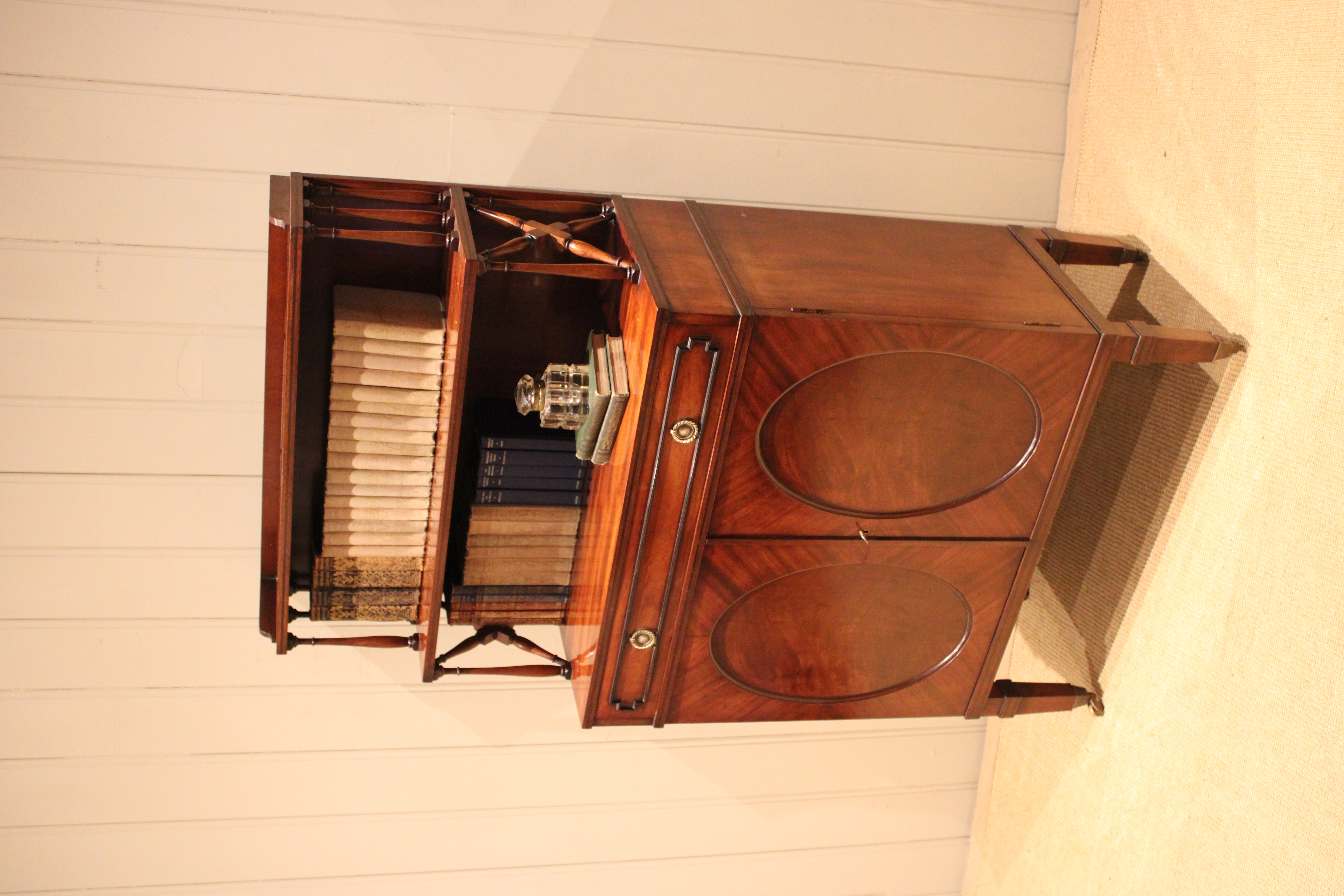 Good quality Regency style mahogany cabinet having a shelved top with turned wooden supports , above a single drawer and cupboard base with a pair of oval panelled doors , raised on tapering legs terminating in brass cap castors .