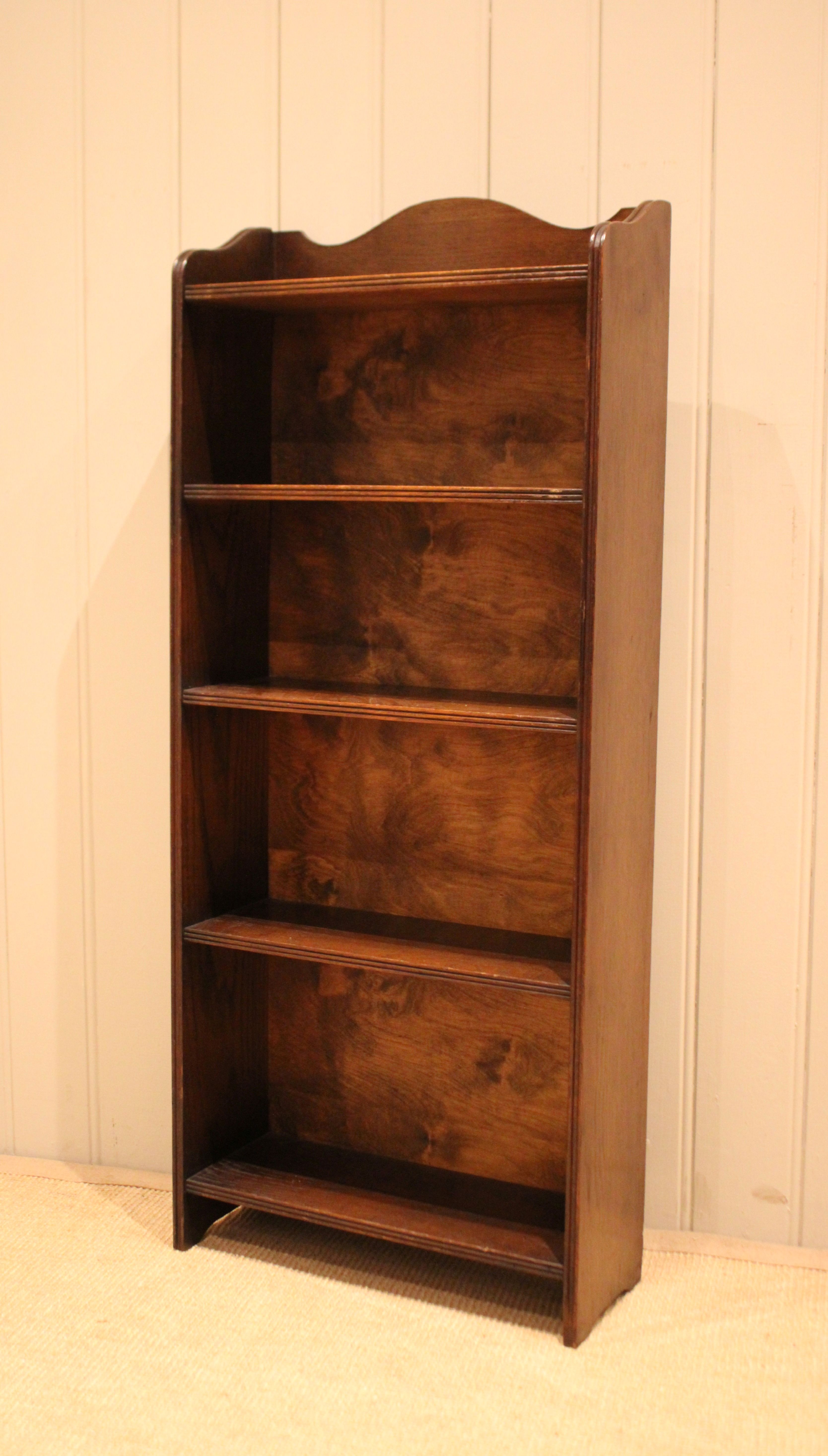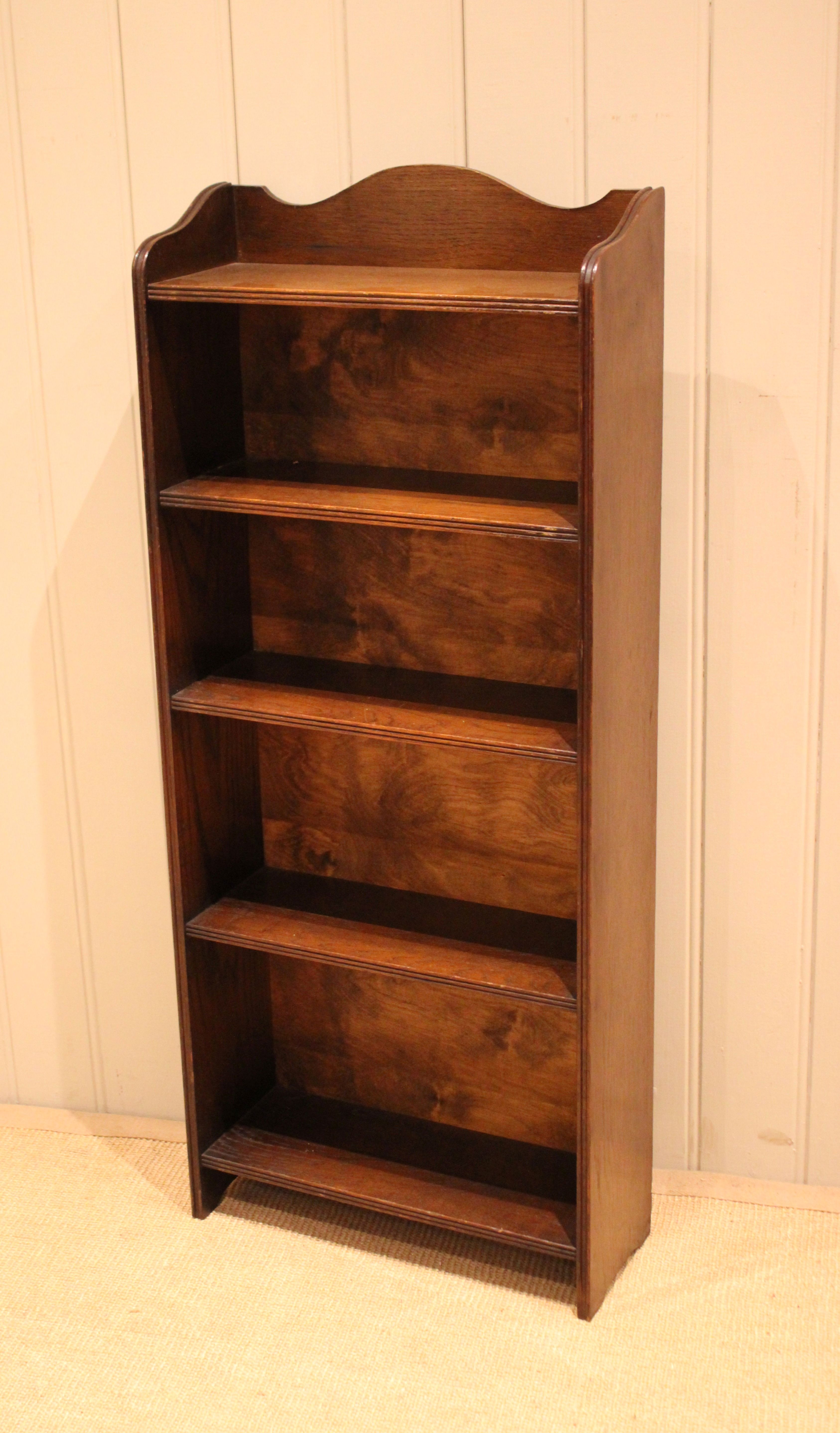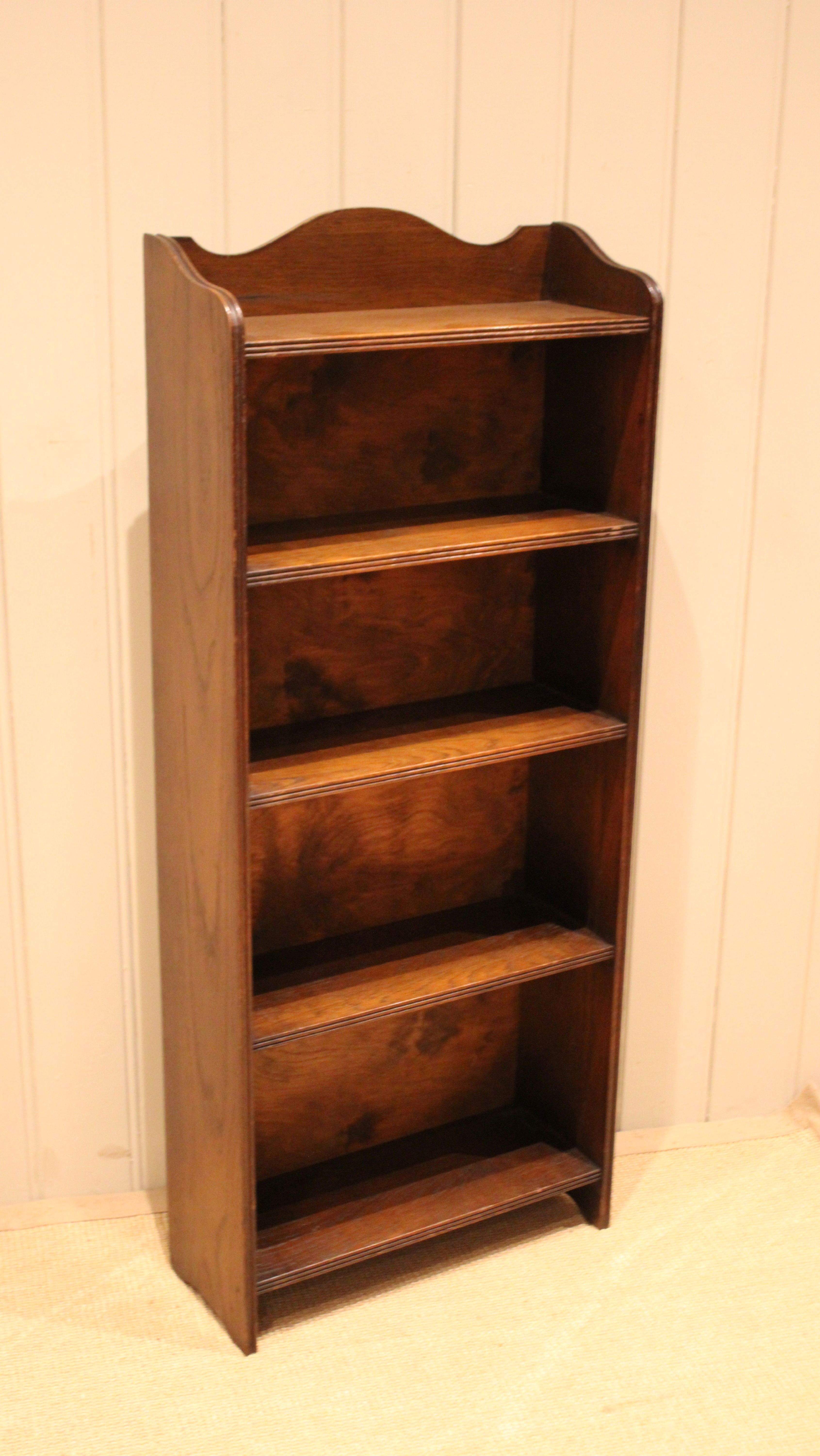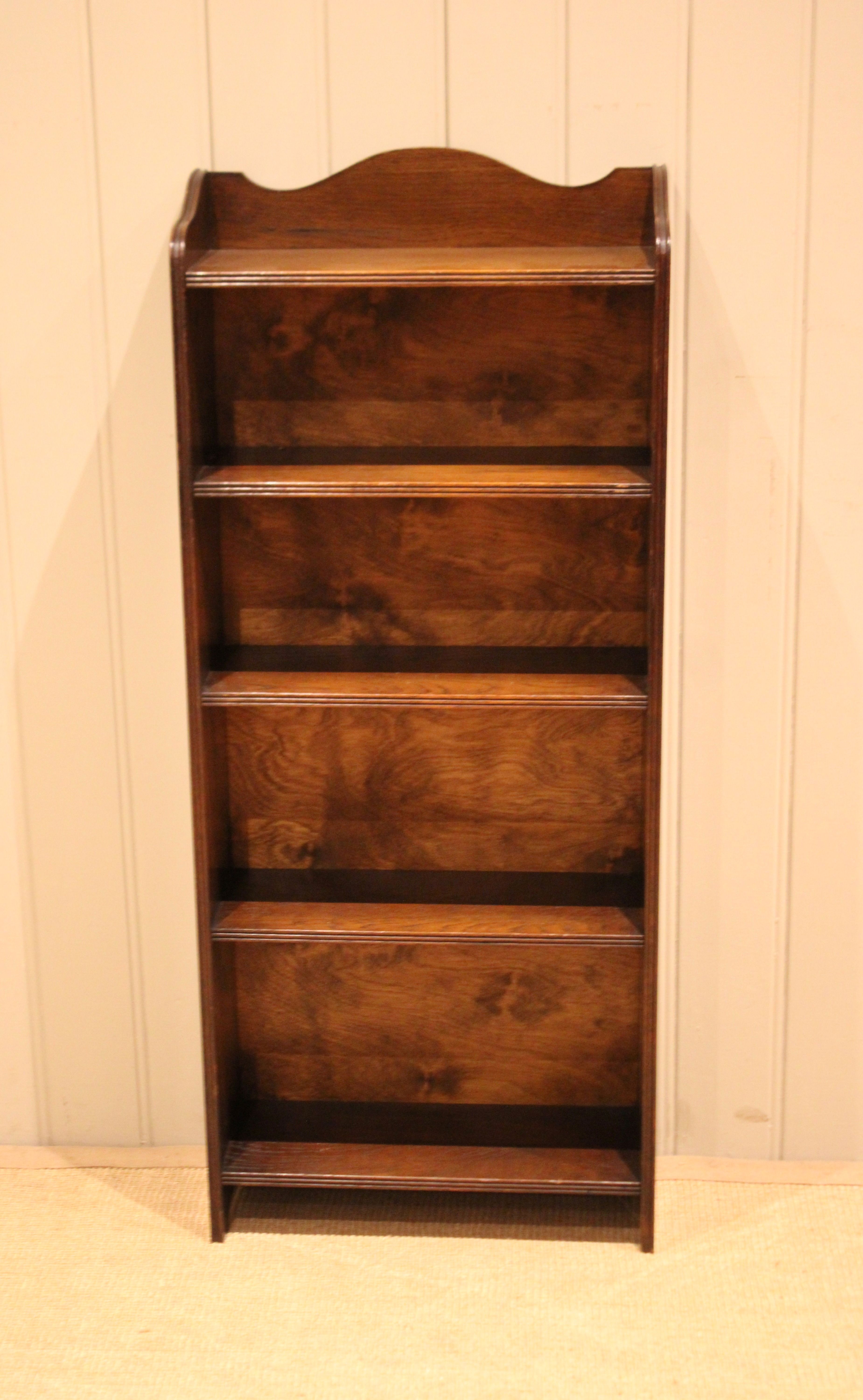 Oak open bookcase having four fixed shelves with reeded edges , raised on straight supports. The internal shelf dimensions are 42.5 cm wide x 16.5 cm deep and from the bottom upwards 25cm high , 22.5m high , 19cm high and 18 cm high