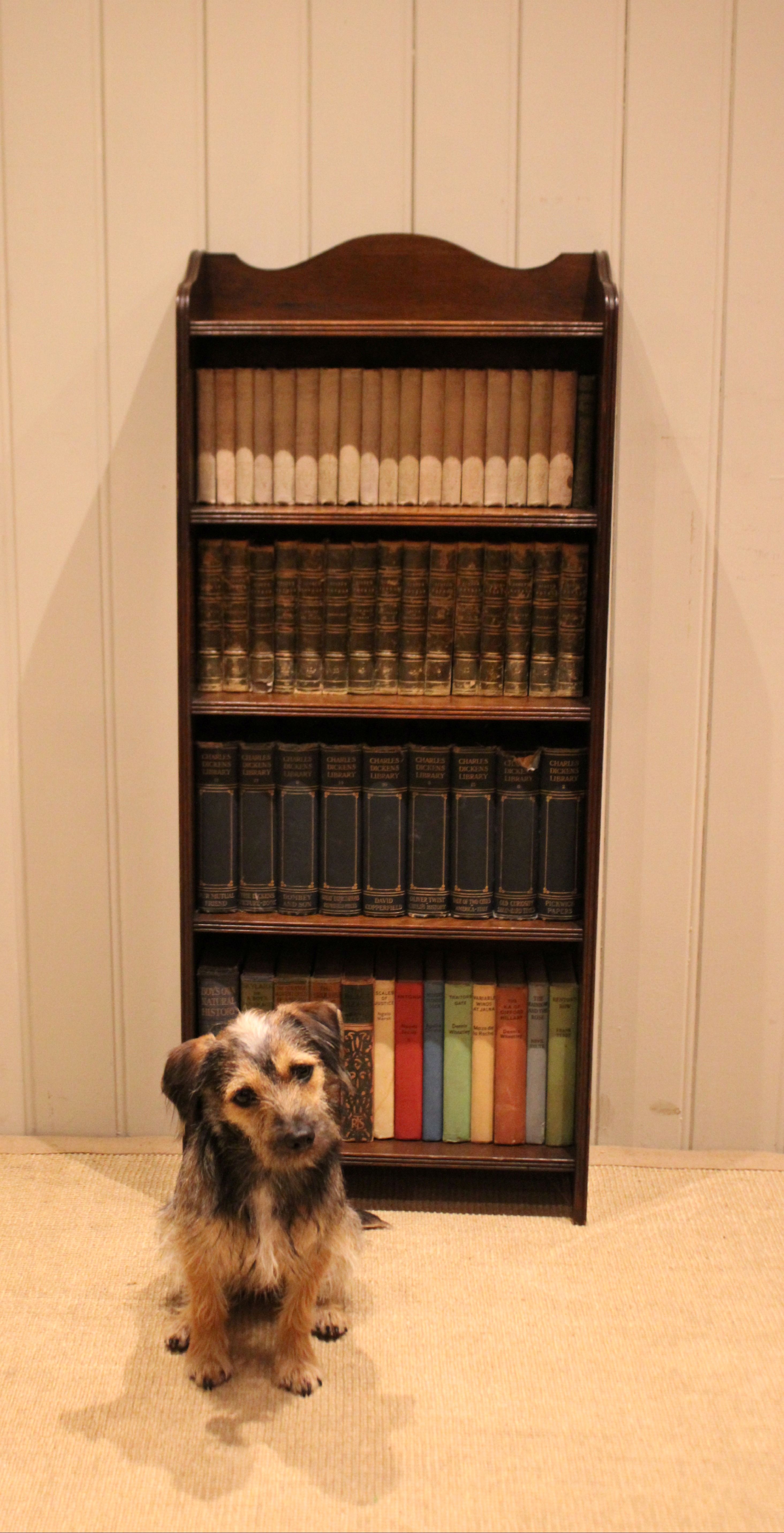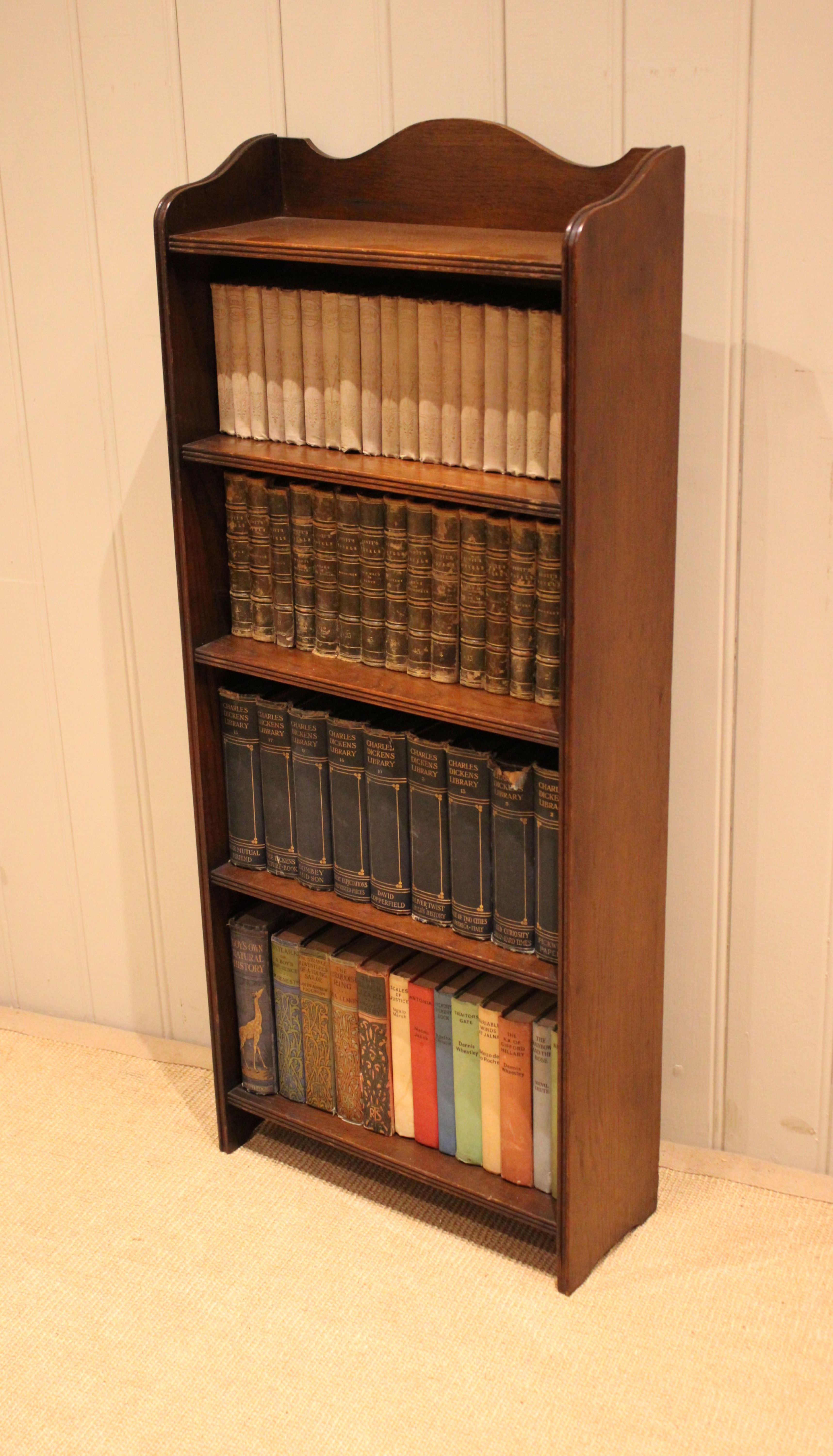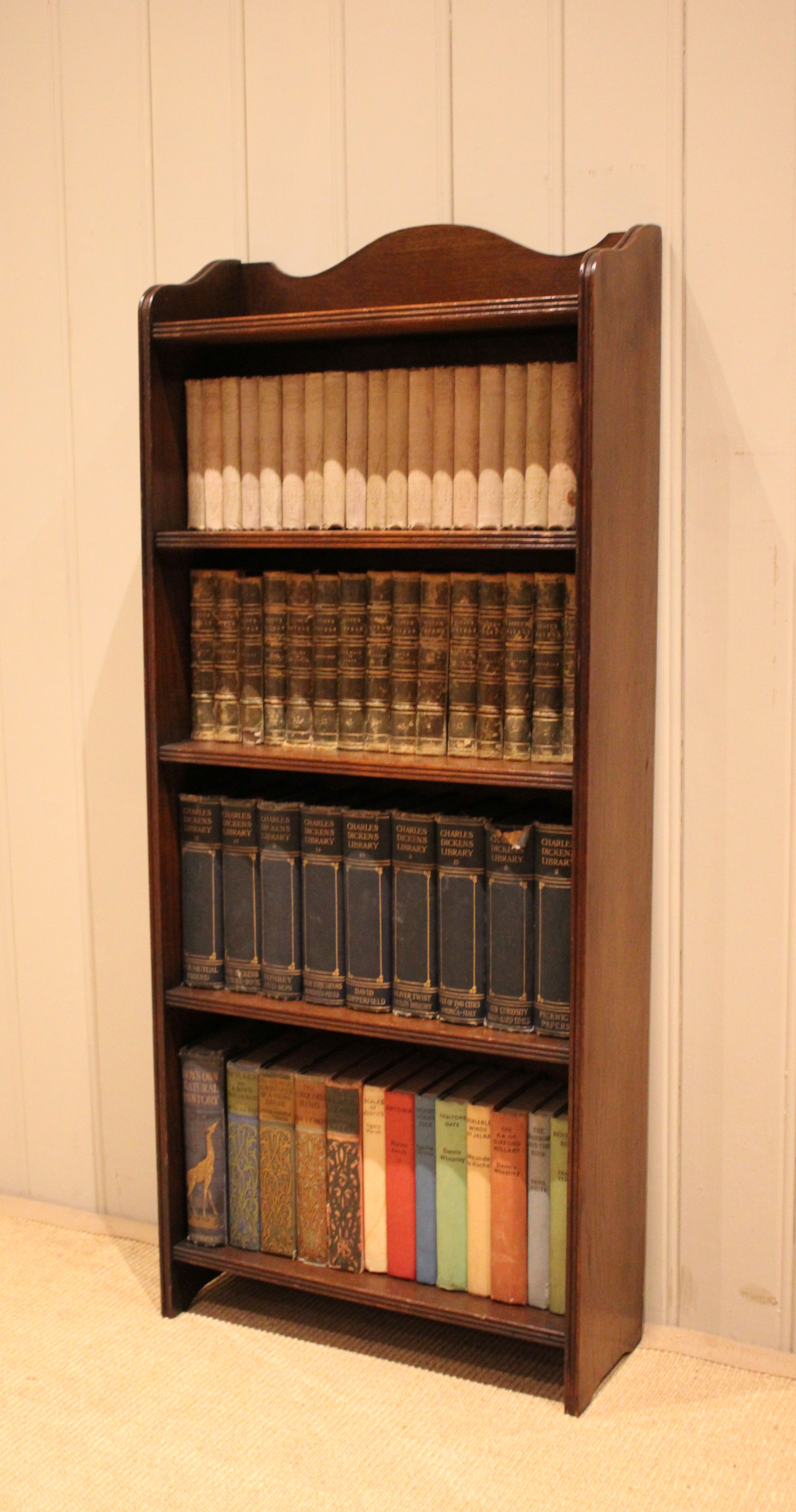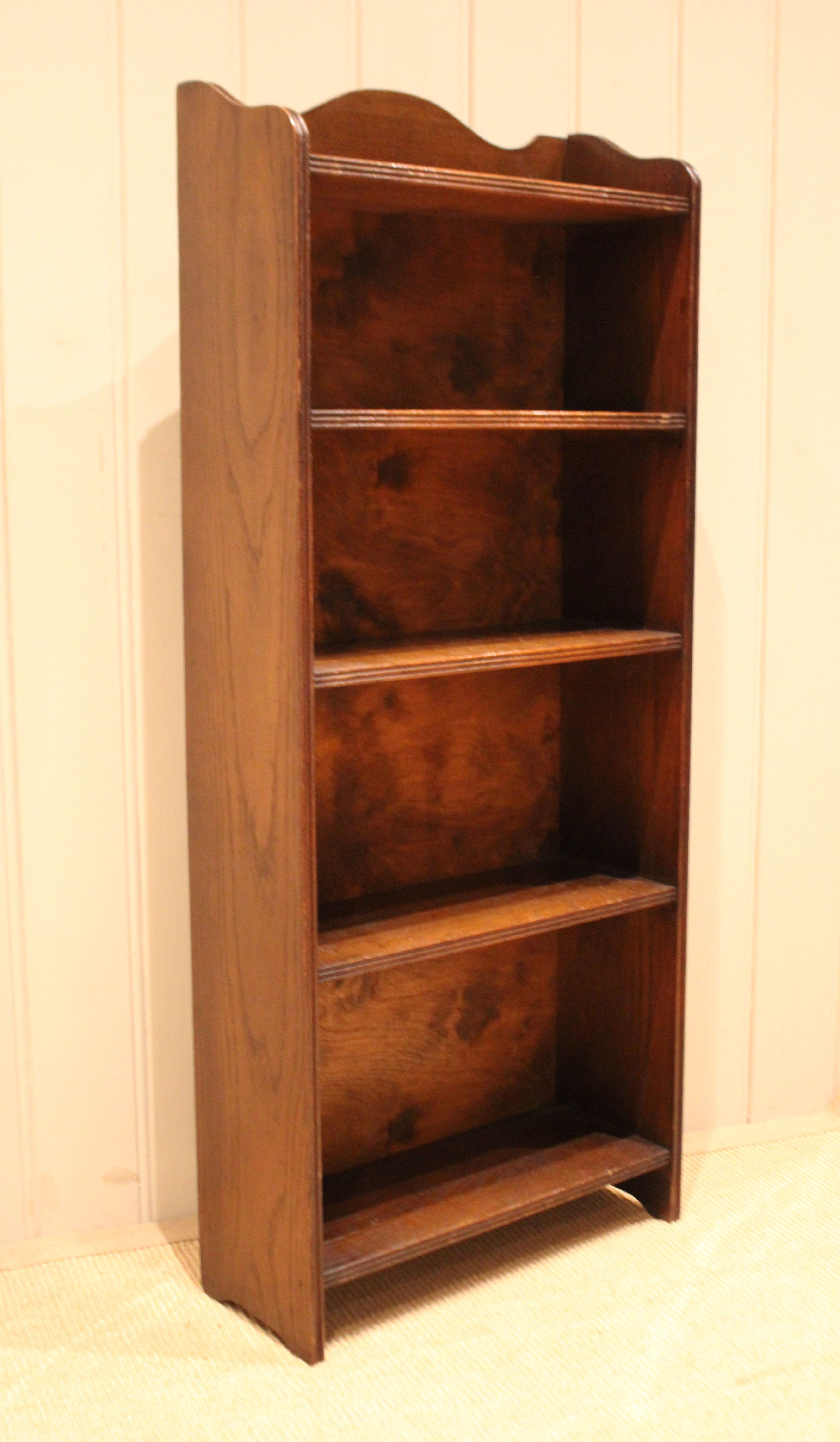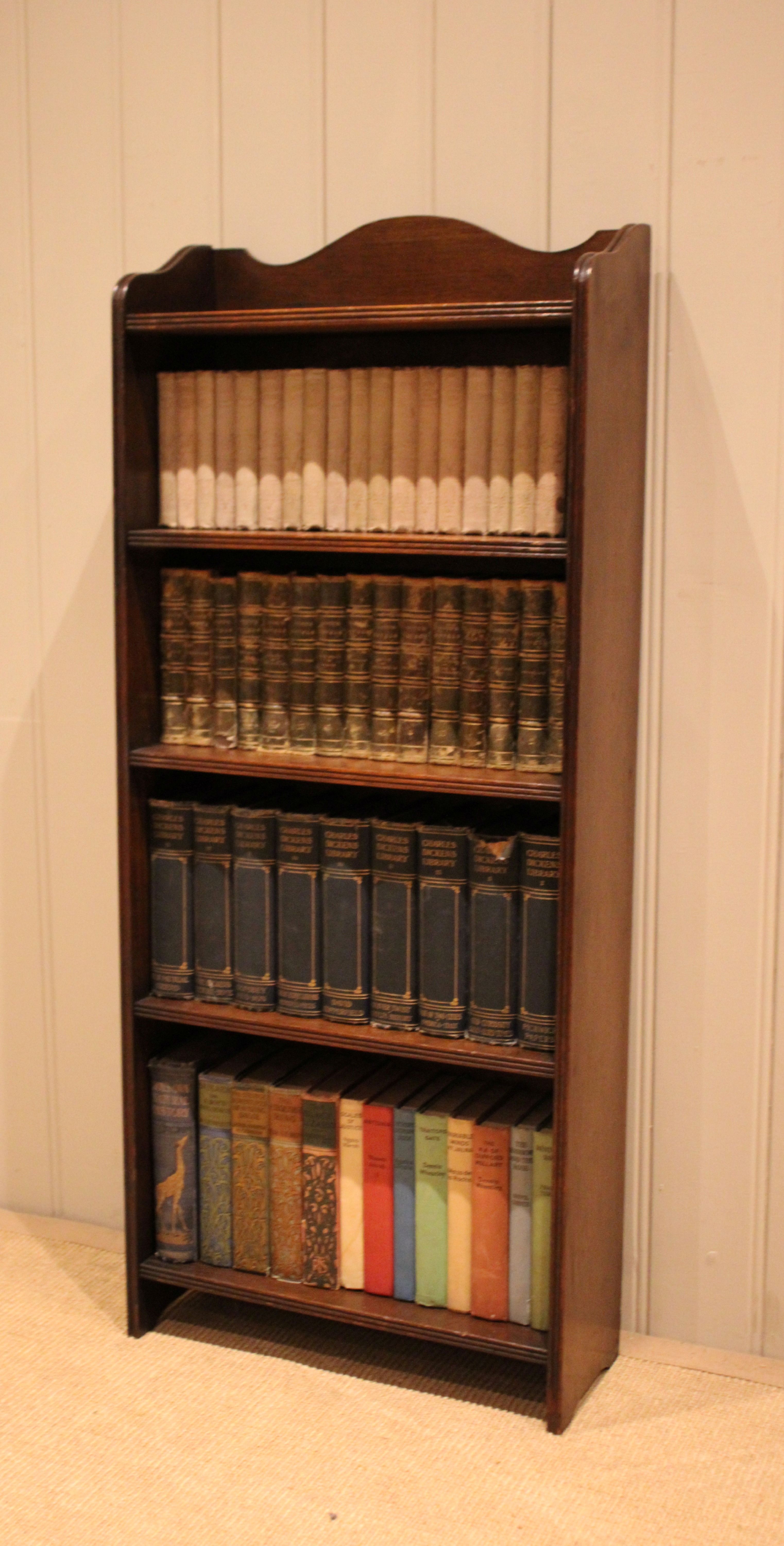 Oak open bookcase having four fixed shelves with reeded edges , raised on straight supports. The internal shelf dimensions are 42.5 cm wide x 16.5 cm deep and from the bottom upwards 25cm high , 22.5m high , 19cm high and 18 cm high