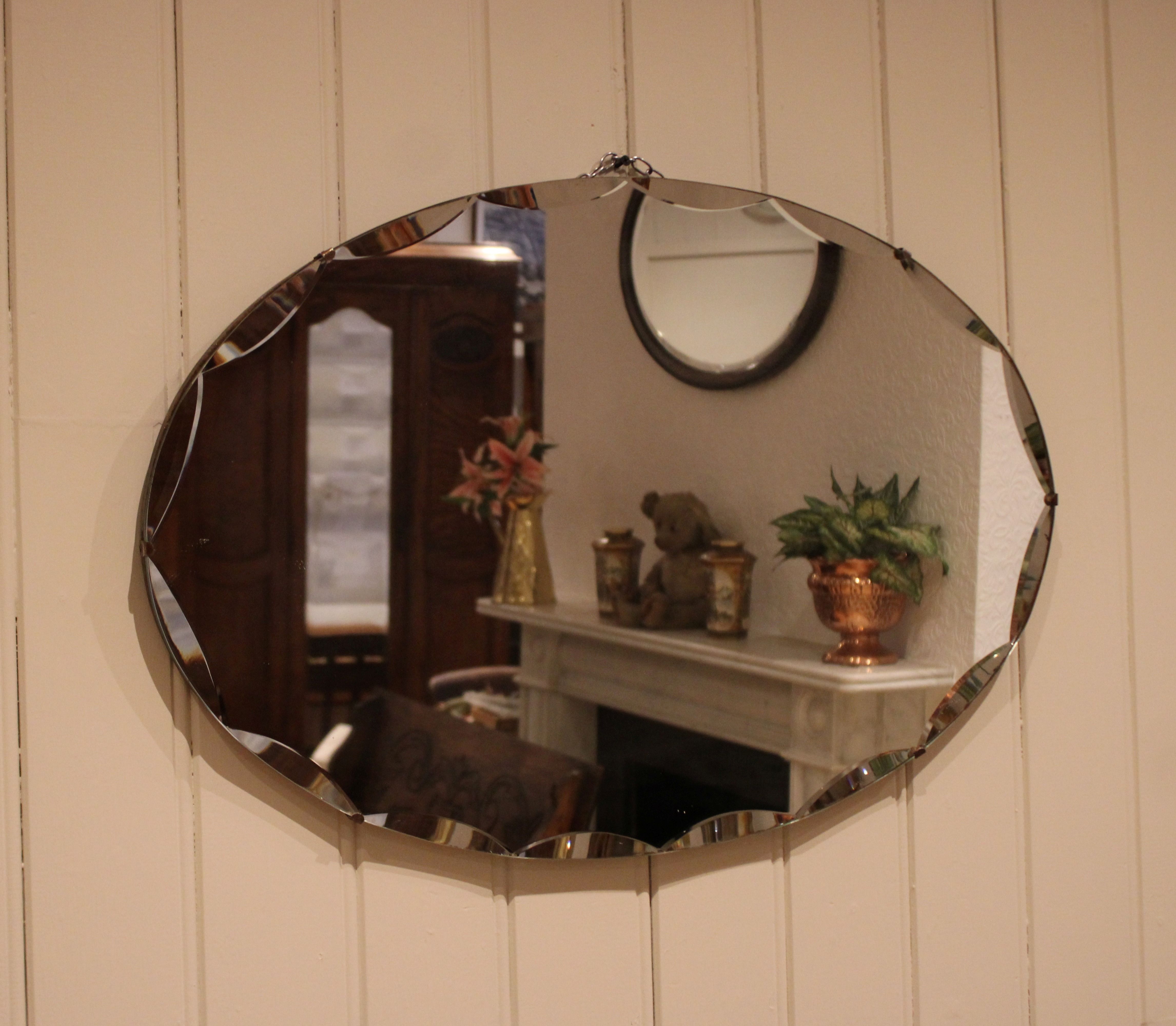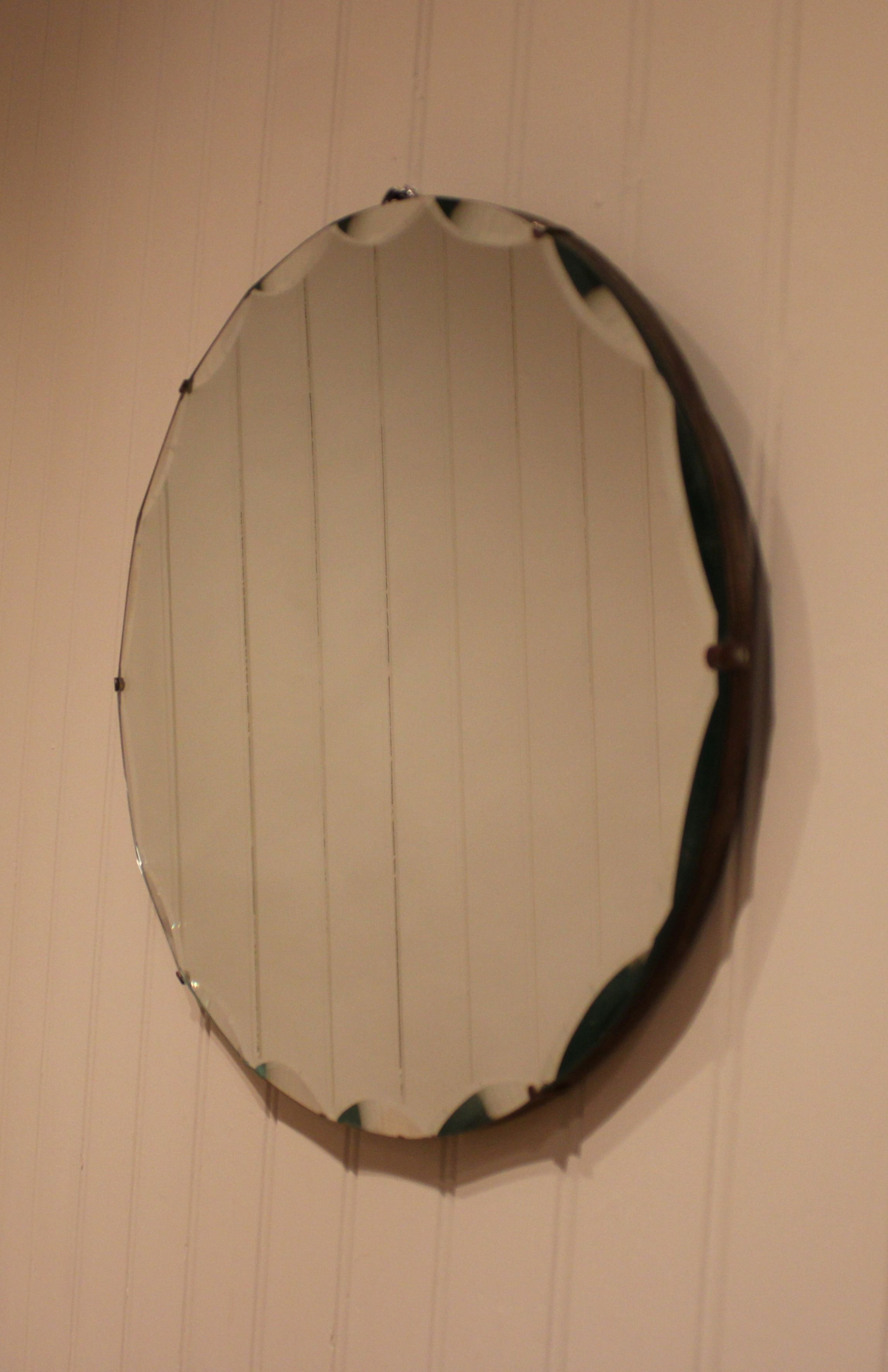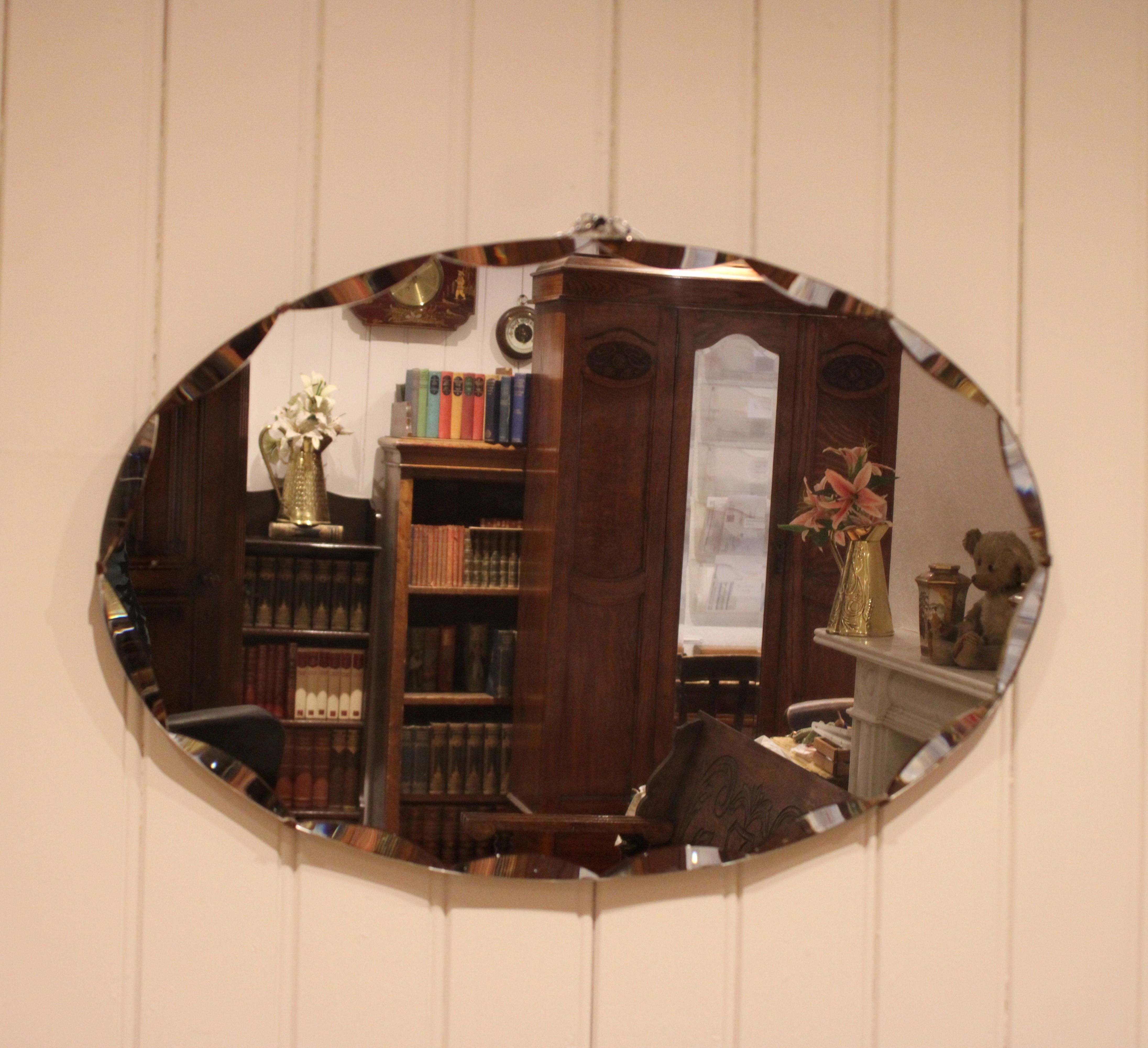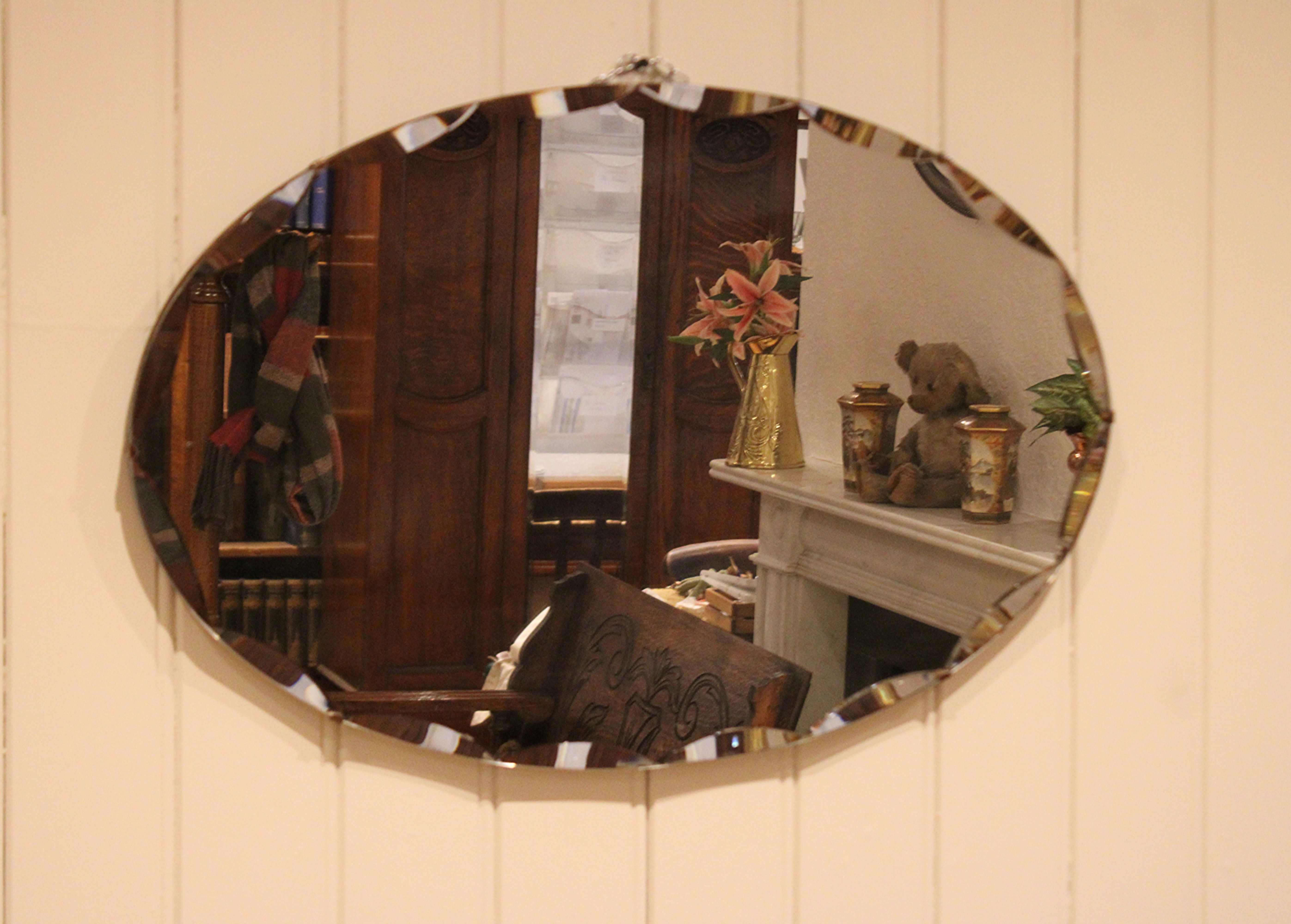 Oval frameless cut glass wall mirror having bevelled and etched edges .