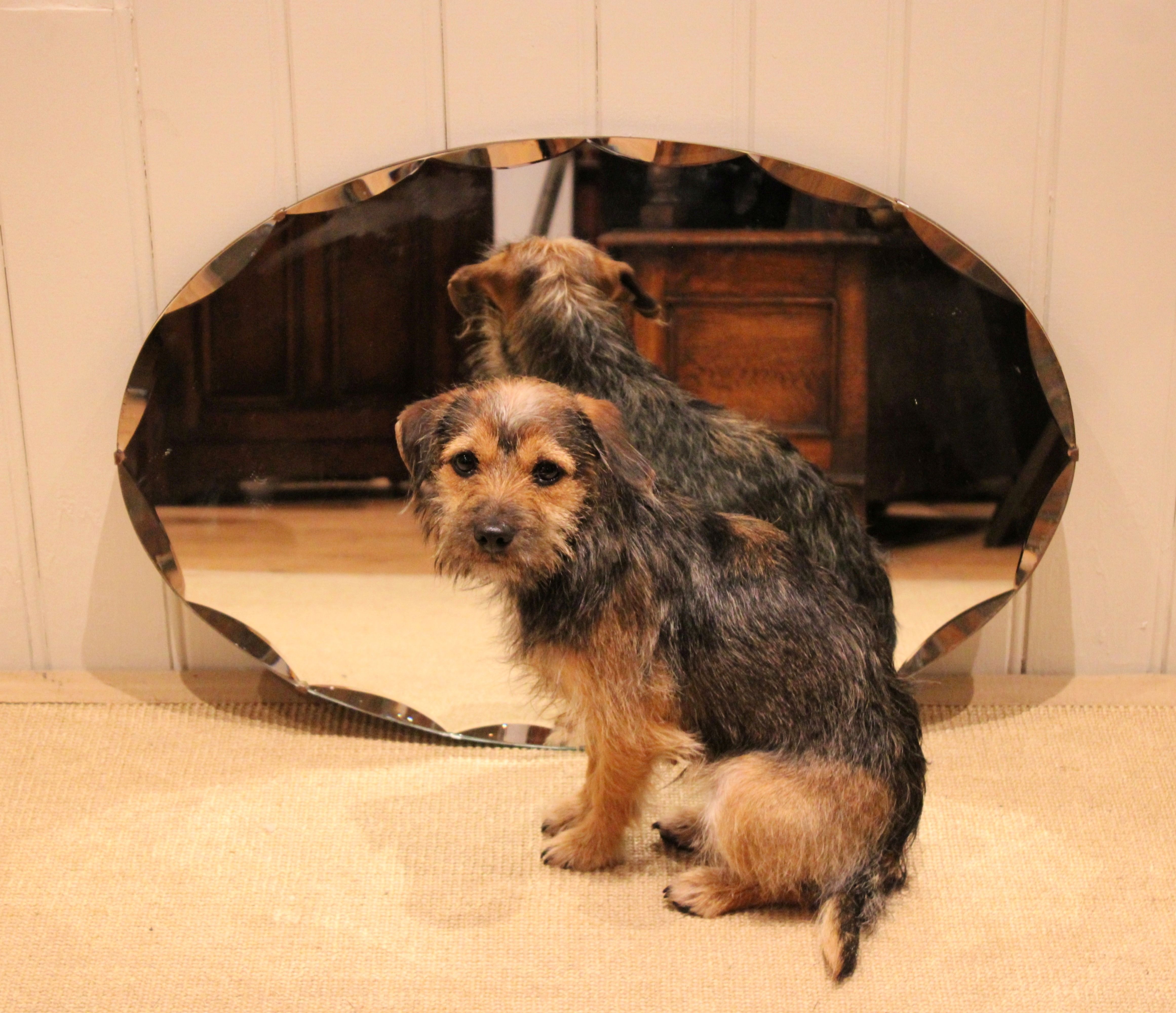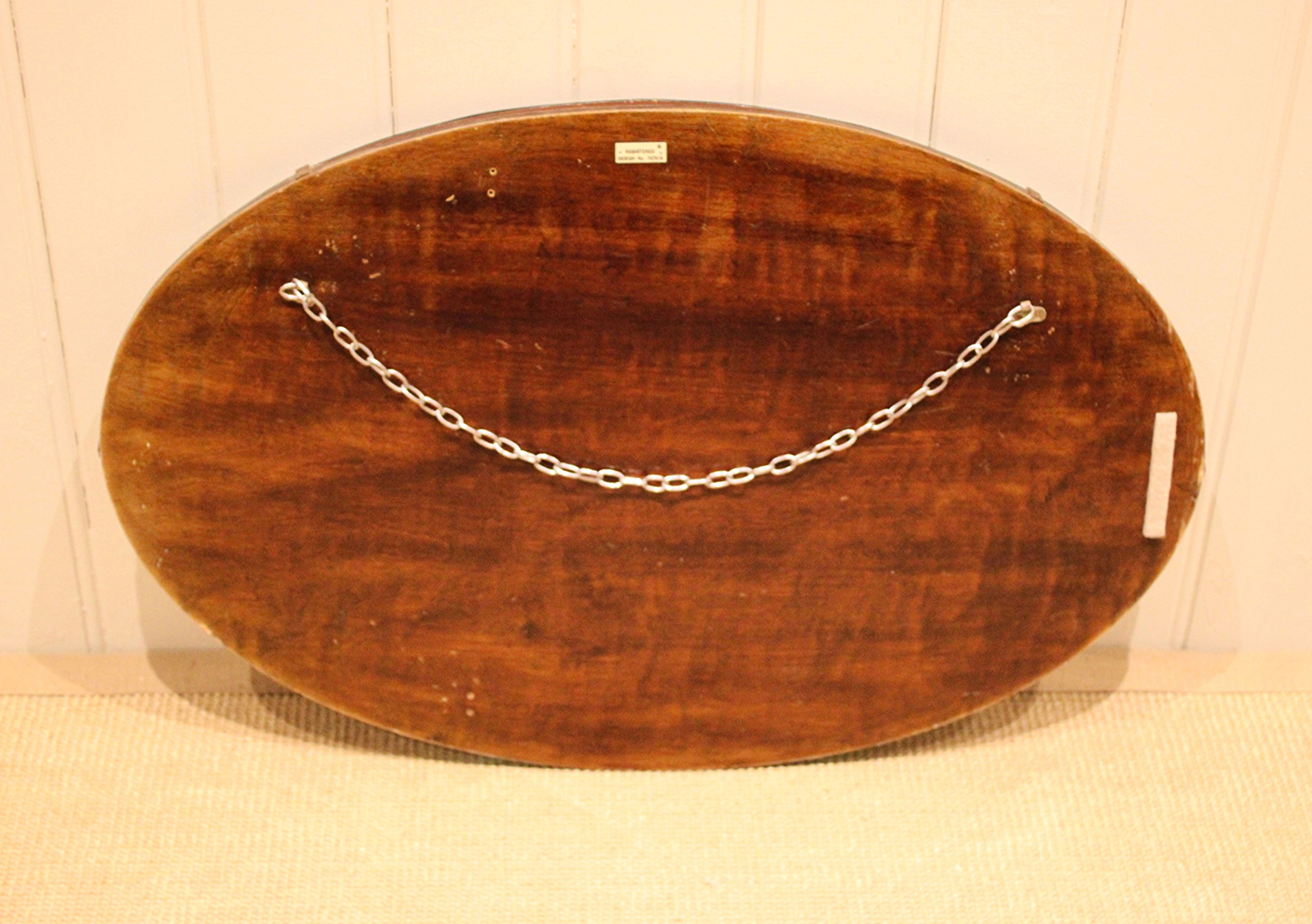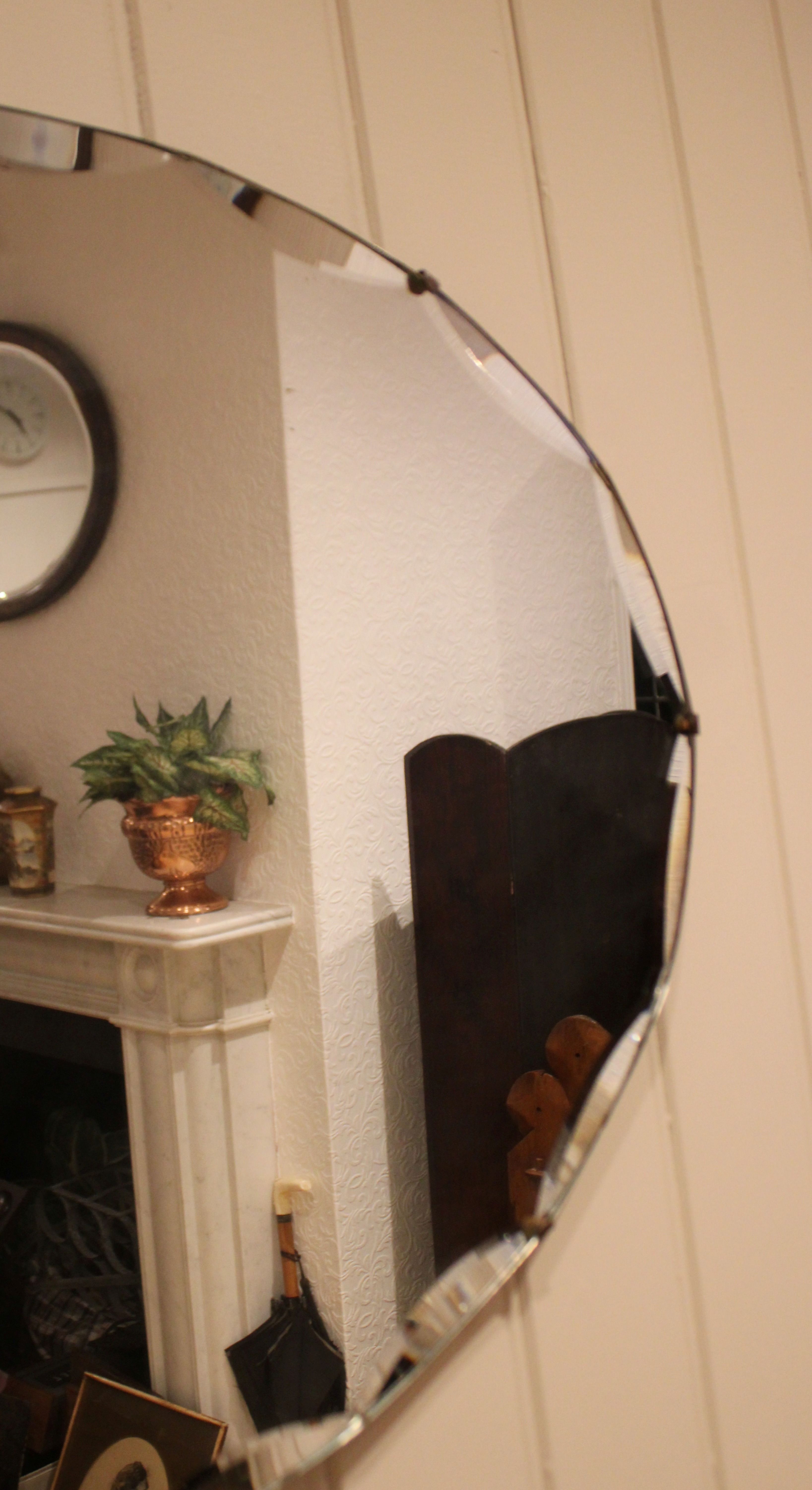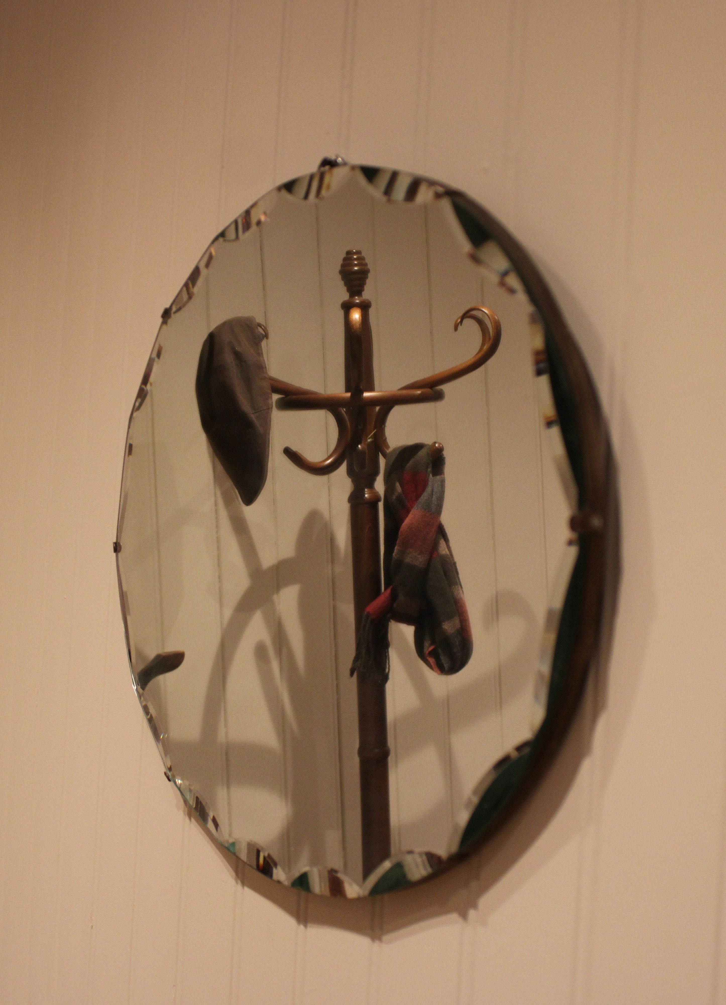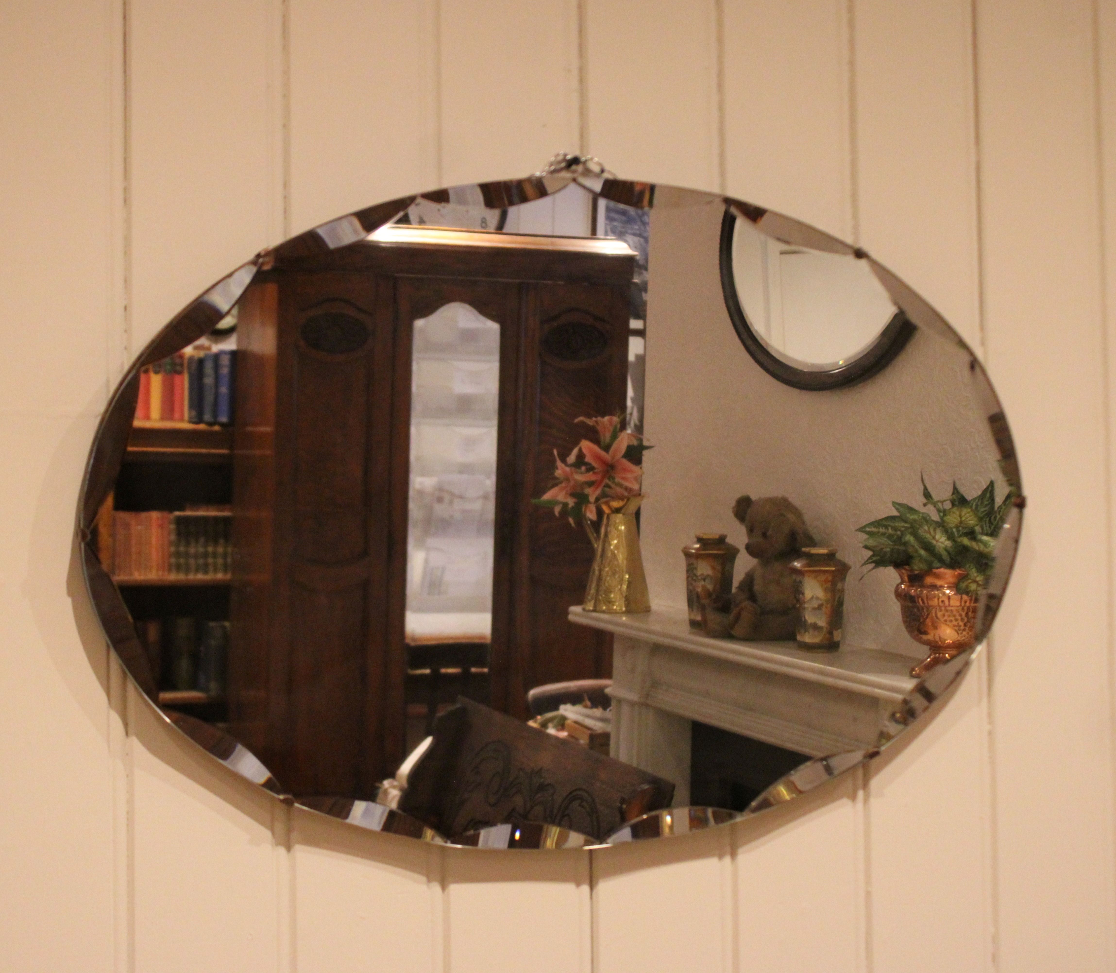 Oval frameless cut glass wall mirror having bevelled and etched edges .