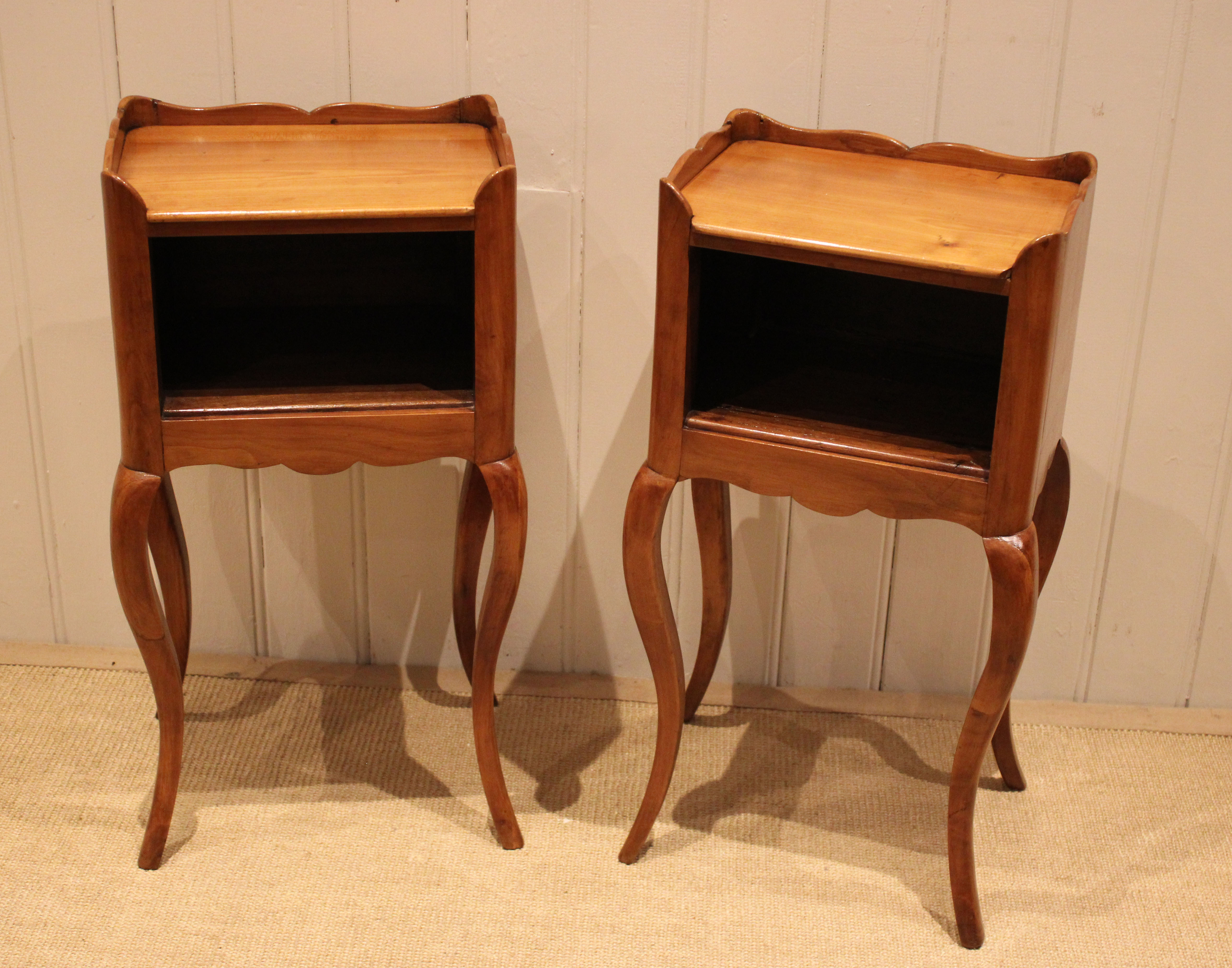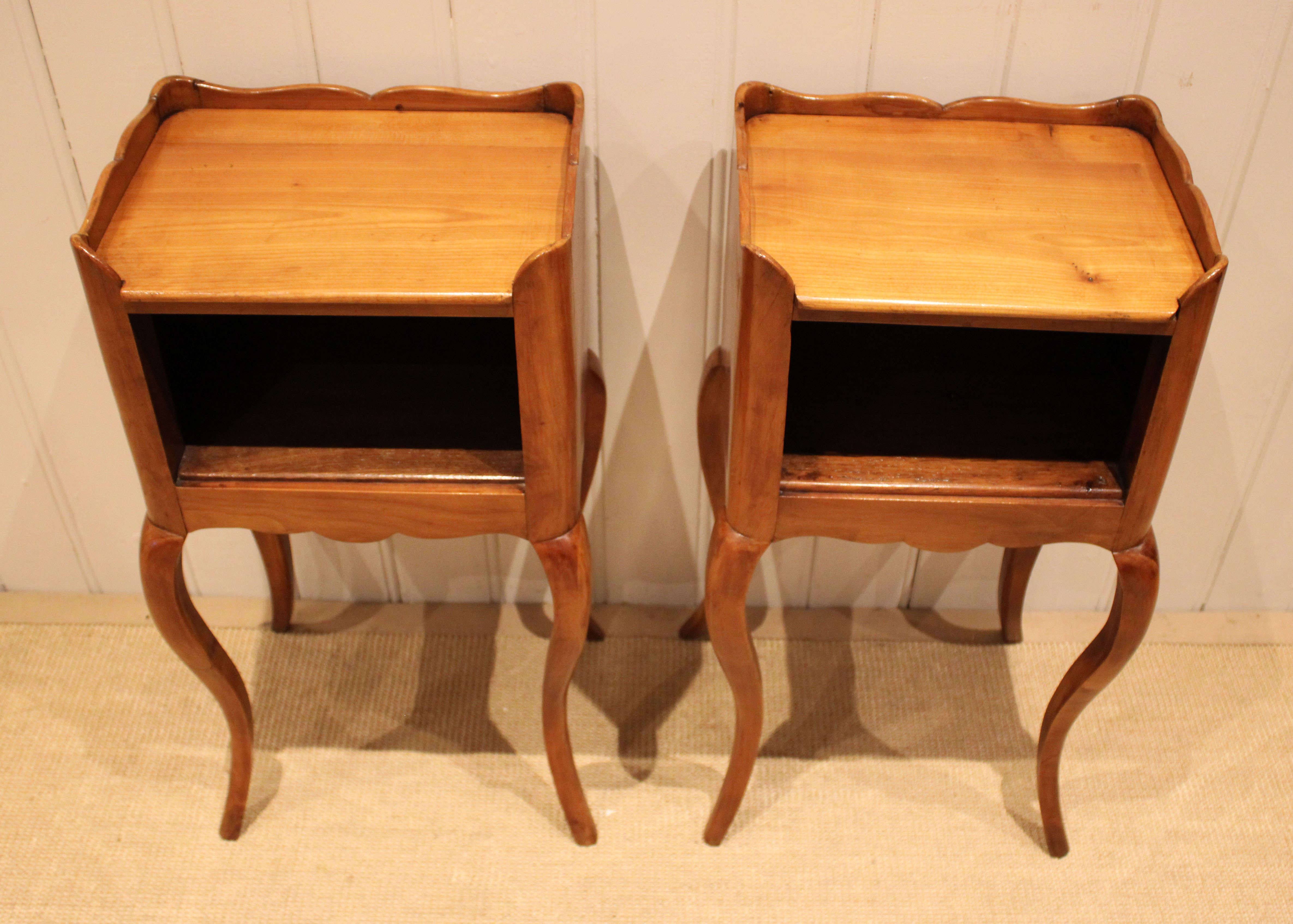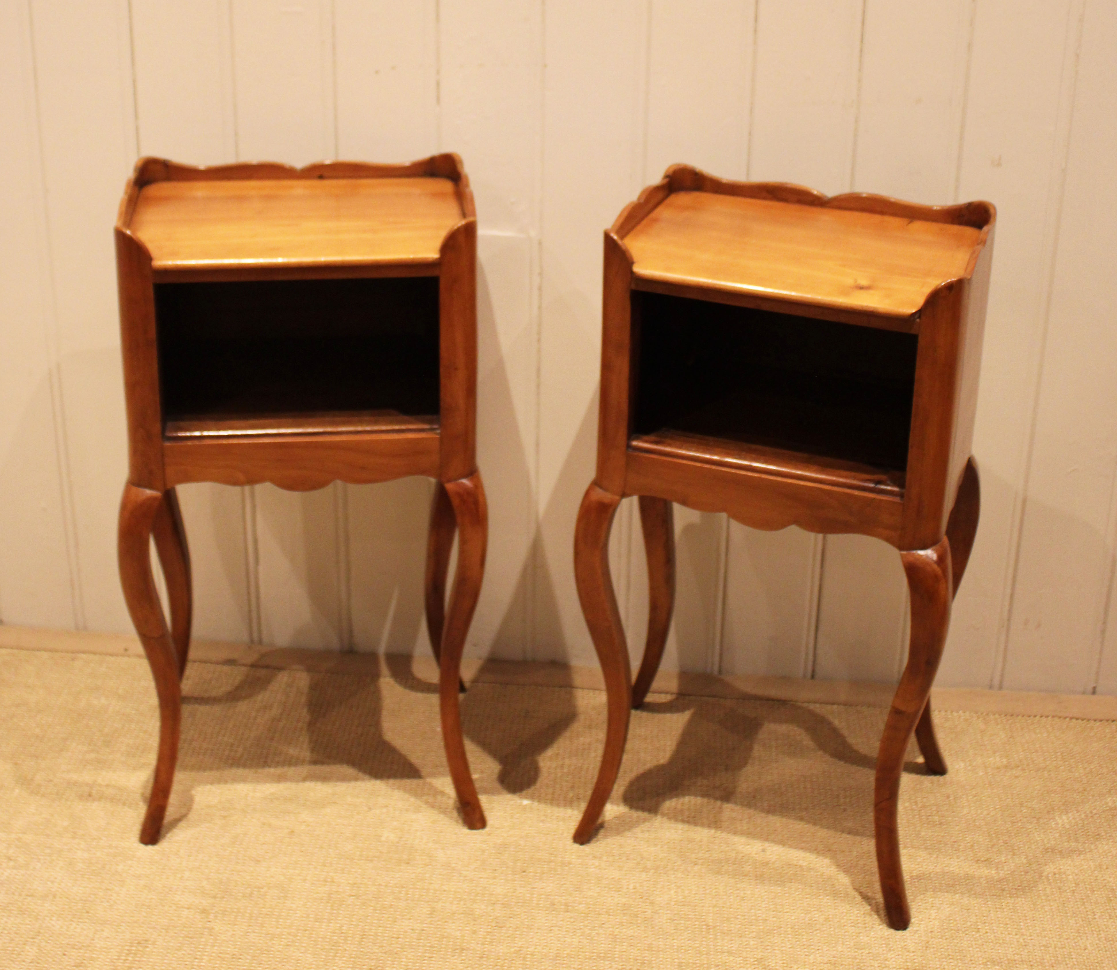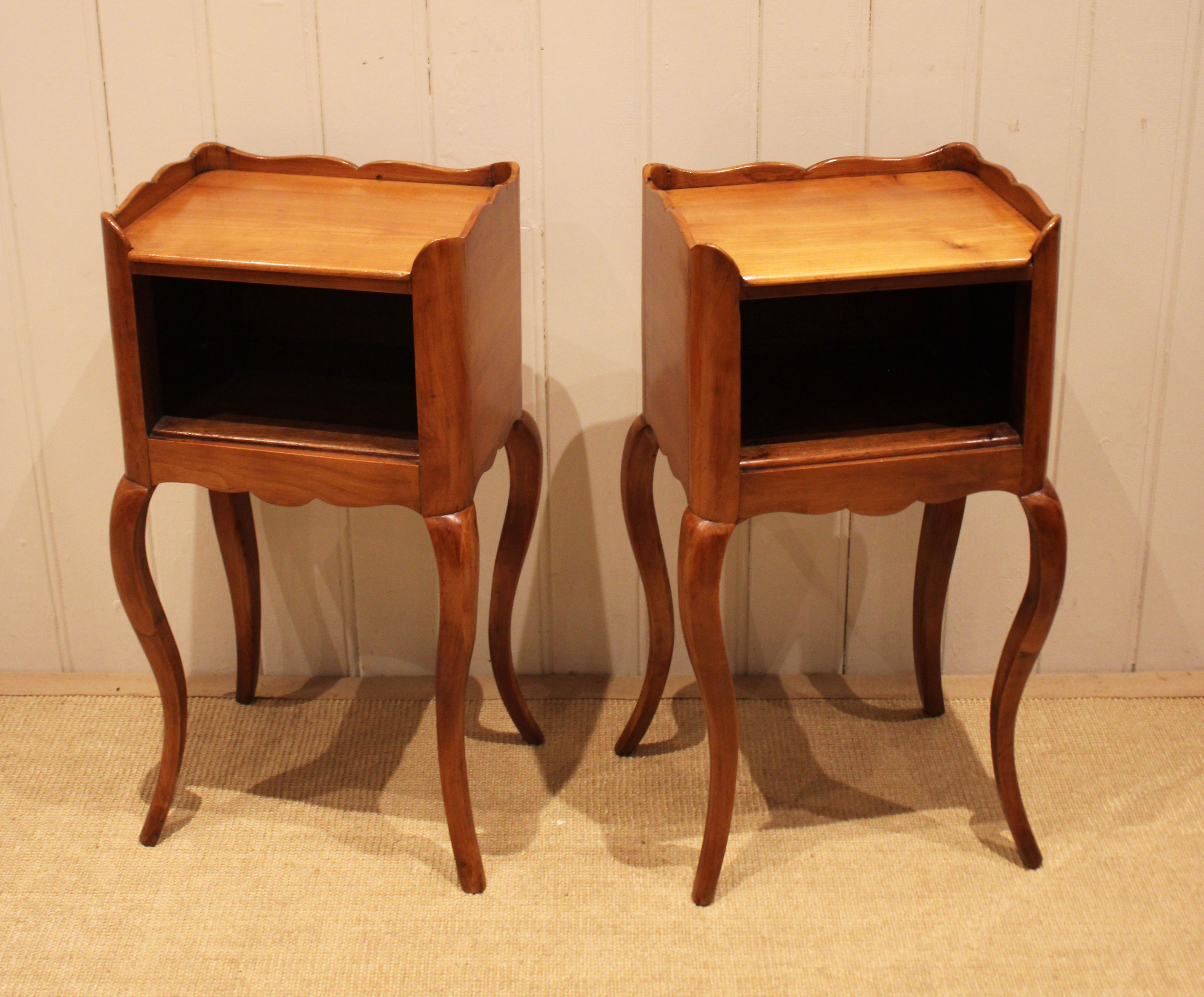 Pair of French cherry wood bedside cabinets having an open cupboard , raised on cabriole legs .