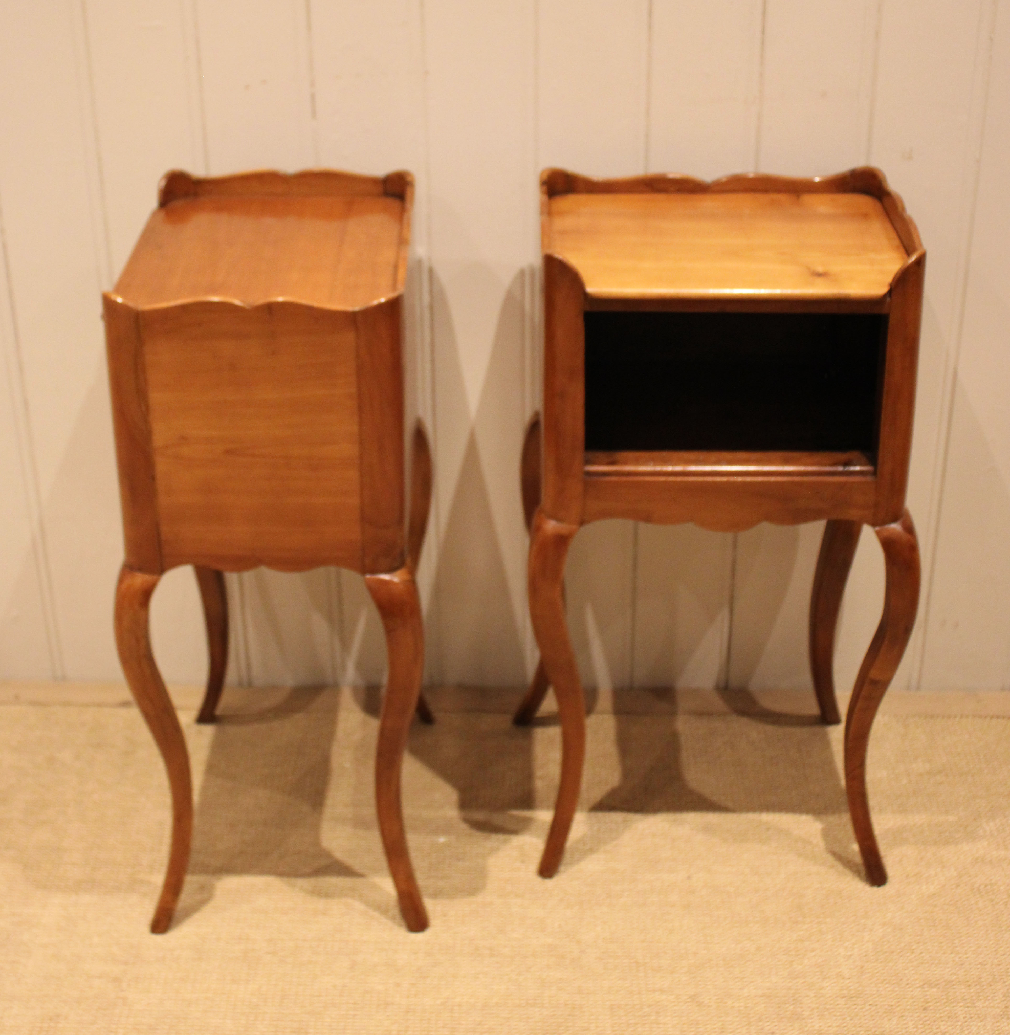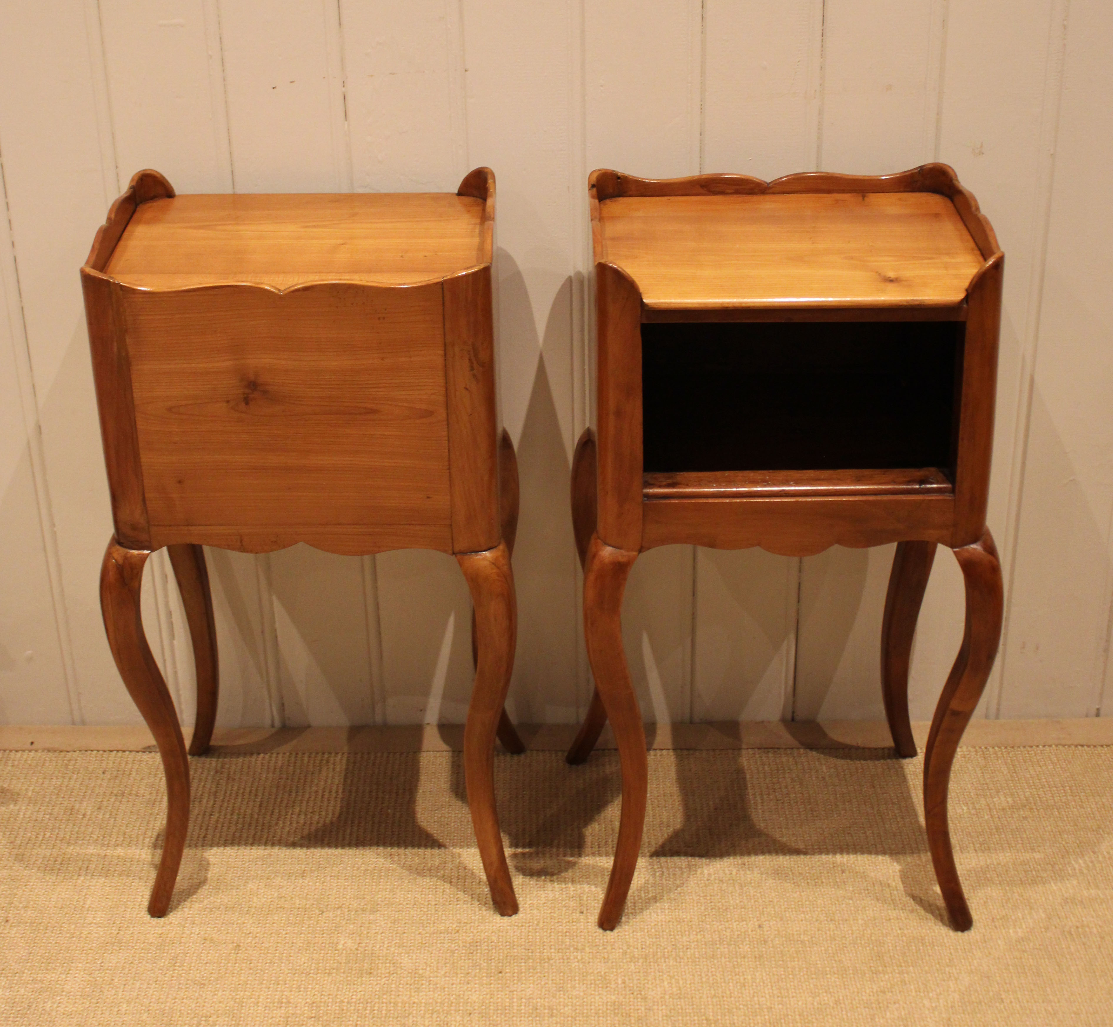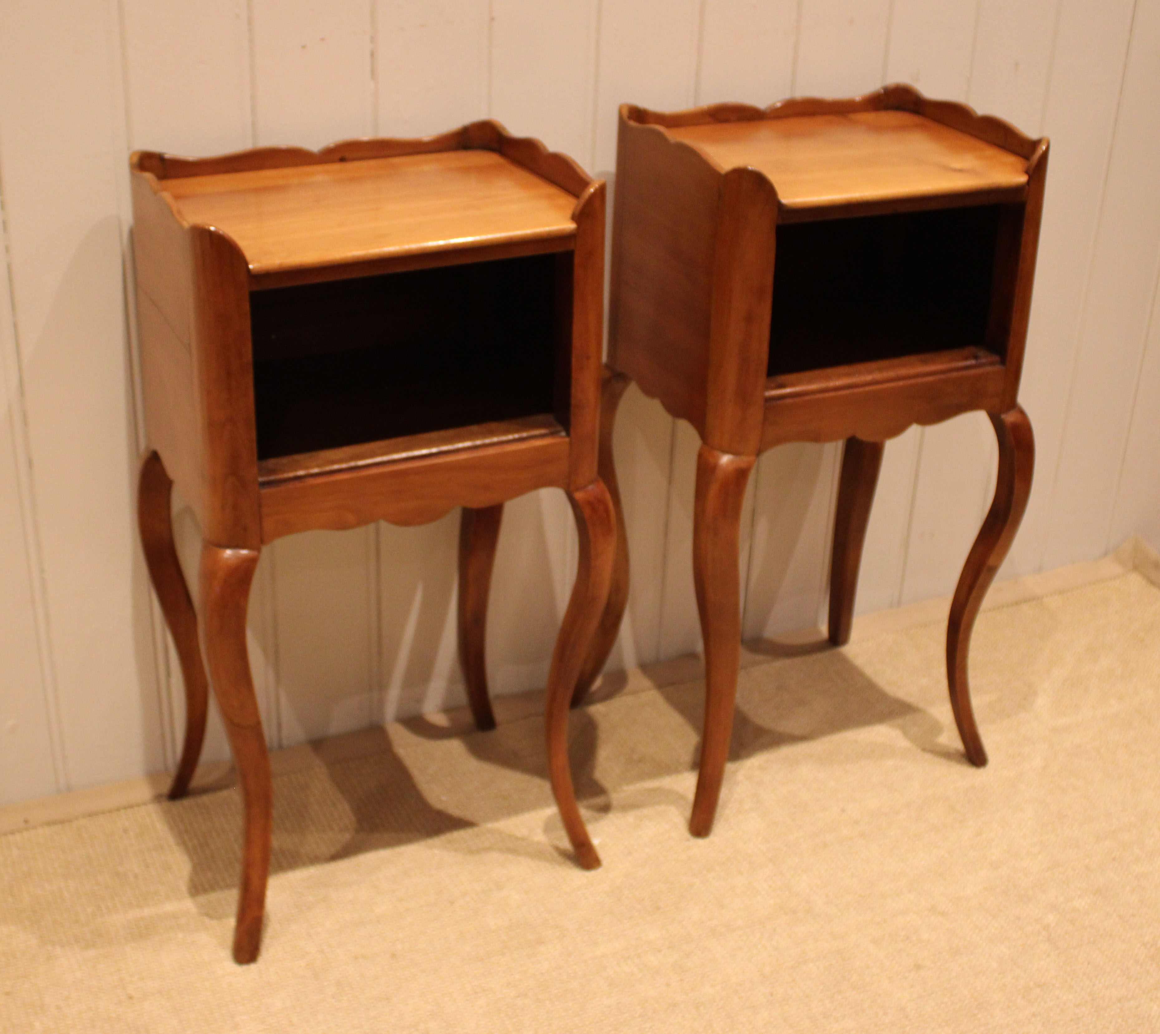 Pair of French cherry wood bedside cabinets having an open cupboard , raised on cabriole legs .