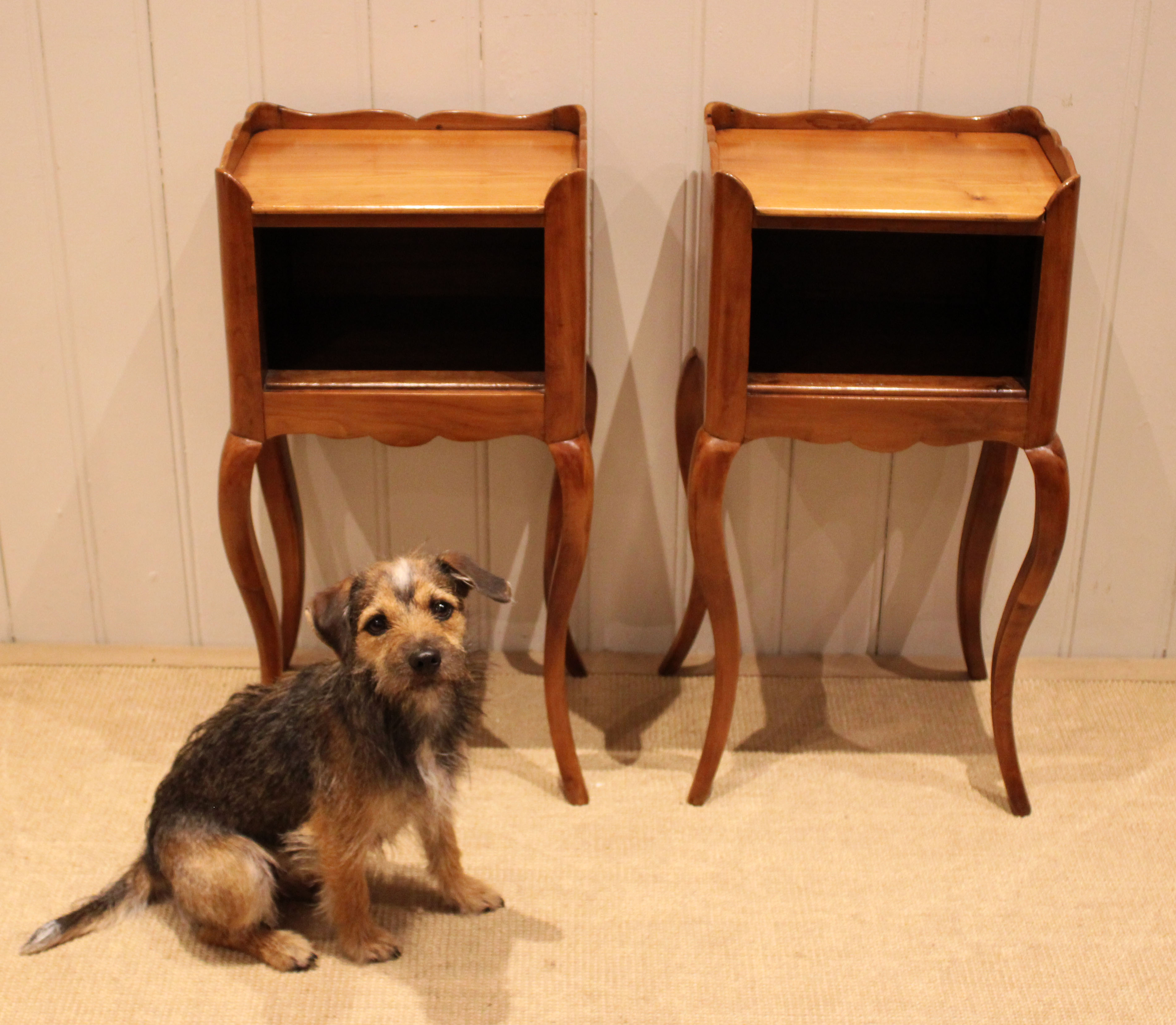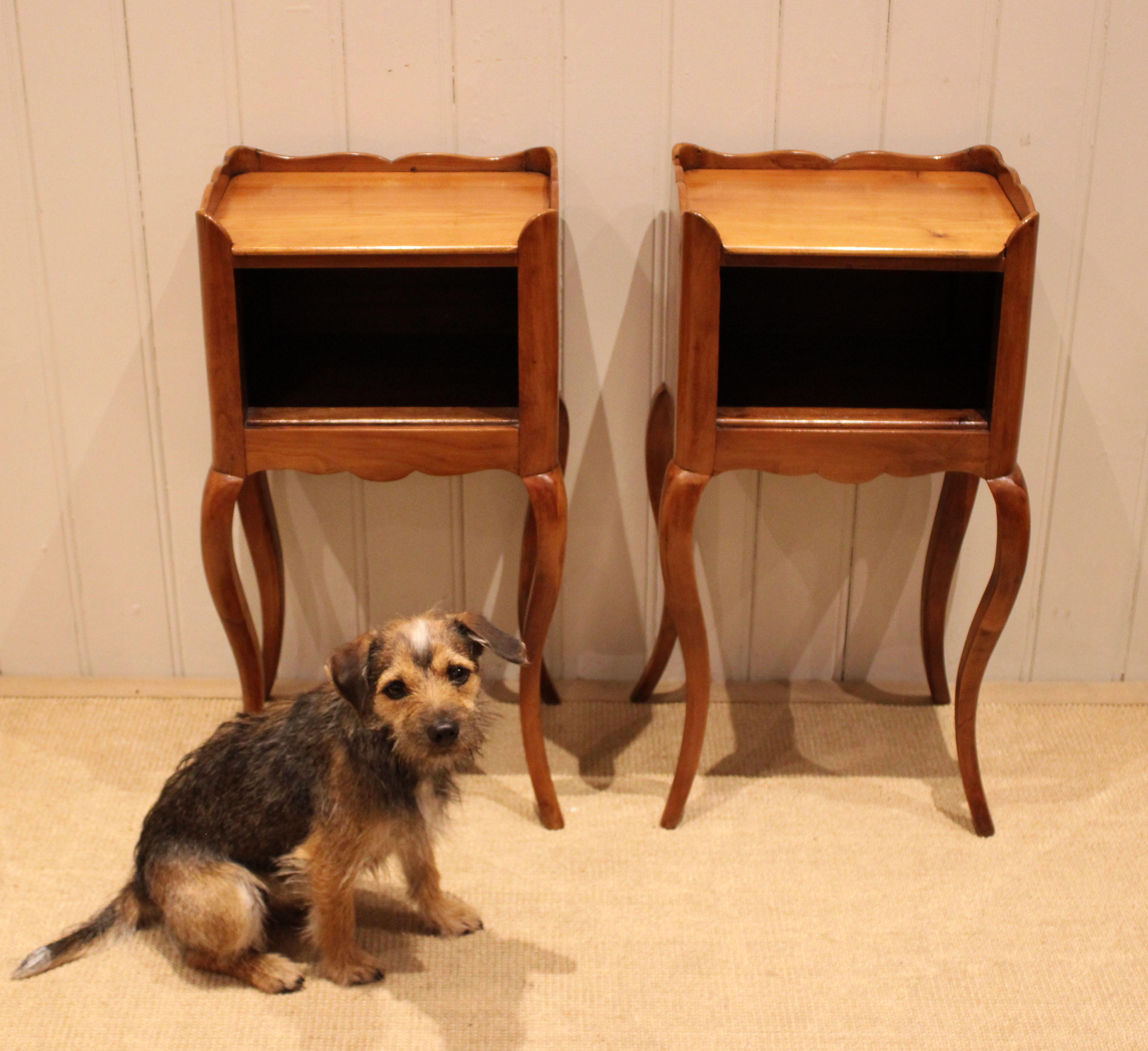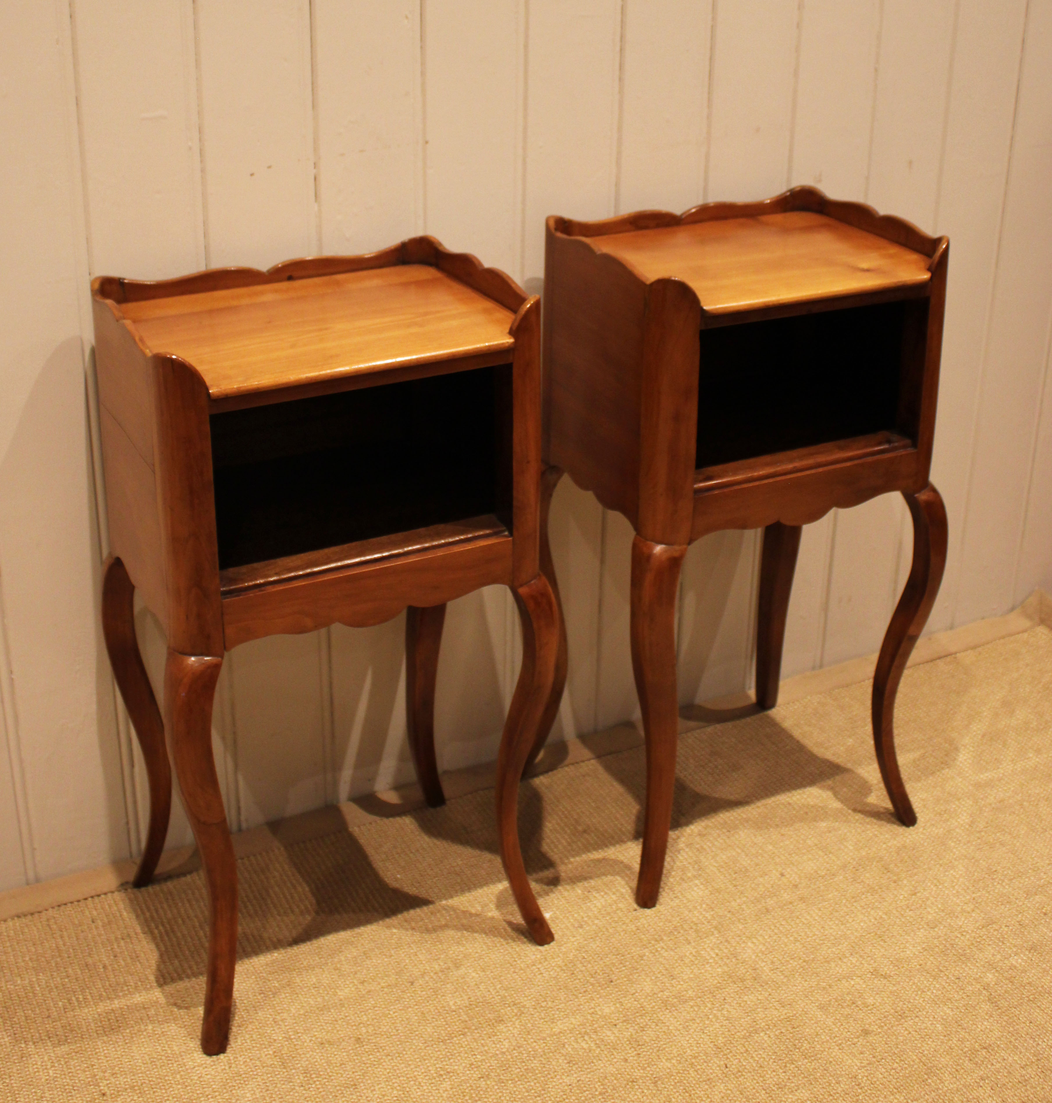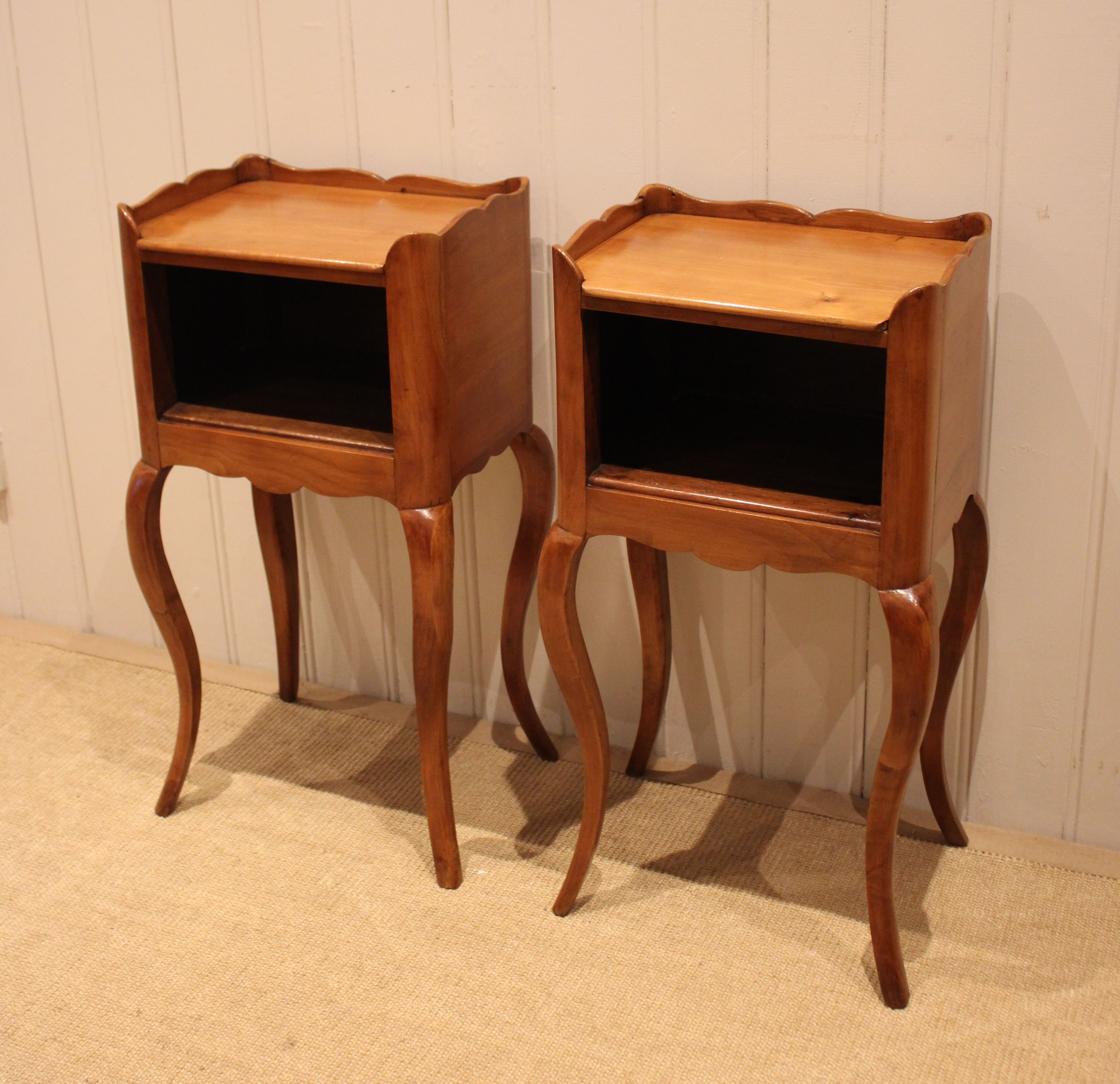 Pair of French cherry wood bedside cabinets having an open cupboard , raised on cabriole legs .