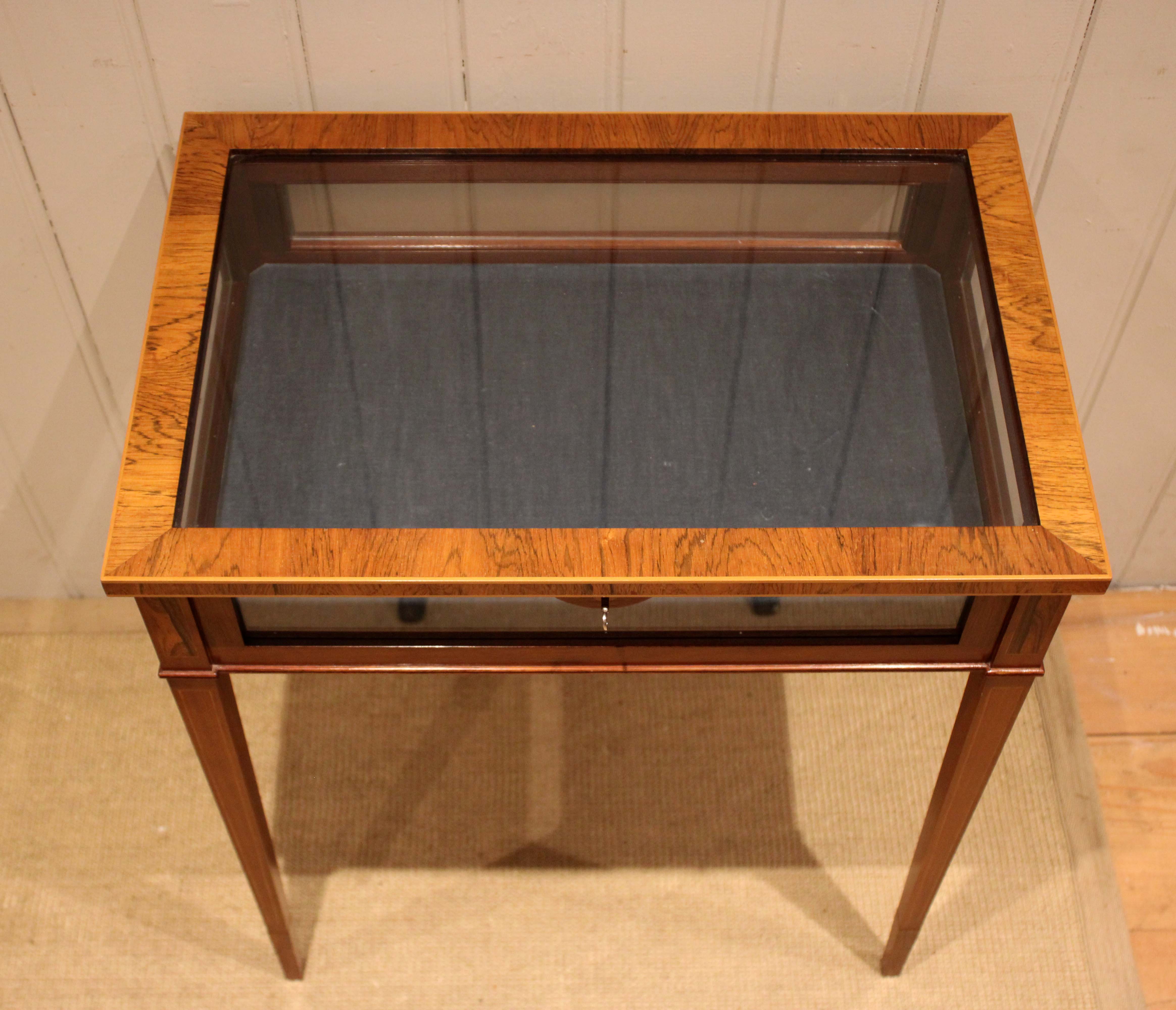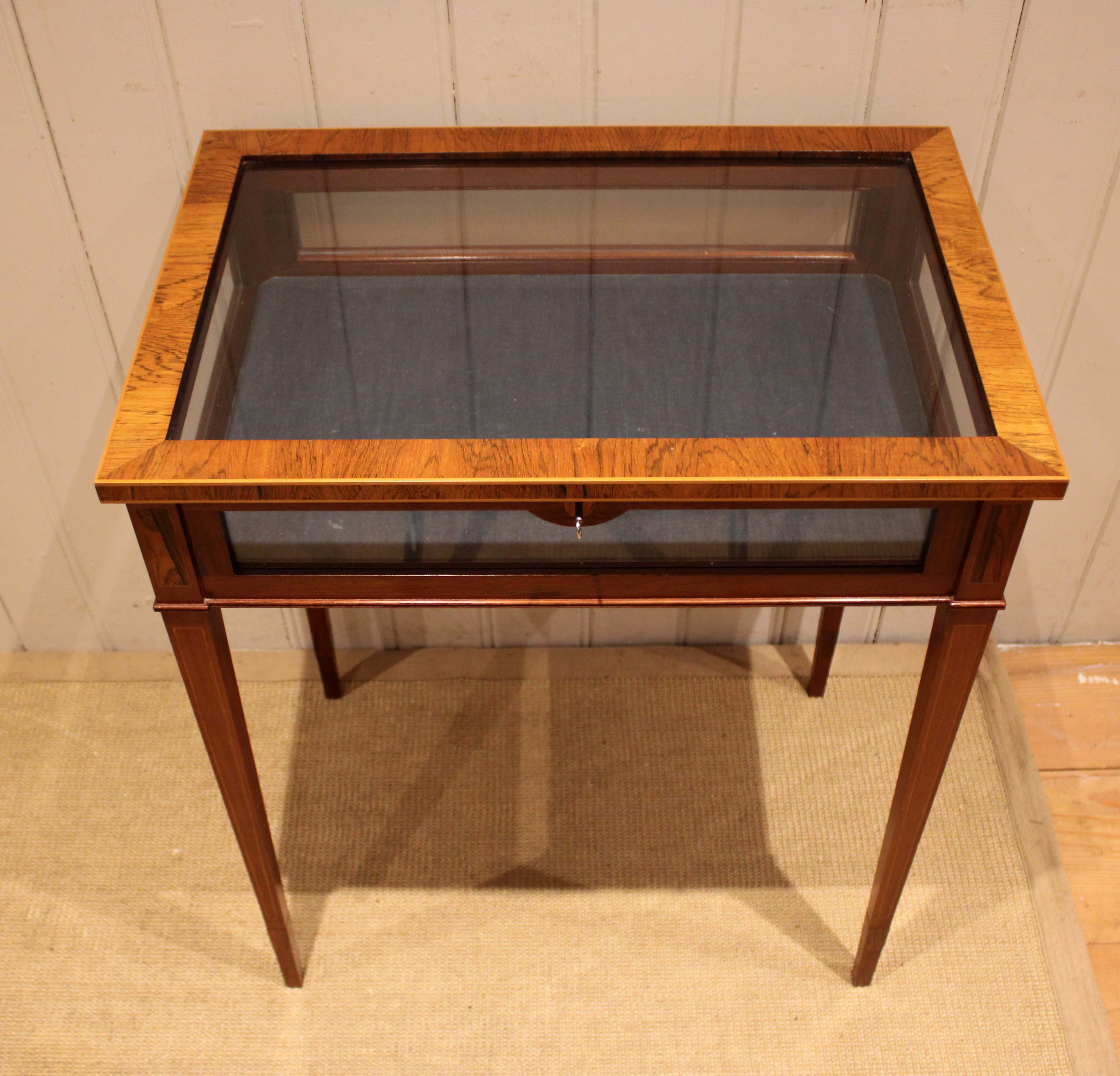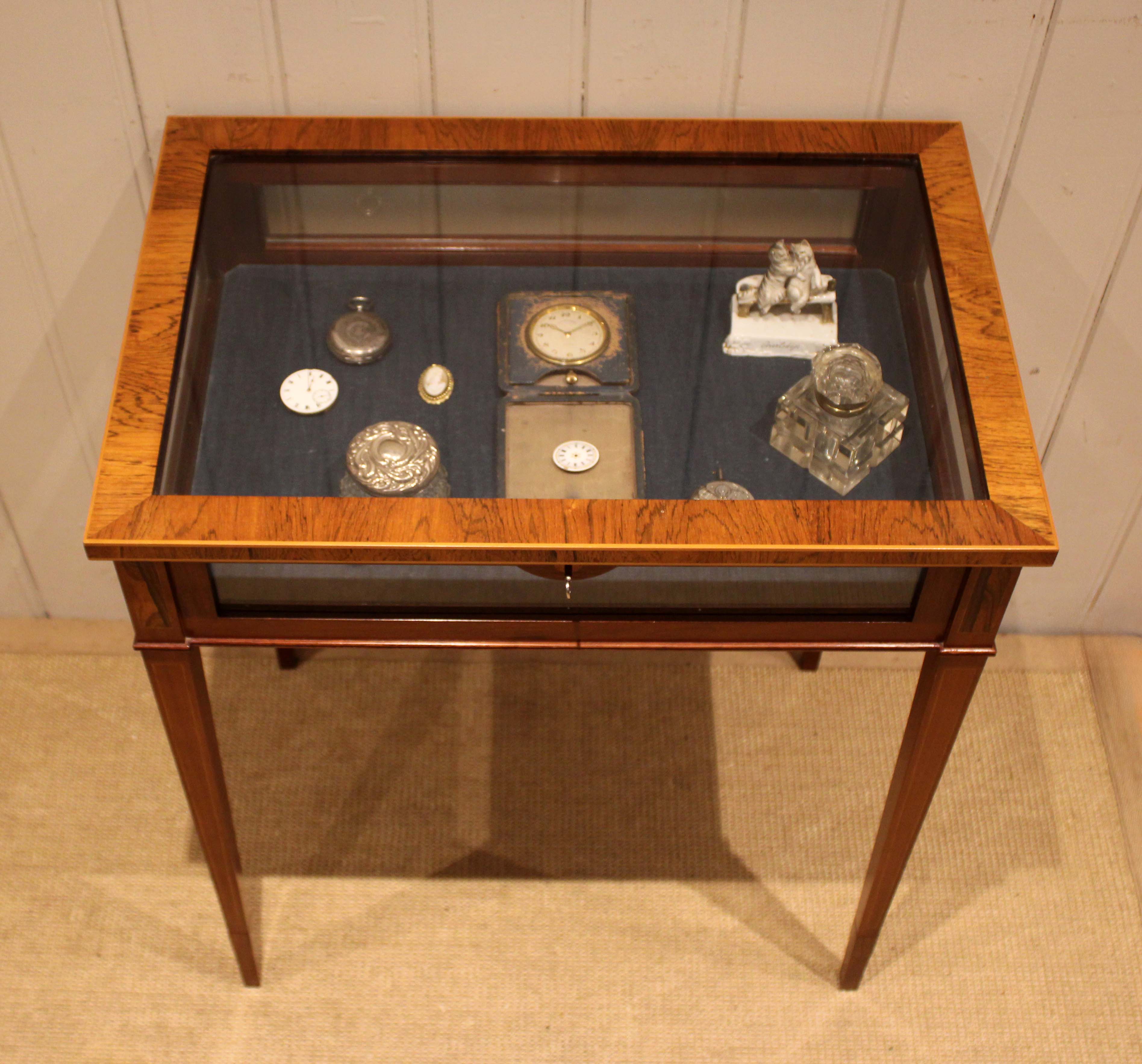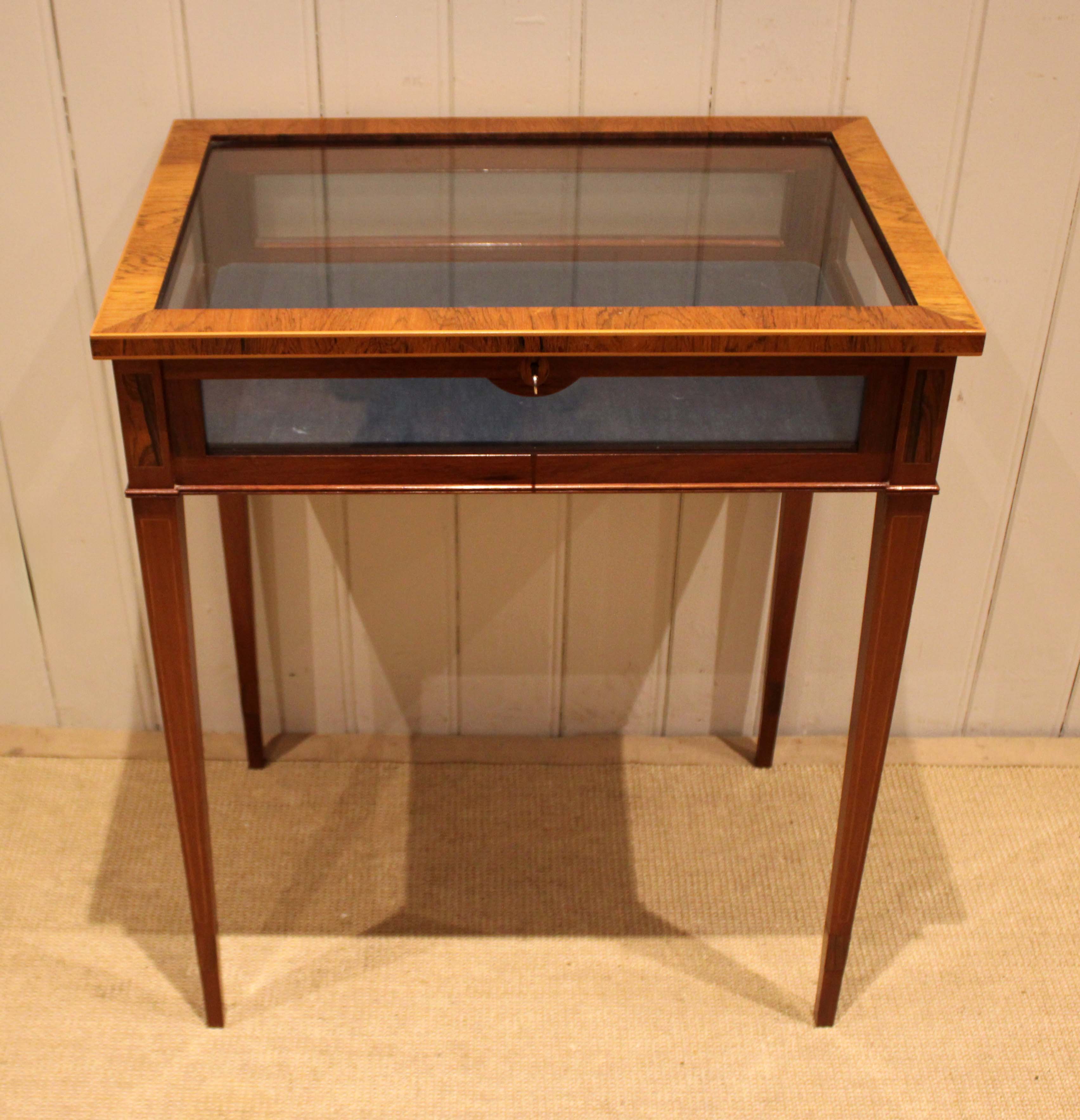 Rosewood & Mahogany bijouterie table having a hinged top , blue lined interior , the sides are all glazed , raised on straight tapering legs . The internal depth is 10.5 cm , complete with a working lock & key.