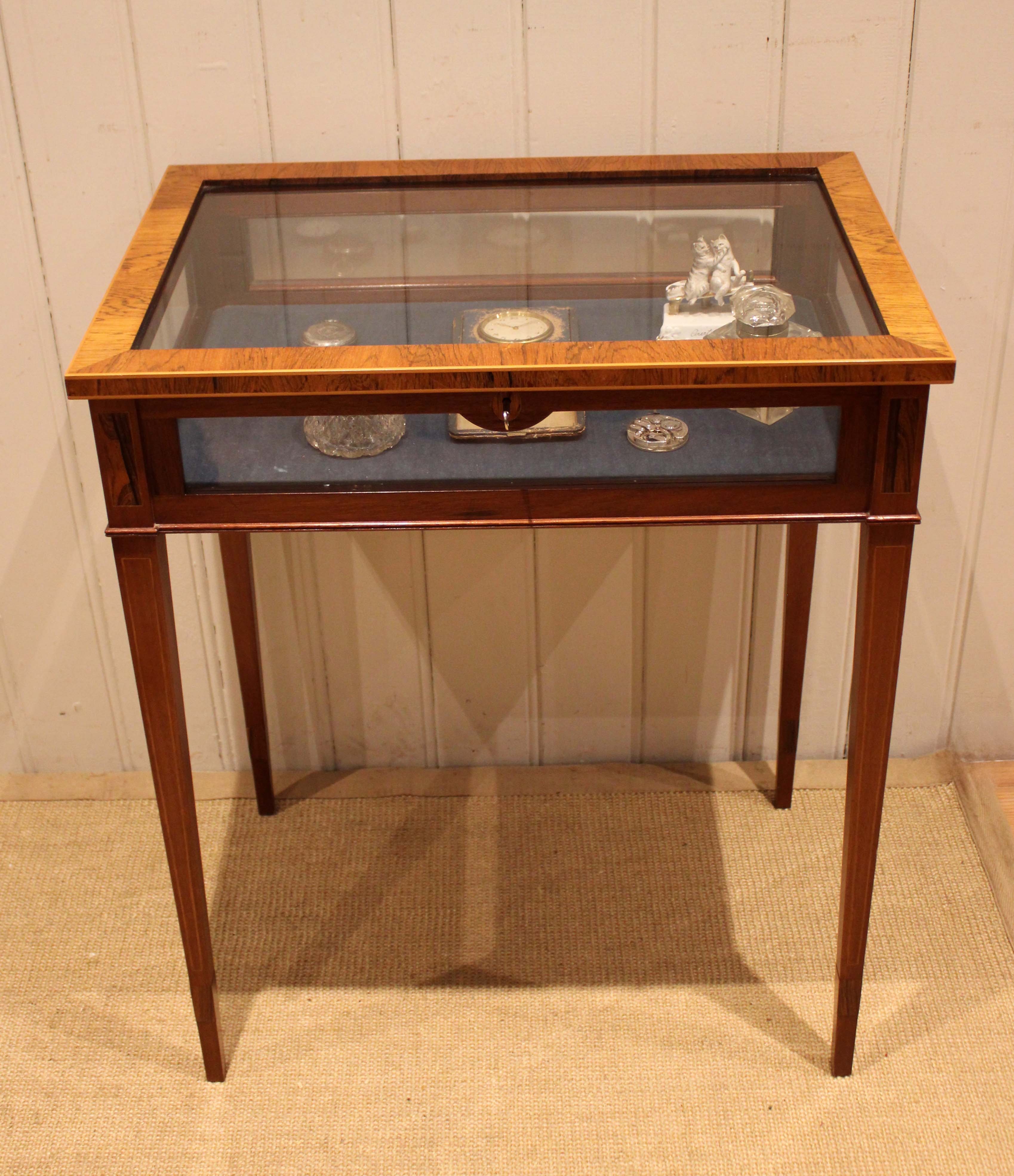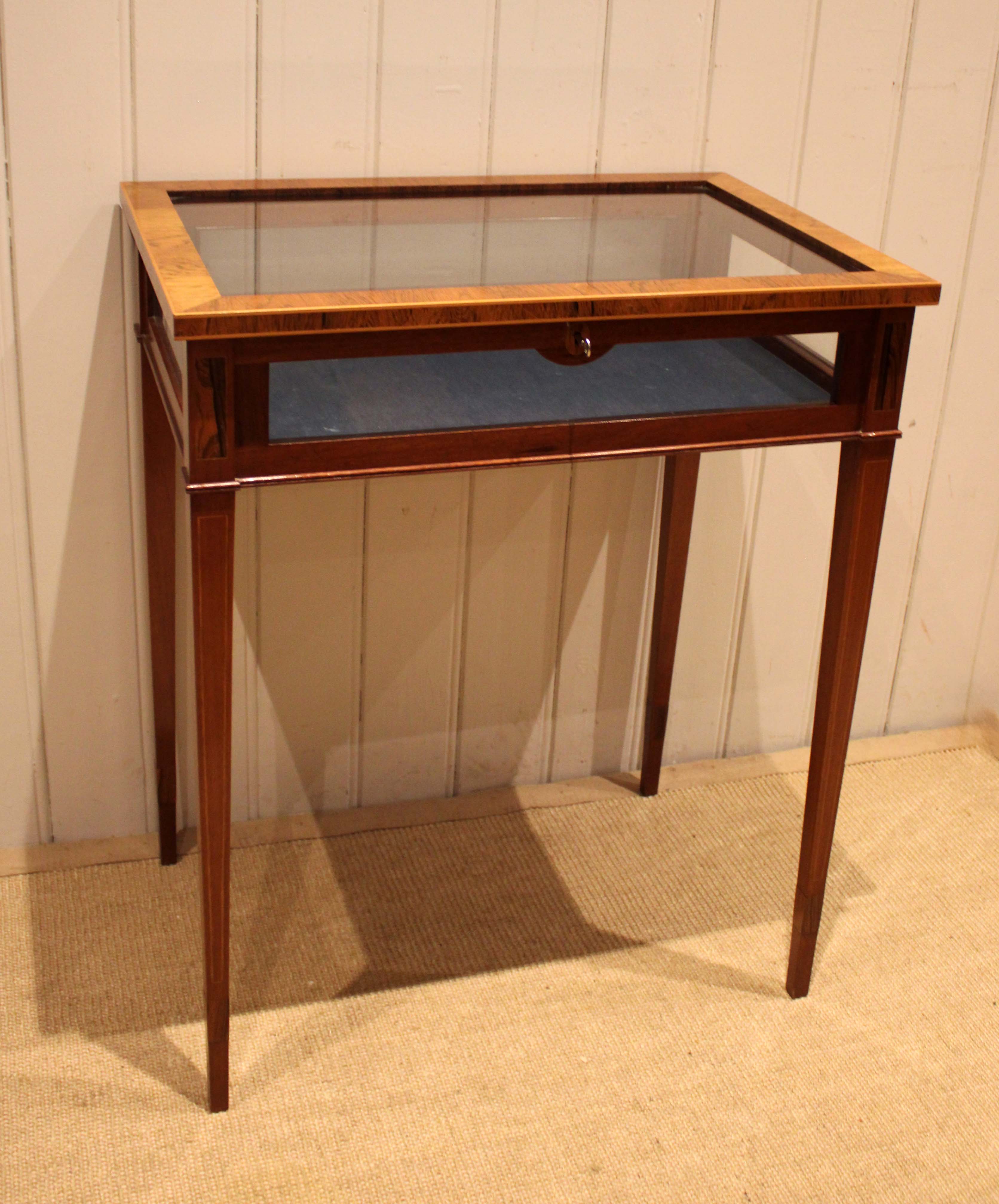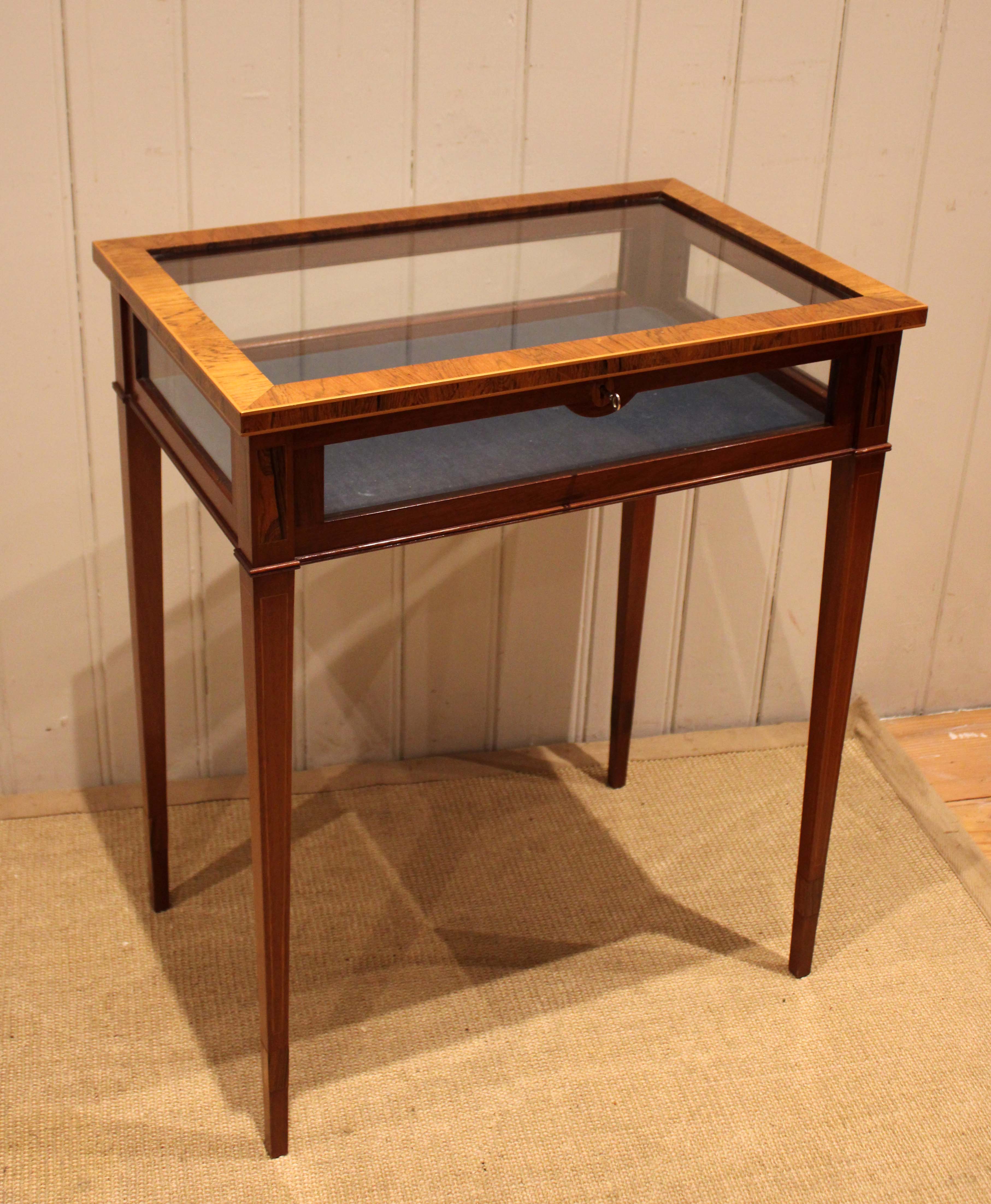Rosewood & Mahogany bijouterie table having a hinged top , blue lined interior , the sides are all glazed , raised on straight tapering legs . The internal depth is 10.5 cm , complete with a working lock & key.