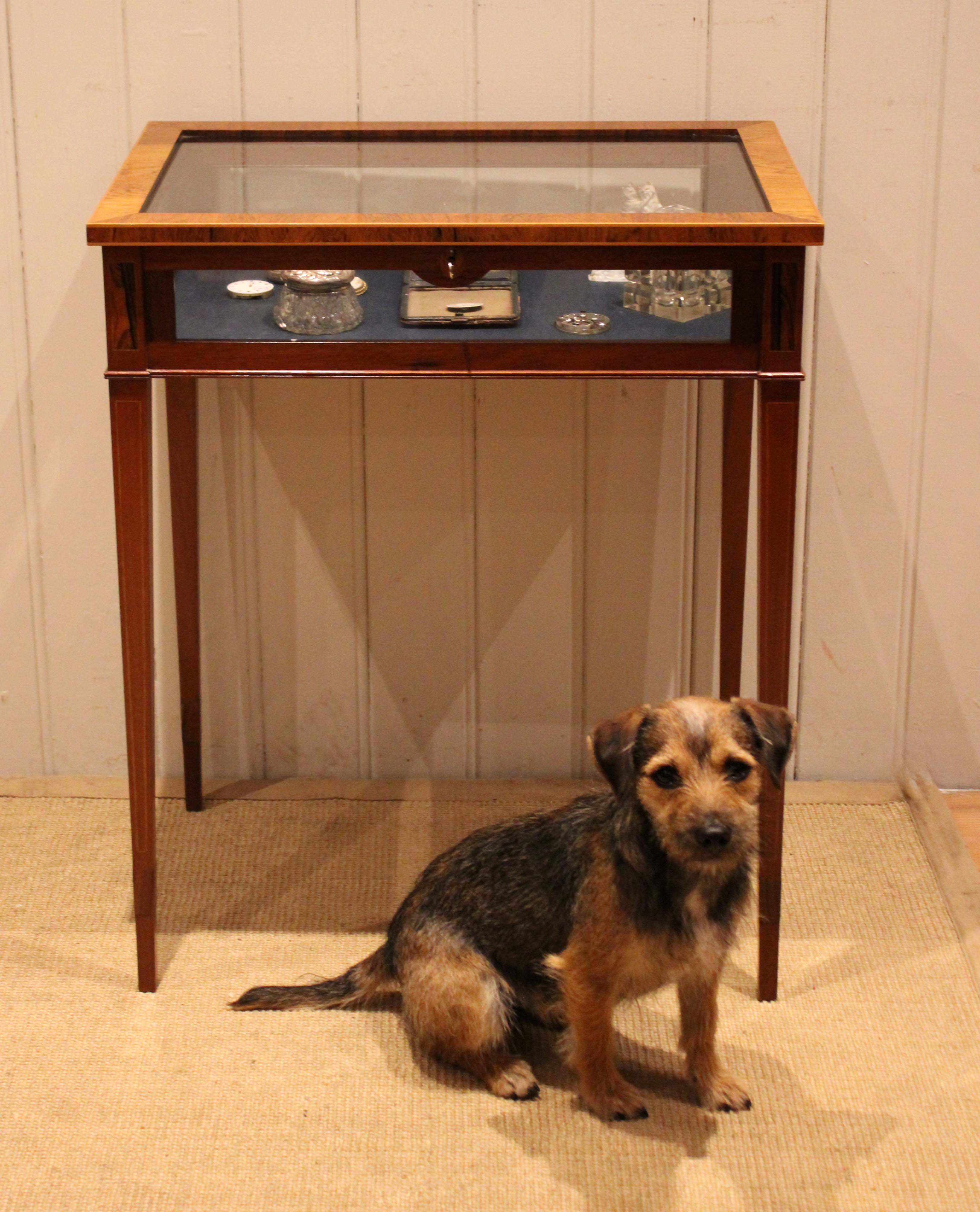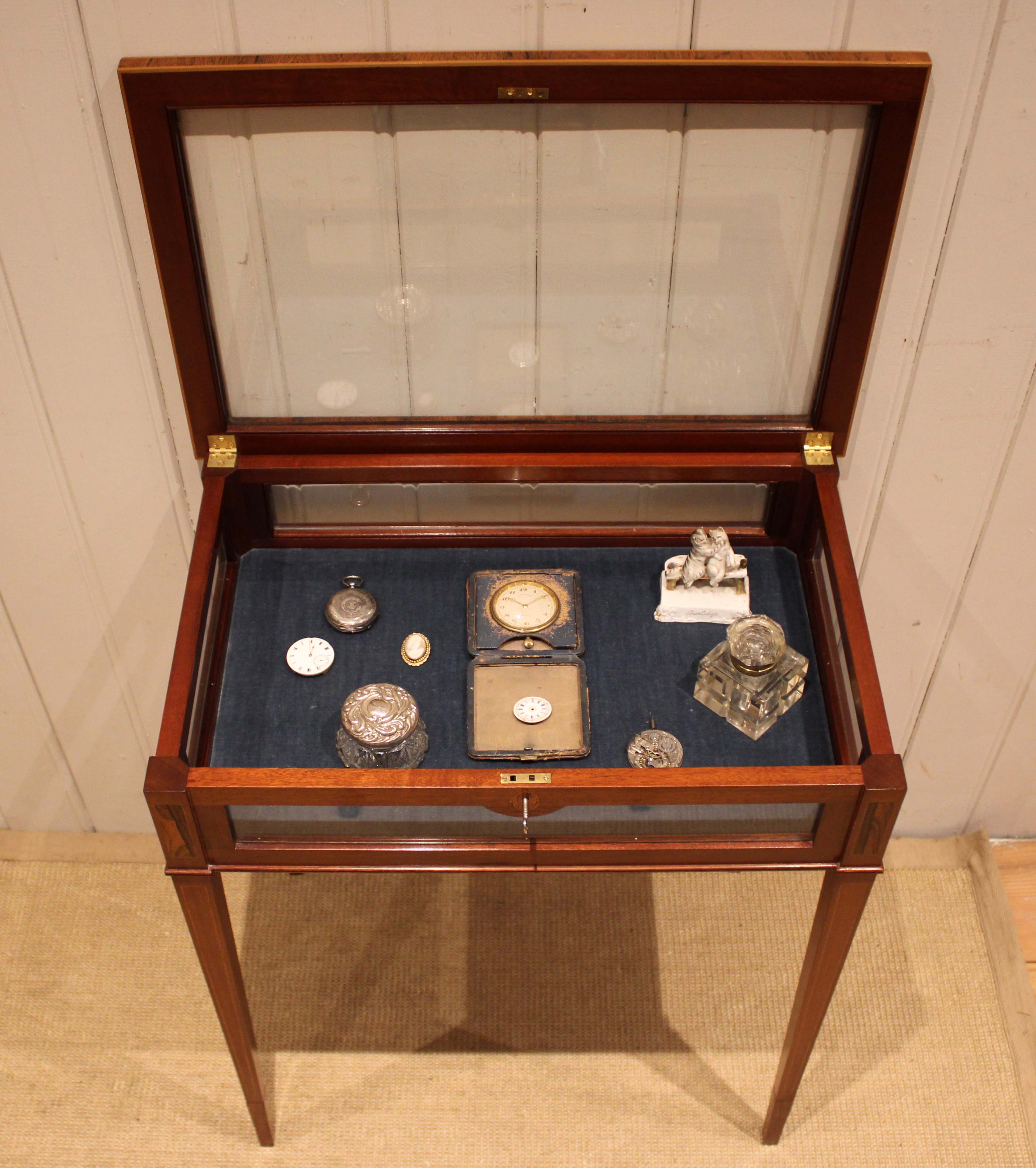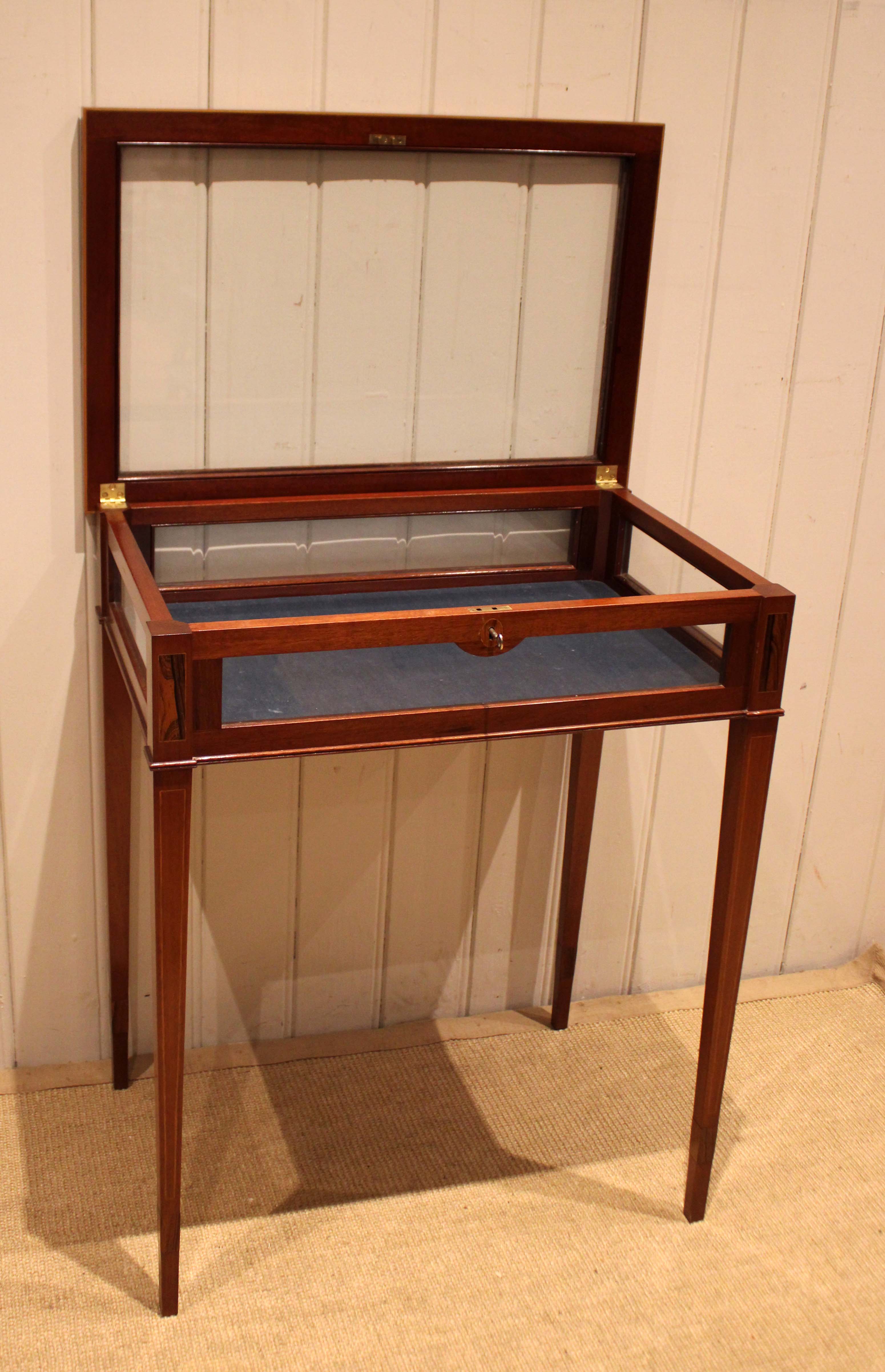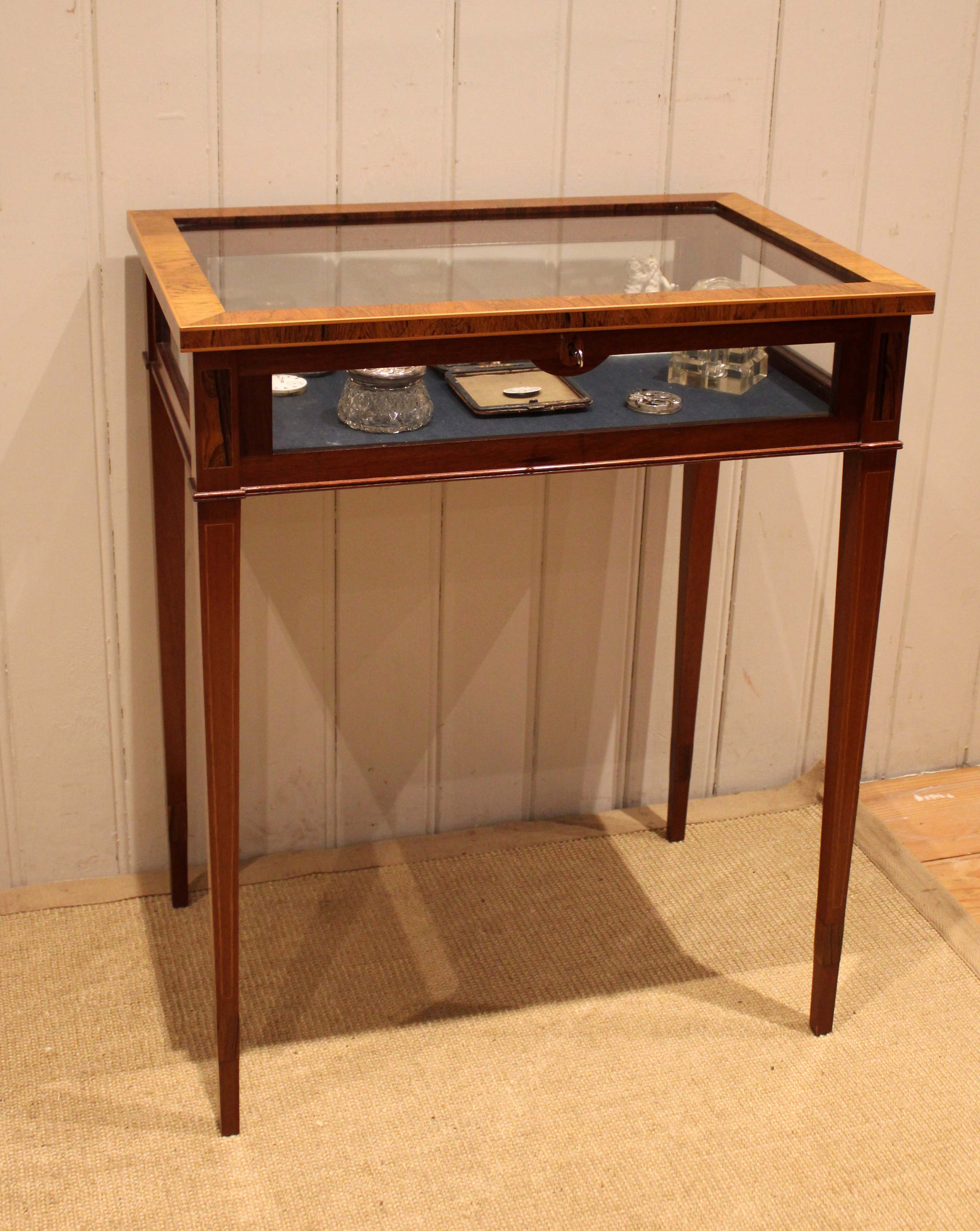 Rosewood & Mahogany bijouterie table having a hinged top , blue lined interior , the sides are all glazed , raised on straight tapering legs . The internal depth is 10.5 cm , complete with a working lock & key.
