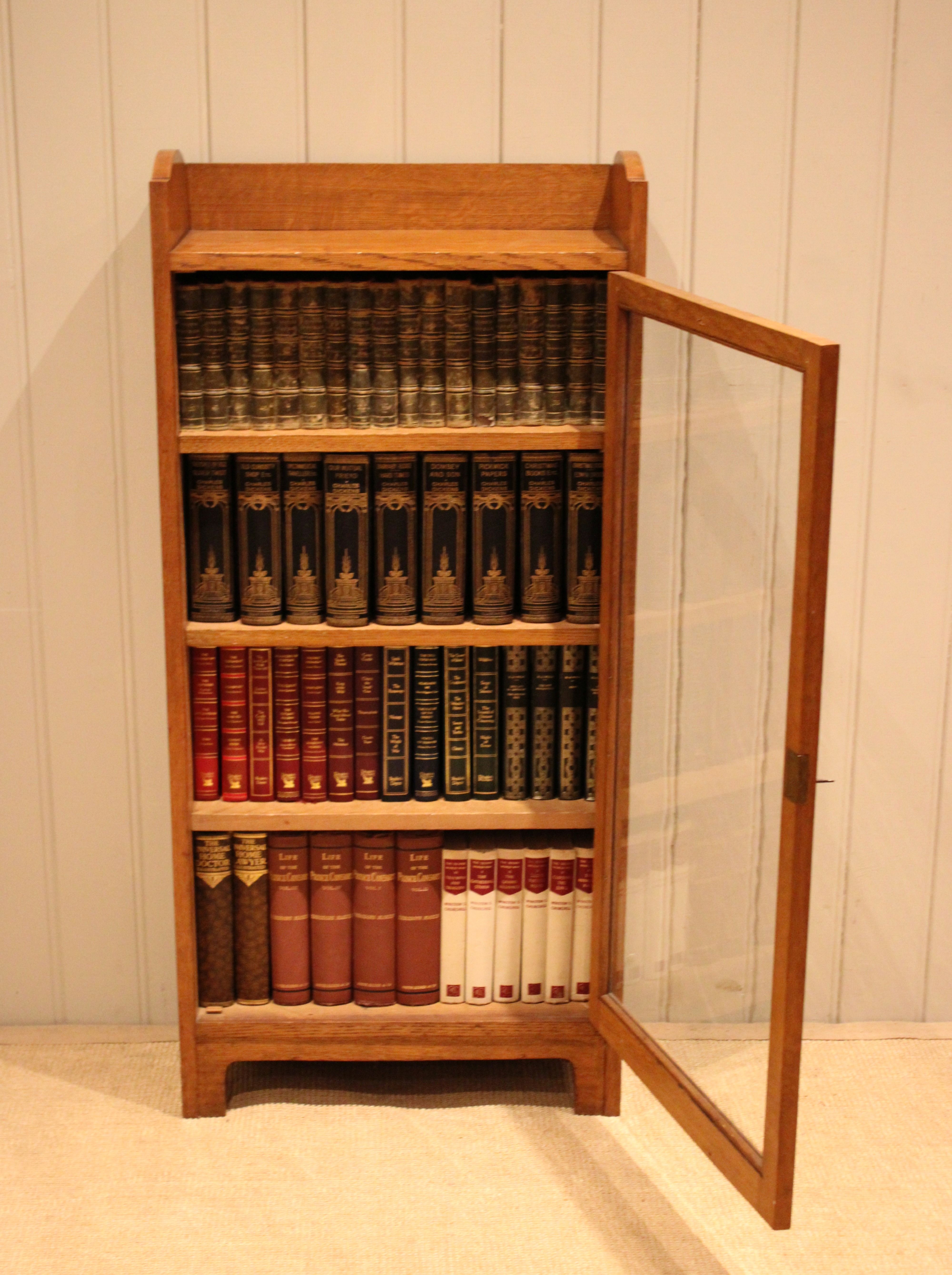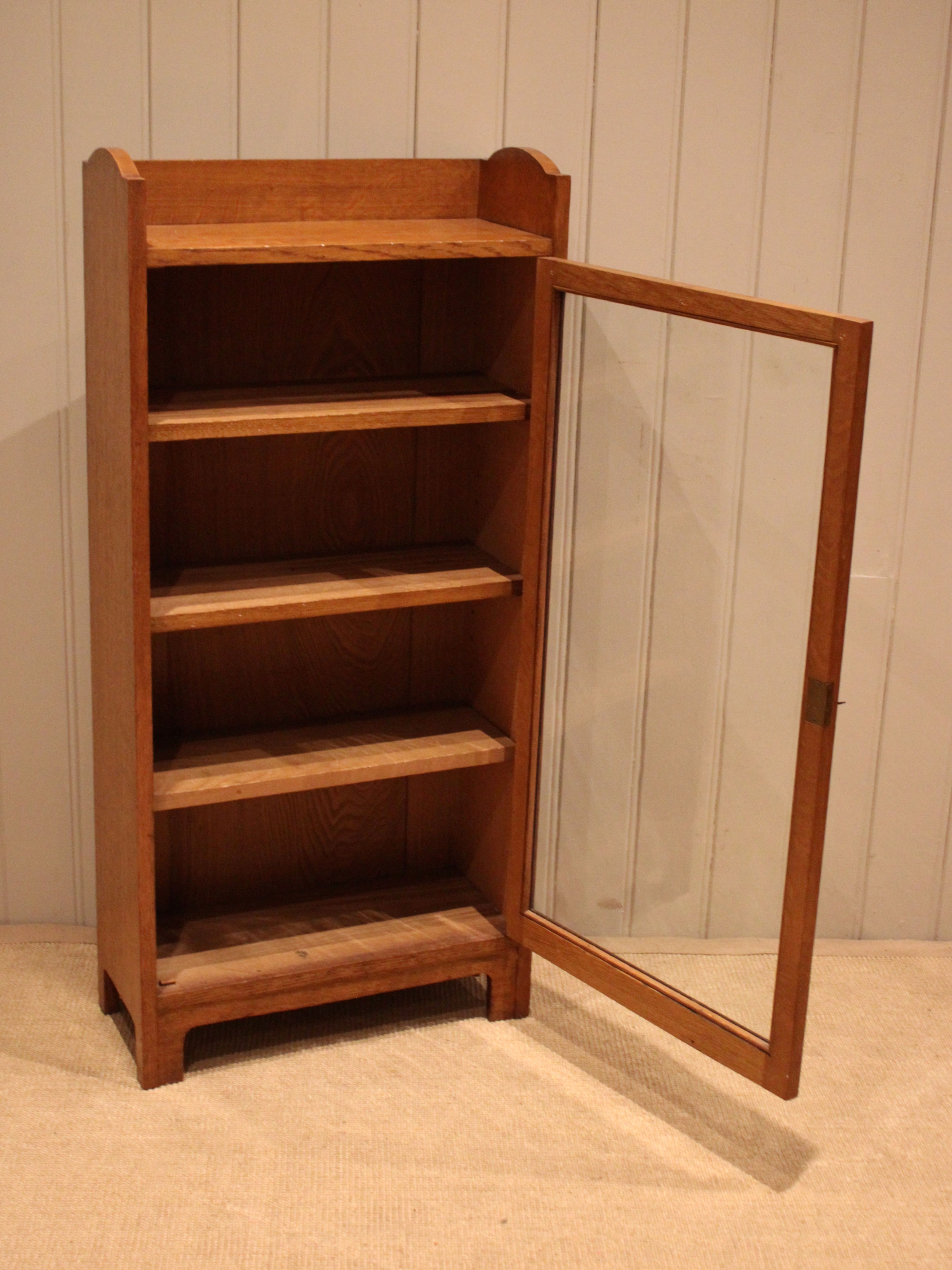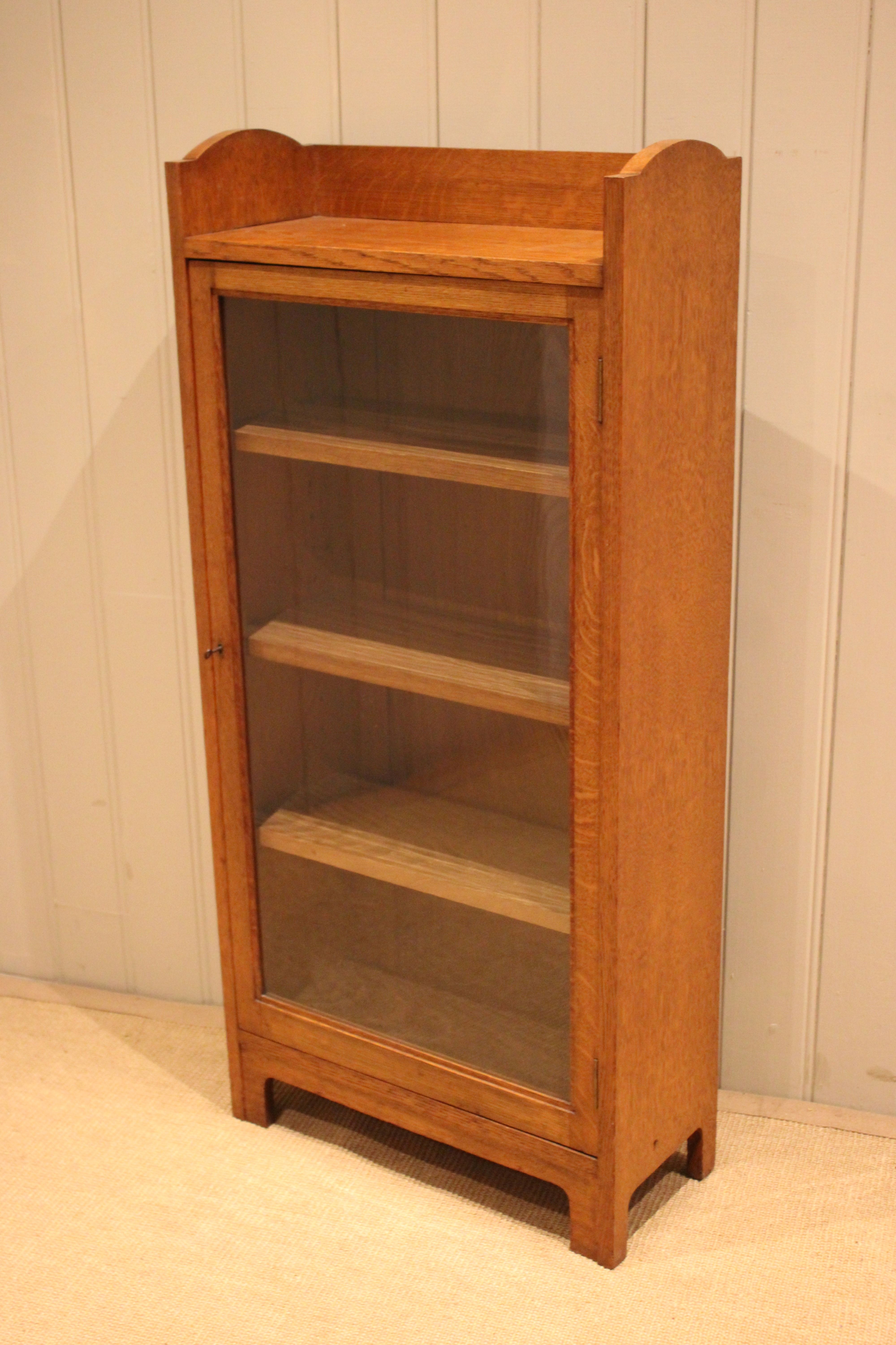 Small Arts & Crafts style light oak bookcase having a single glazed door with three internal adjustable shelves , raised on short shaped feet.