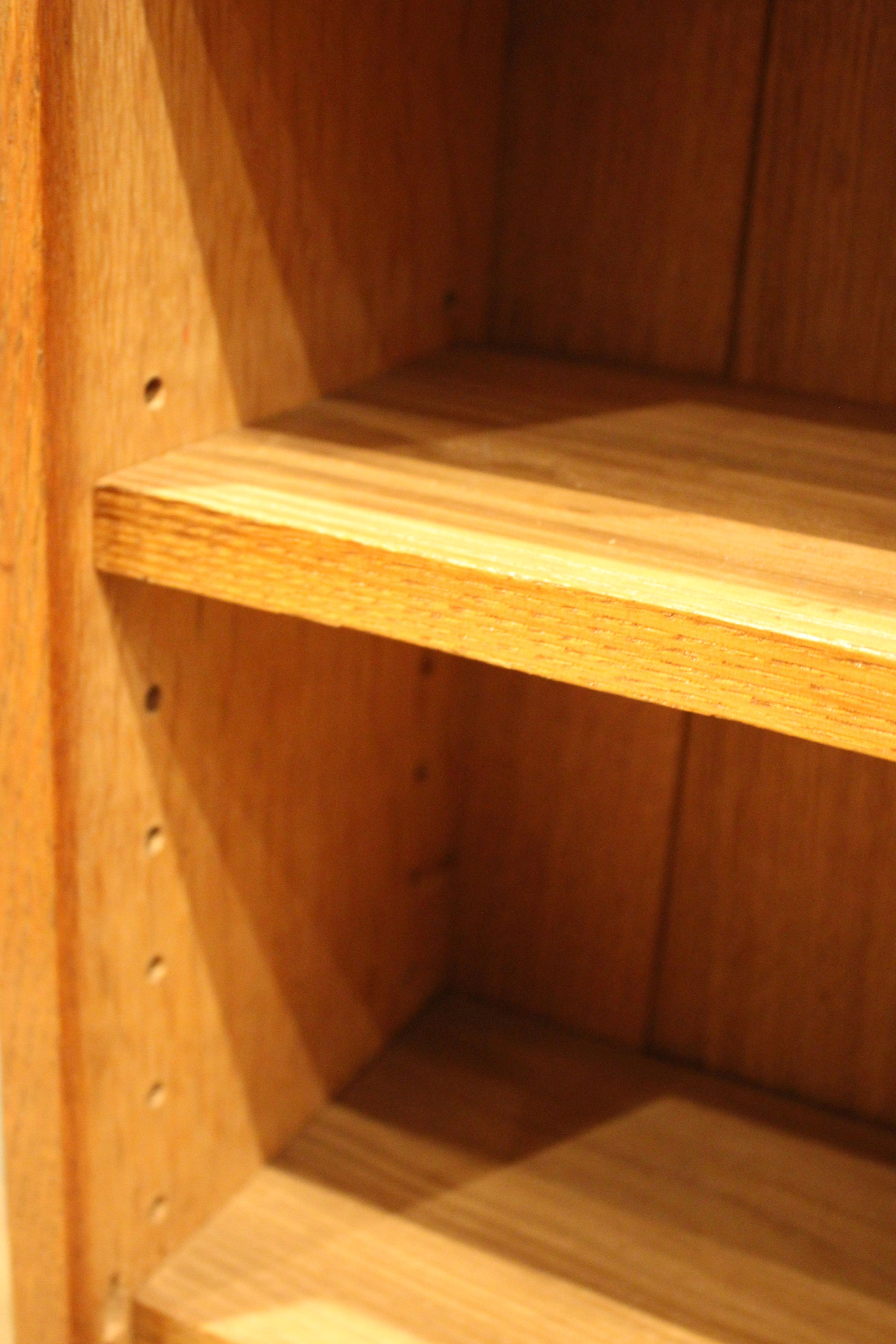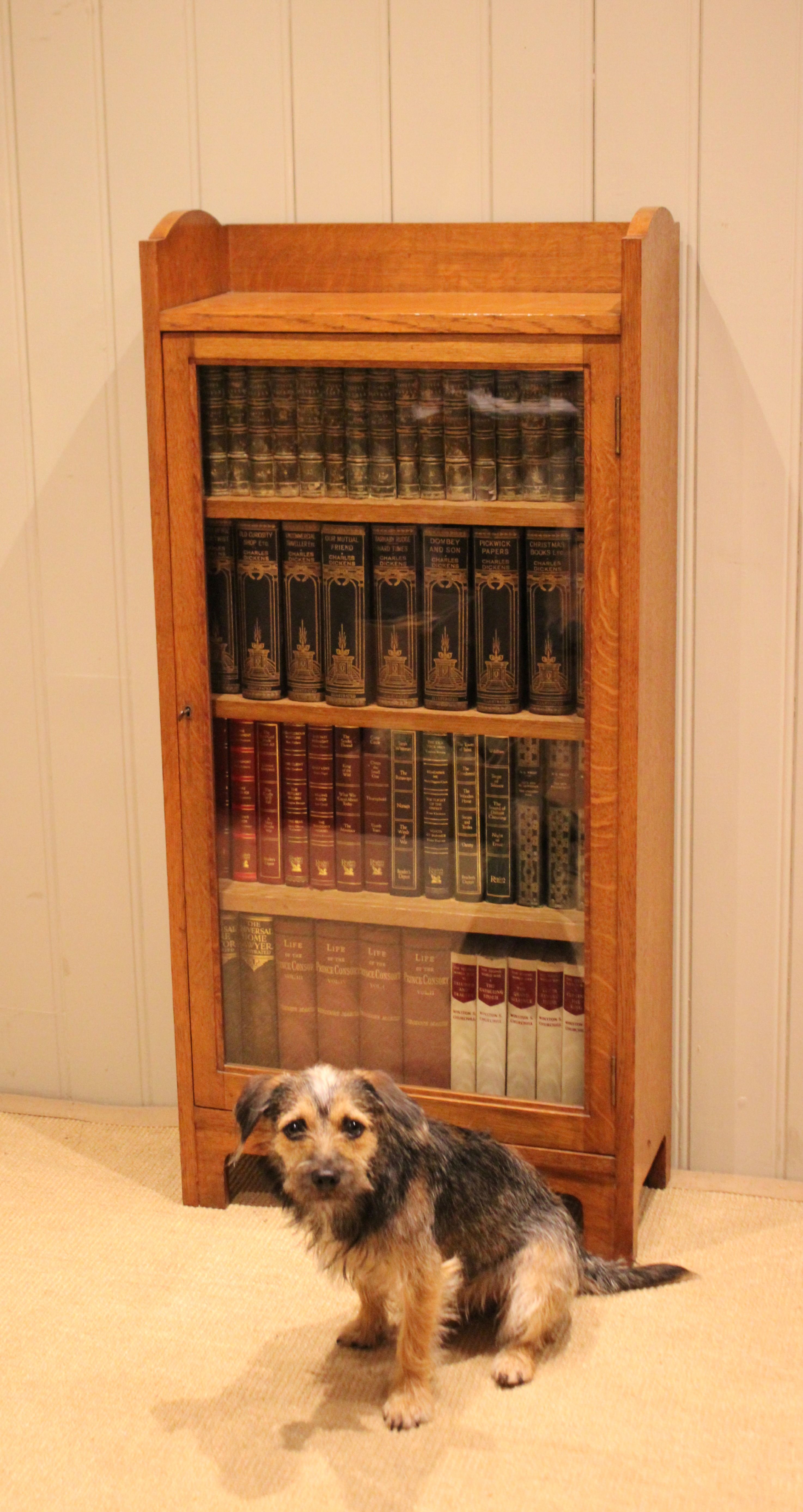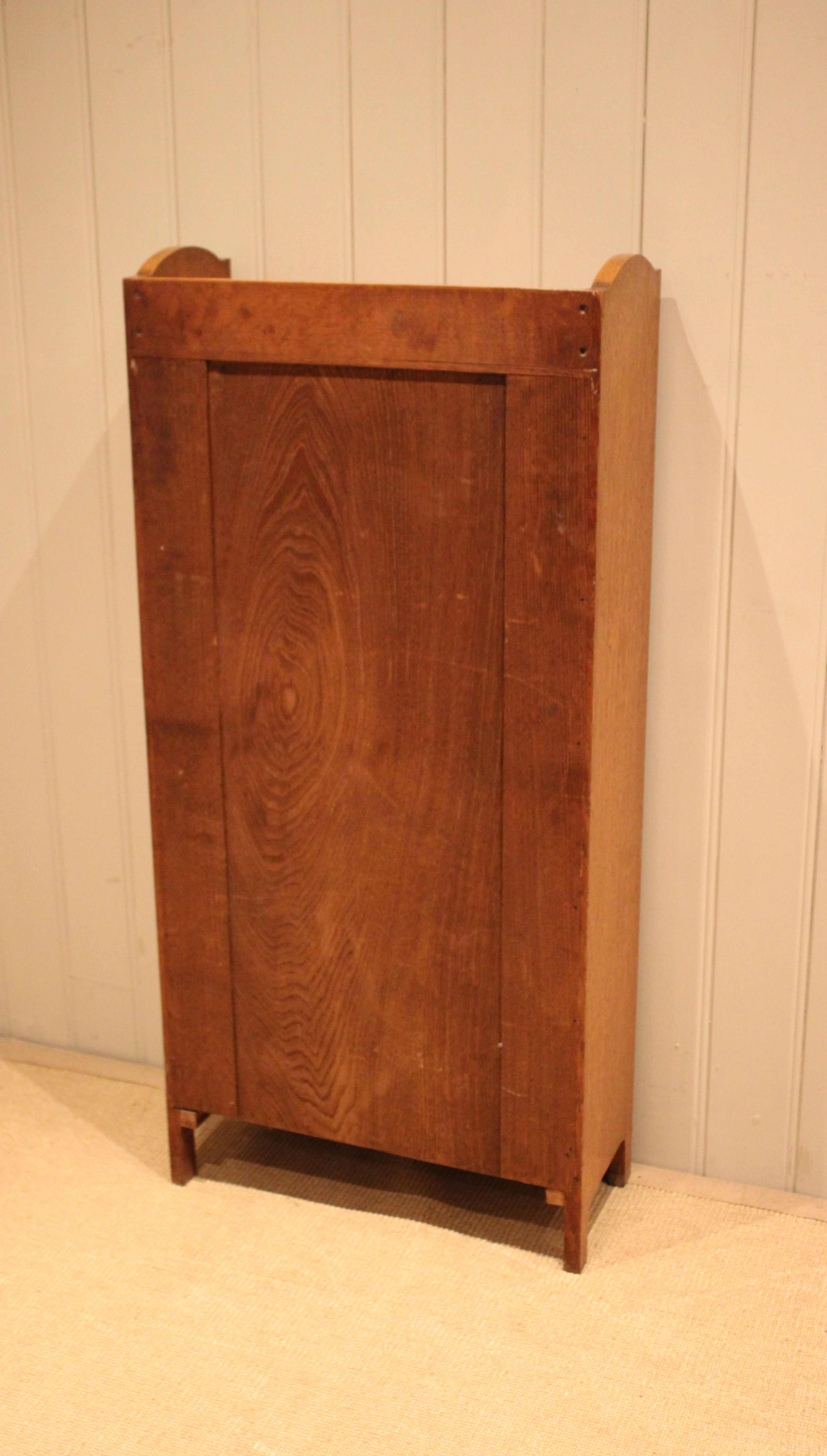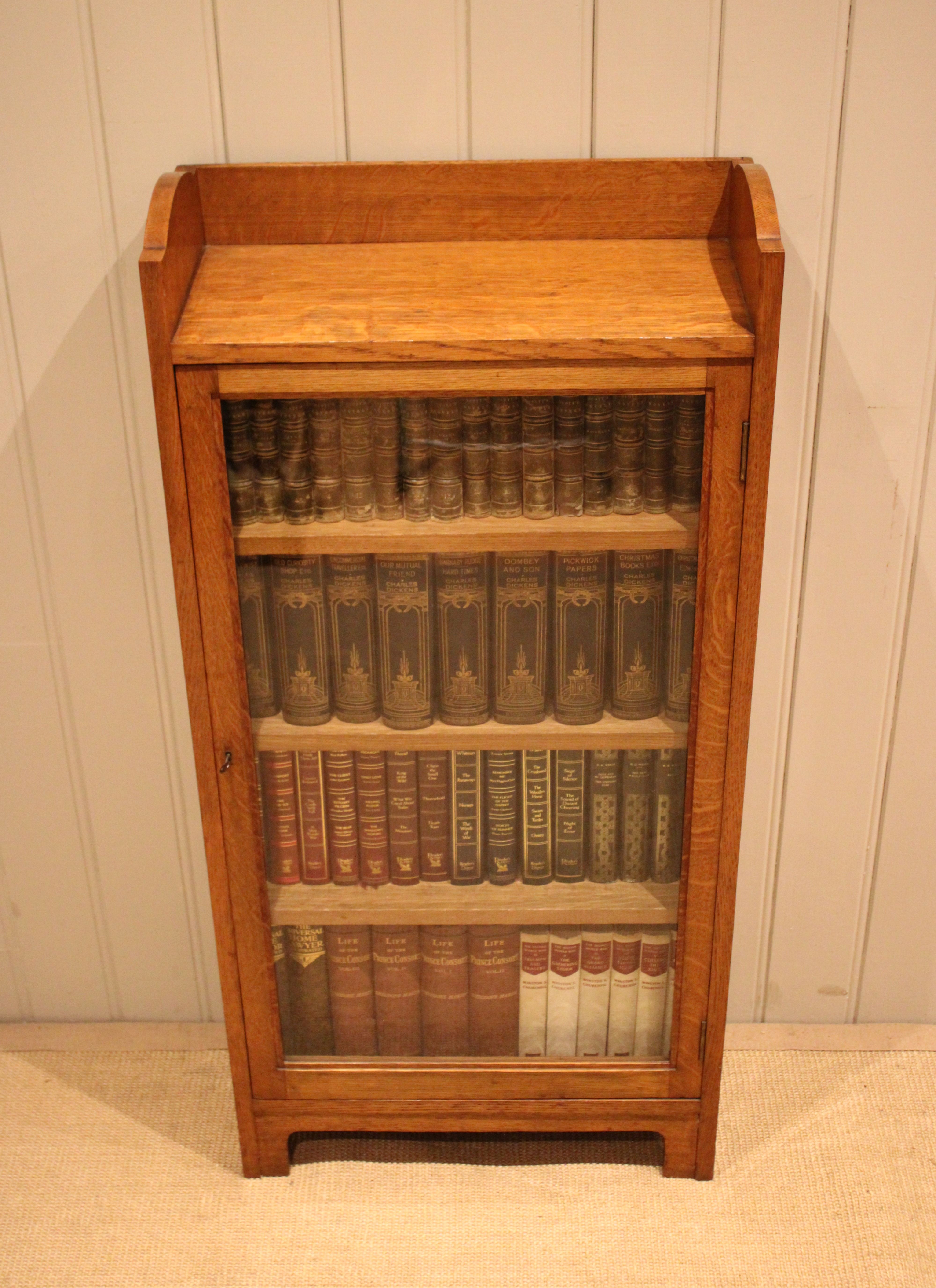 Small Arts & Crafts style light oak bookcase having a single glazed door with three internal adjustable shelves , raised on short shaped feet.