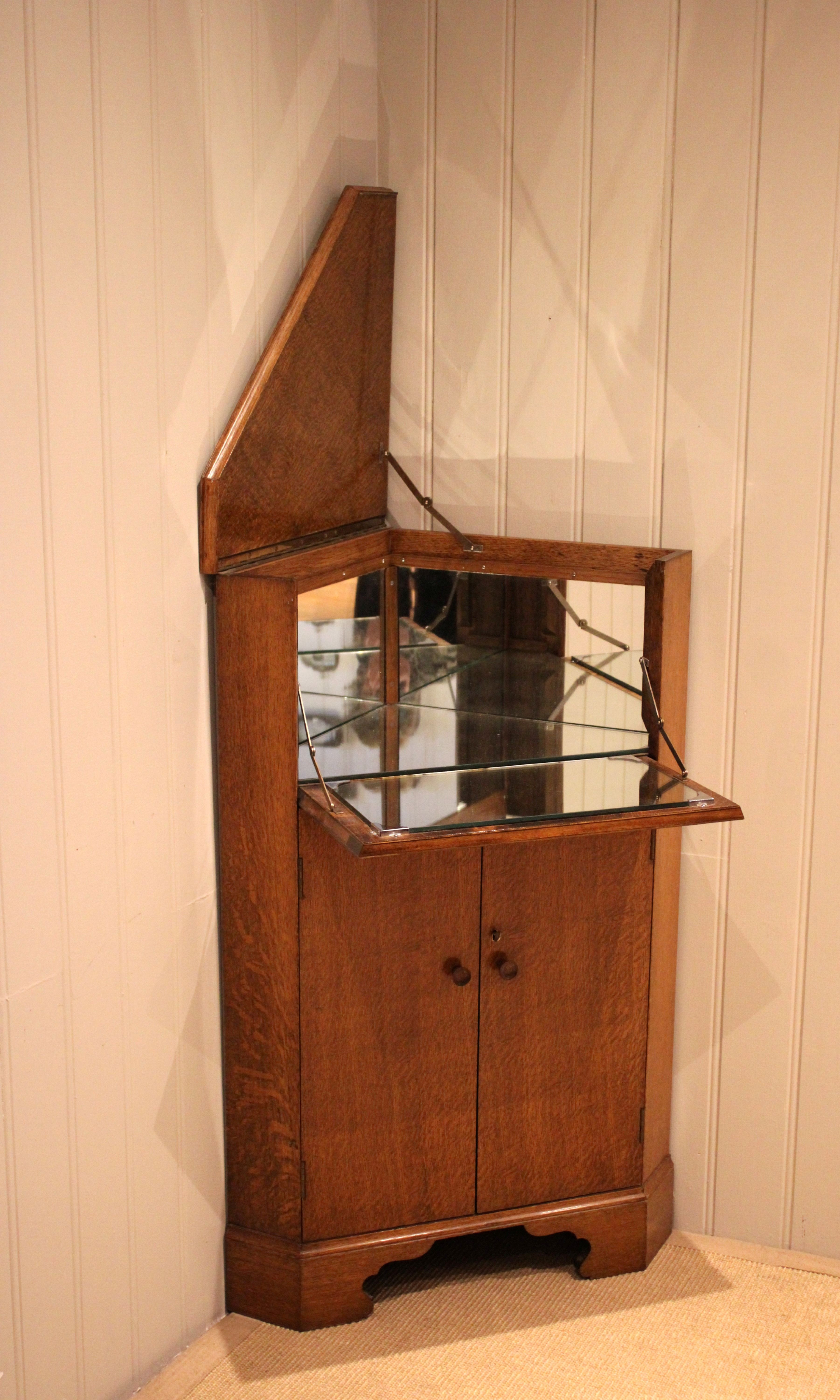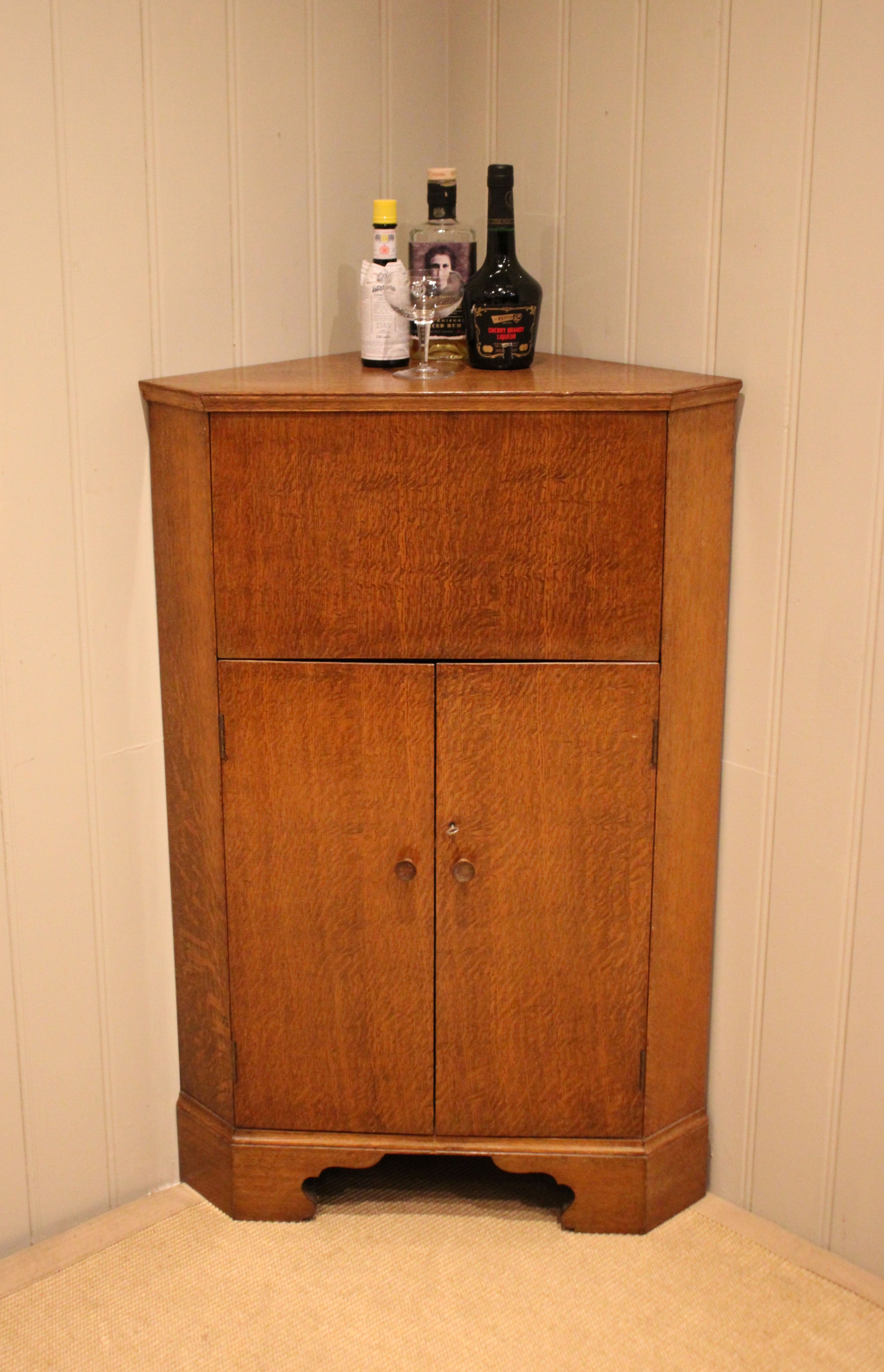 Solid golden oak sideboard having canted corners , panelled sides , with a cupboard to each end and a pair of central drawers , raised on turned wooden legs united by a stretcher.