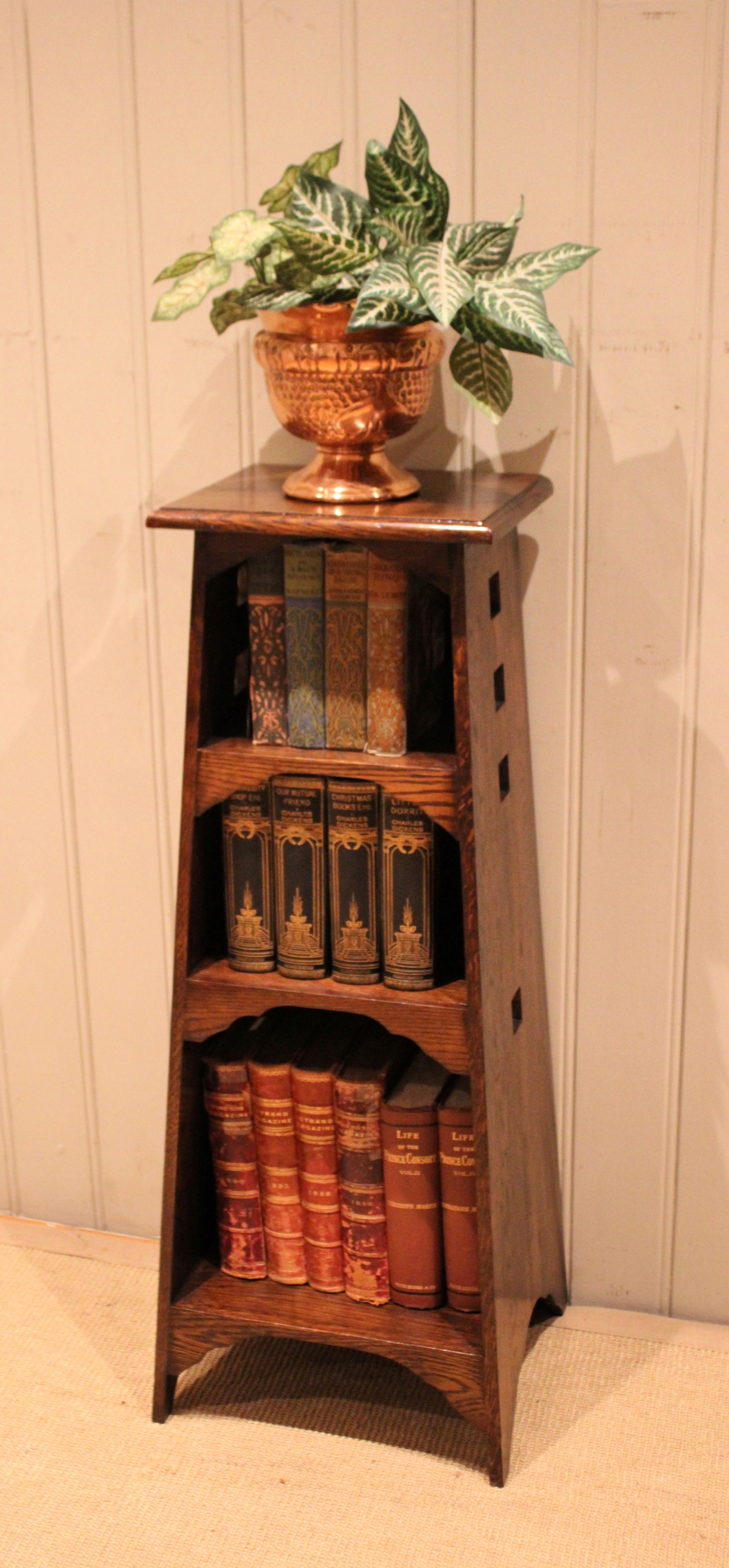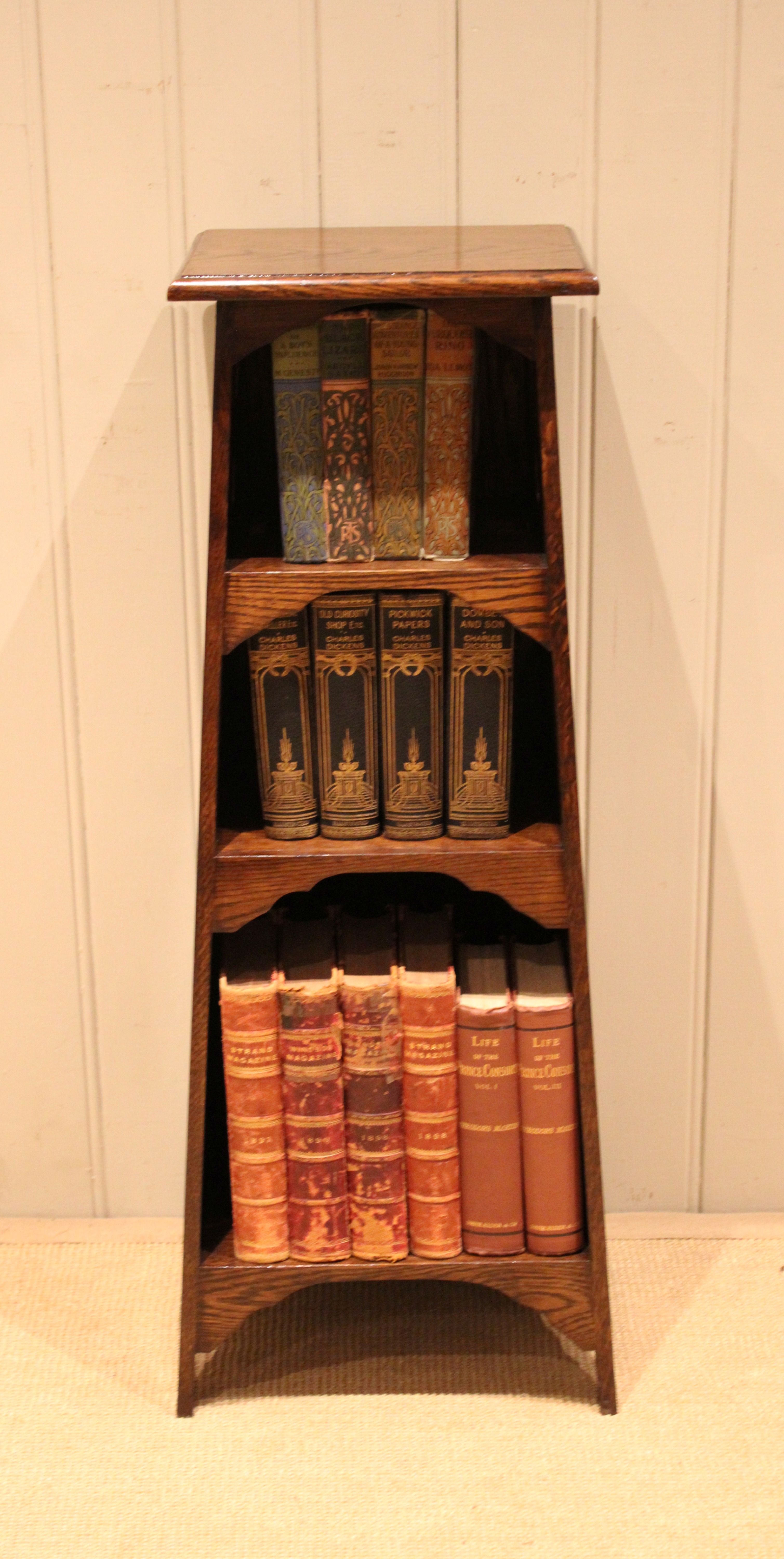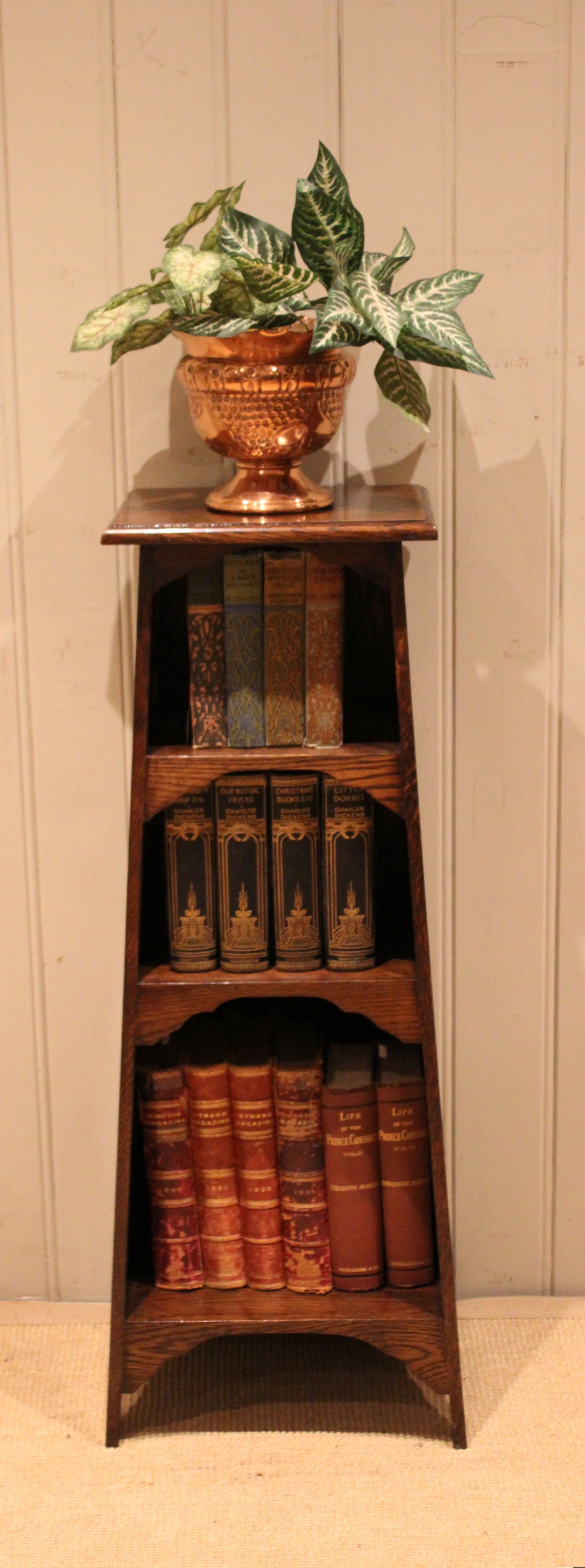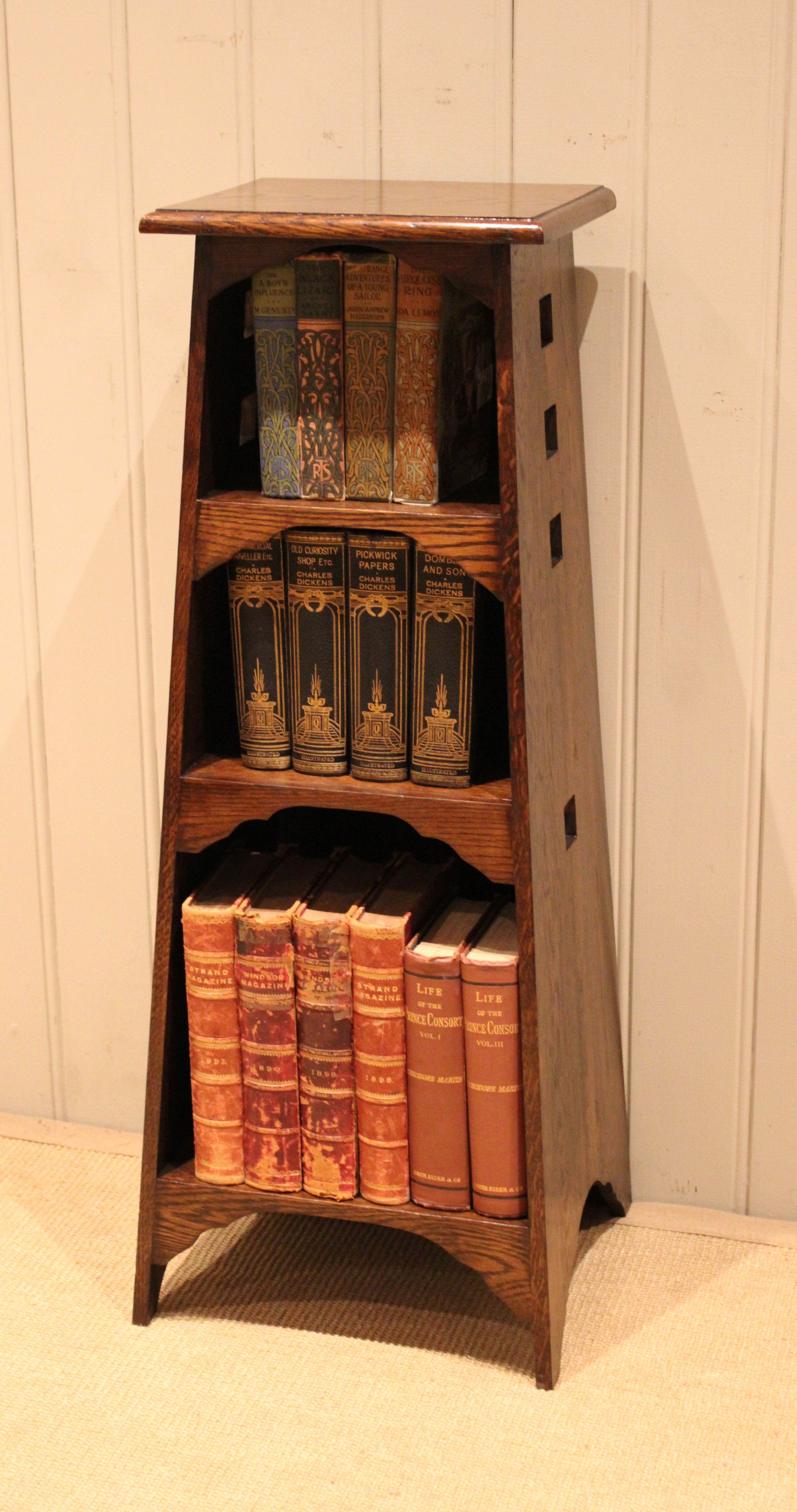 Solid oak stylized open bookcase having a triangular form with pierced decoration to the sides , with three fixed shelves with bracket supports , raised on short supports . The shelf dimensions are from the bottom up 34 cm high , 32 cm wide and 30 cm deep , the middle 21 cm high , 27.5 cm wide and 26 cm deep and at the top 21 cm high , 24 cm wide and 23 cm high .