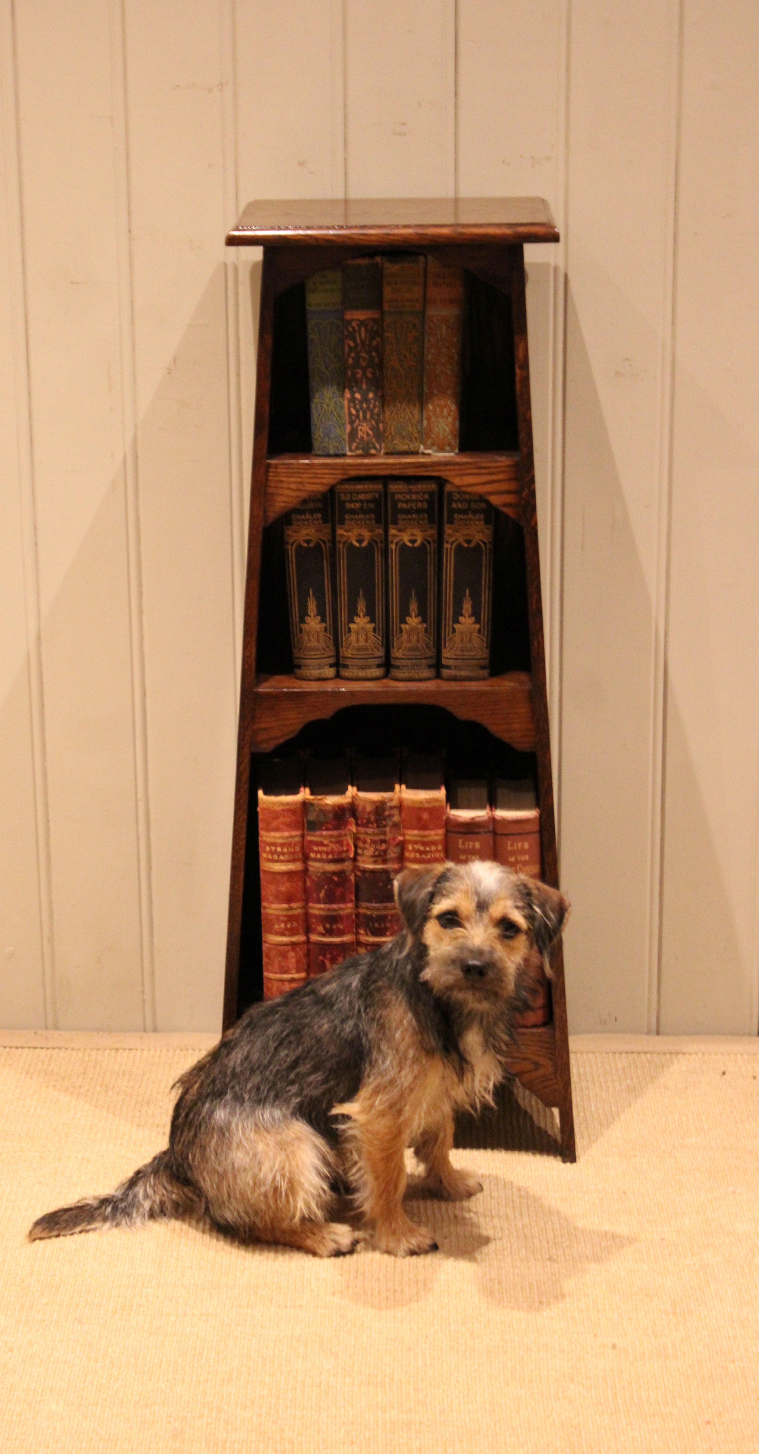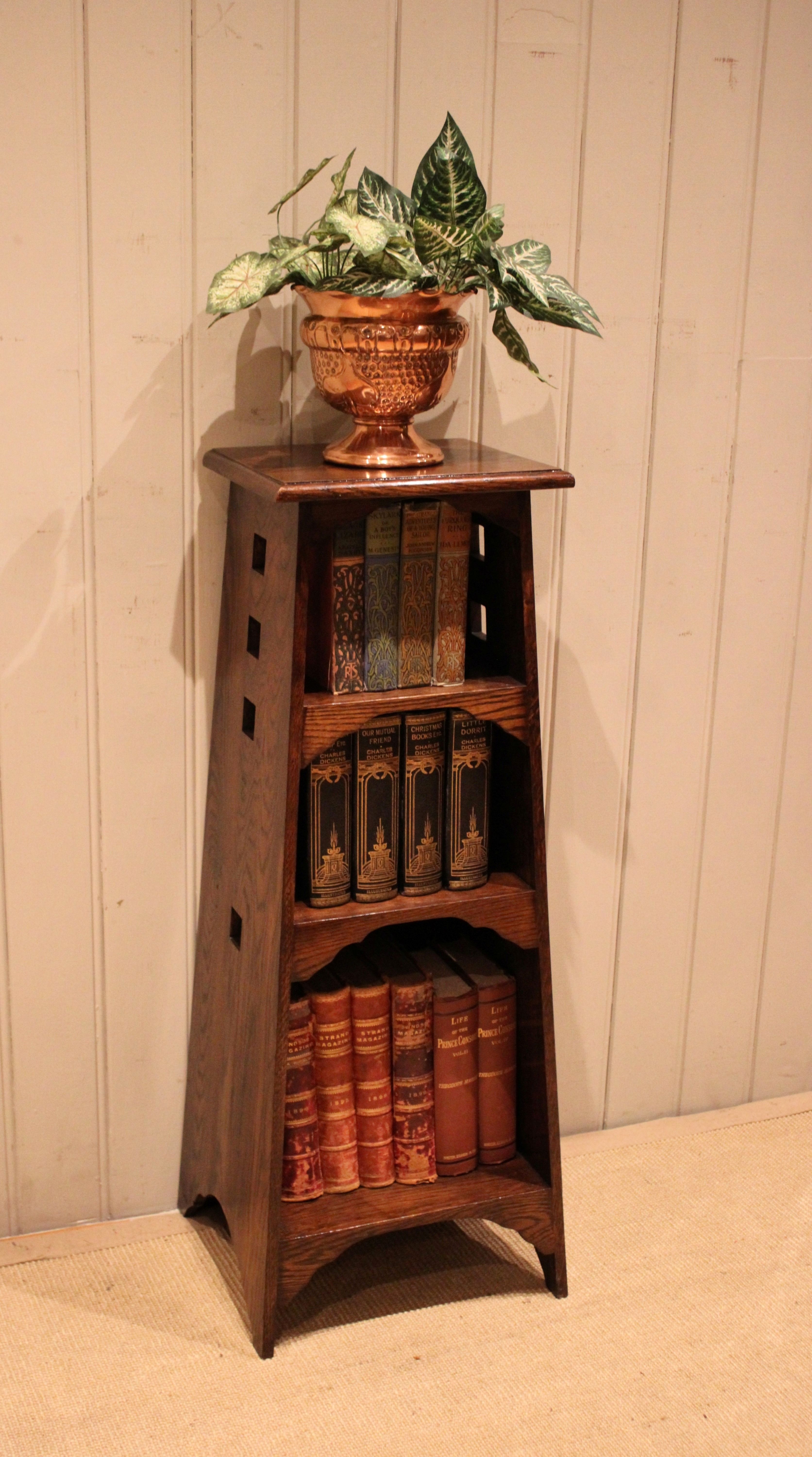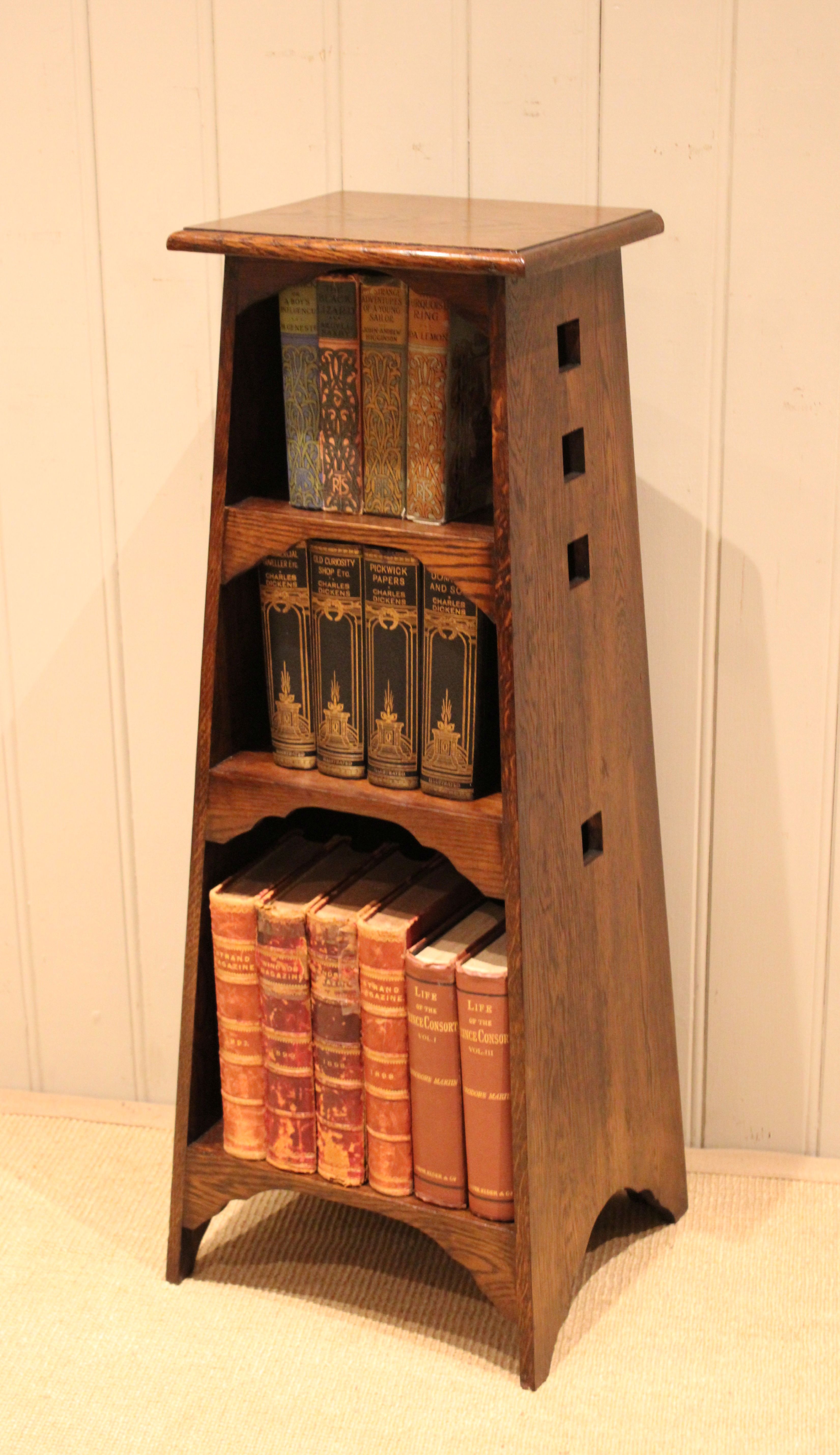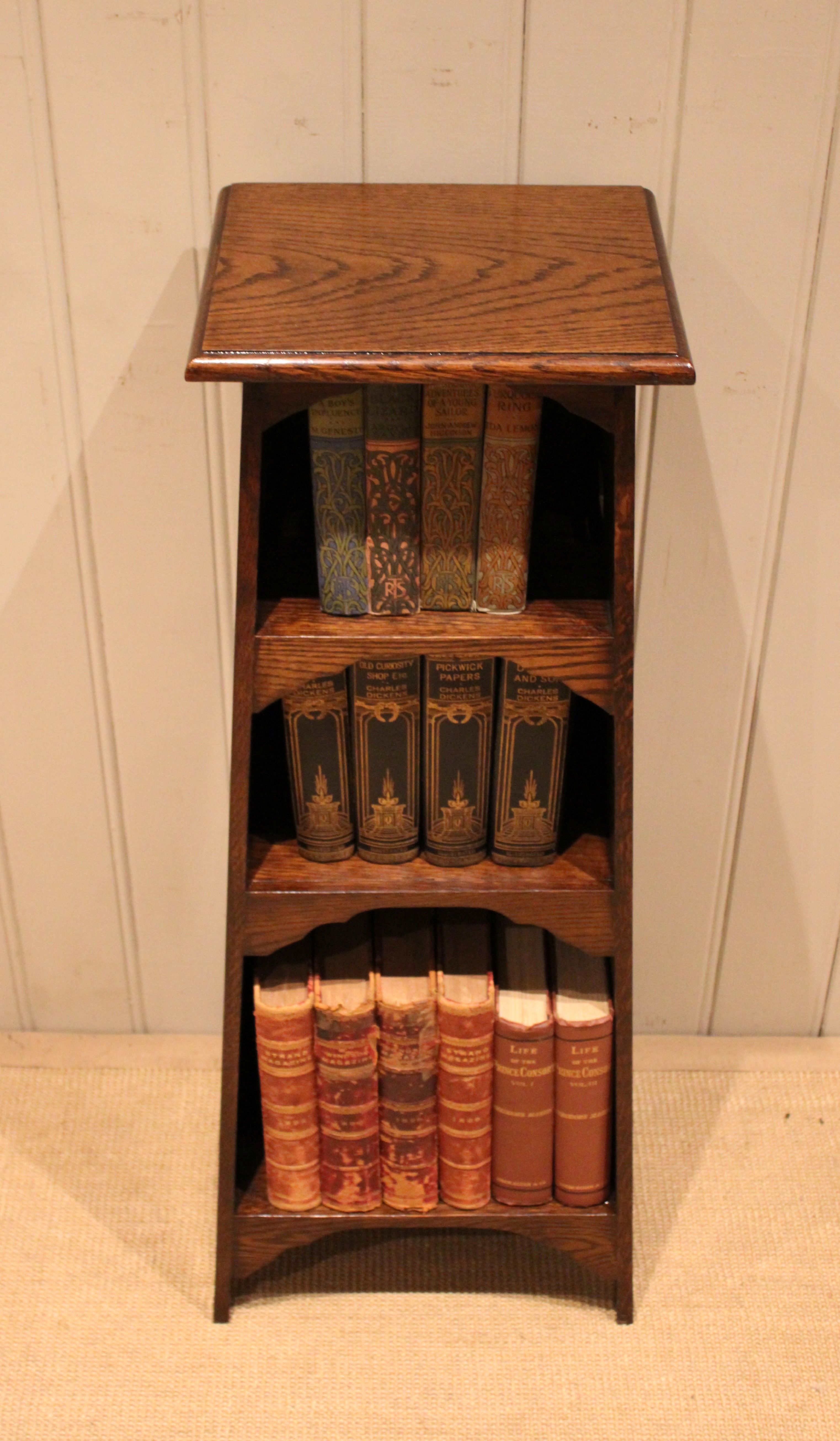 Solid oak stylized open bookcase having a triangular form with pierced decoration to the sides , with three fixed shelves with bracket supports , raised on short supports . The shelf dimensions are from the bottom up 34 cm high , 32 cm wide and 30 cm deep , the middle 21 cm high , 27.5 cm wide and 26 cm deep and at the top 21 cm high , 24 cm wide and 23 cm high .