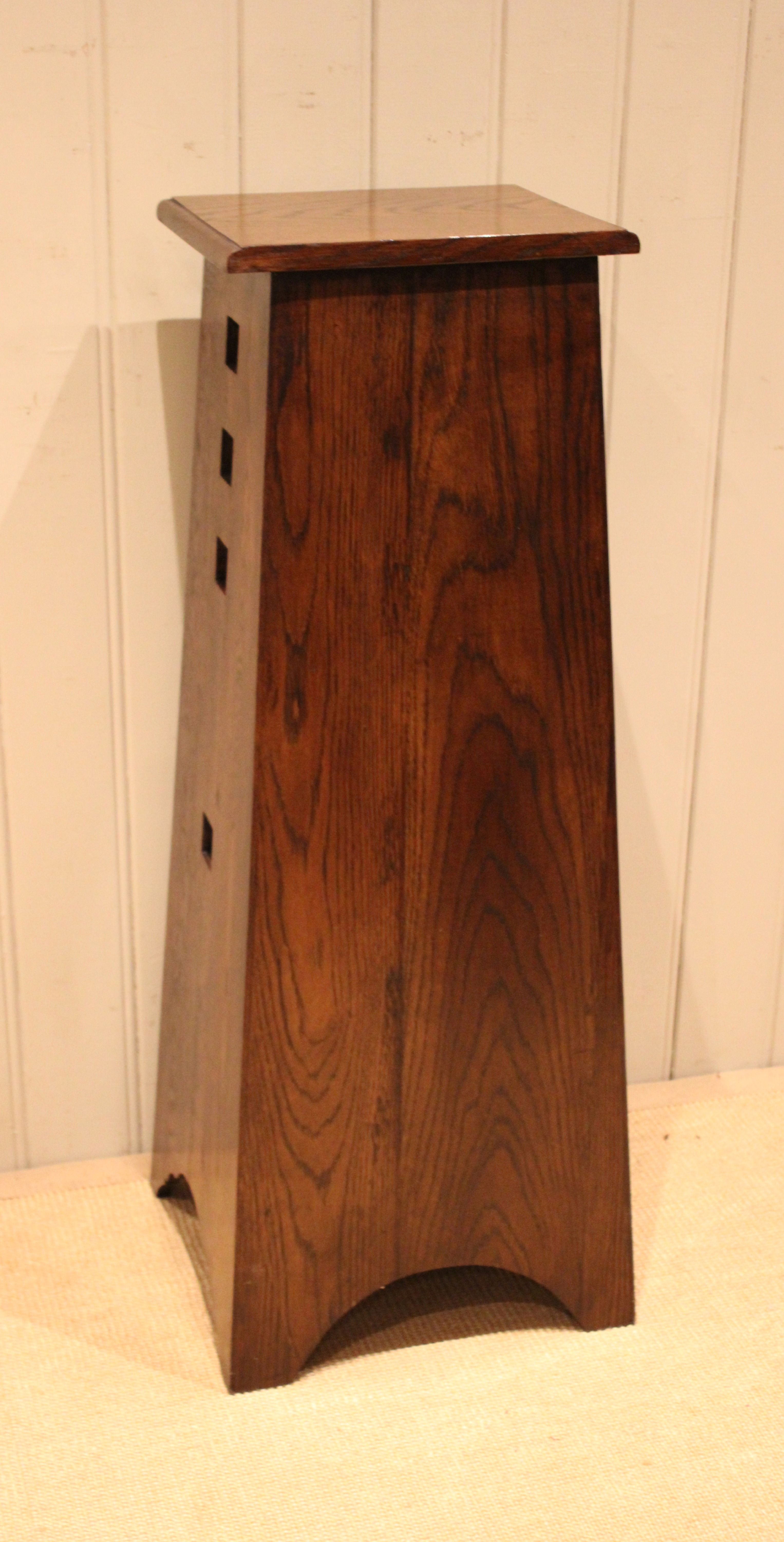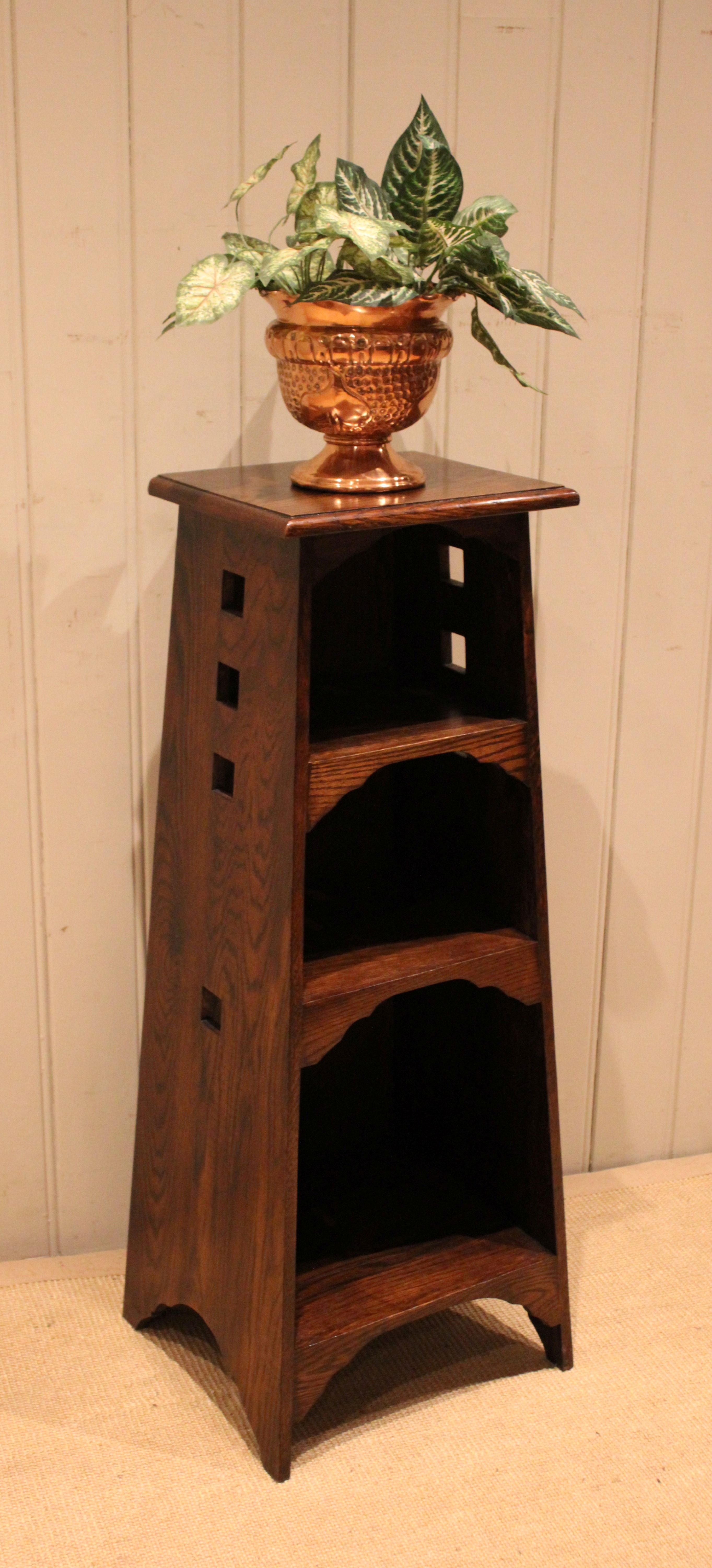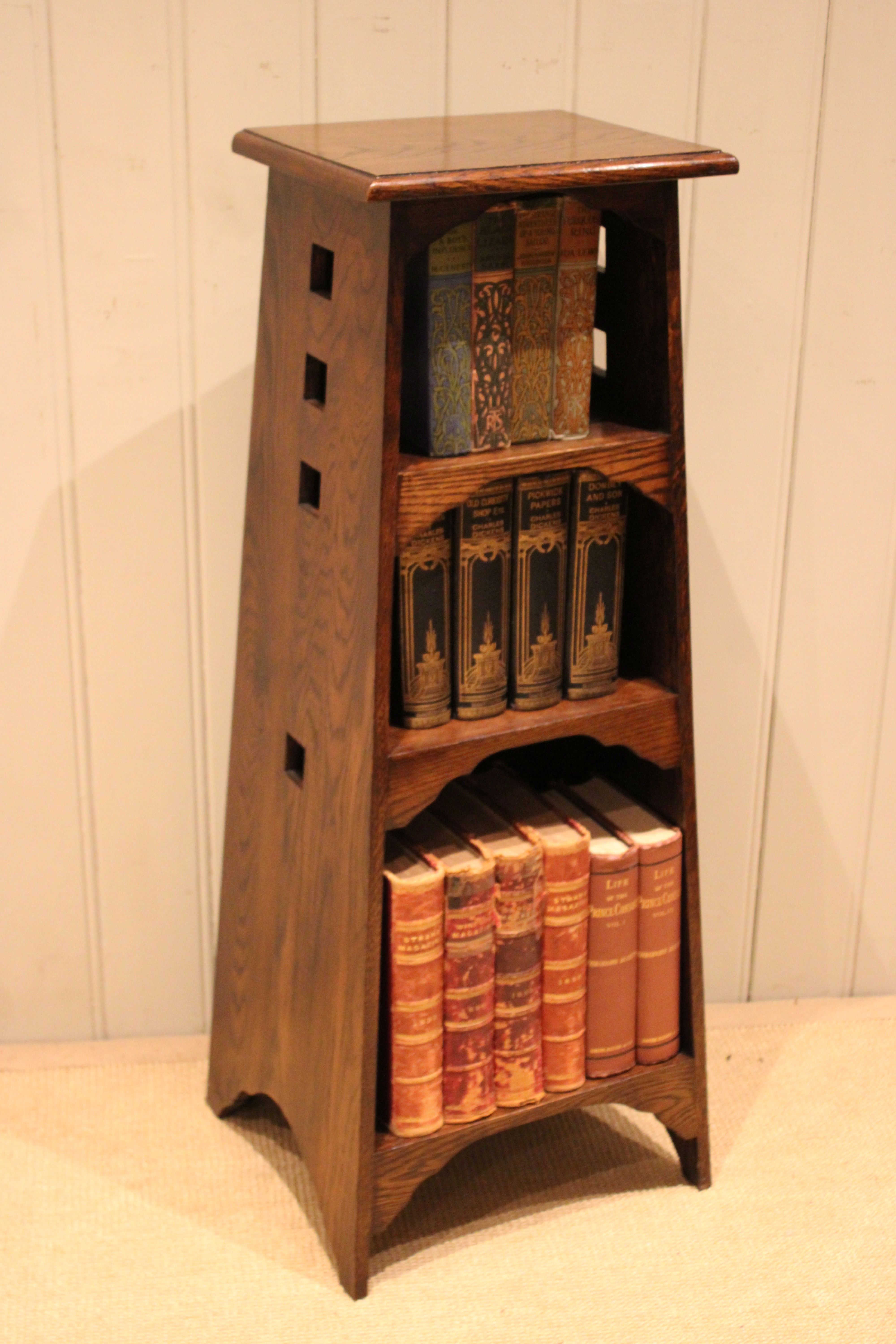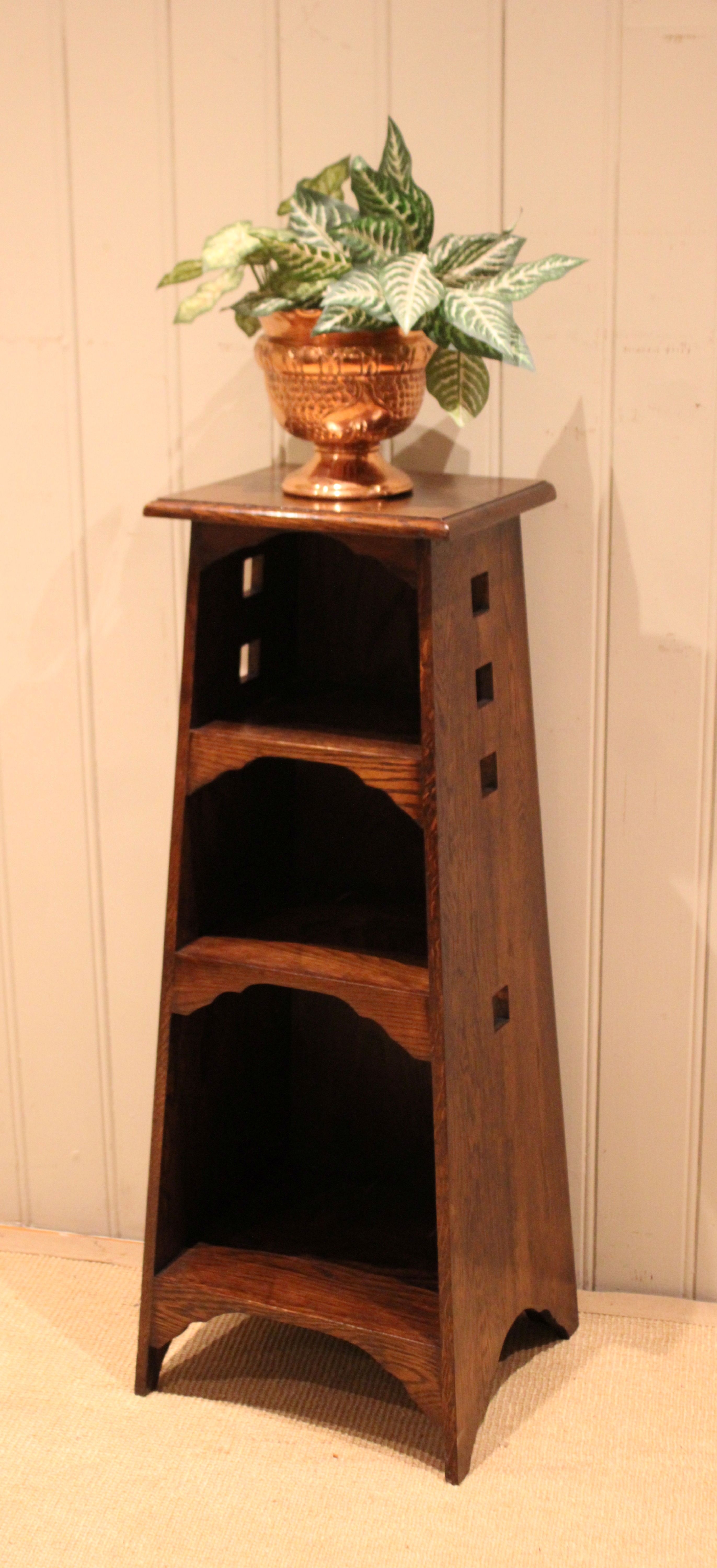 Solid oak stylized open bookcase having a triangular form with pierced decoration to the sides , with three fixed shelves with bracket supports , raised on short supports . The shelf dimensions are from the bottom up 34 cm high , 32 cm wide and 30 cm deep , the middle 21 cm high , 27.5 cm wide and 26 cm deep and at the top 21 cm high , 24 cm wide and 23 cm high .