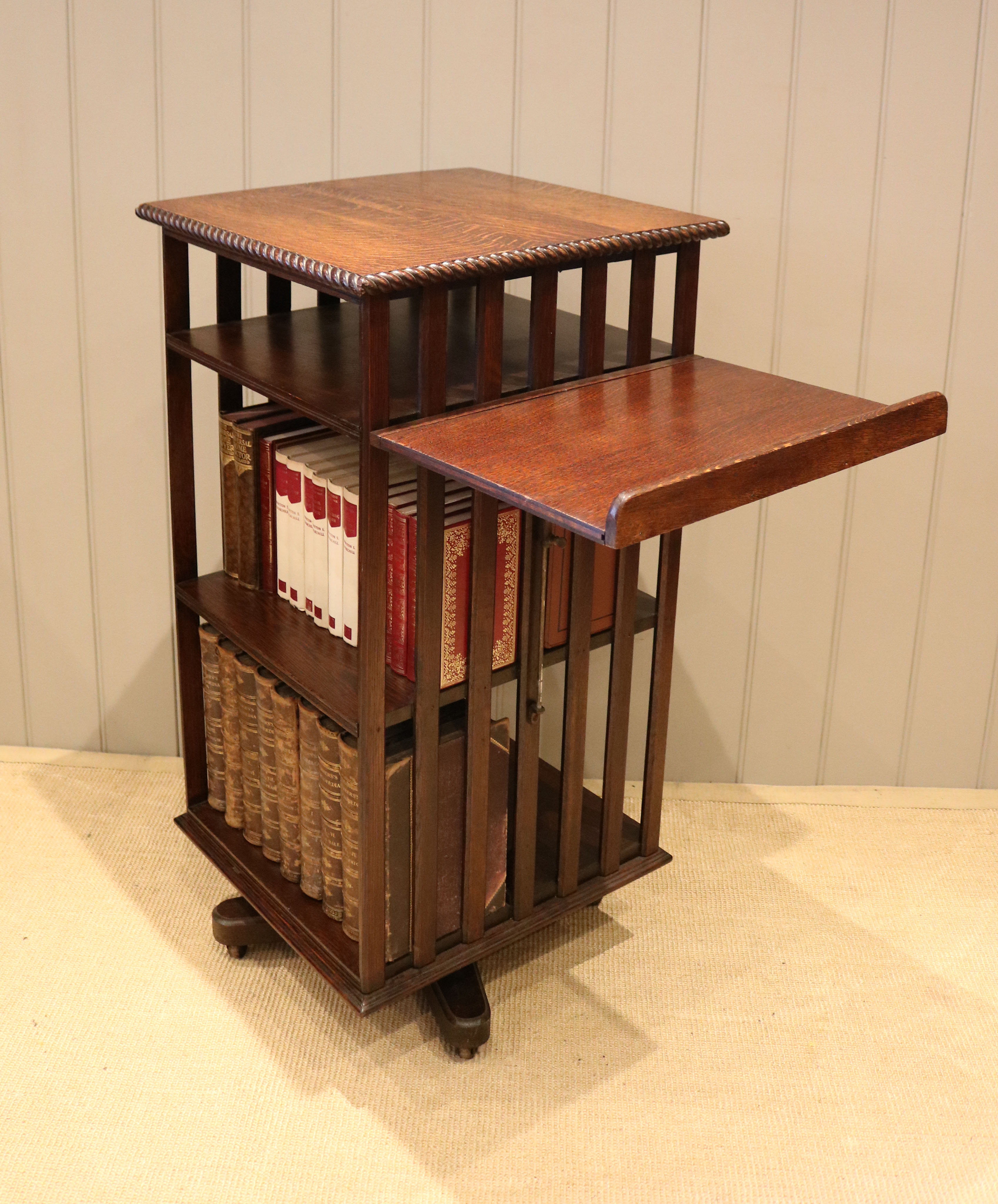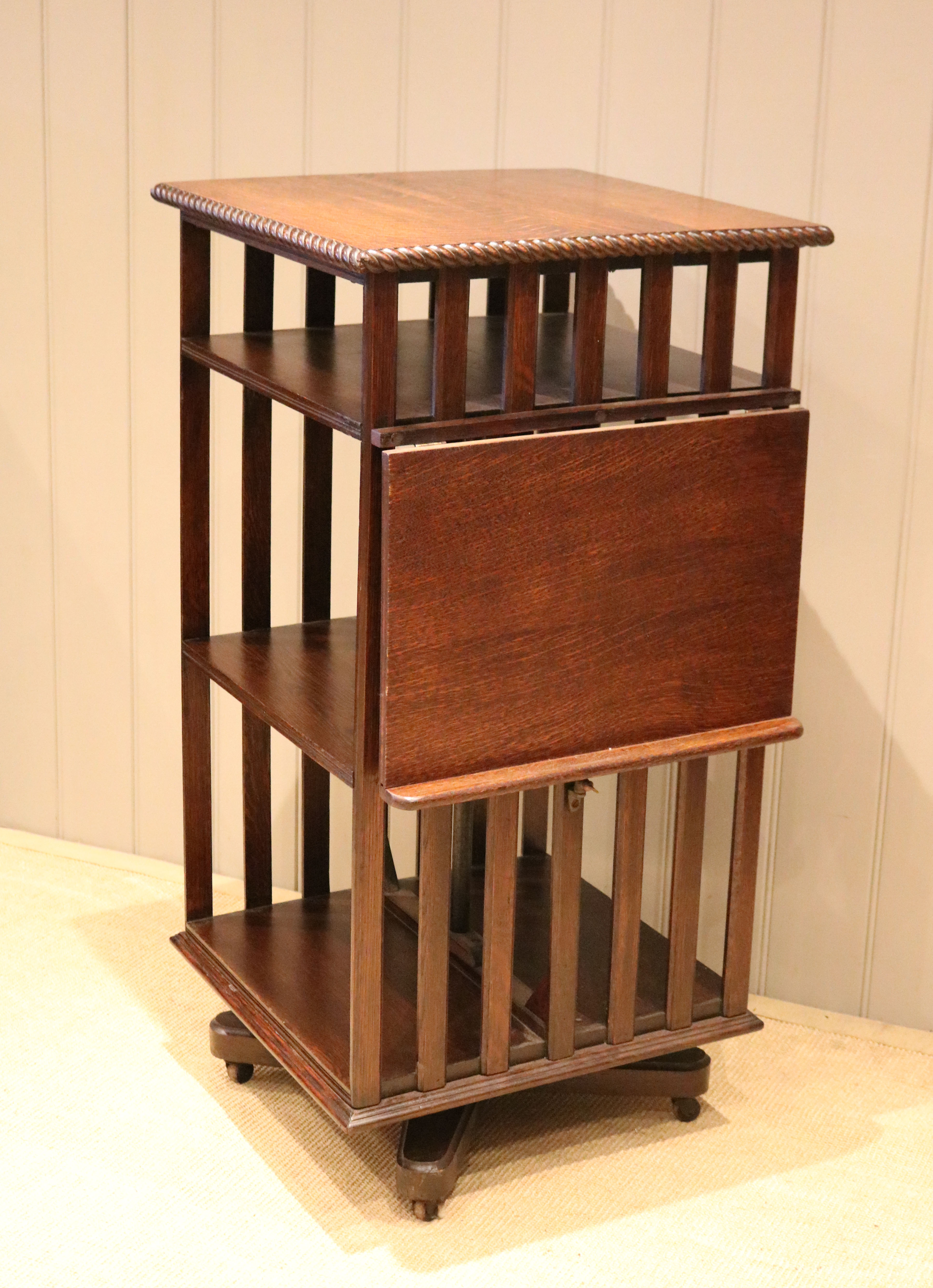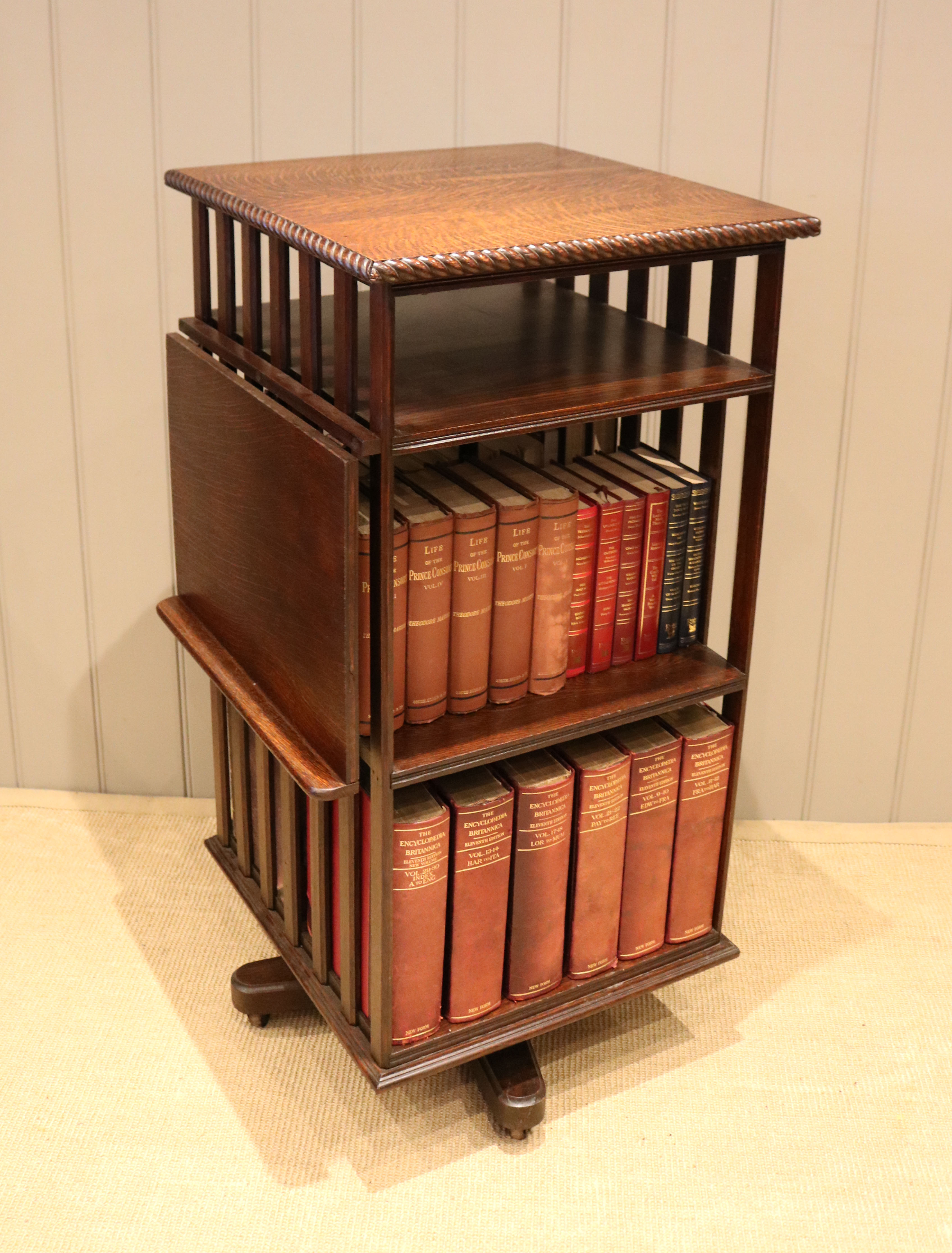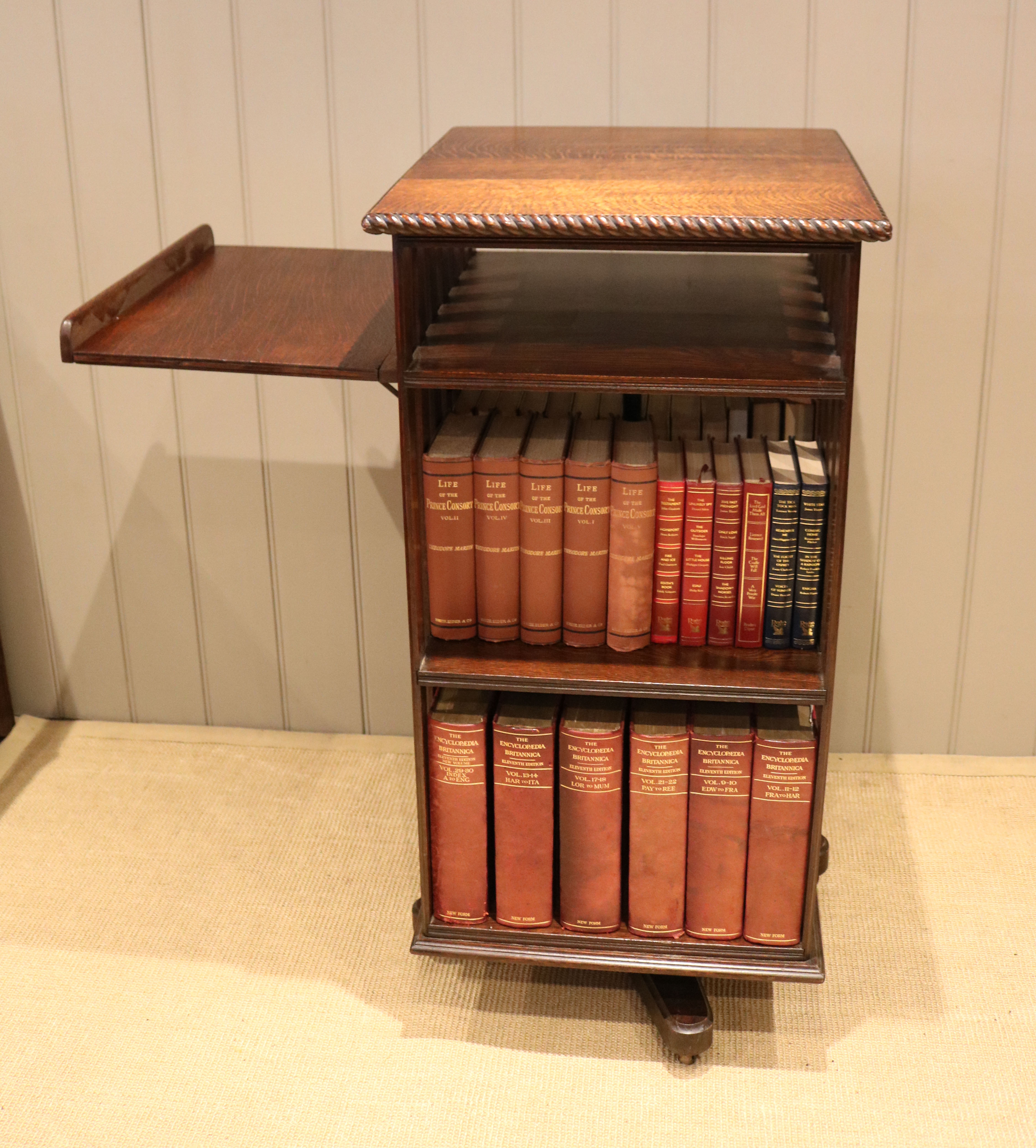 Substantial Oak revolving bookcase having a folding reading stand, rope twist edge ,four sections and a three tier construction with vertical slats to each side.The bottom two sections are 33cm high by 44cm wide and 23cm deep with a smaller top section for magazines etc