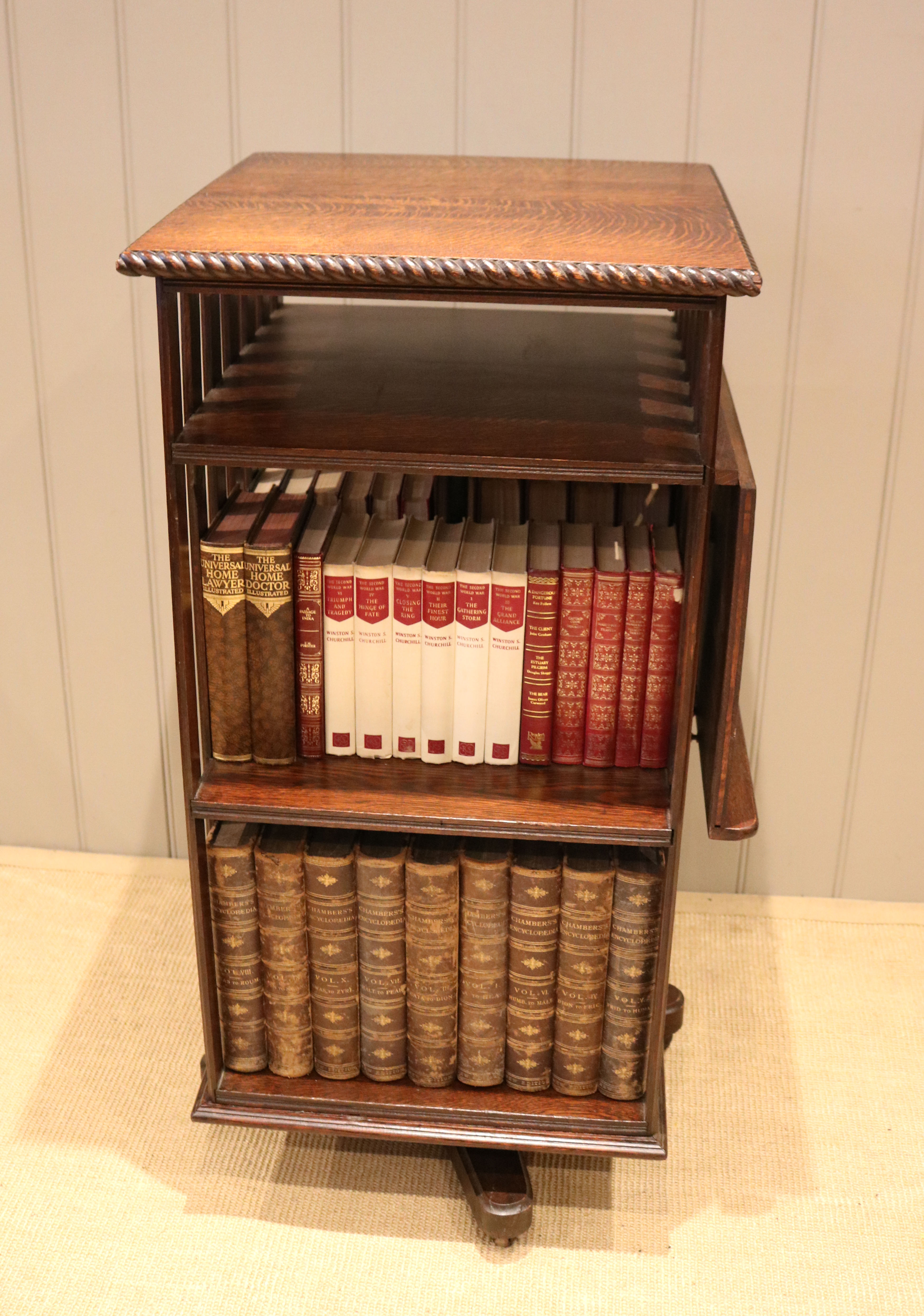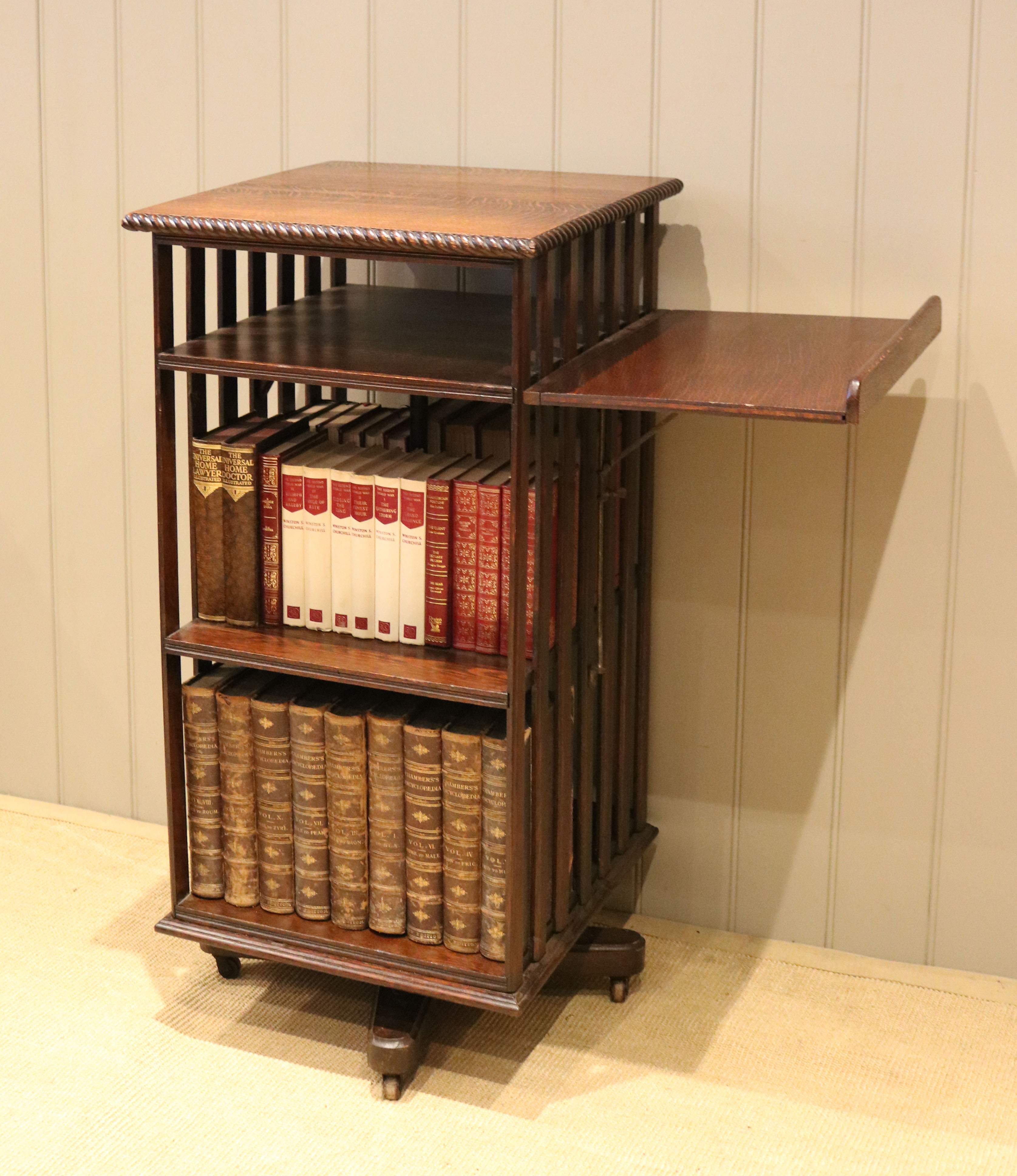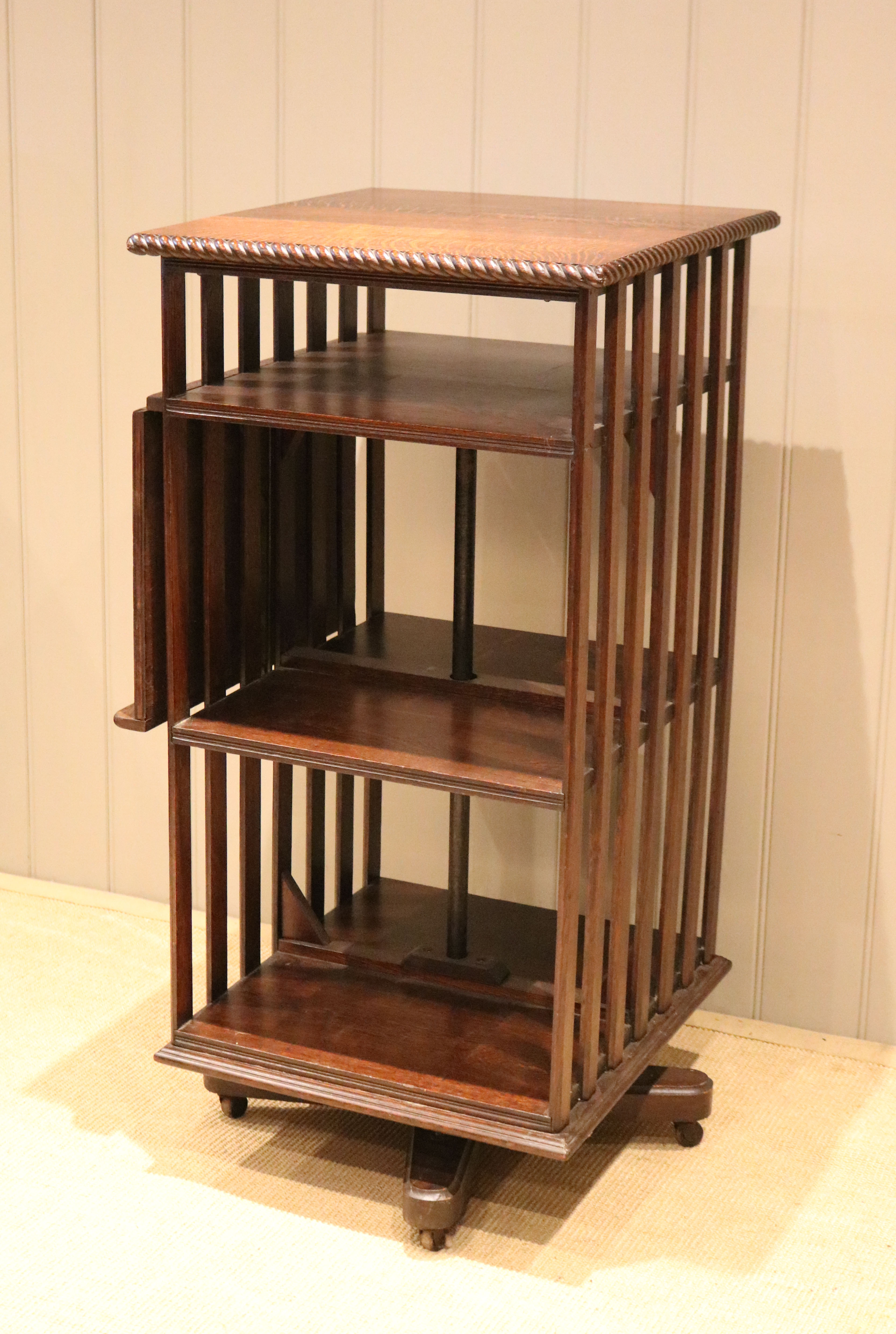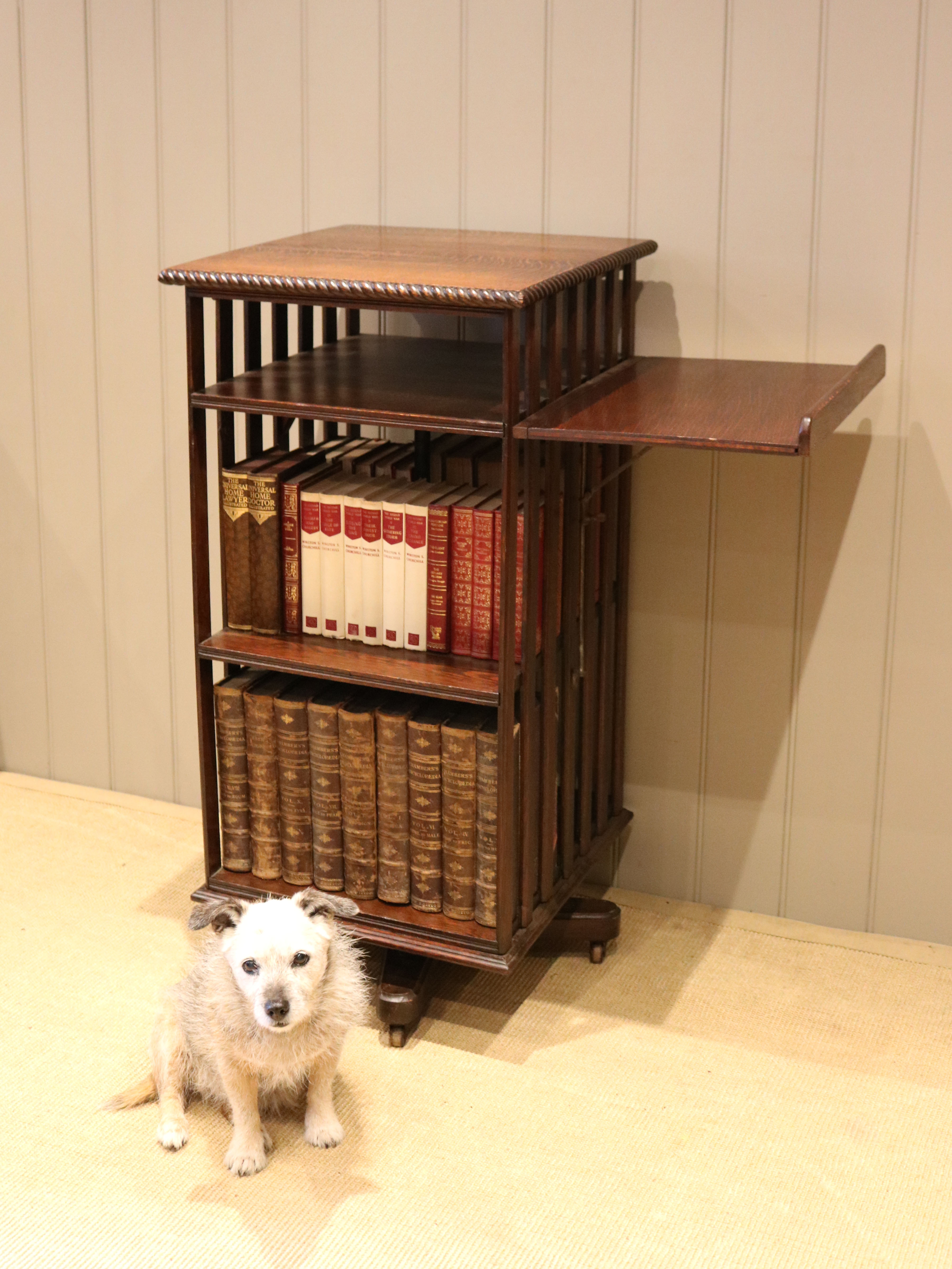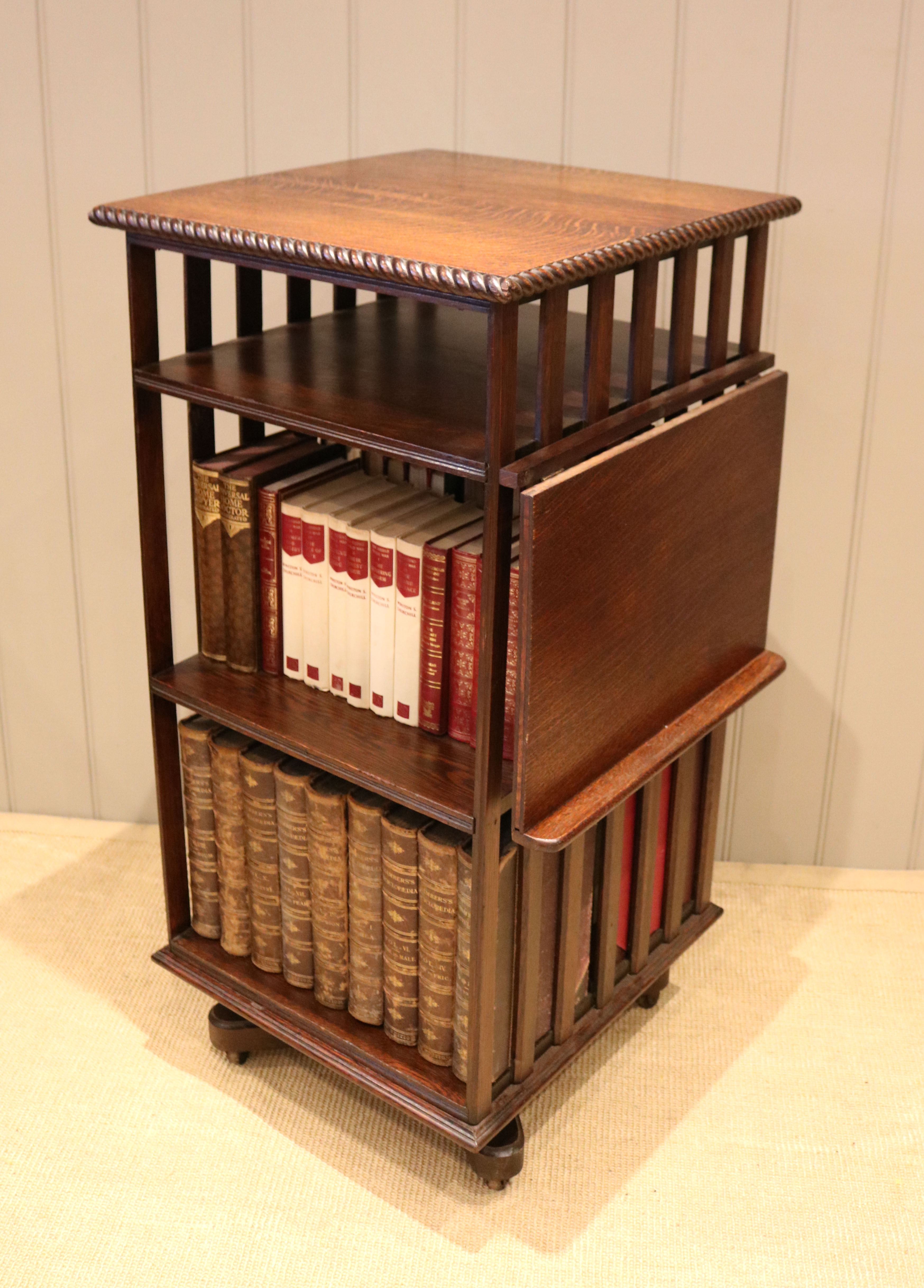 Substantial Oak revolving bookcase having a folding reading stand, rope twist edge ,four sections and a three tier construction with vertical slats to each side.The bottom two sections are 33cm high by 44cm wide and 23cm deep with a smaller top section for magazines etc