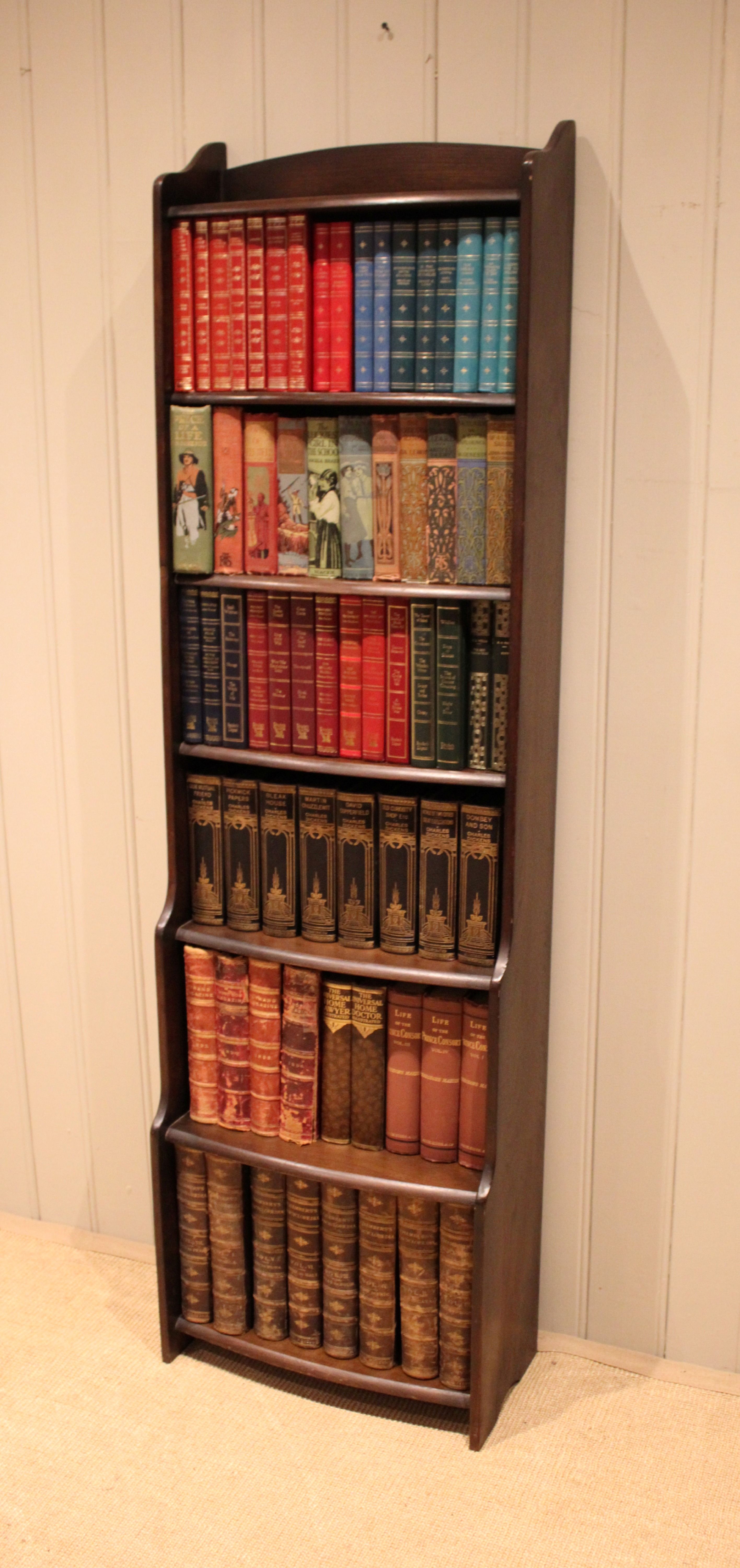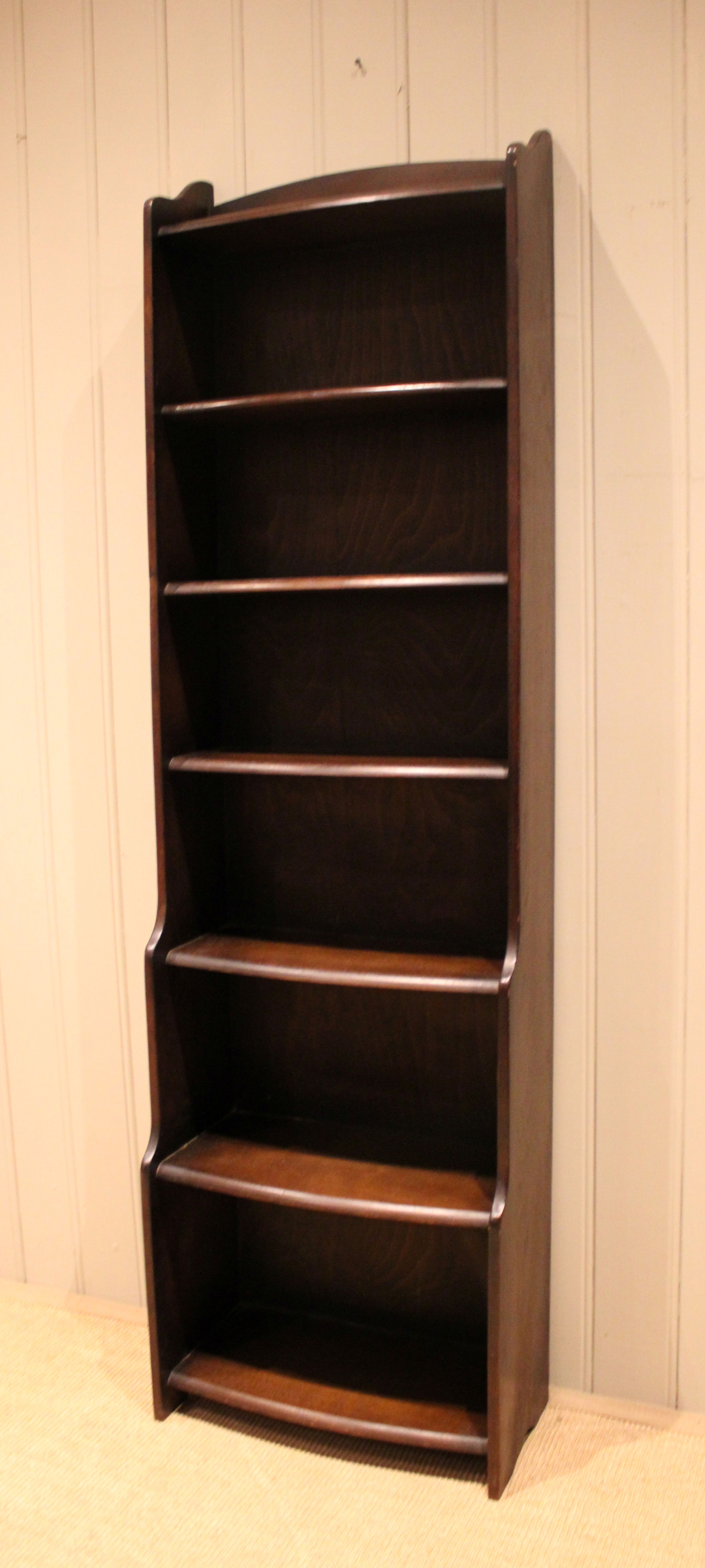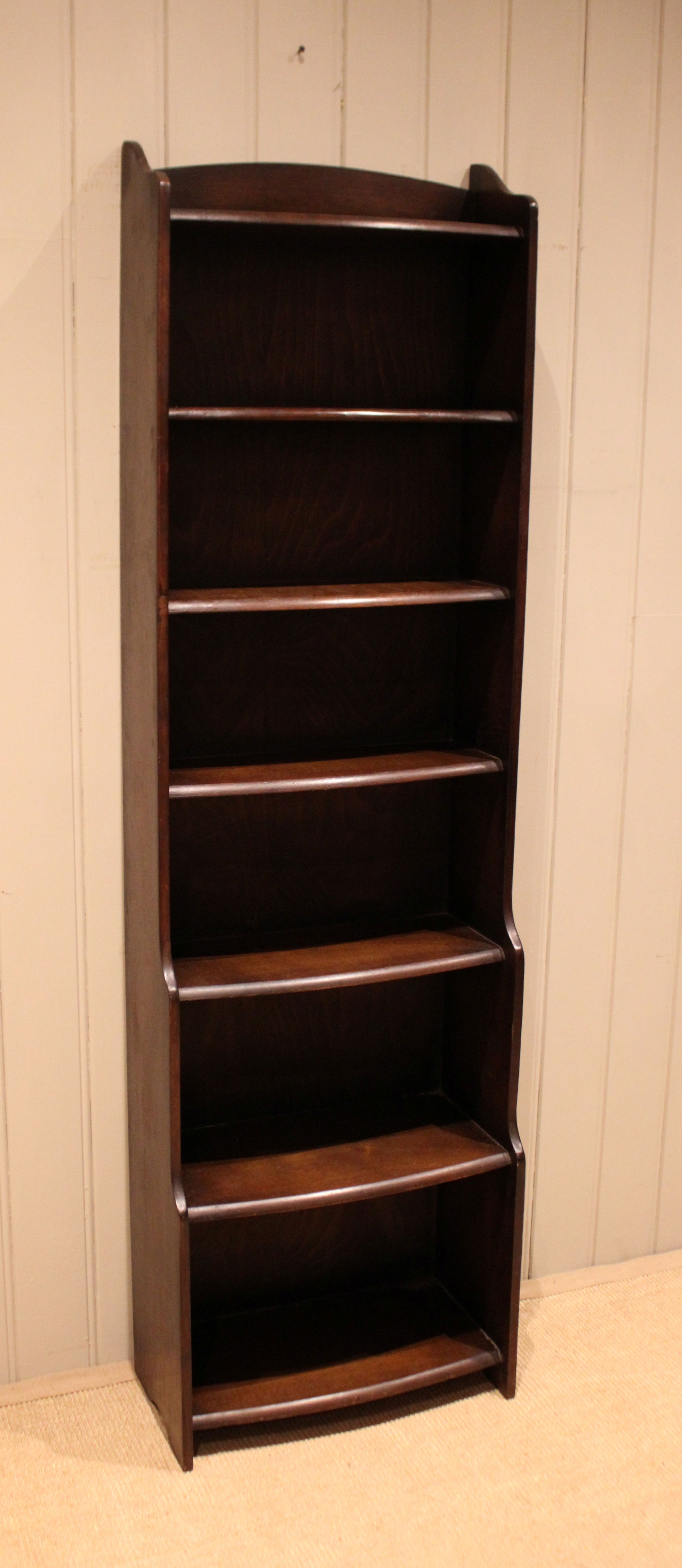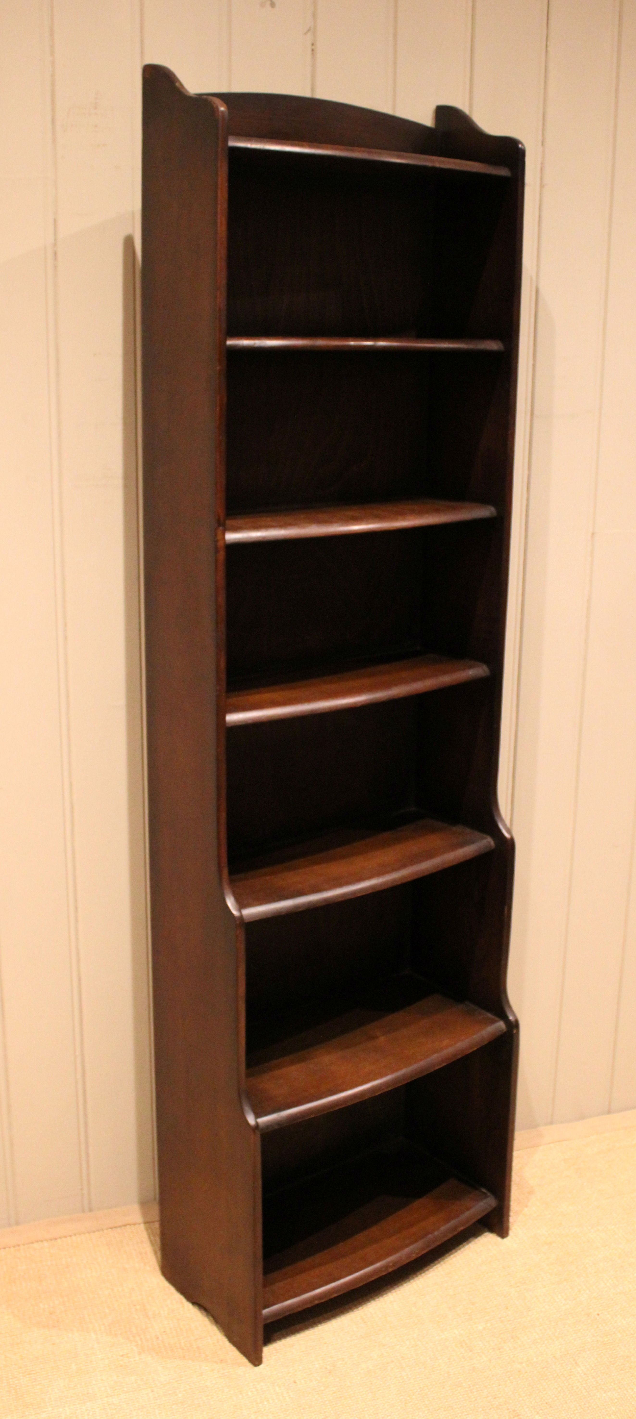 Tall slim oak open bookcase having six fixed graduated bow front graduated shelves with a shaped top , raised on side brackets. The shelf dimensions are 44 cm wide from the bottom up 27.5 cm high x 22 cm deep, 25 cm x 22 cm deep , 23 cm high x 18 cm deep , 20 cm high x 15 cm deep, 20 cm high x cm deep , and at the top 20 cm high x 15 cm deep .